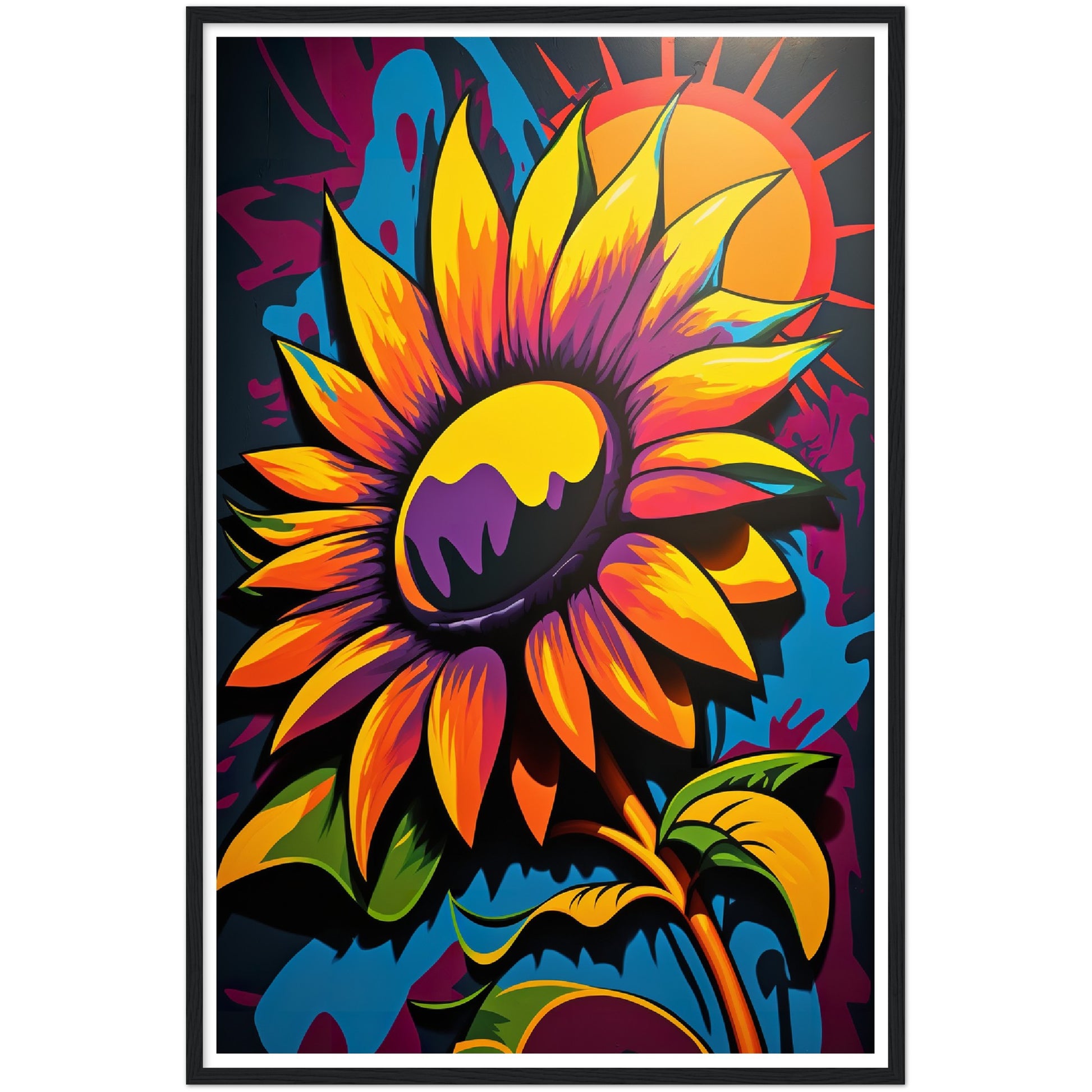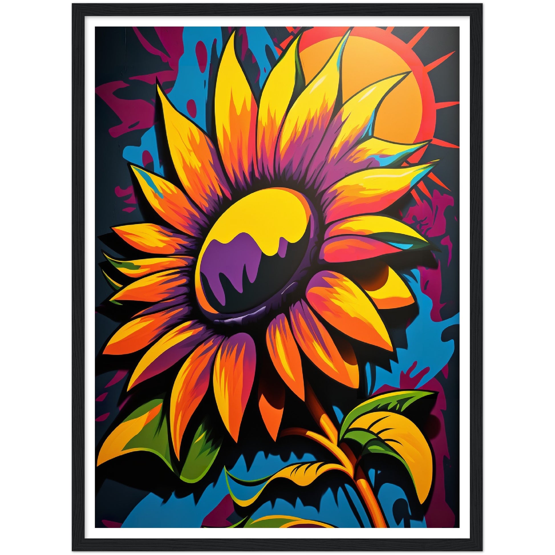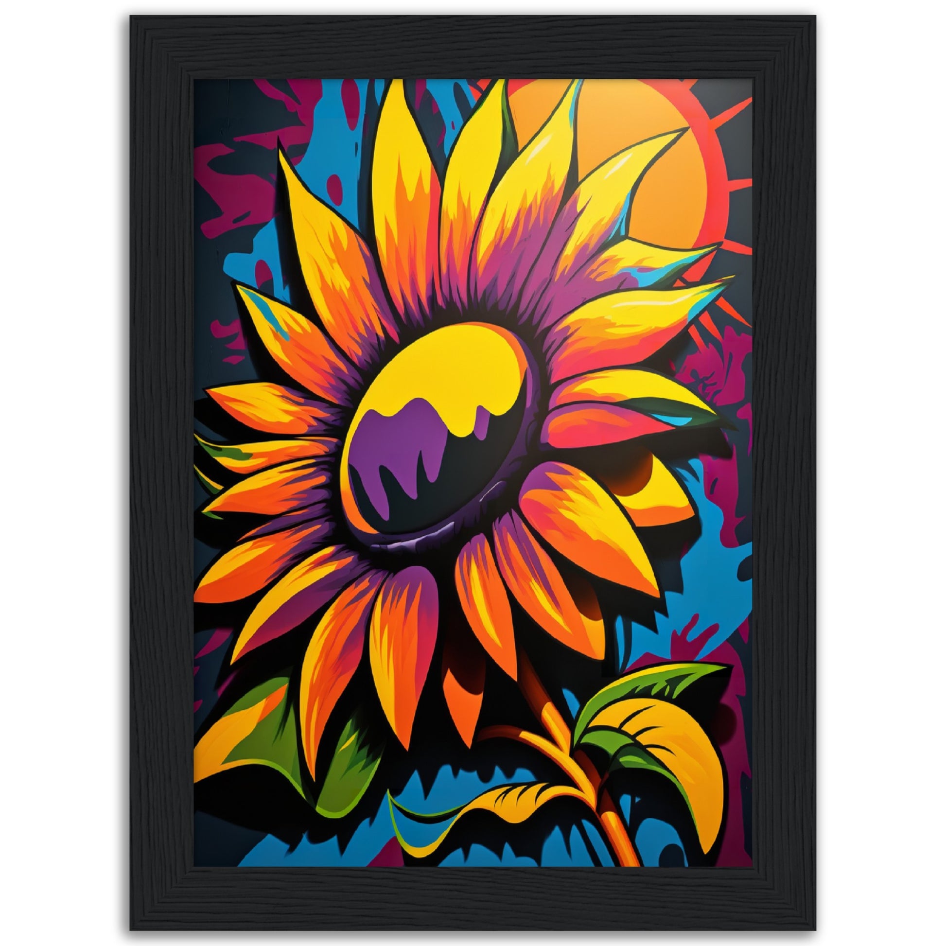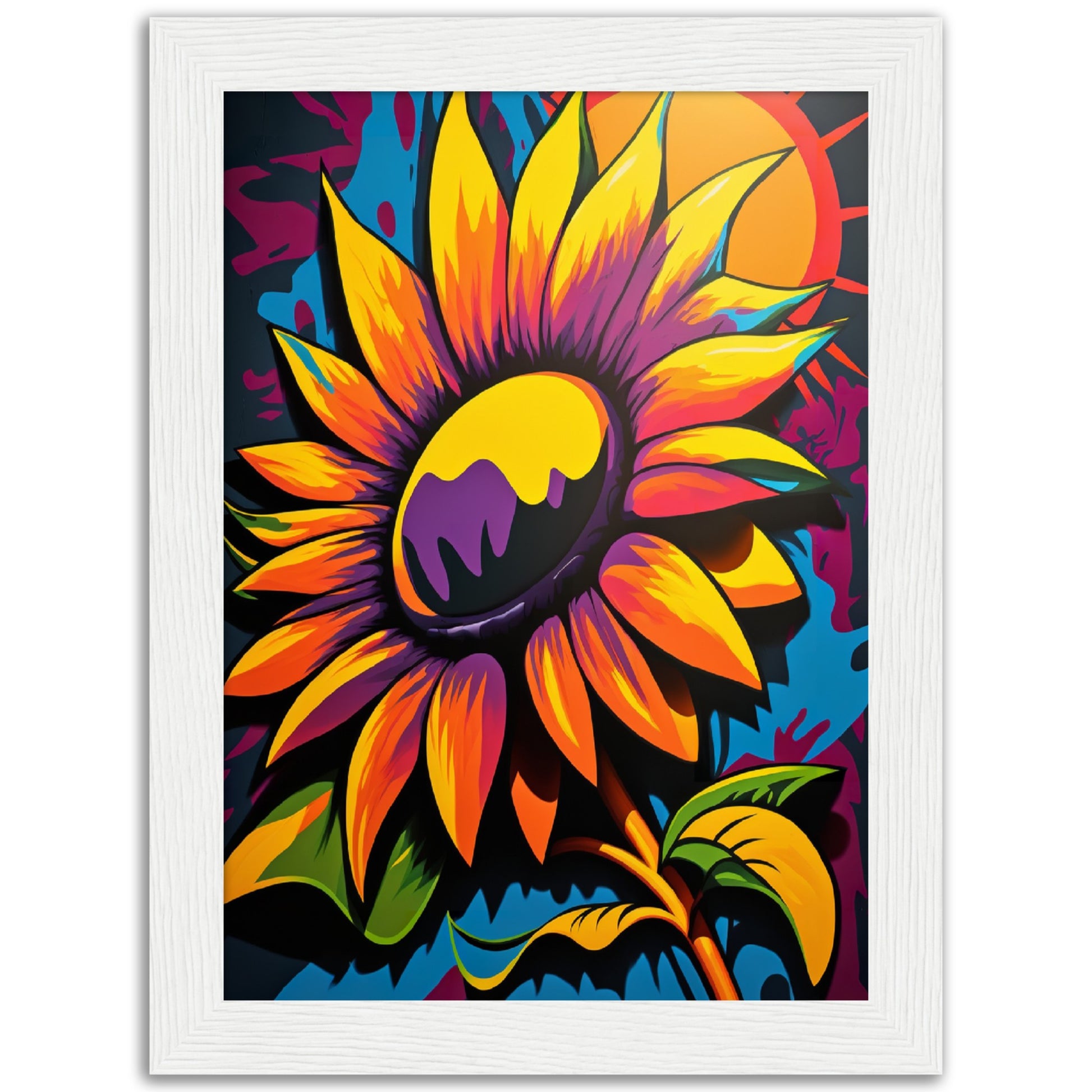 This vibrant graffiti inspired illustration features a stunning sunflower in all its glory. The bold colors and abstract shapes in the background add to the energy and movement of the piece. The attention to detail and use of contrasting colors make this artwork truly stand out. Perfect for adding a pop of color and personality to any space.
