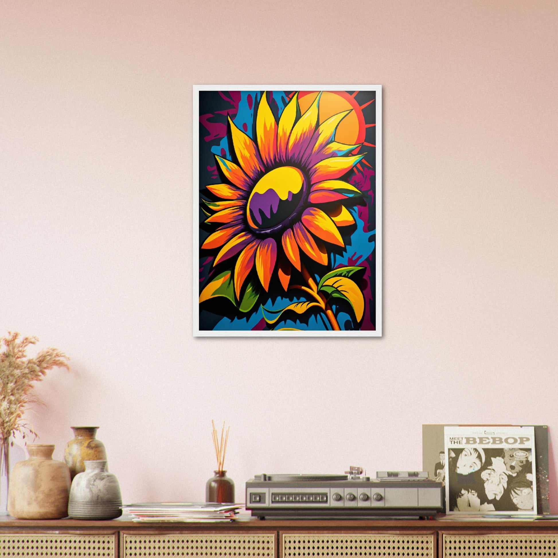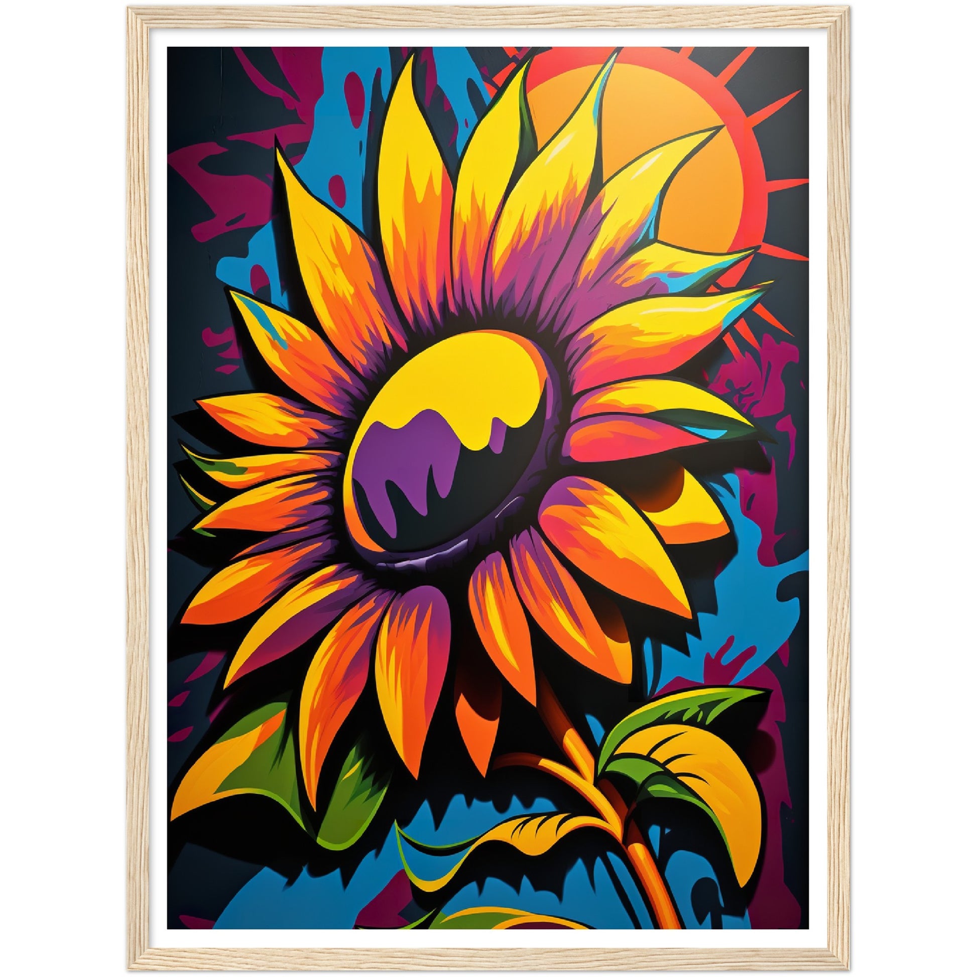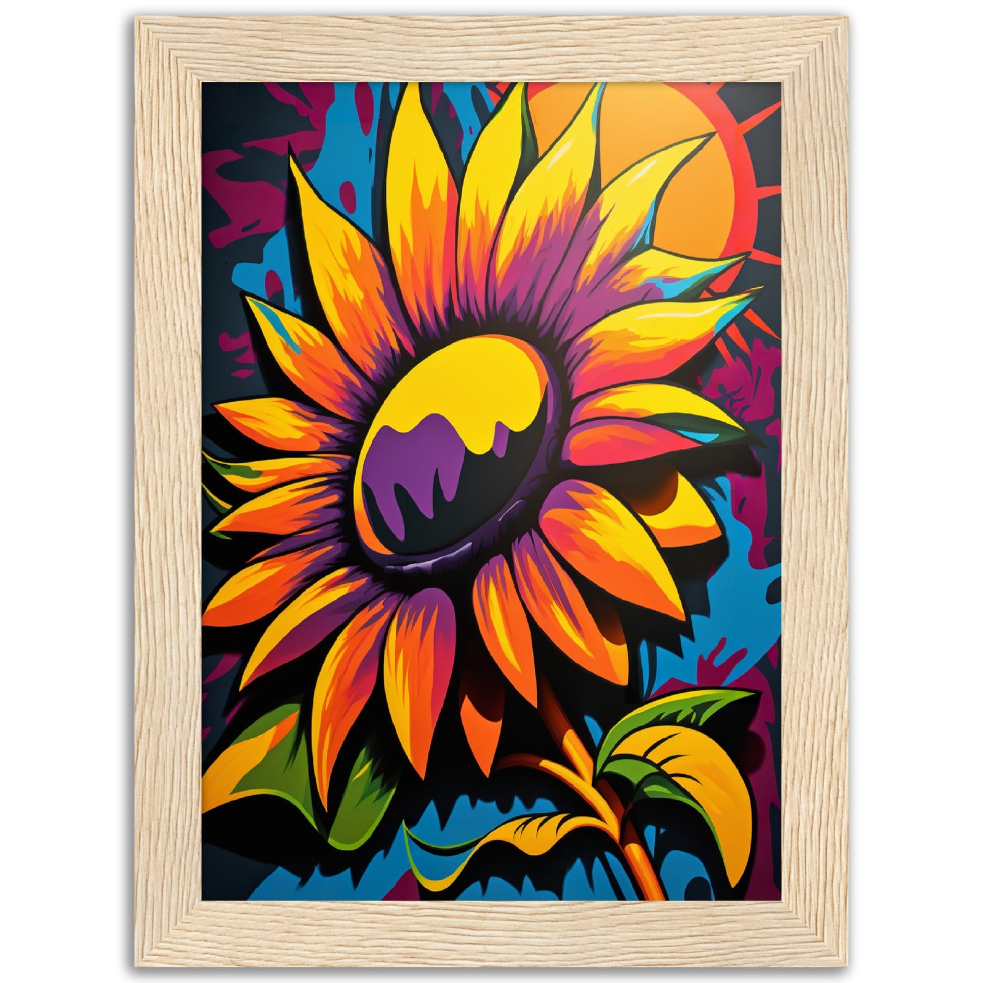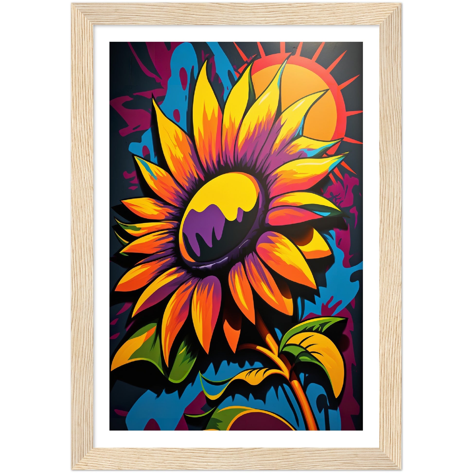This vibrant graffiti inspired illustration features a stunning sunflower in all its glory. The bold colors and abstract shapes in the background add to the energy and movement of the piece. The attention to detail and use of contrasting colors make this artwork truly stand out. Perfect for adding a pop of color and personality to any space.