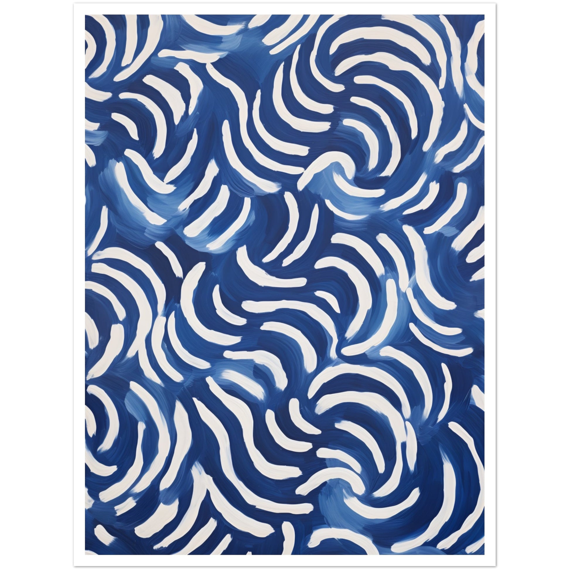 This artwork, created with thick, heavy brushstrokes, showcases a mesmerizing dance of zigzag swirls and curls. The dark blue serves as the perfect backdrop for the bold, white lines that form intricate patterns, adding depth and intrigue to the composition. The thick brushstrokes contribute to the tactile and expressive nature of the piece, creating a visual experience that is both powerful and nuanced.