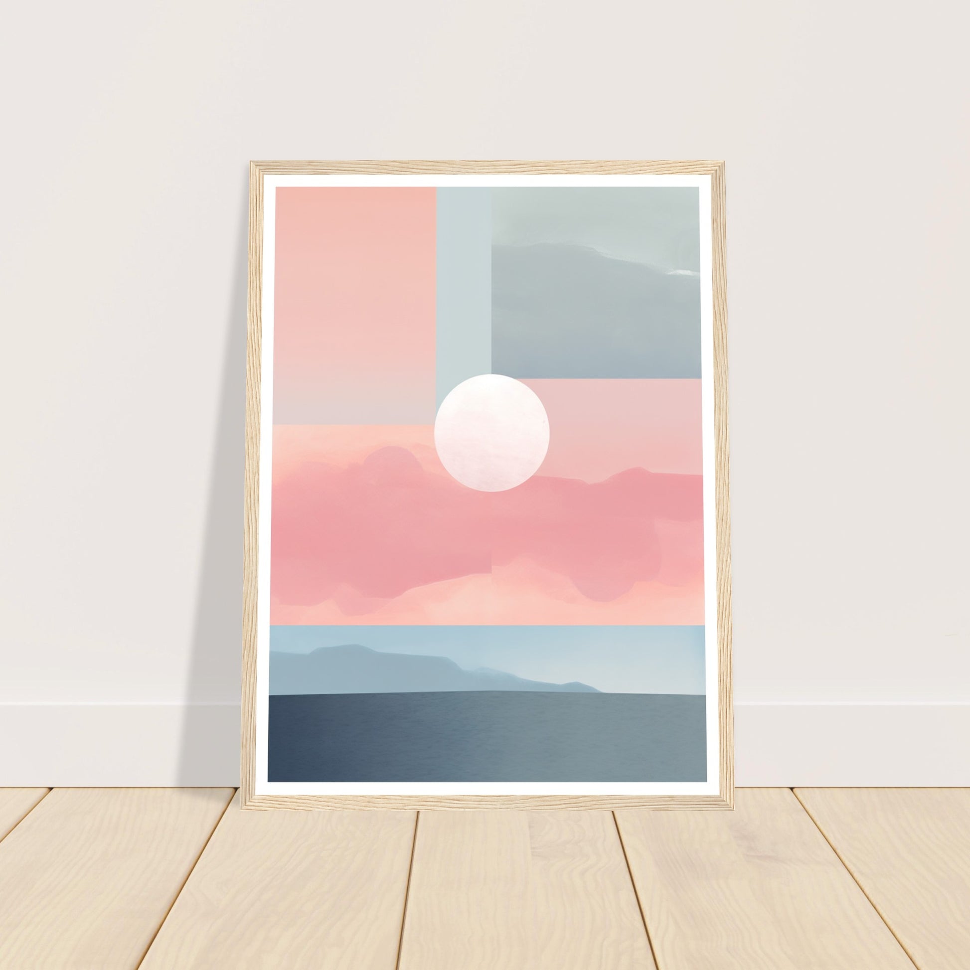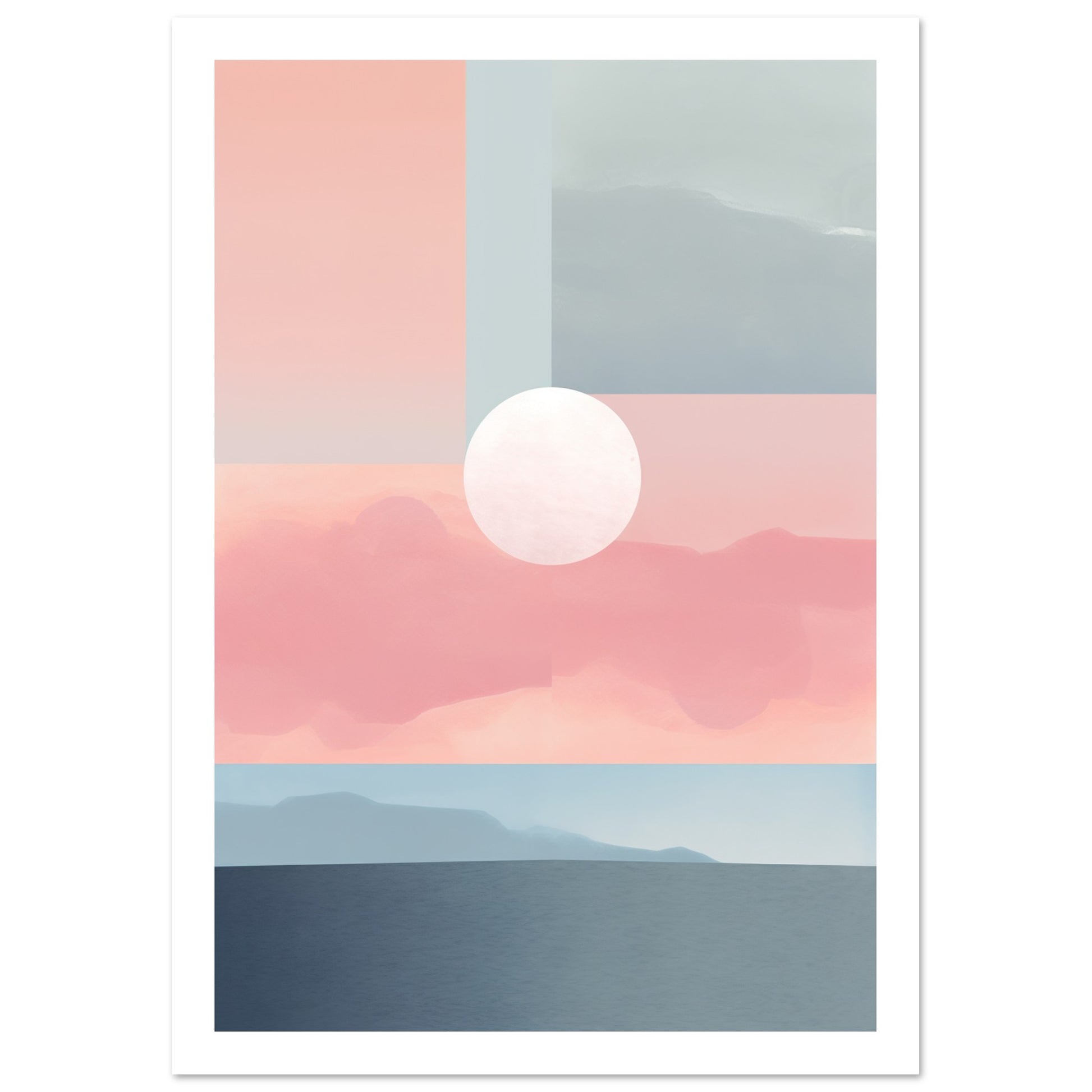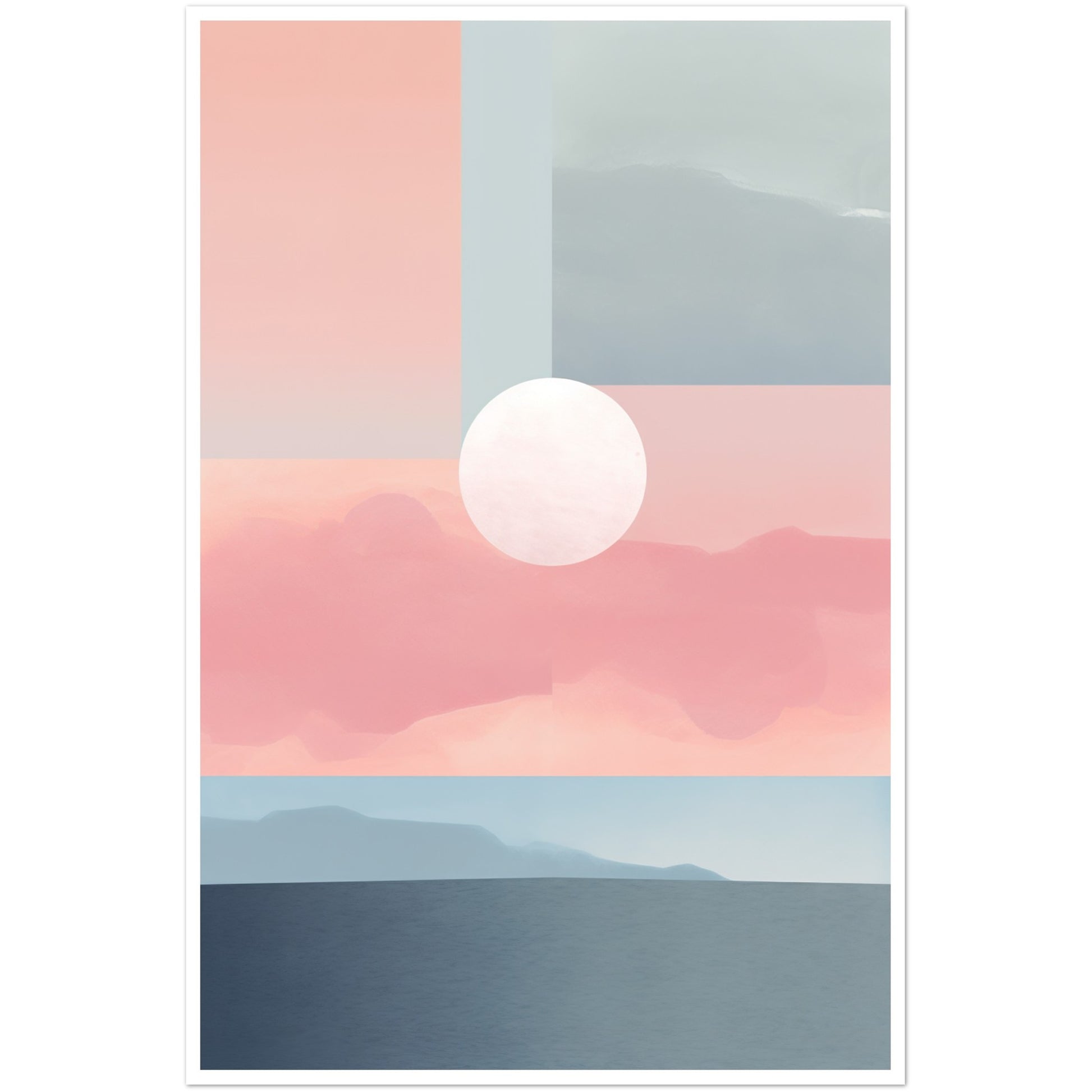 This stunning artwork features a square composition with abstract blocks of pastel tones, creating a mesmerizing depiction of a tranquil blue lagoon under a pink sunlit sky.