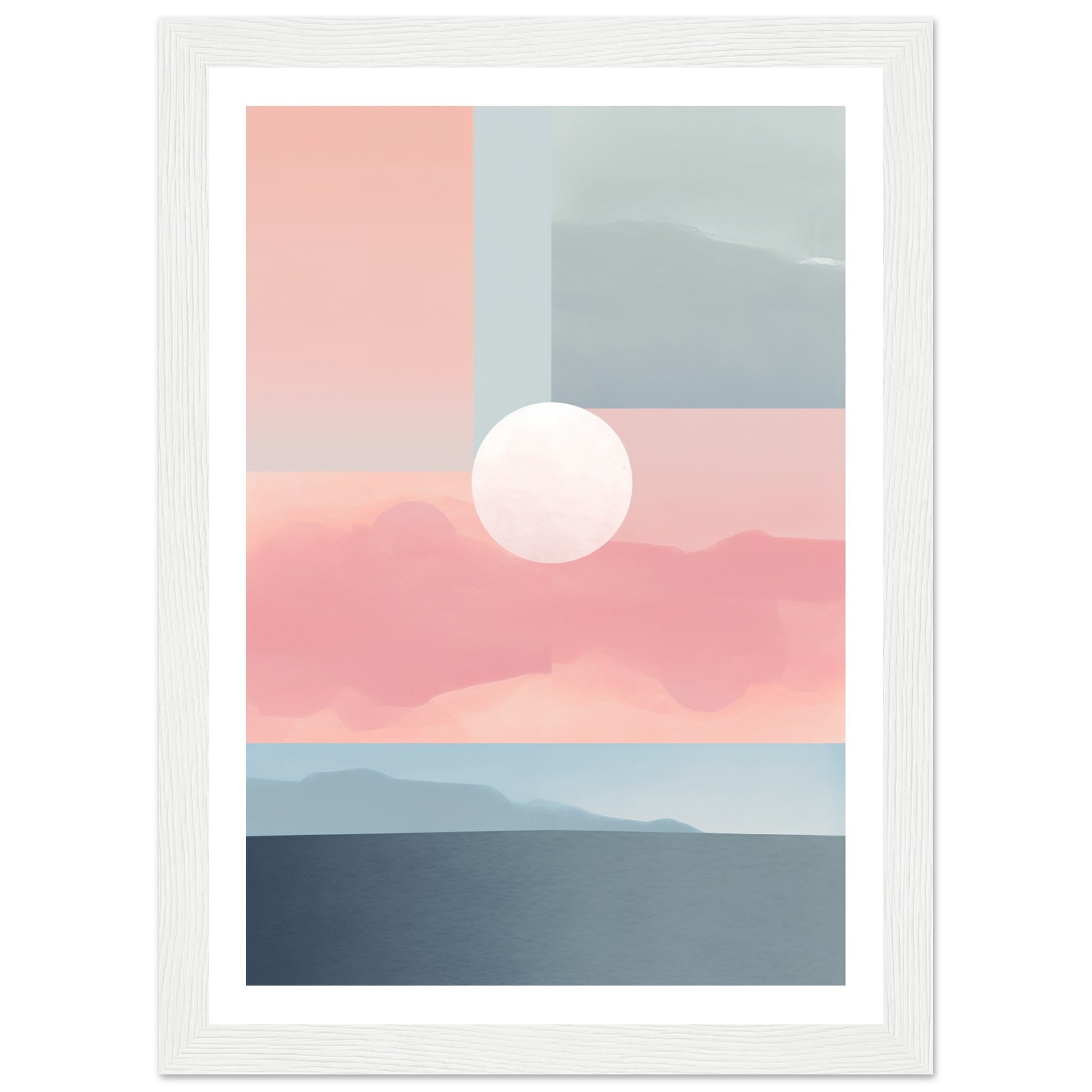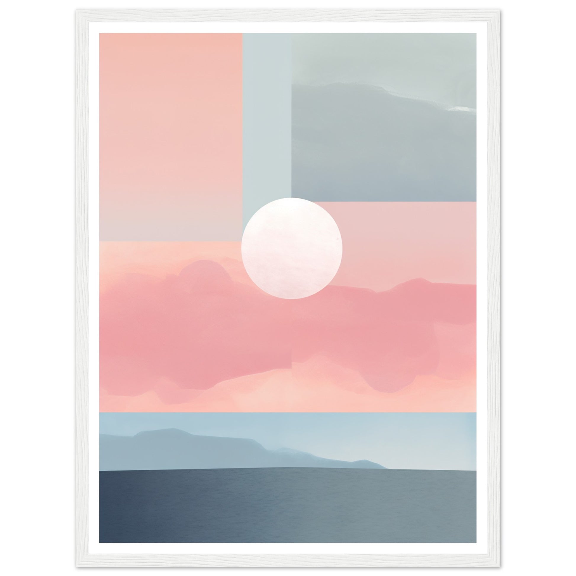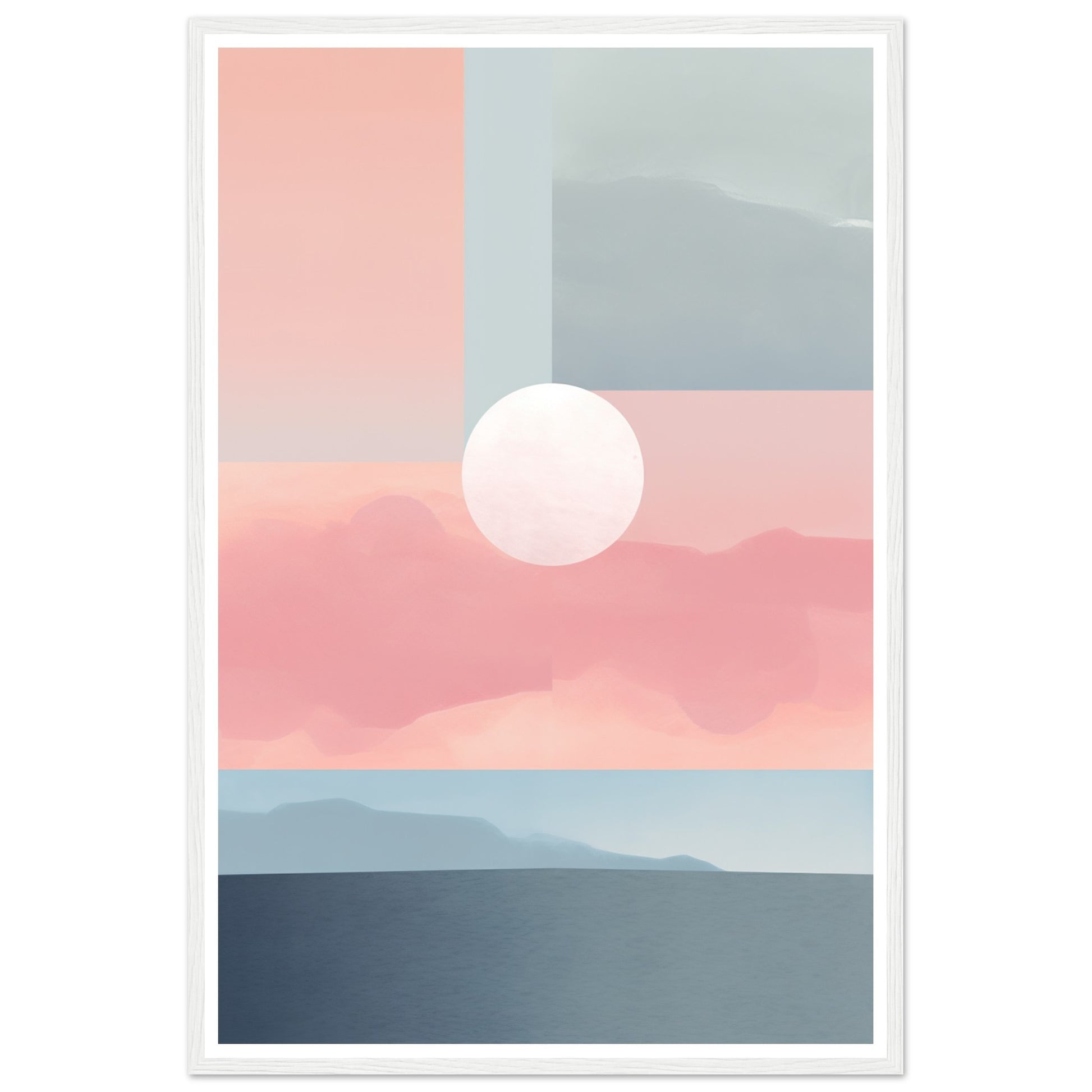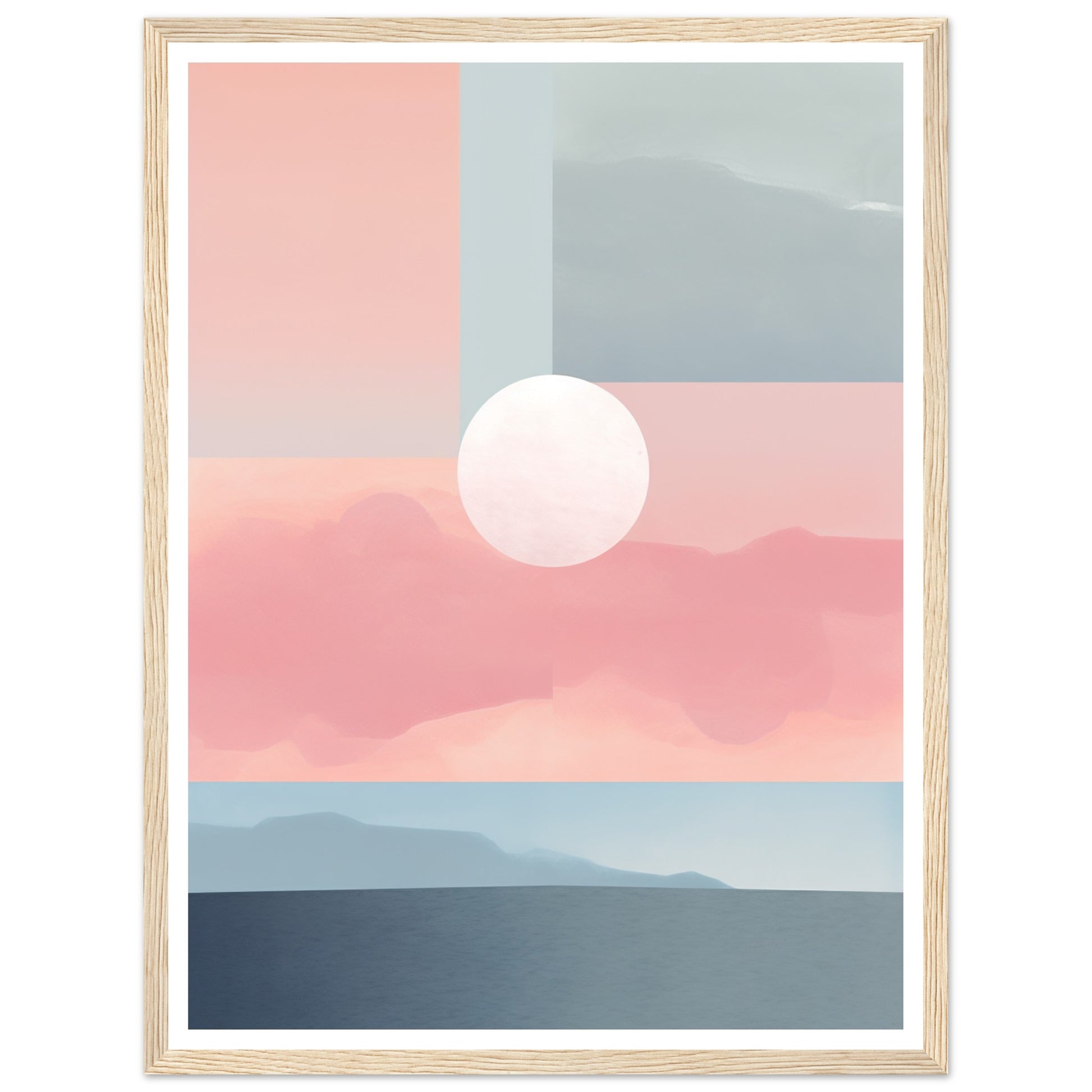This stunning artwork features a square composition with abstract blocks of pastel tones, creating a mesmerizing depiction of a tranquil blue lagoon under a pink sunlit sky.