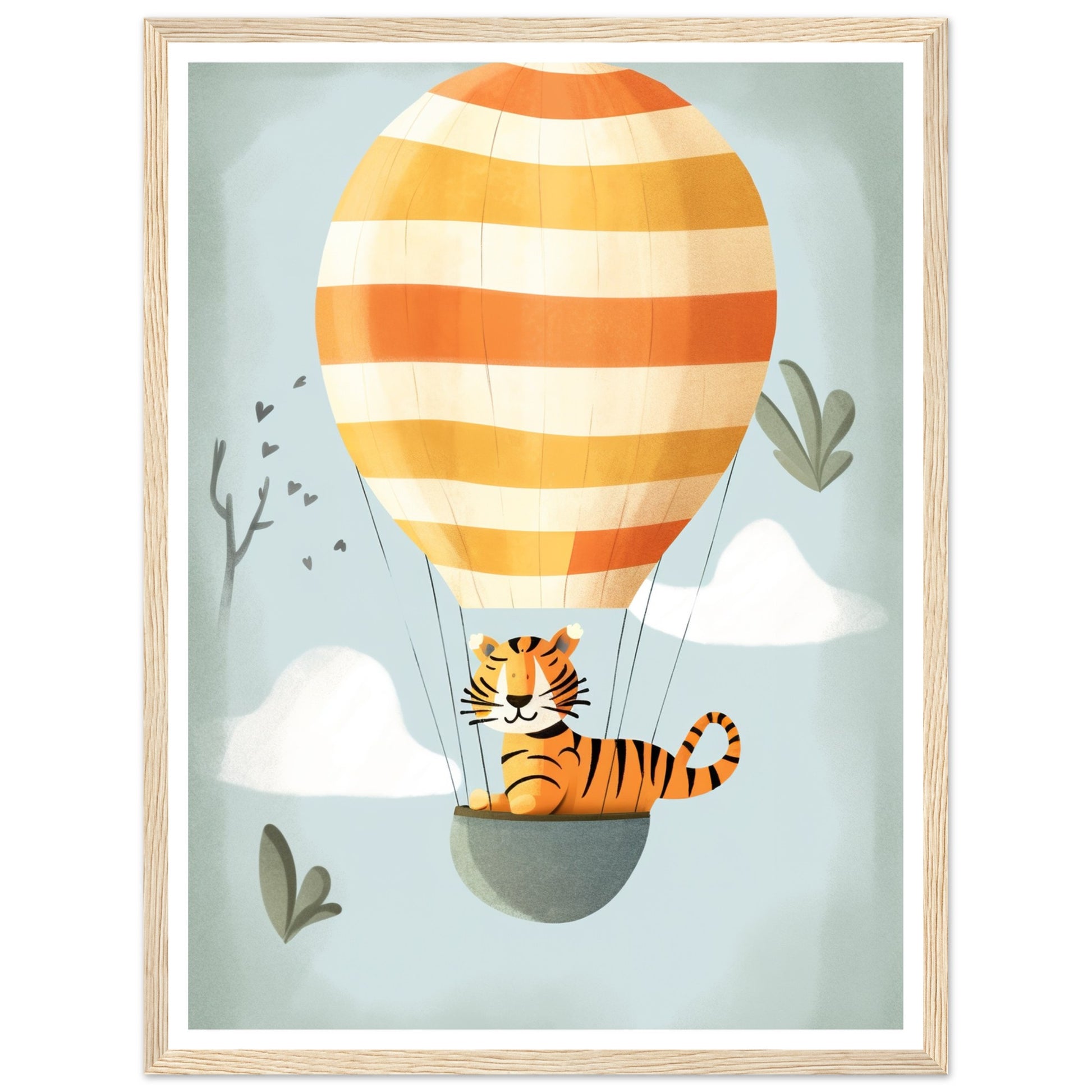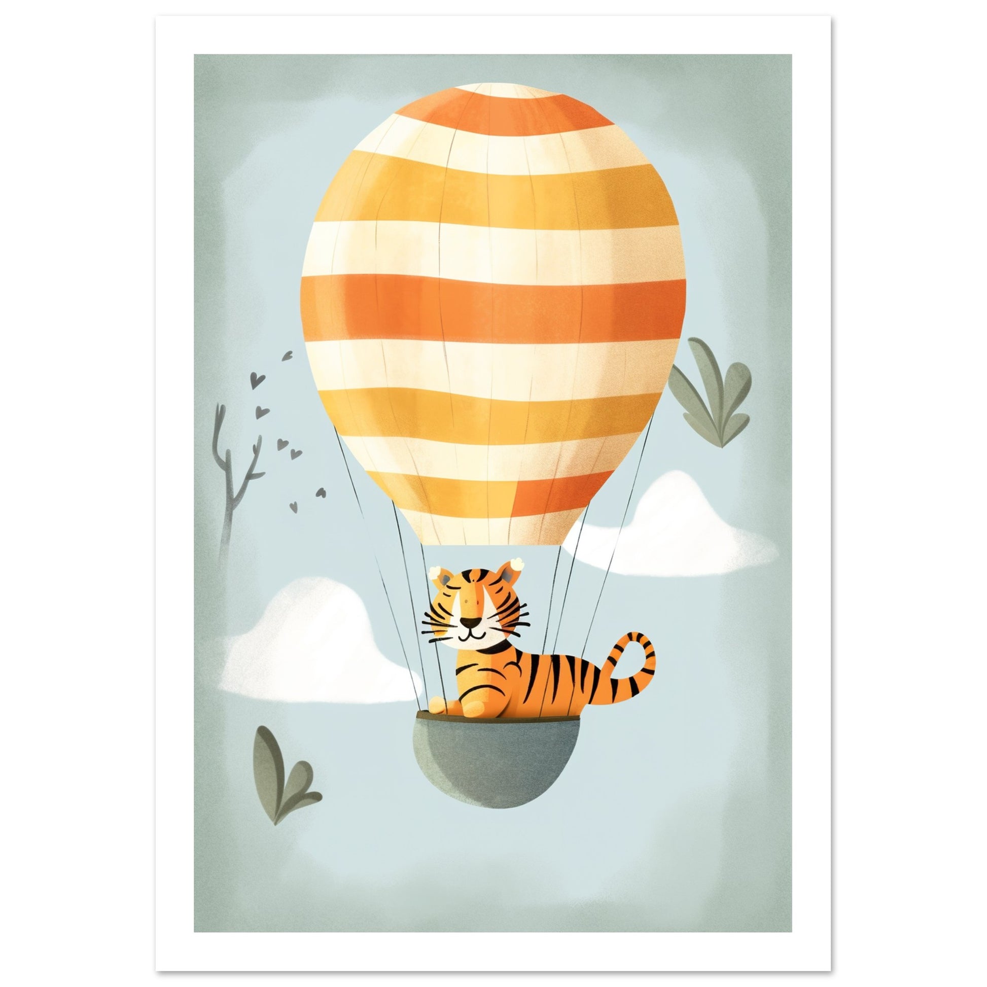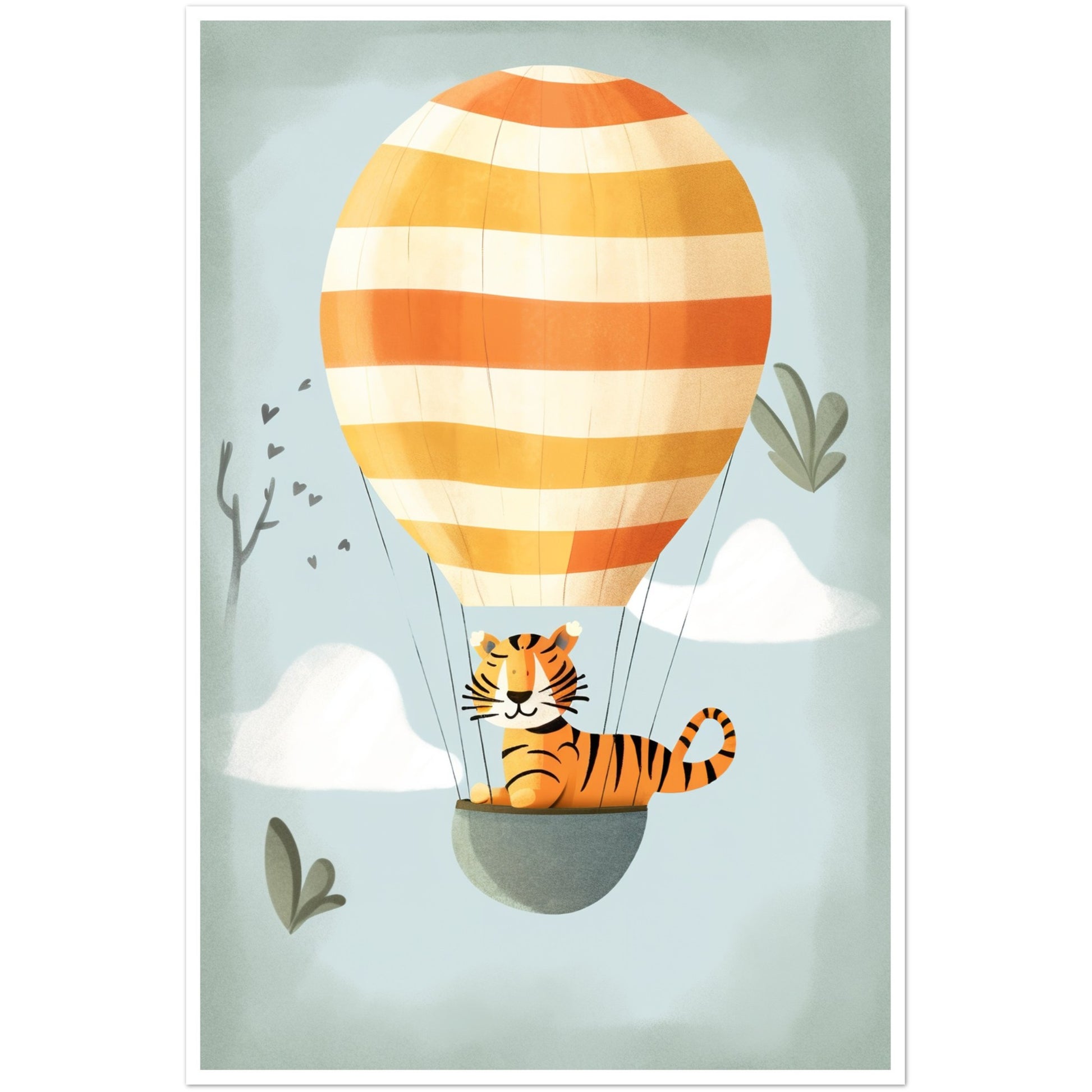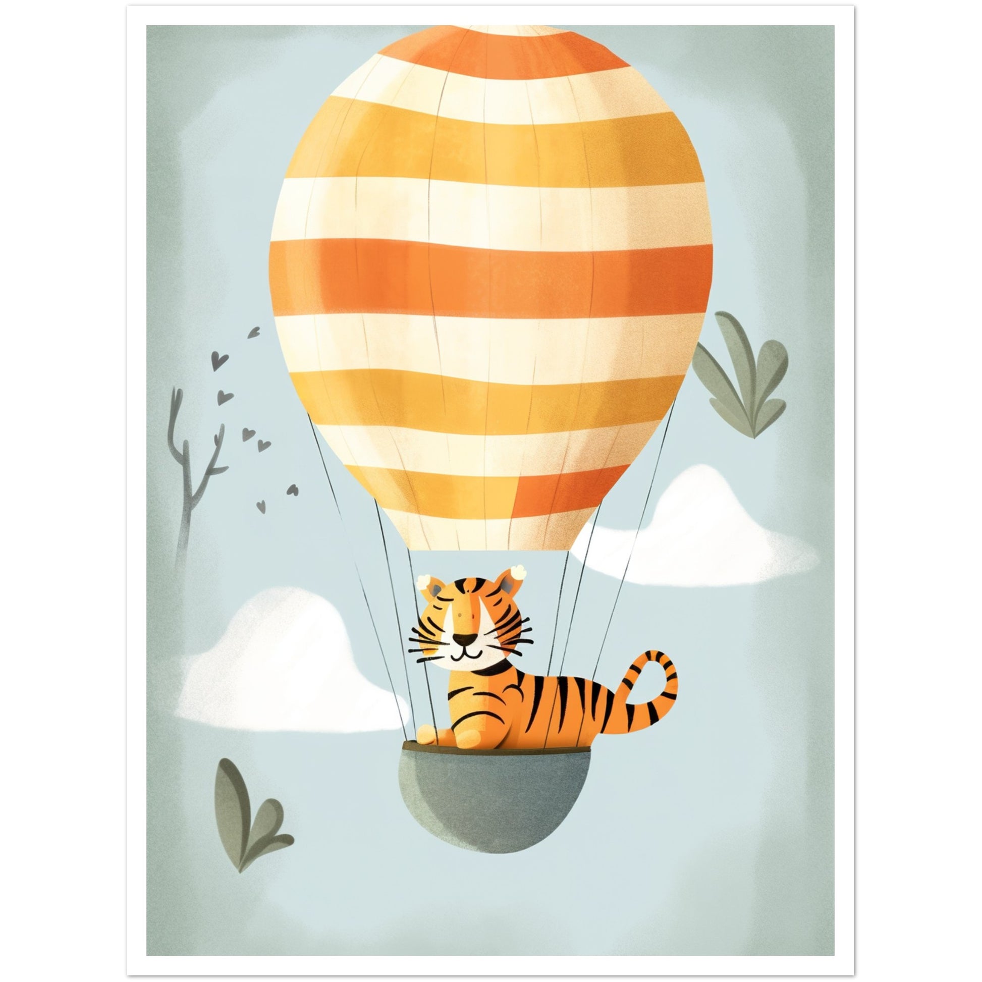 A captivating piece that will ignite your child's imagination and transport them to a world of adventure! This delightful artwork depicts a majestic tiger soaring high in the sky, accompanied by an orange striped hot air balloon, all beautifully rendered in a whimsical storybook-style illustration.