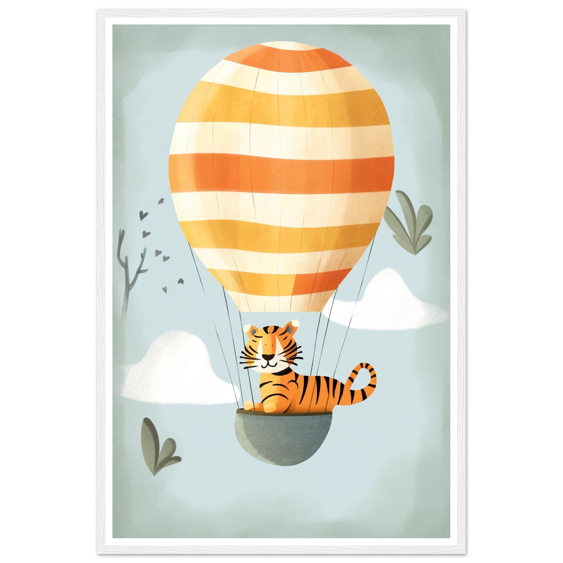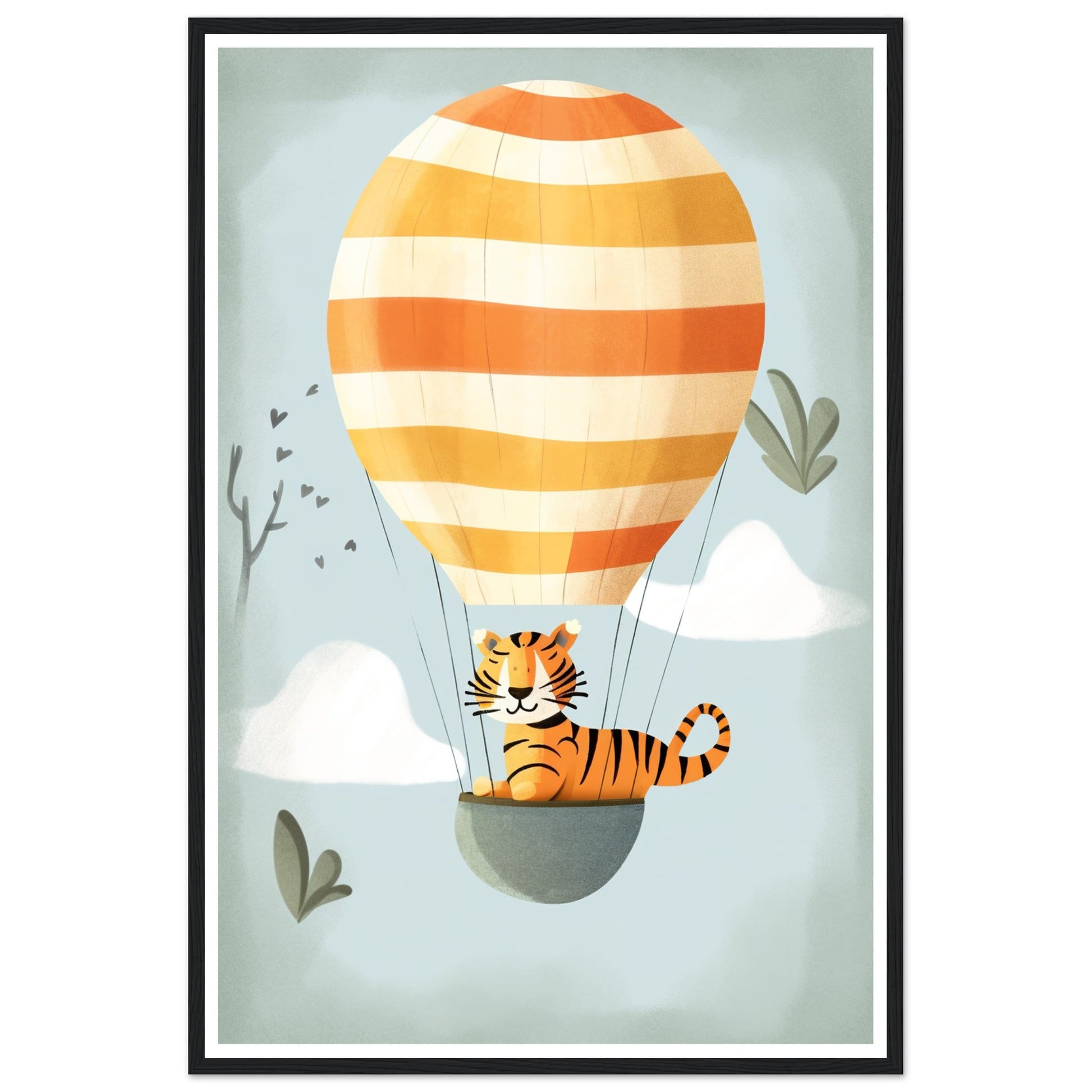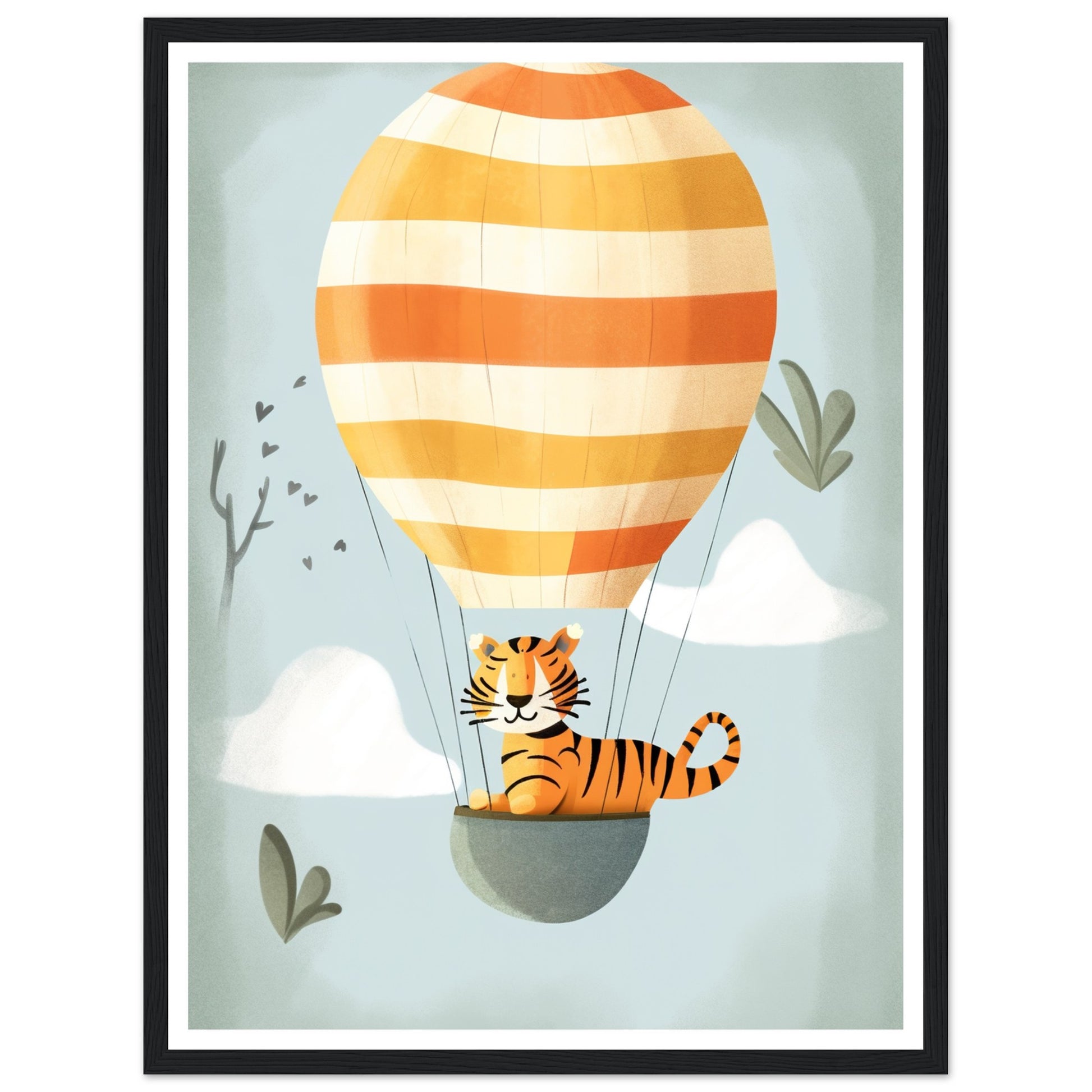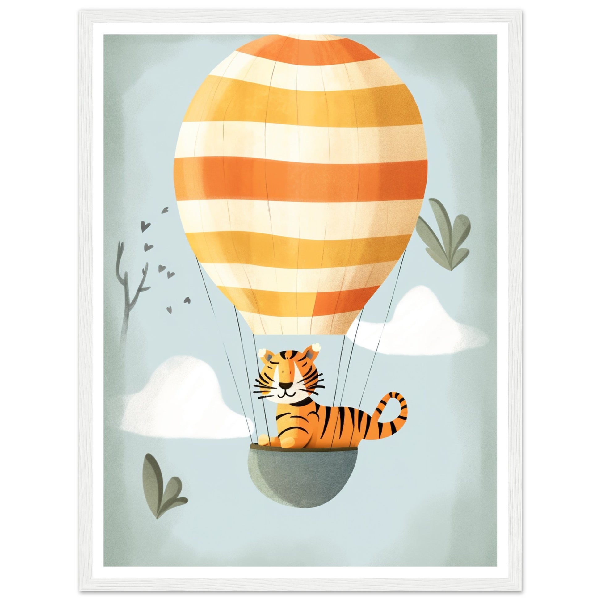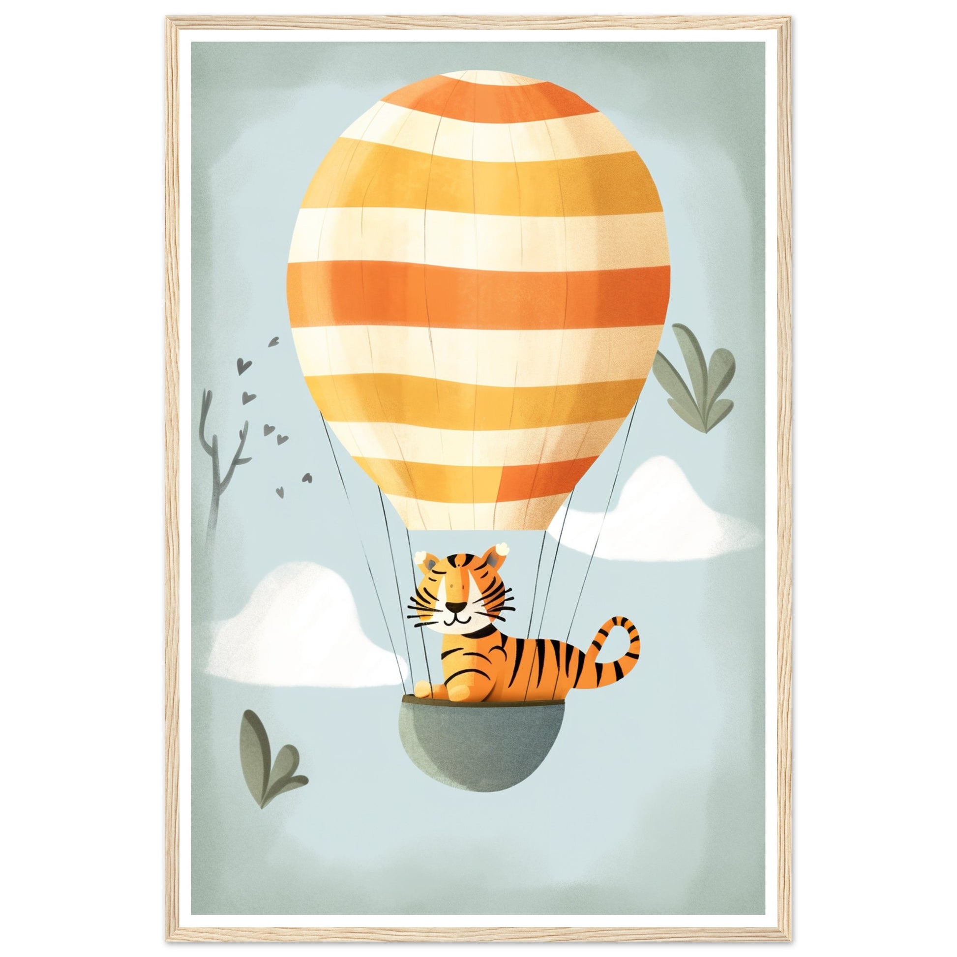 A captivating piece that will ignite your child's imagination and transport them to a world of adventure! This delightful artwork depicts a majestic tiger soaring high in the sky, accompanied by an orange striped hot air balloon, all beautifully rendered in a whimsical storybook-style illustration.