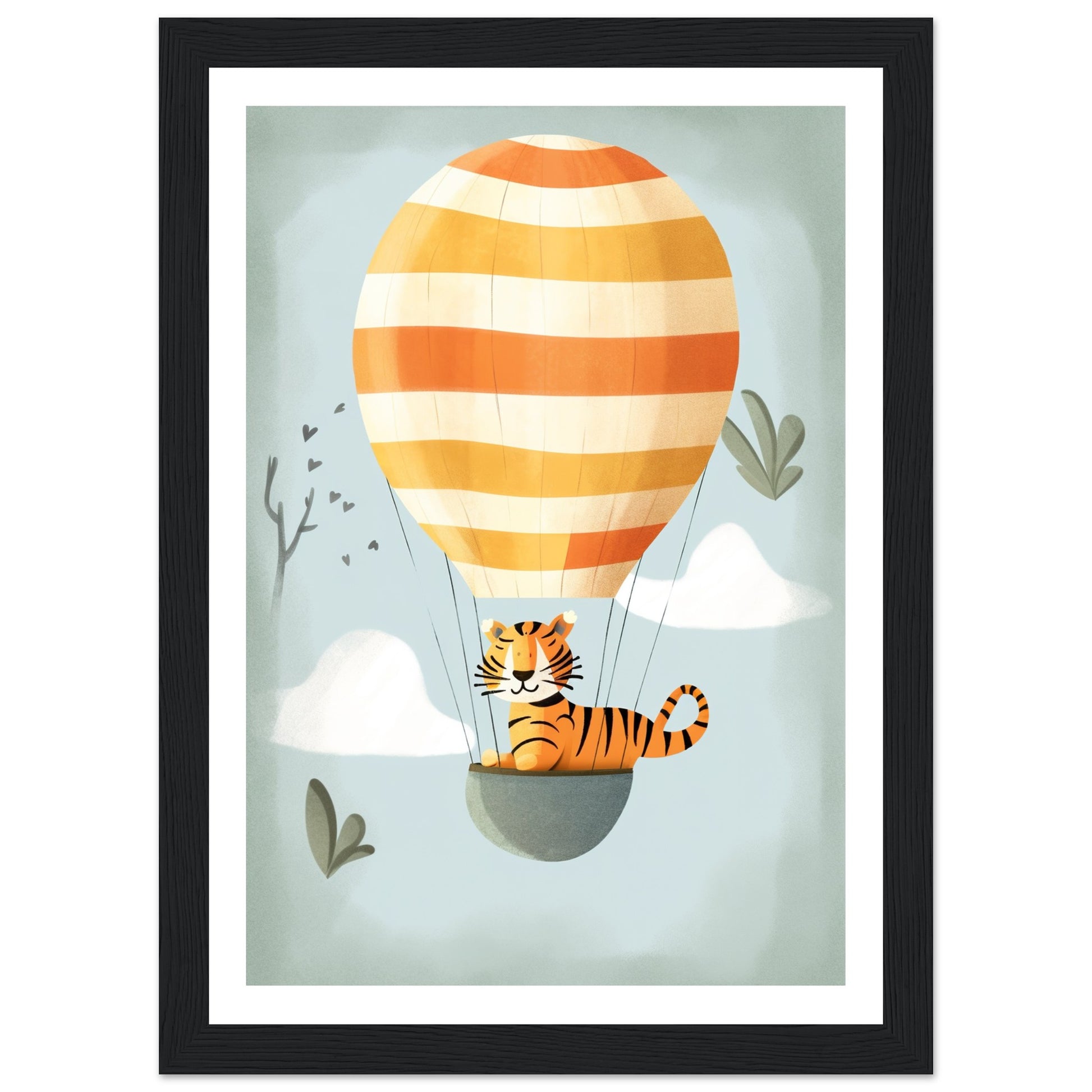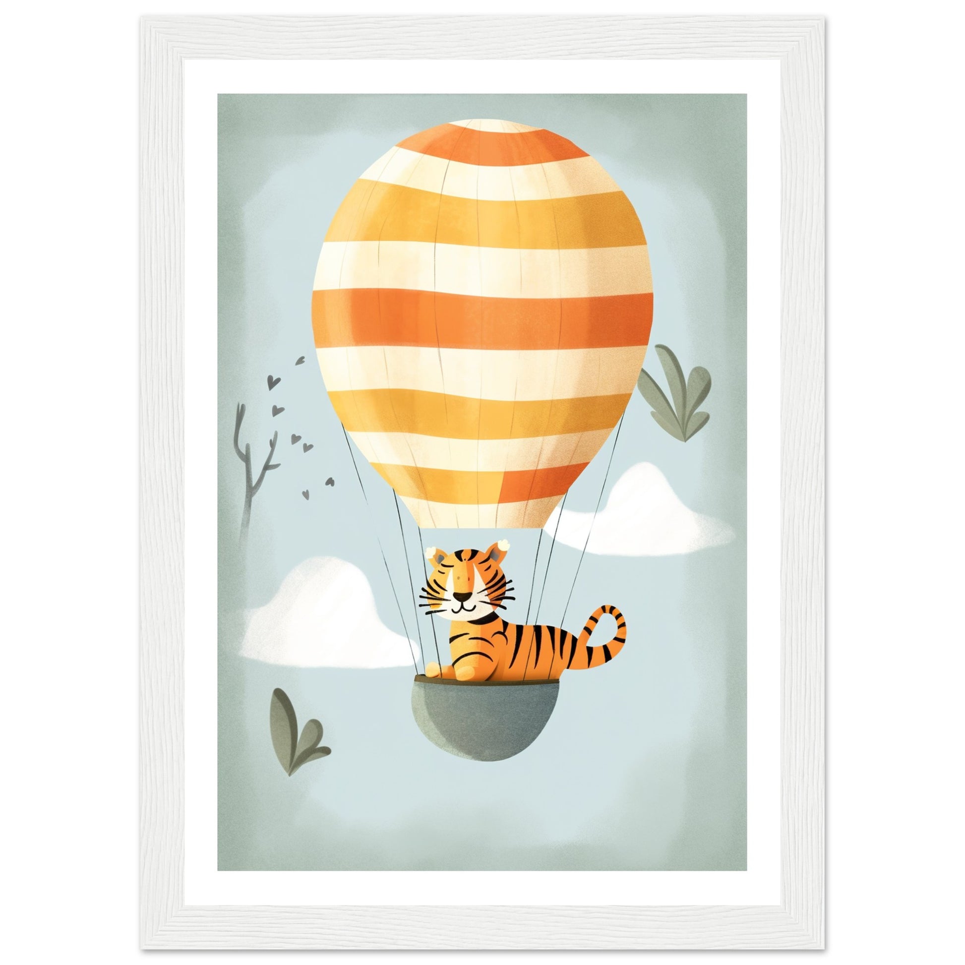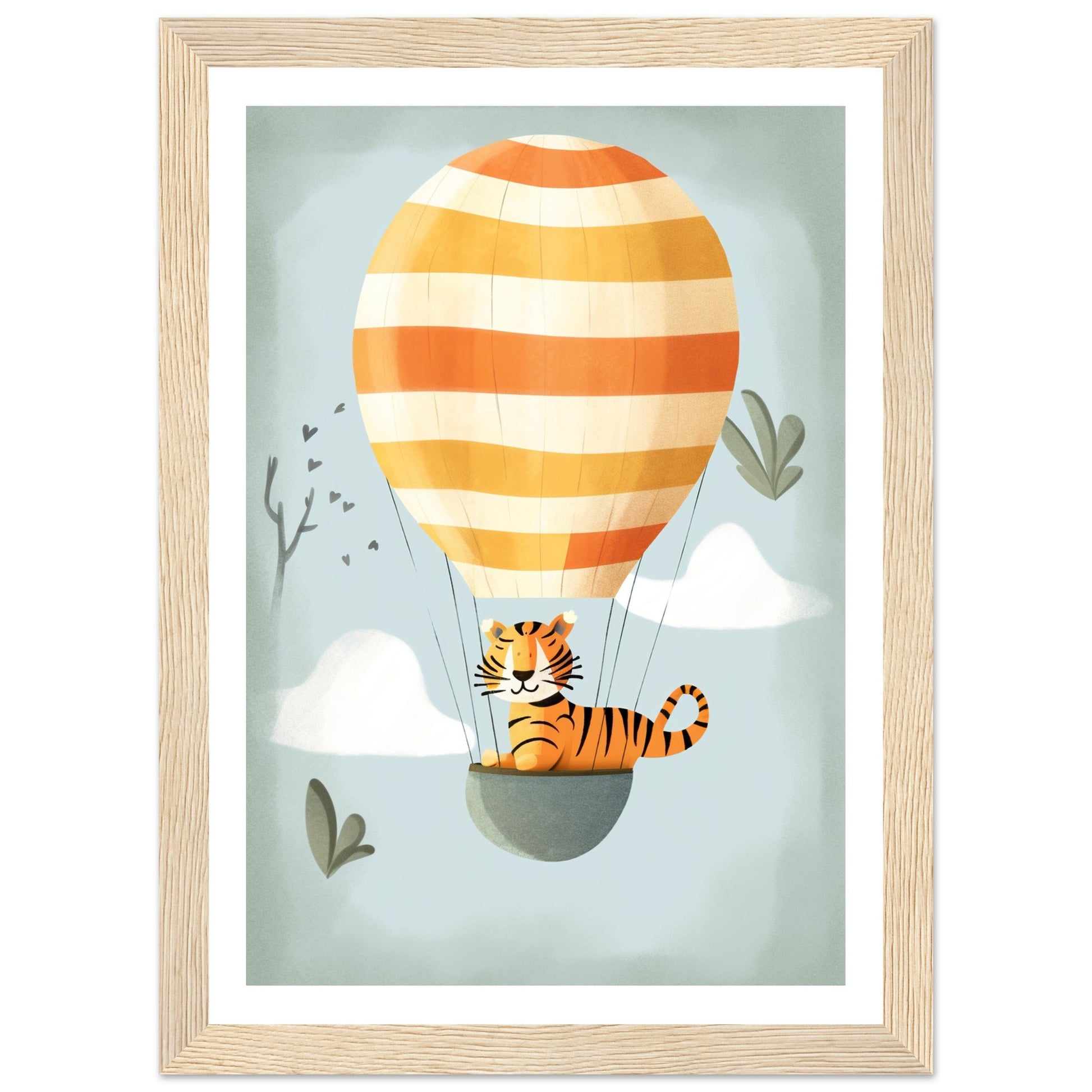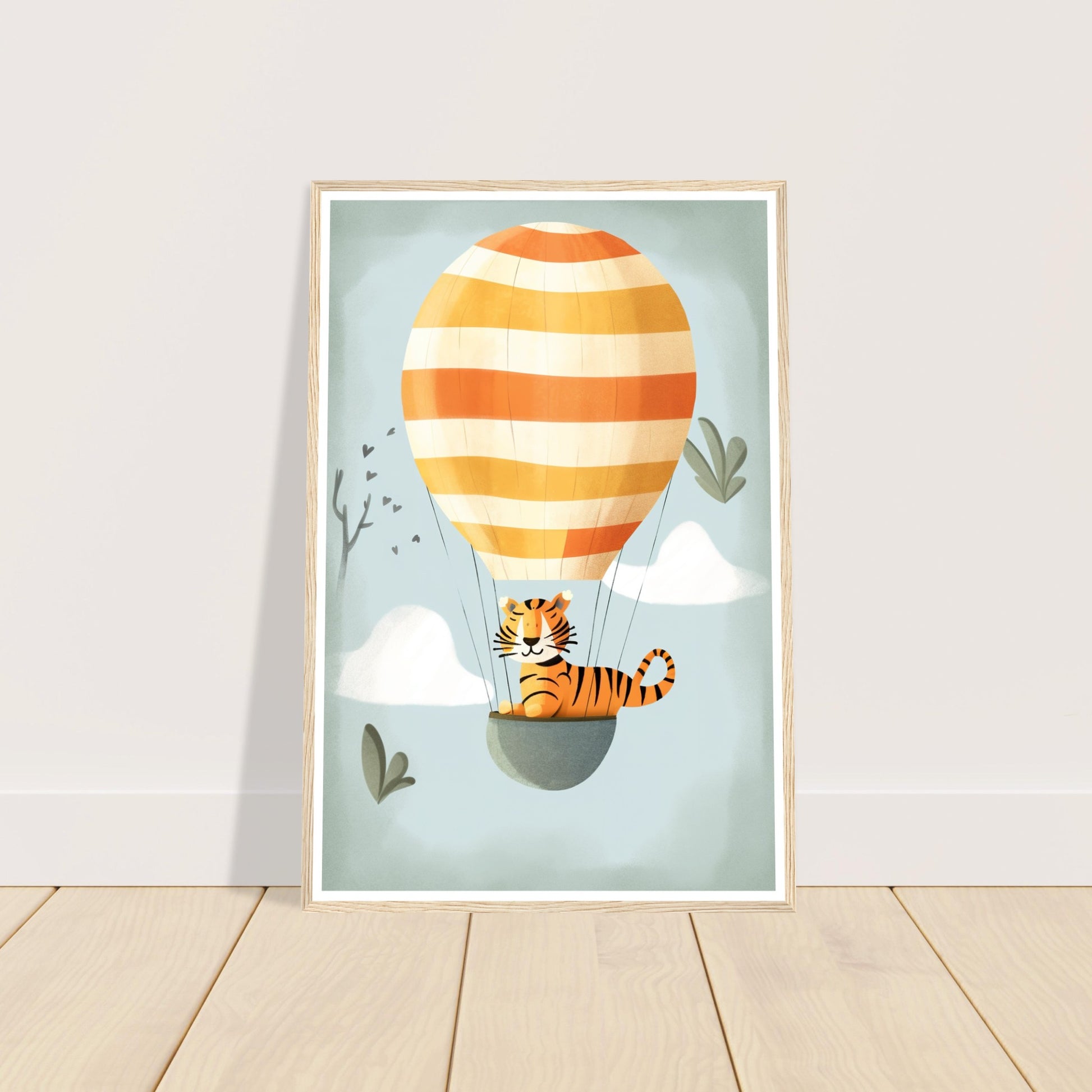 A captivating piece that will ignite your child's imagination and transport them to a world of adventure! This delightful artwork depicts a majestic tiger soaring high in the sky, accompanied by an orange striped hot air balloon, all beautifully rendered in a whimsical storybook-style illustration.