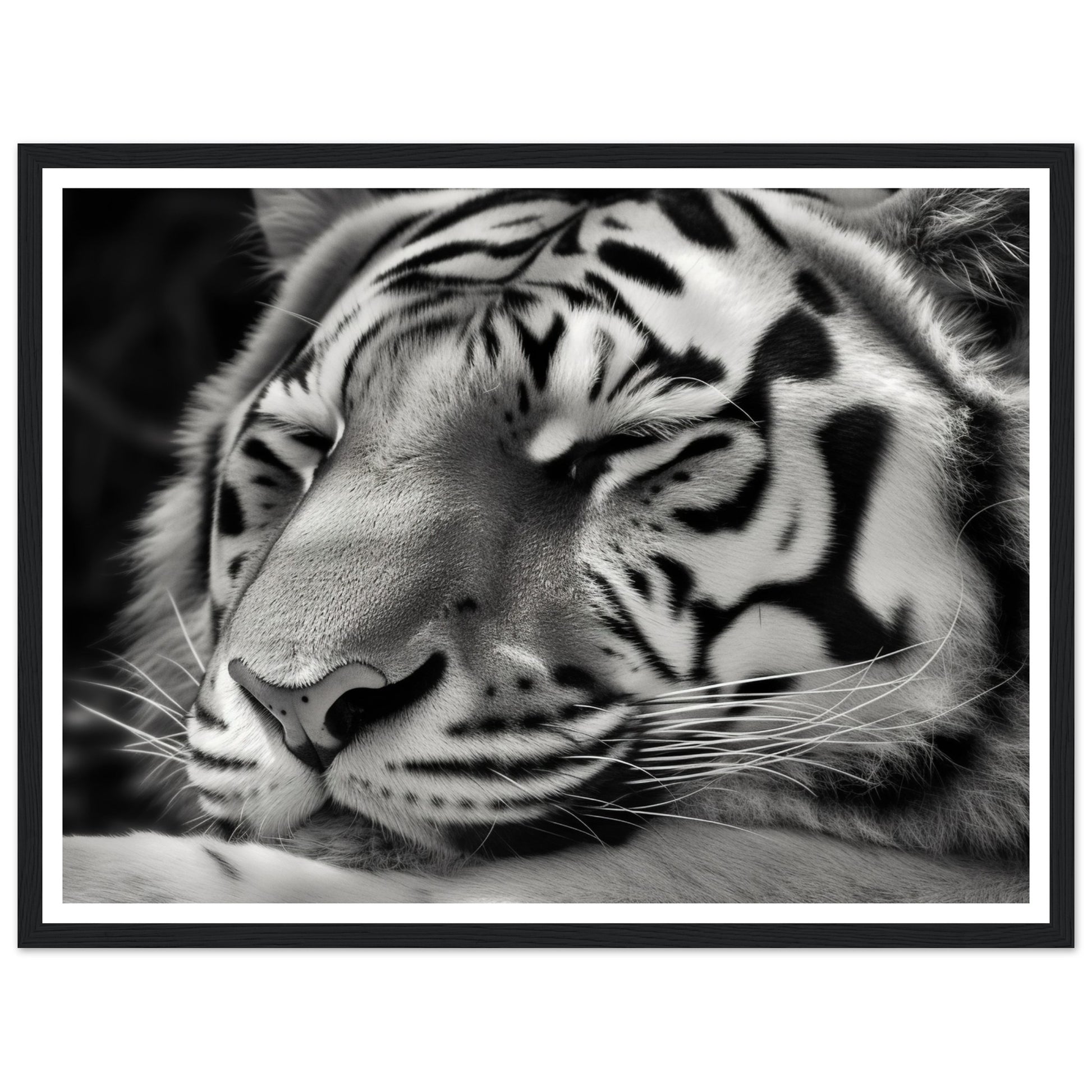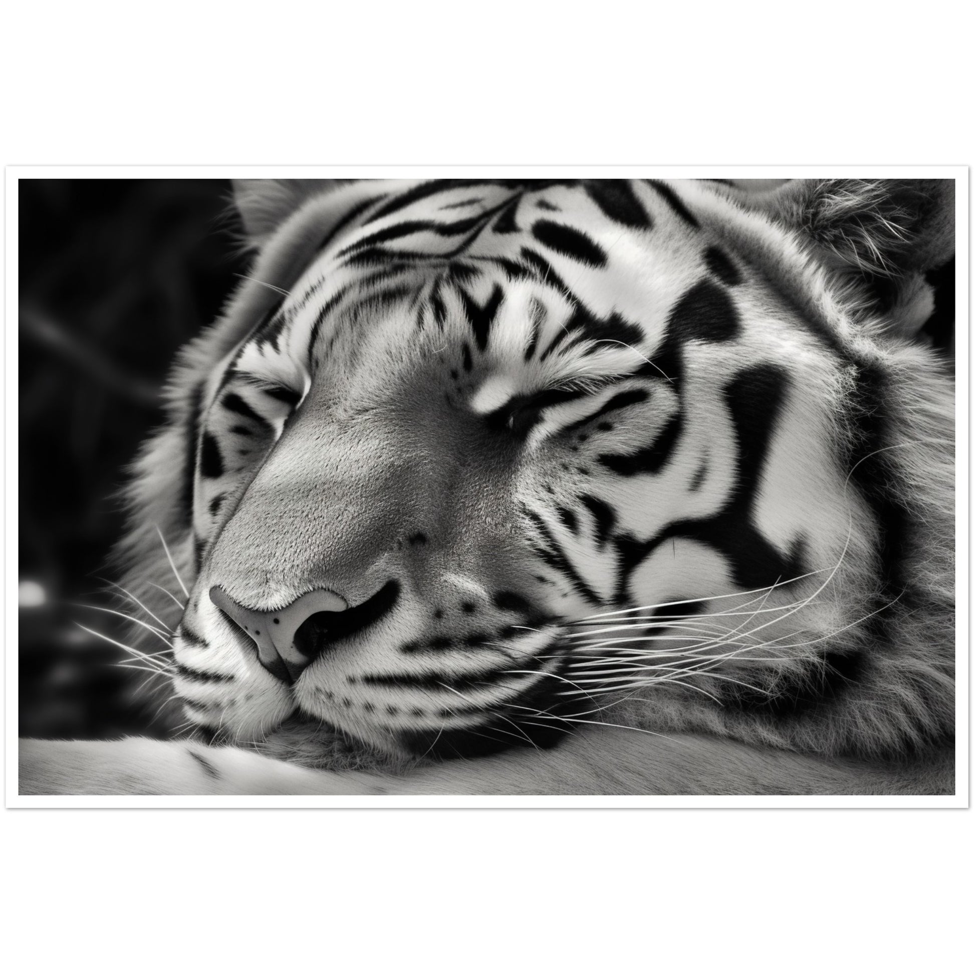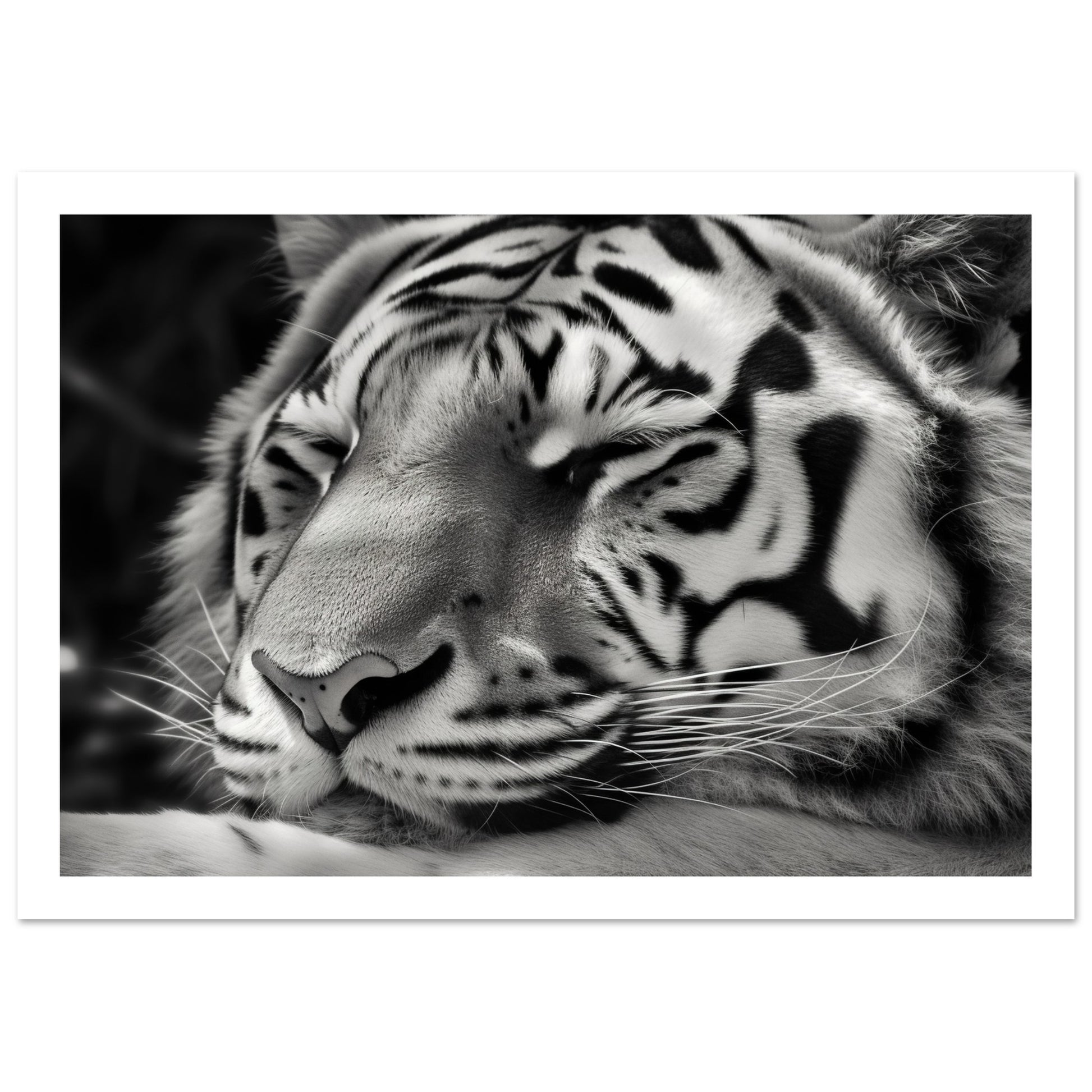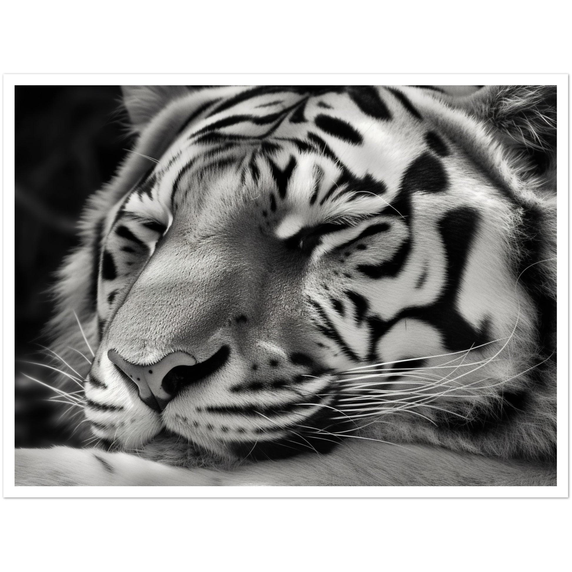 This close-up allows you to witness the quietude and majesty of the tiger's slumber. The monochrome presentation adds a timeless and captivating aura to the image, accentuating the tiger's strength and peaceful expression. Immerse yourself in the tranquil atmosphere and contemplate the magnificence of these awe-inspiring creatures.