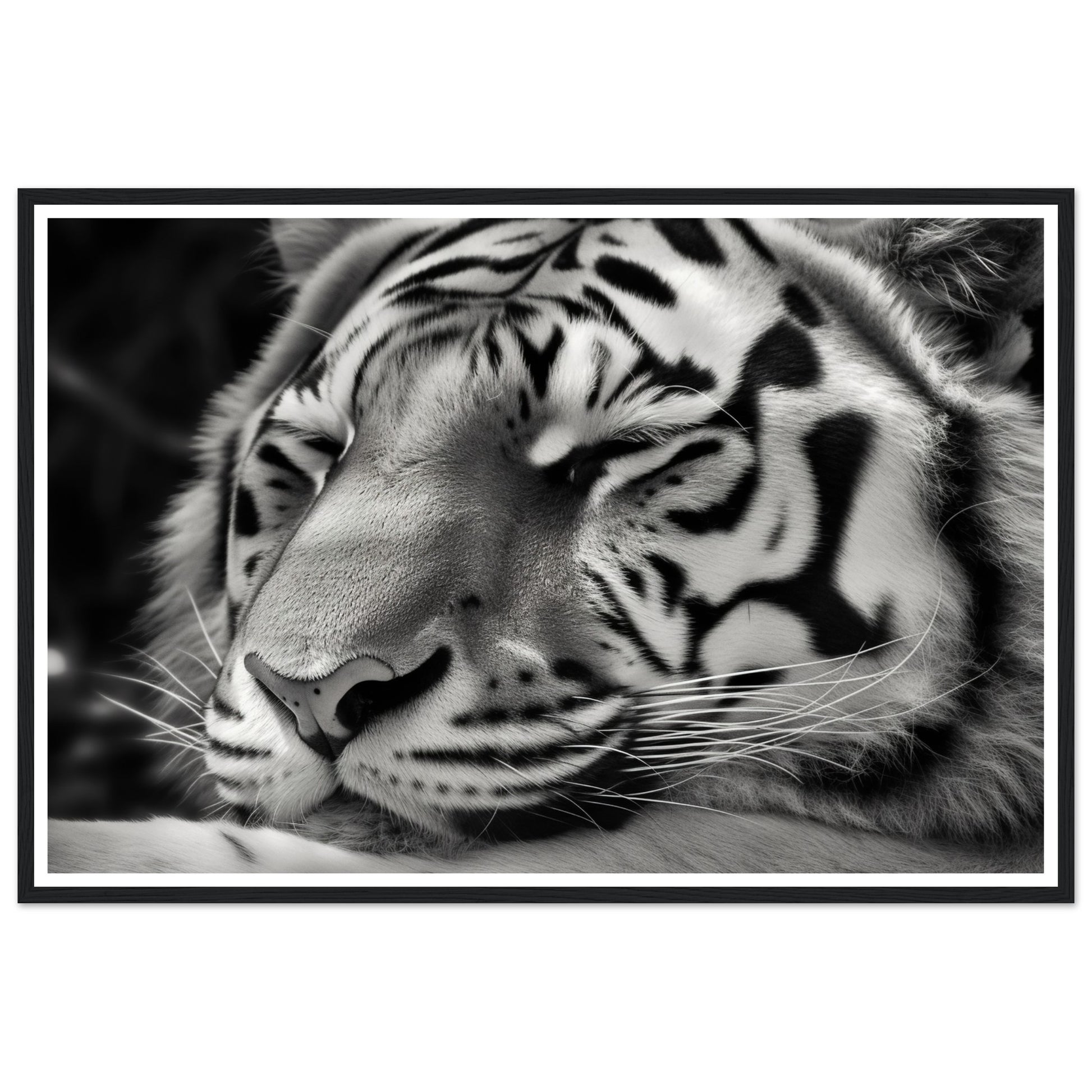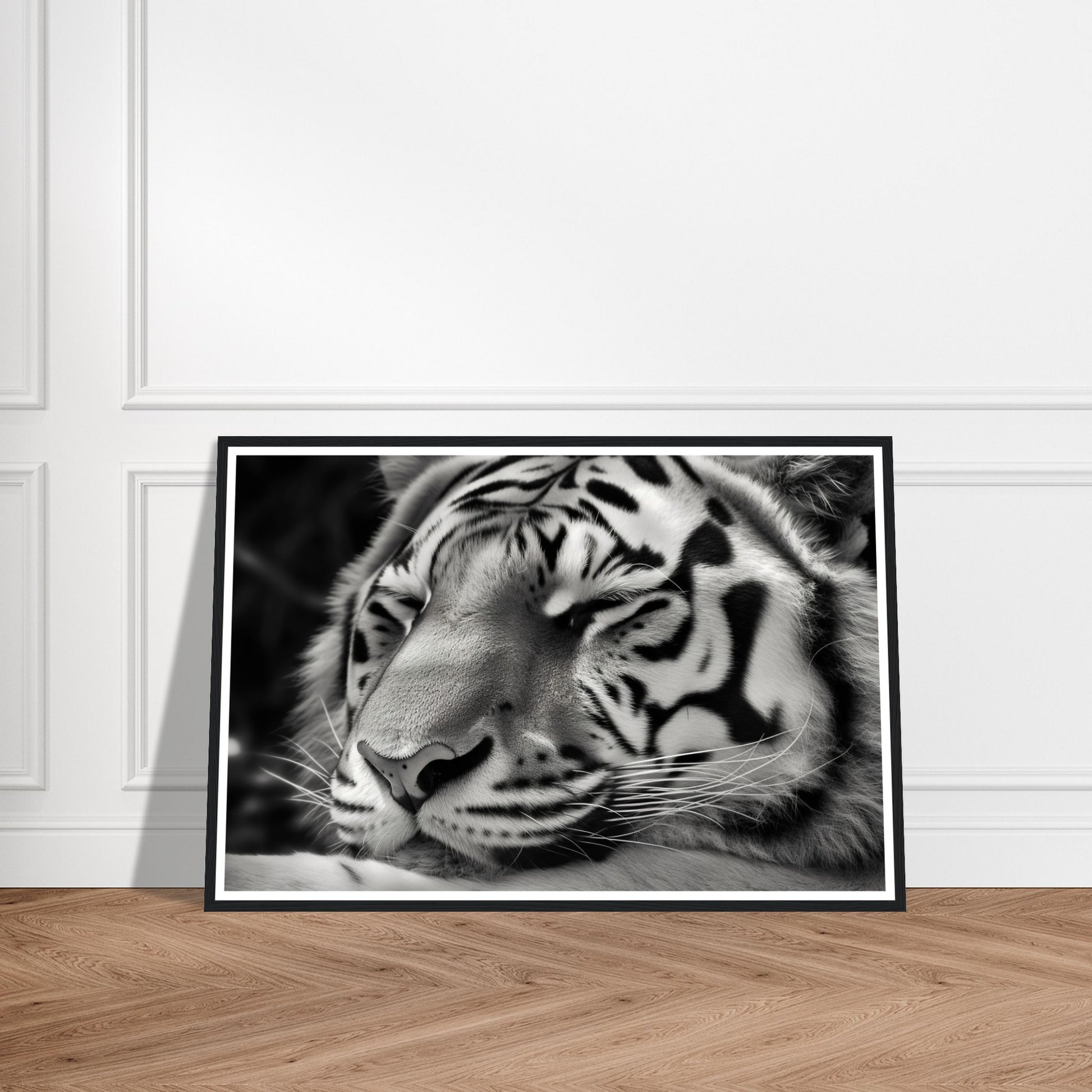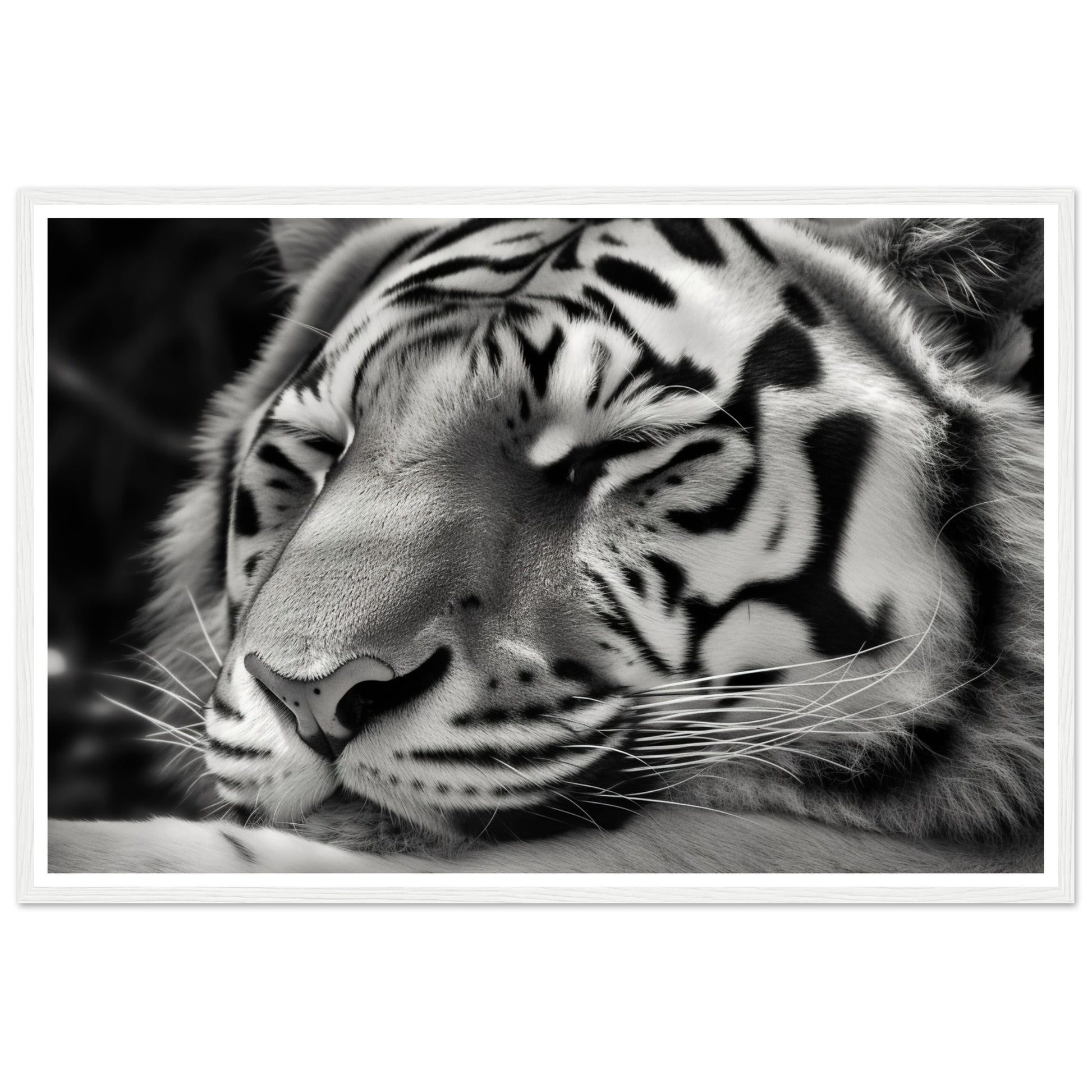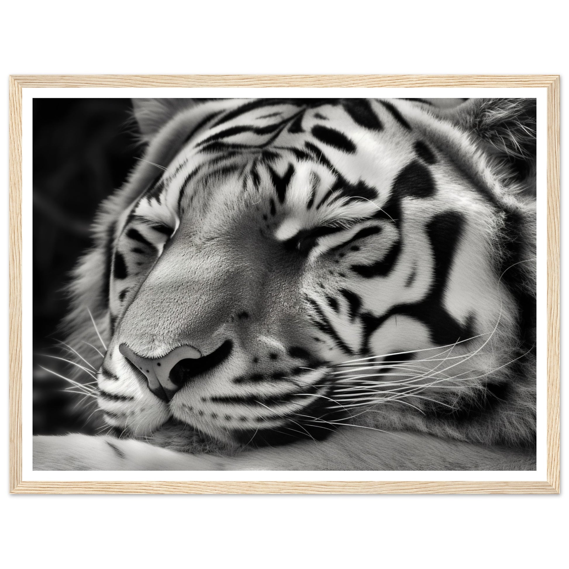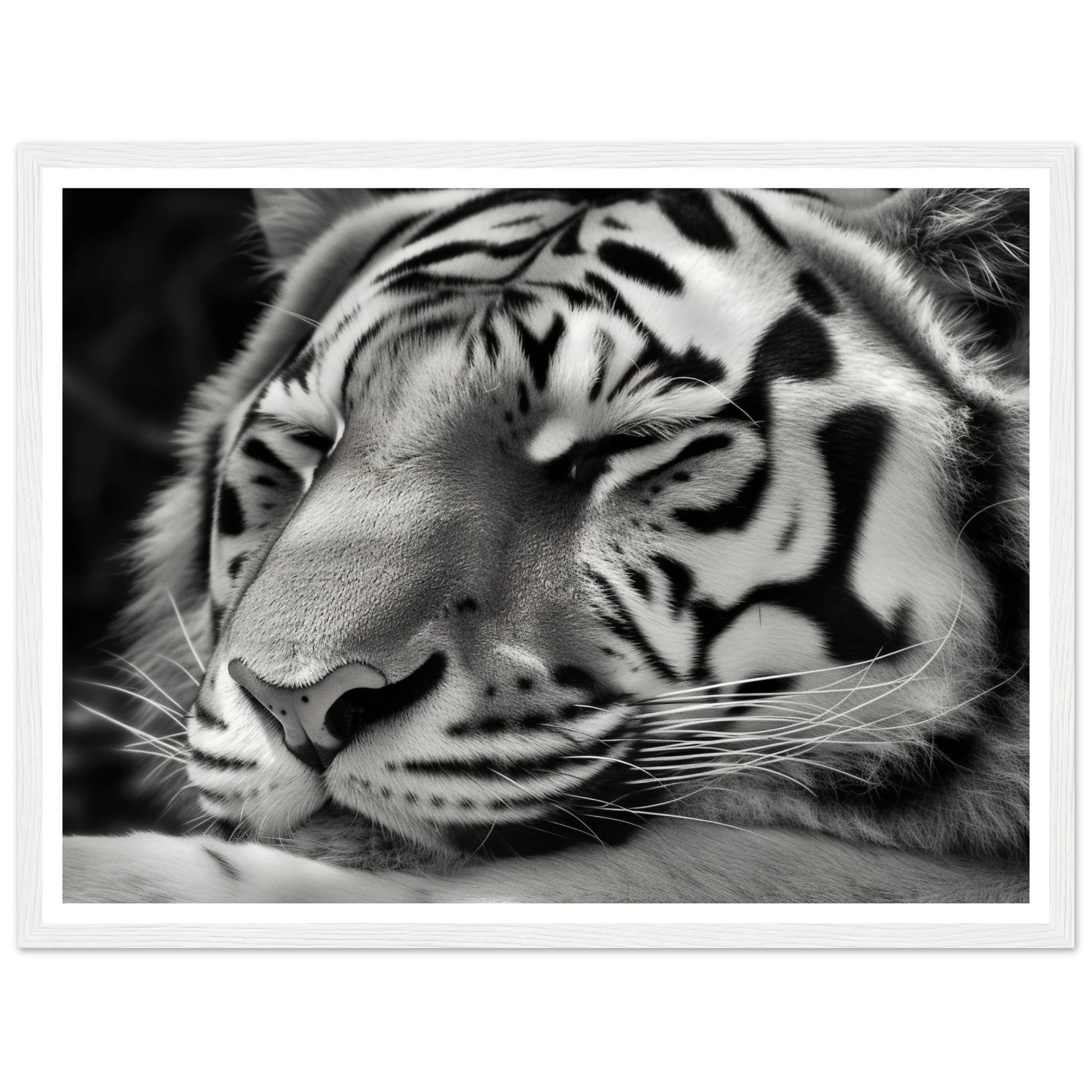 This close-up allows you to witness the quietude and majesty of the tiger's slumber. The monochrome presentation adds a timeless and captivating aura to the image, accentuating the tiger's strength and peaceful expression. Immerse yourself in the tranquil atmosphere and contemplate the magnificence of these awe-inspiring creatures.