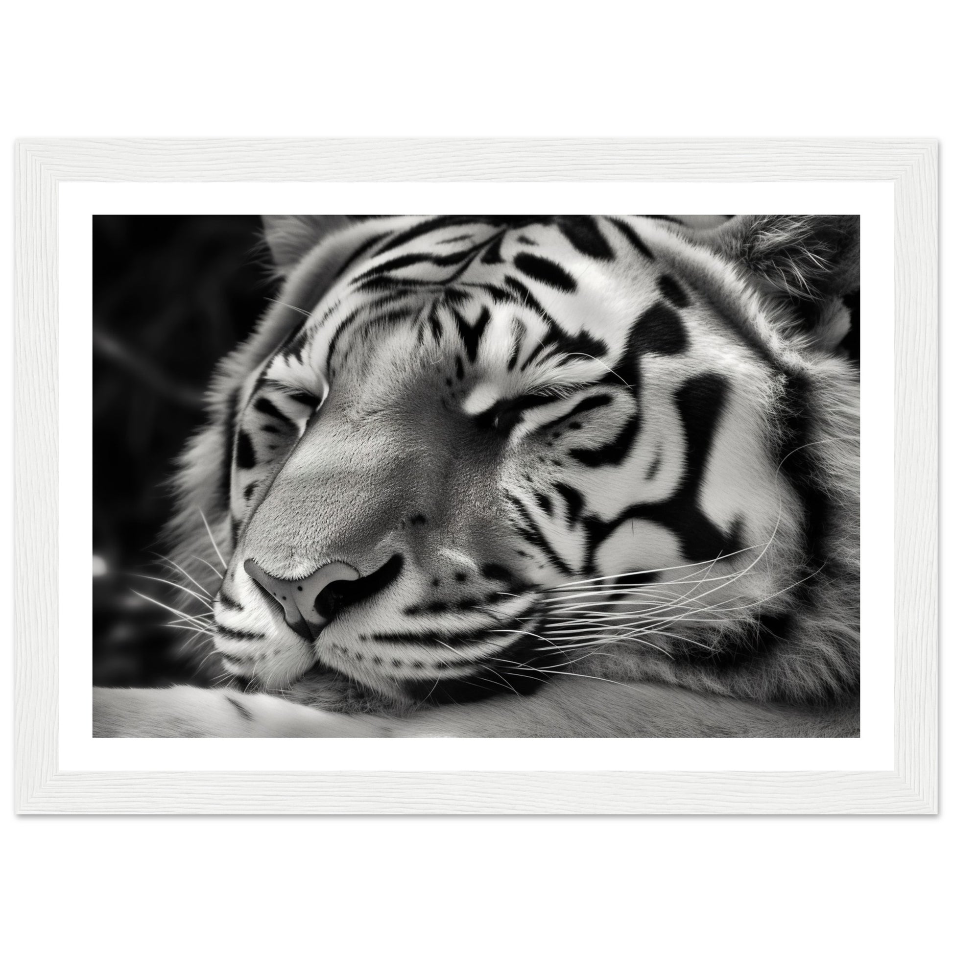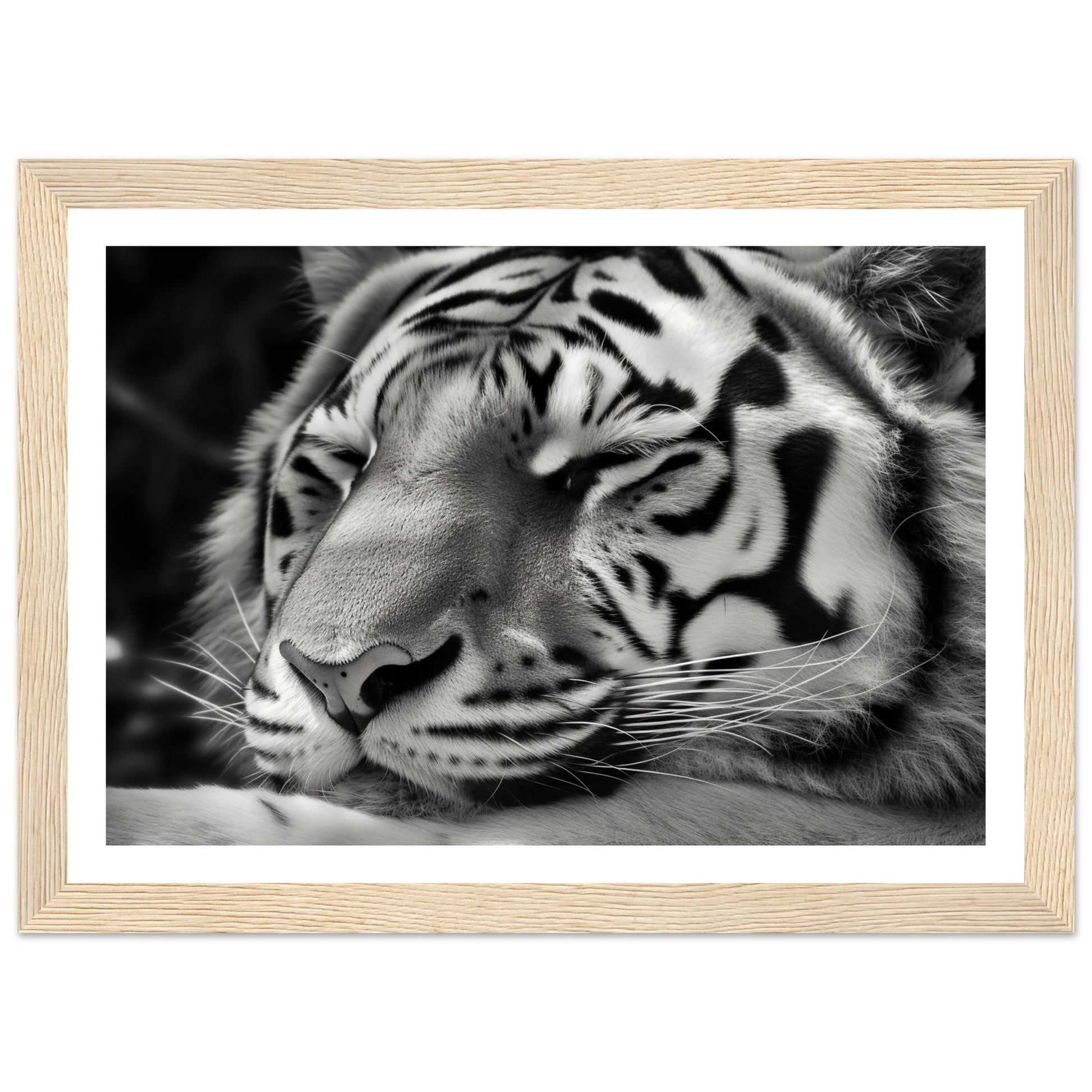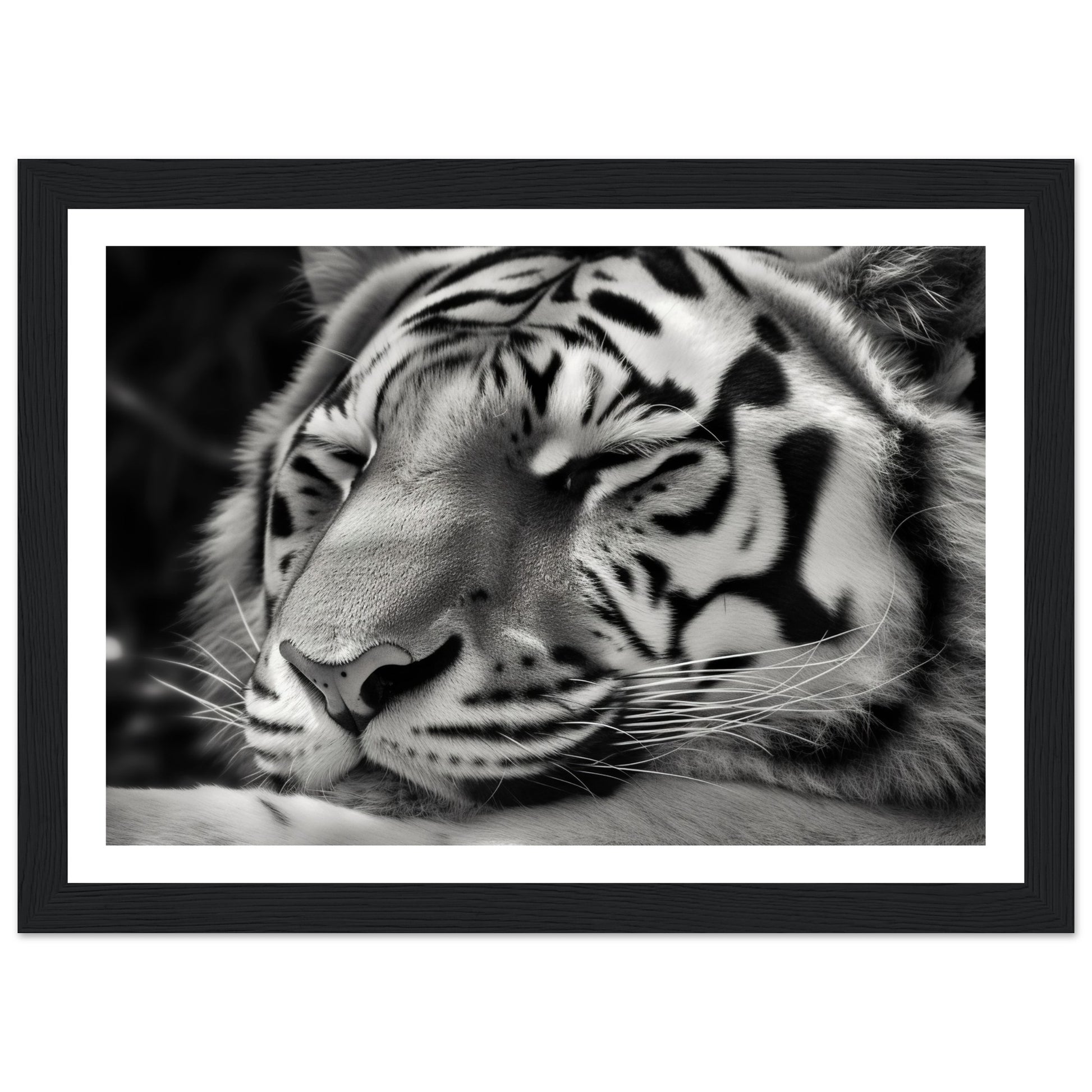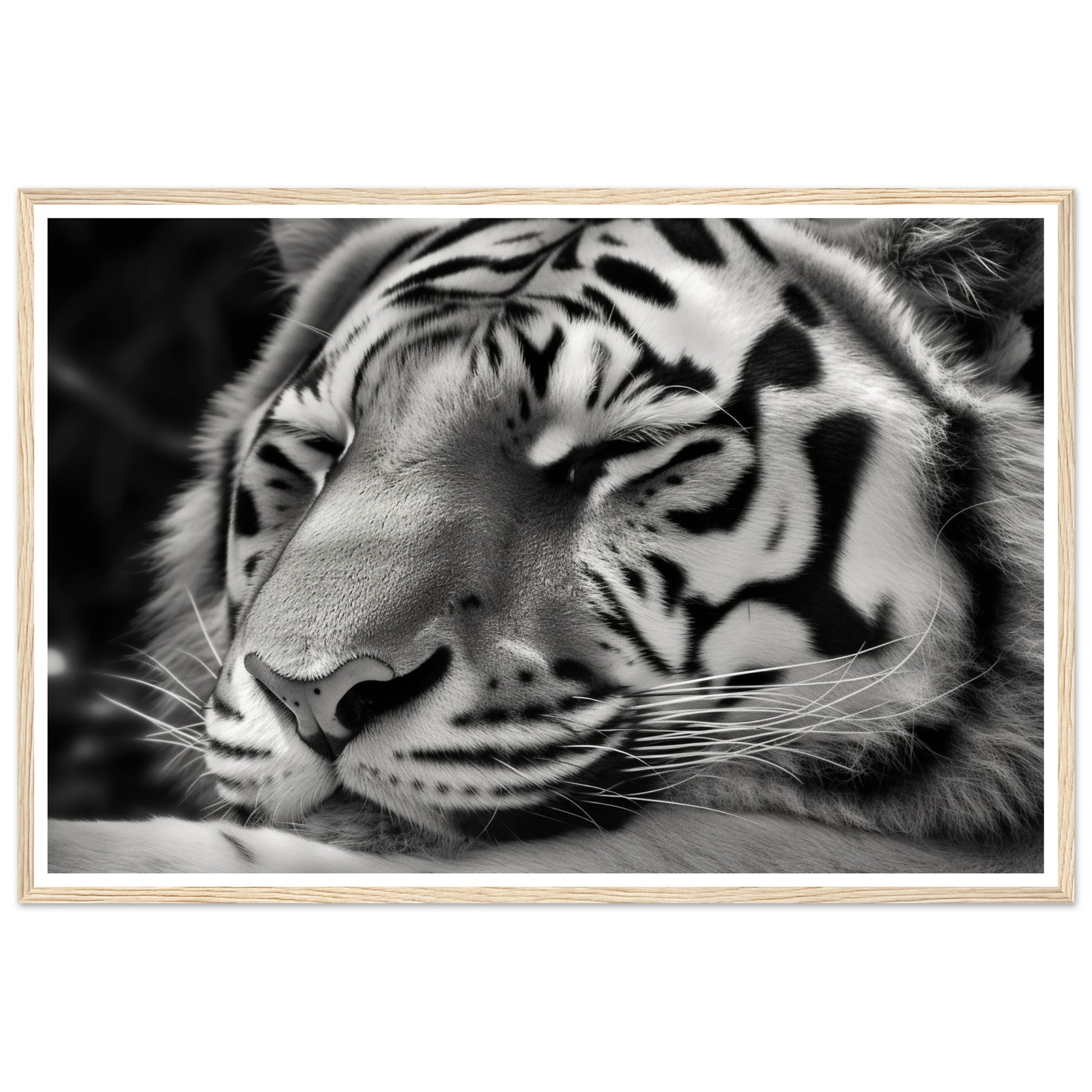 This close-up allows you to witness the quietude and majesty of the tiger's slumber. The monochrome presentation adds a timeless and captivating aura to the image, accentuating the tiger's strength and peaceful expression. Immerse yourself in the tranquil atmosphere and contemplate the magnificence of these awe-inspiring creatures.