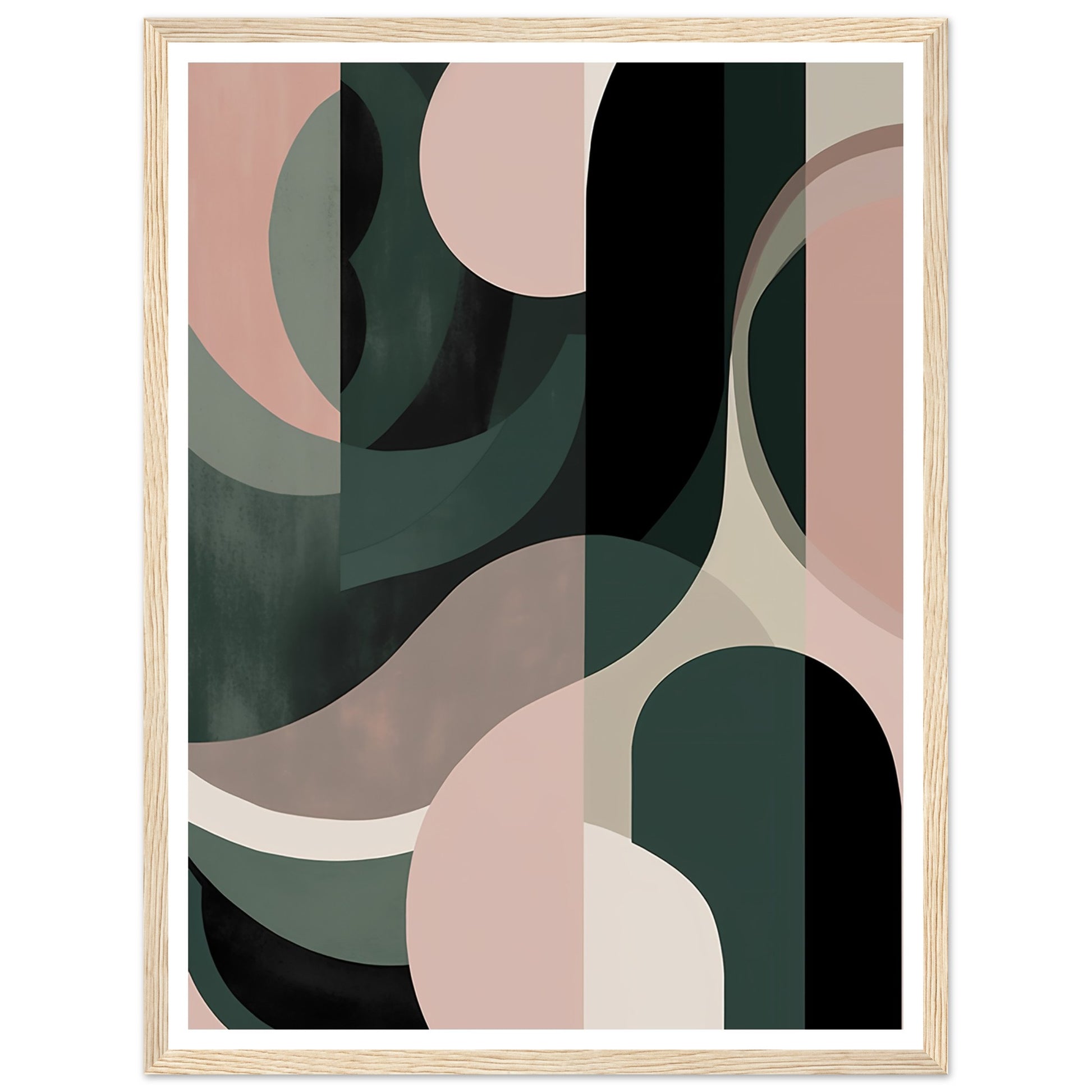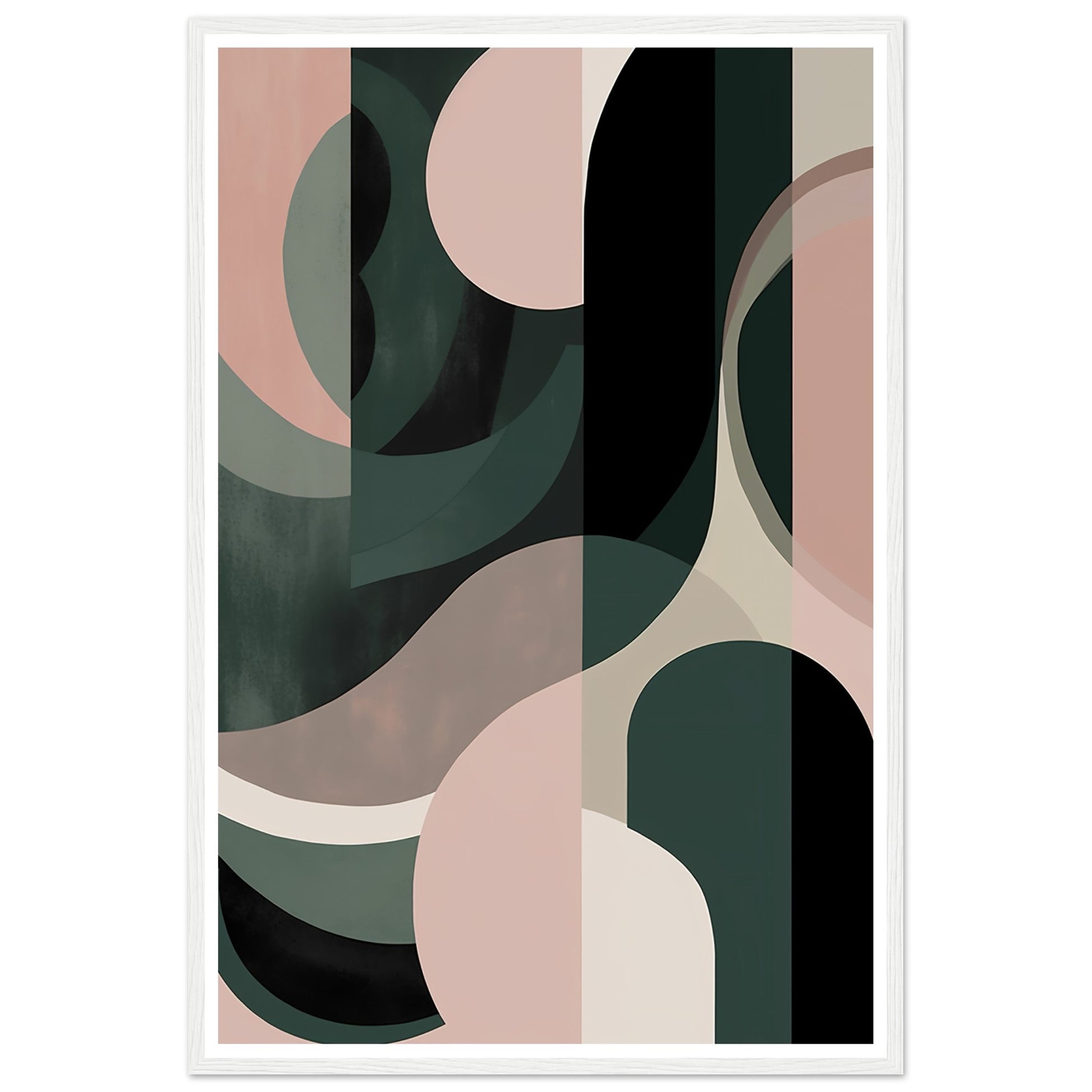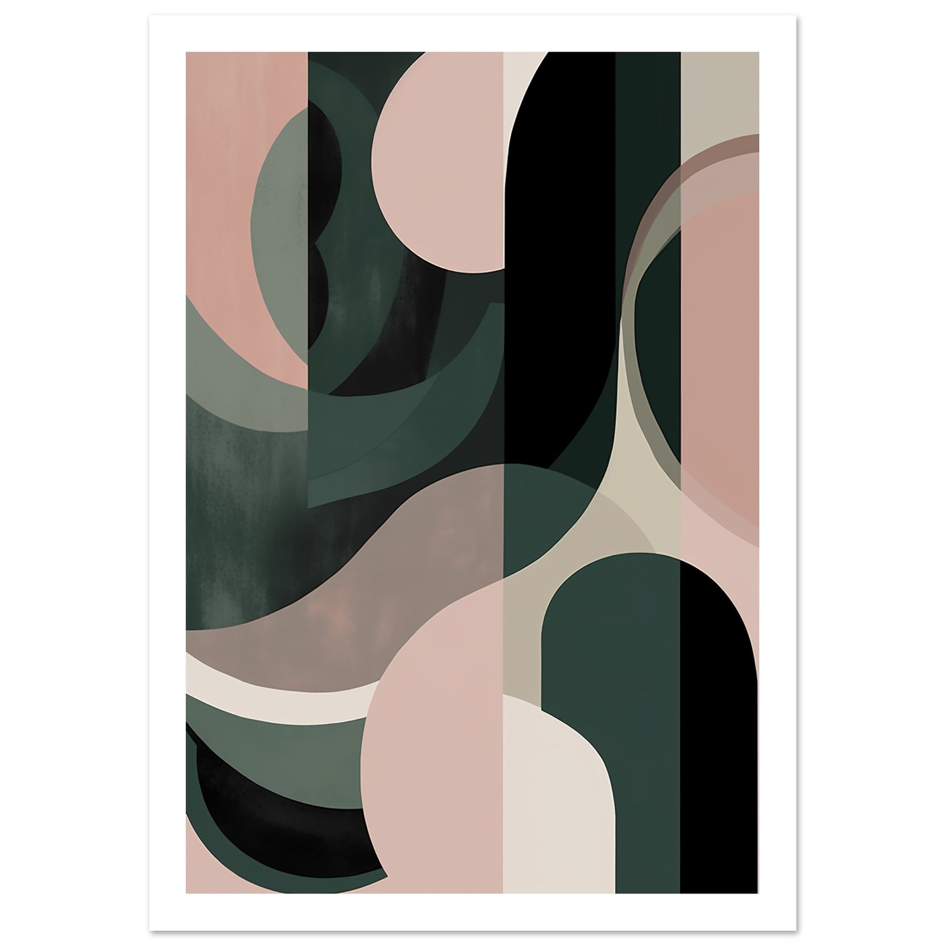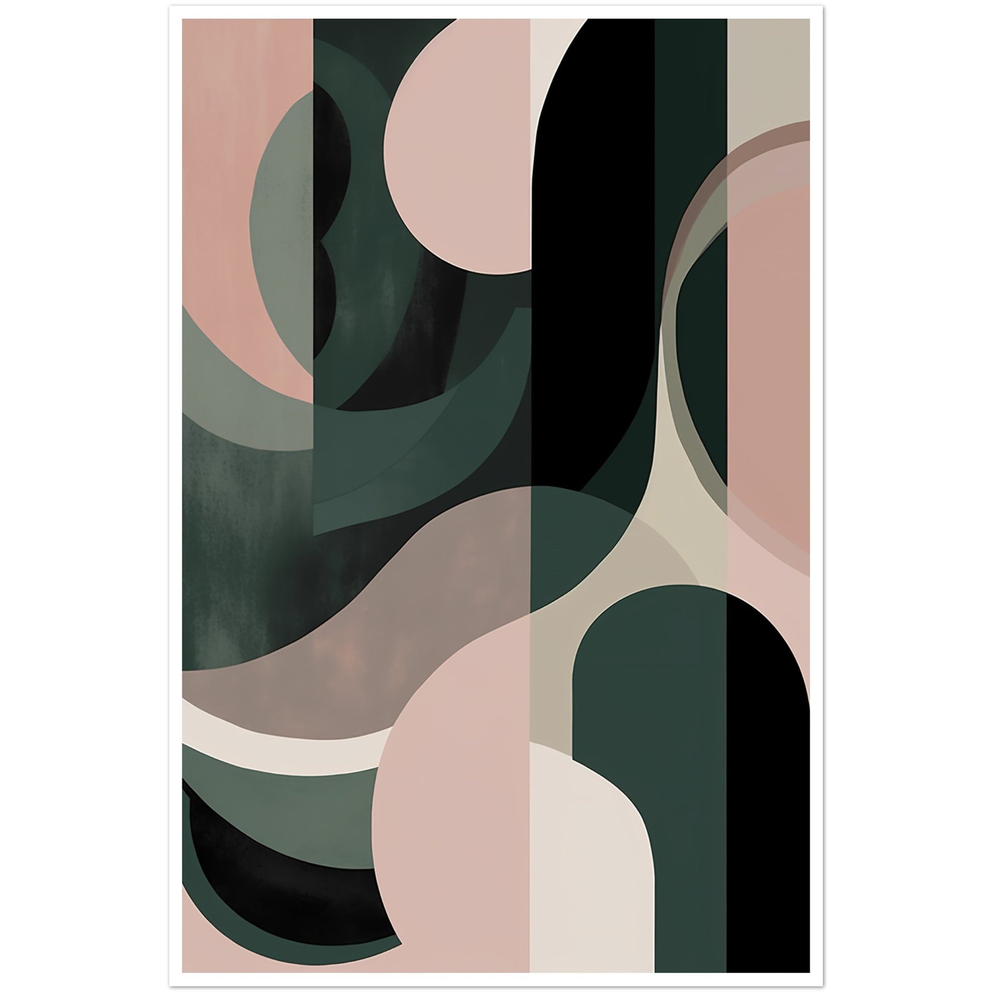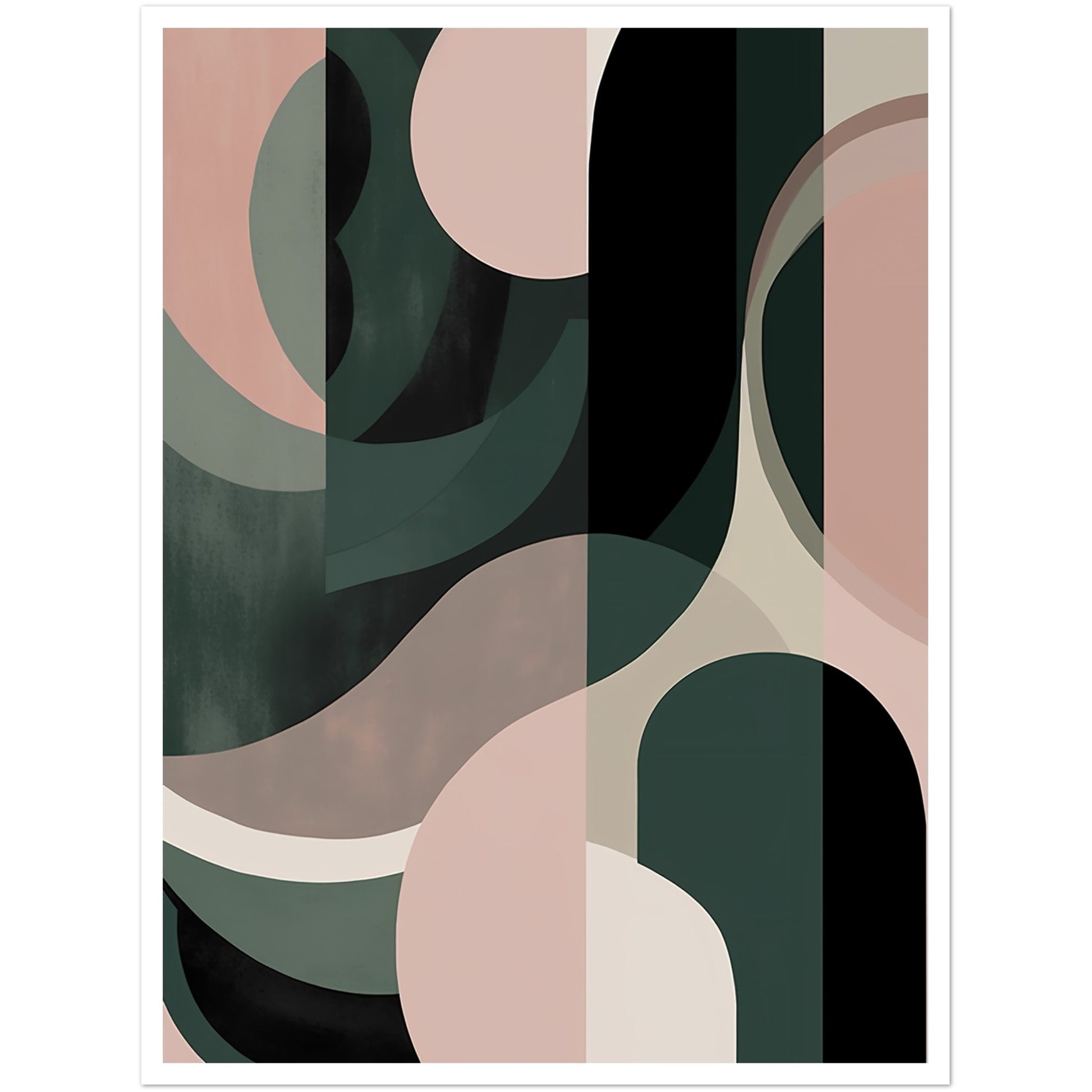 Serene light pink and dark green hues create a muted colorscape, harmonizing with curvilinear and symmetrical shapes. This artwork embodies a sense of calm and balance, inviting viewers into a world of tranquility.