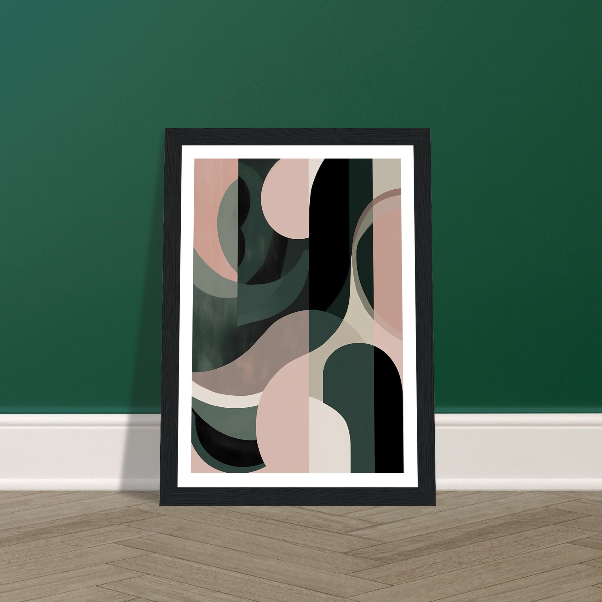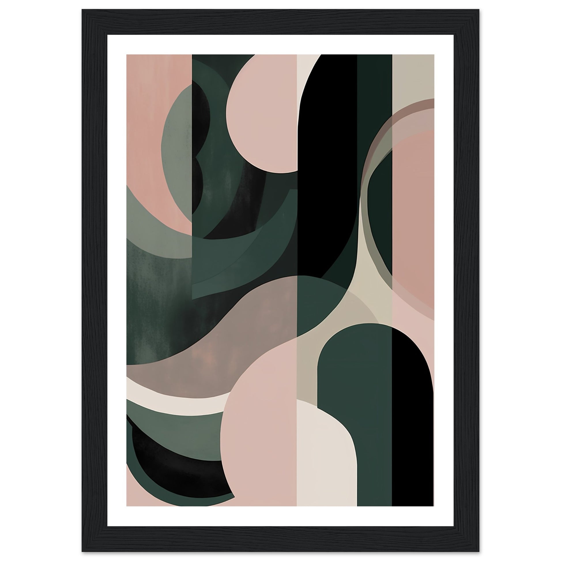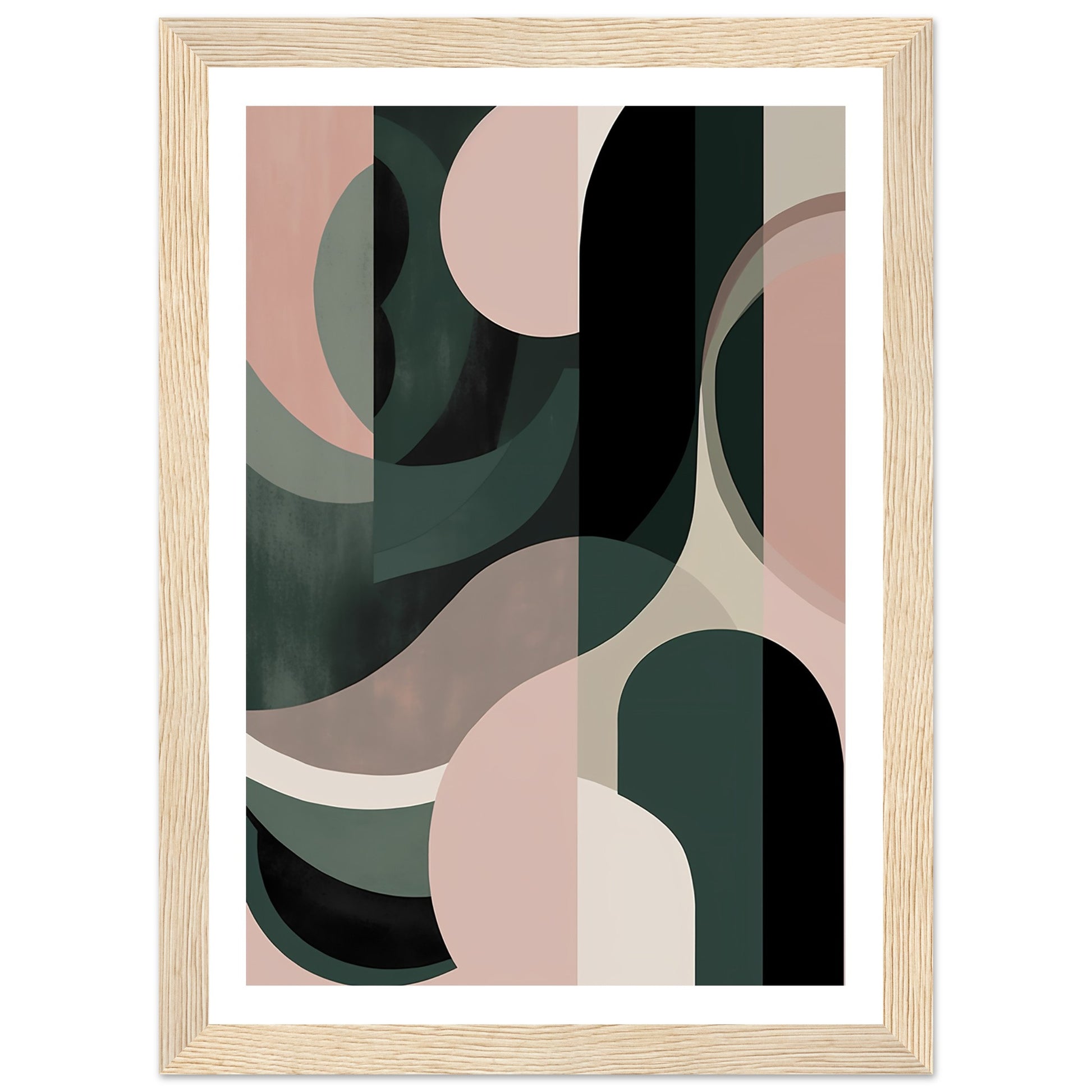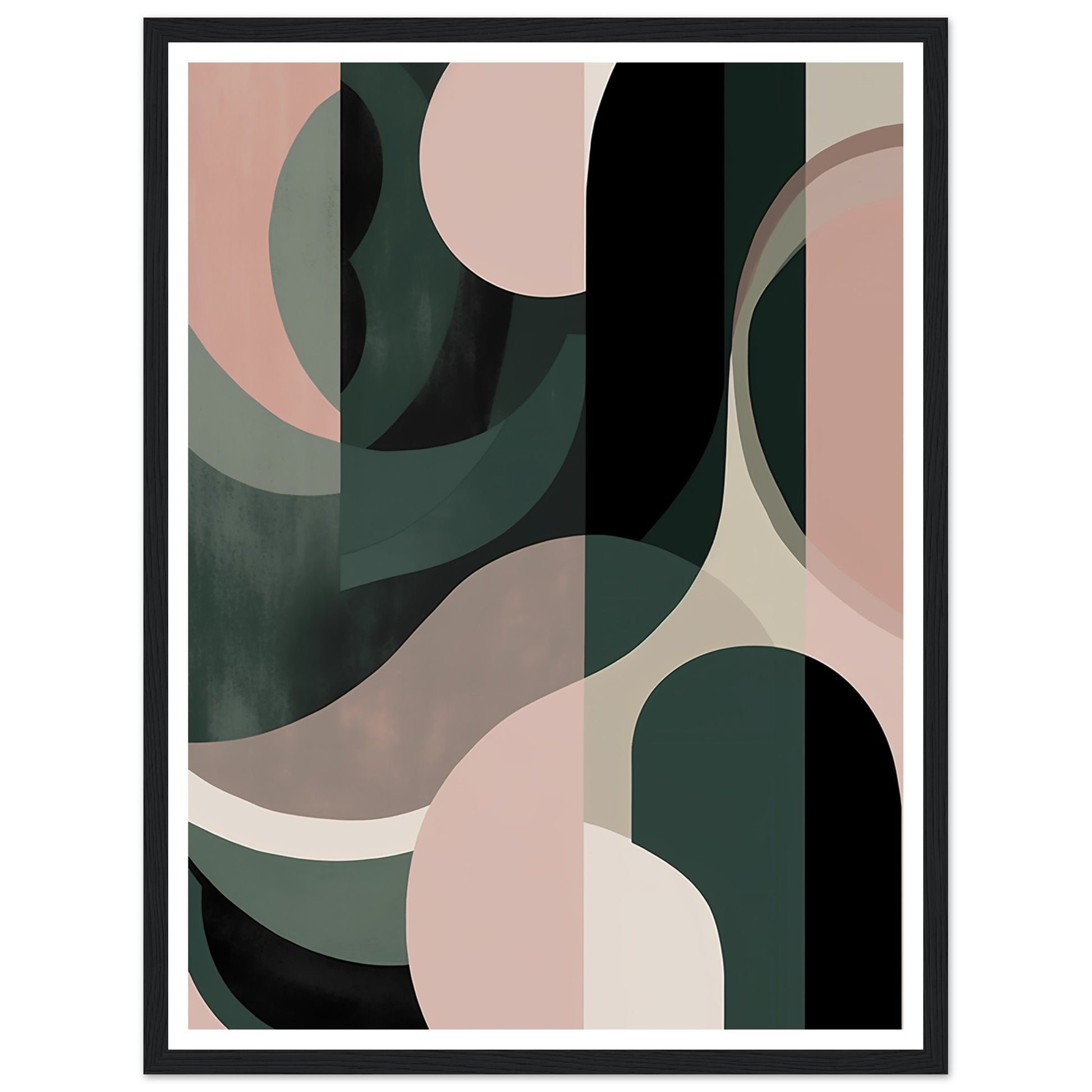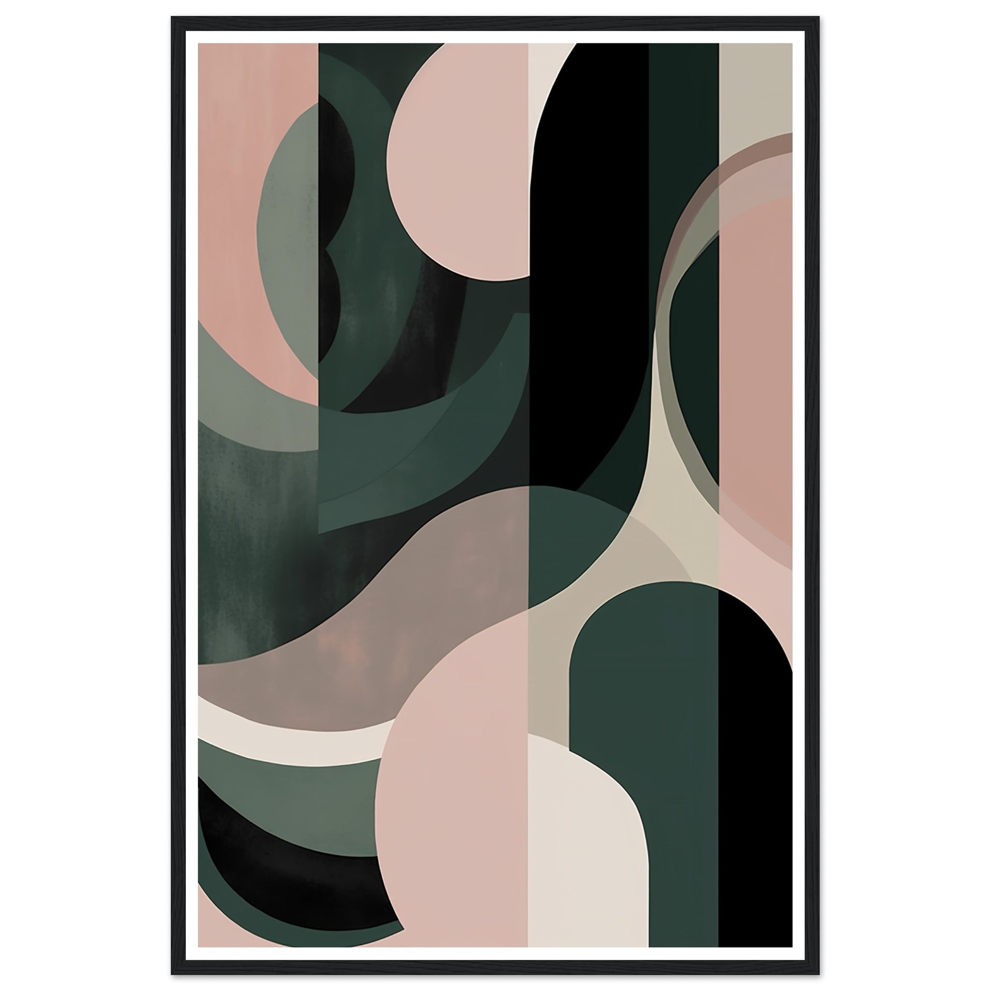 Serene light pink and dark green hues create a muted colorscape, harmonizing with curvilinear and symmetrical shapes. This artwork embodies a sense of calm and balance, inviting viewers into a world of tranquility.