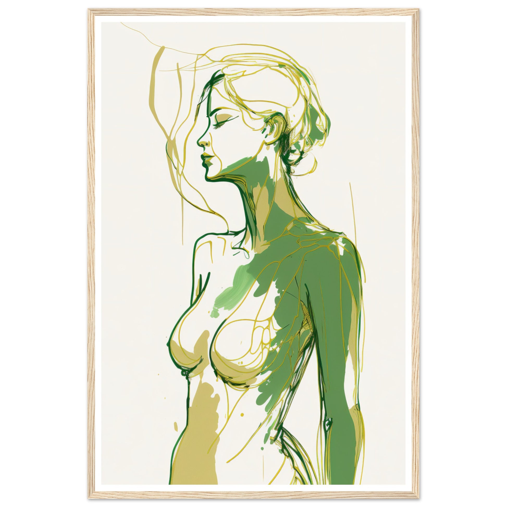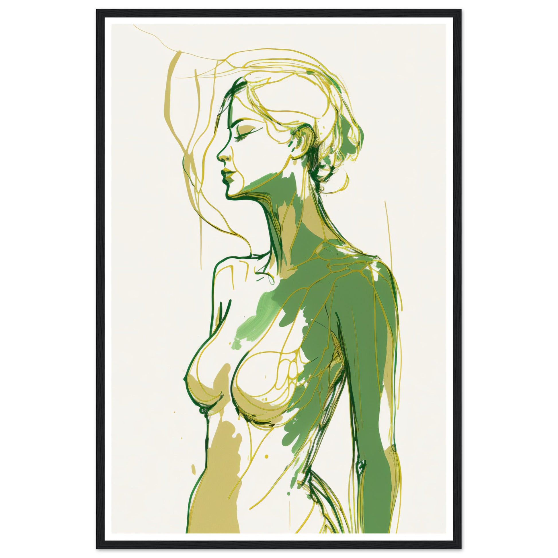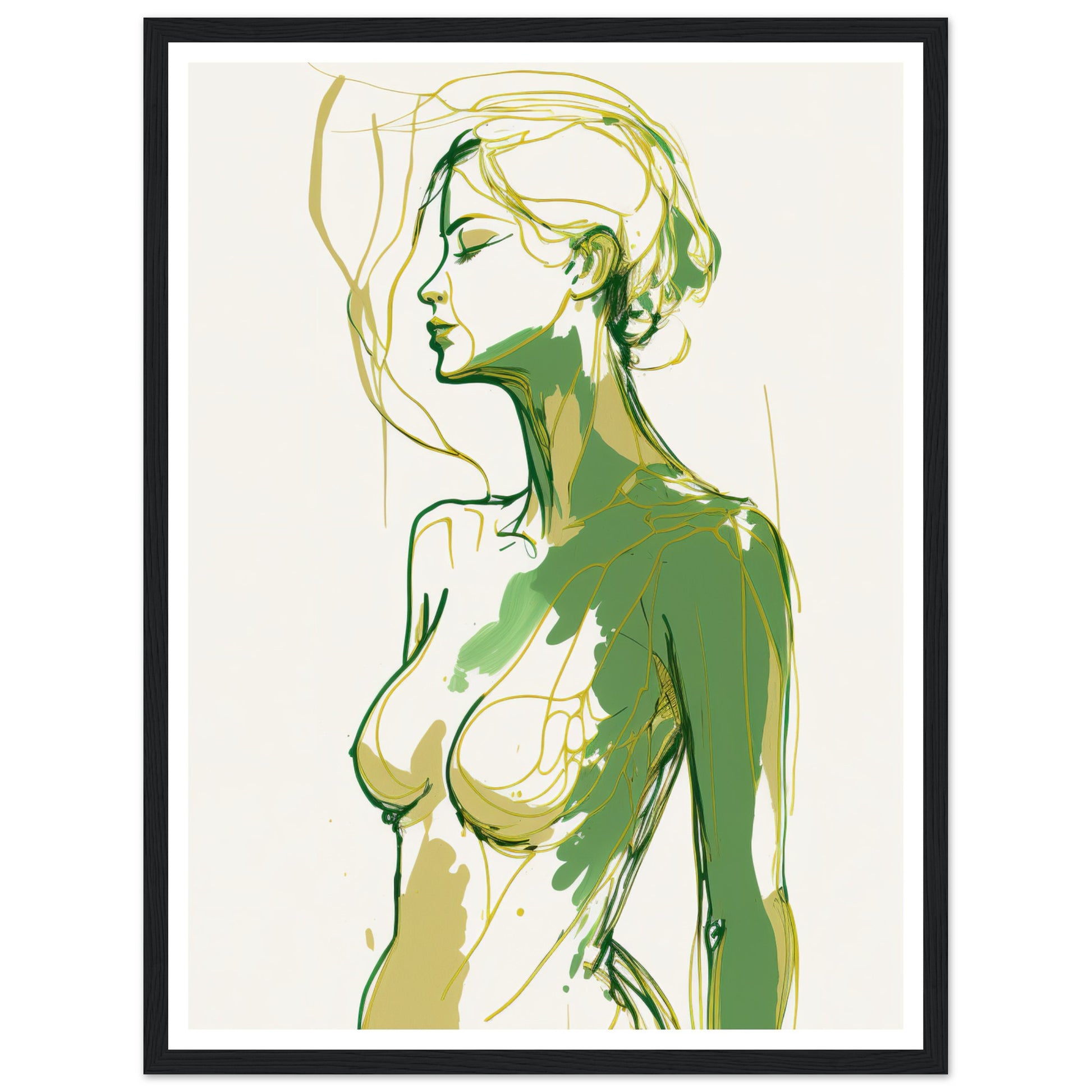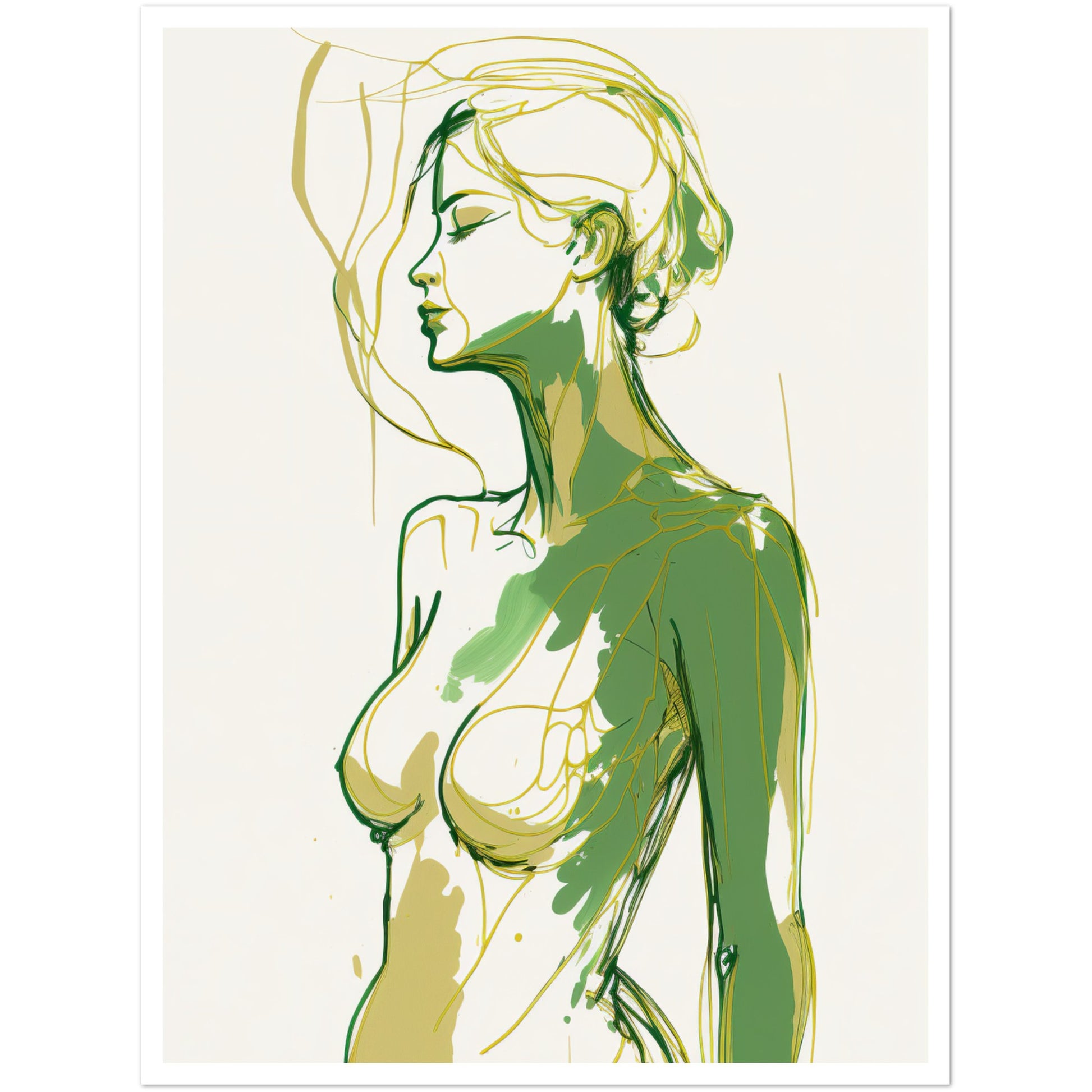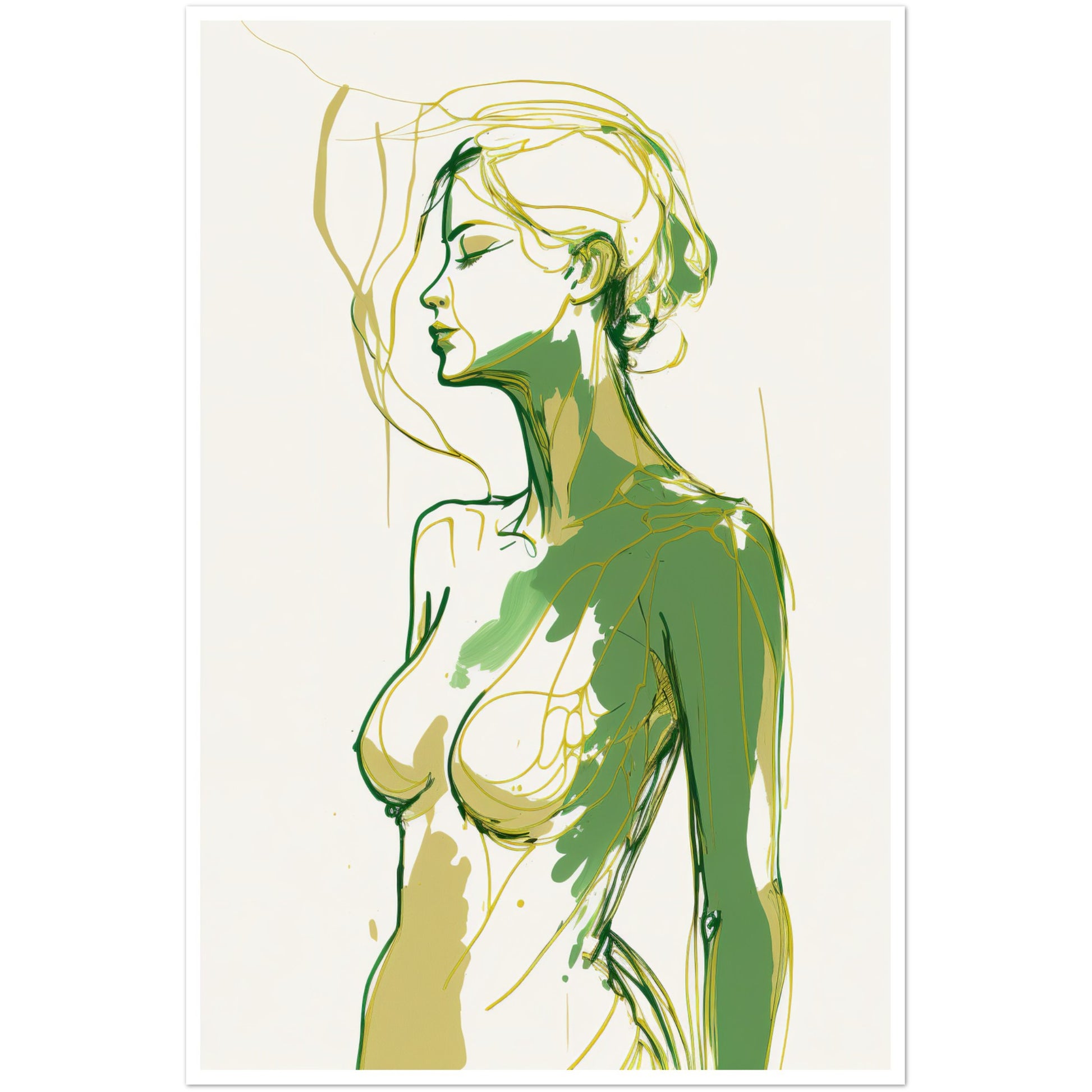 The simplicity of the artwork allows the viewer to focus on the form and the interplay of green and gold tones. Against a plain background, the woman's presence becomes even more pronounced, inviting contemplation and fascination.