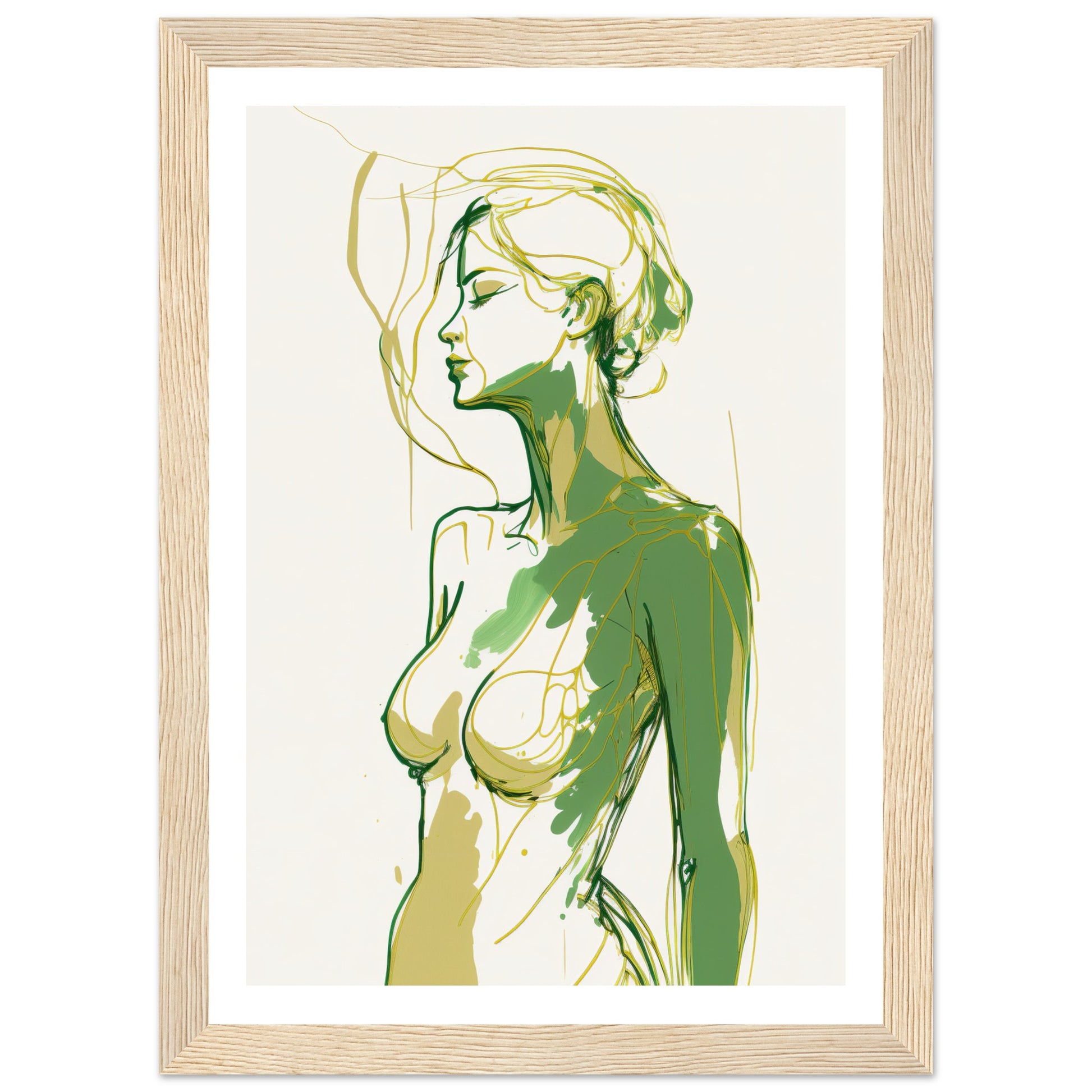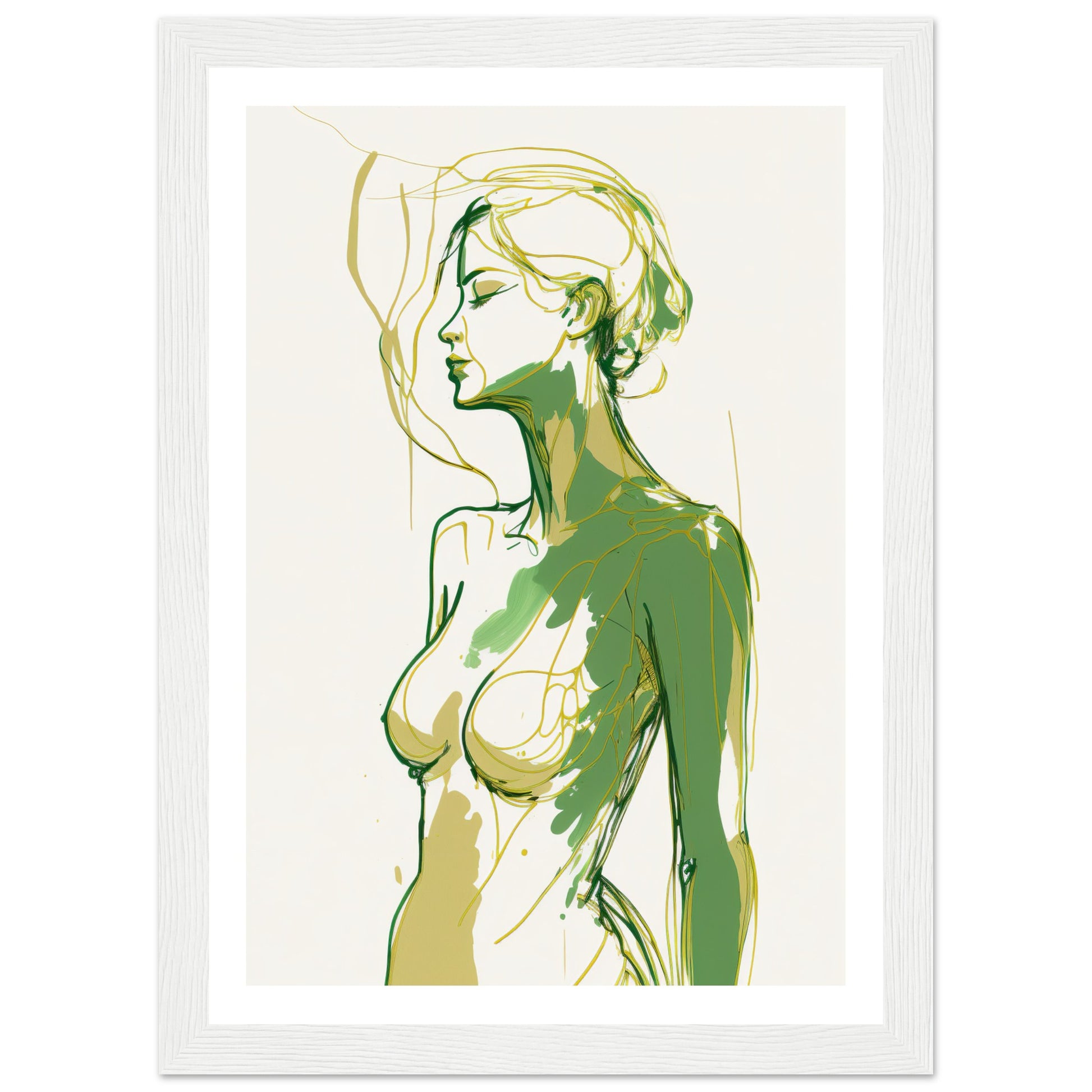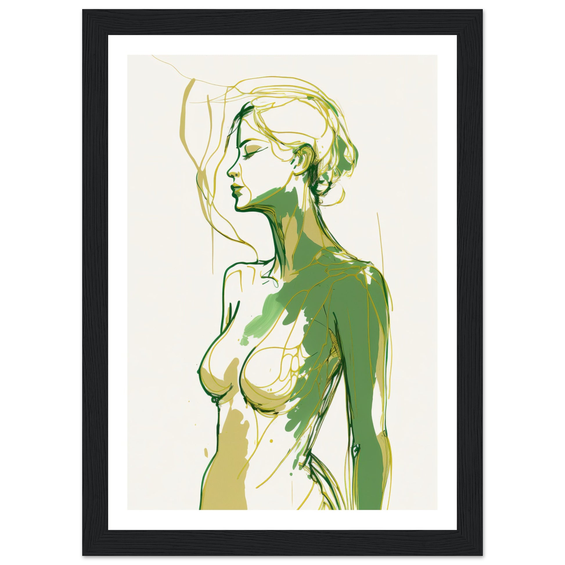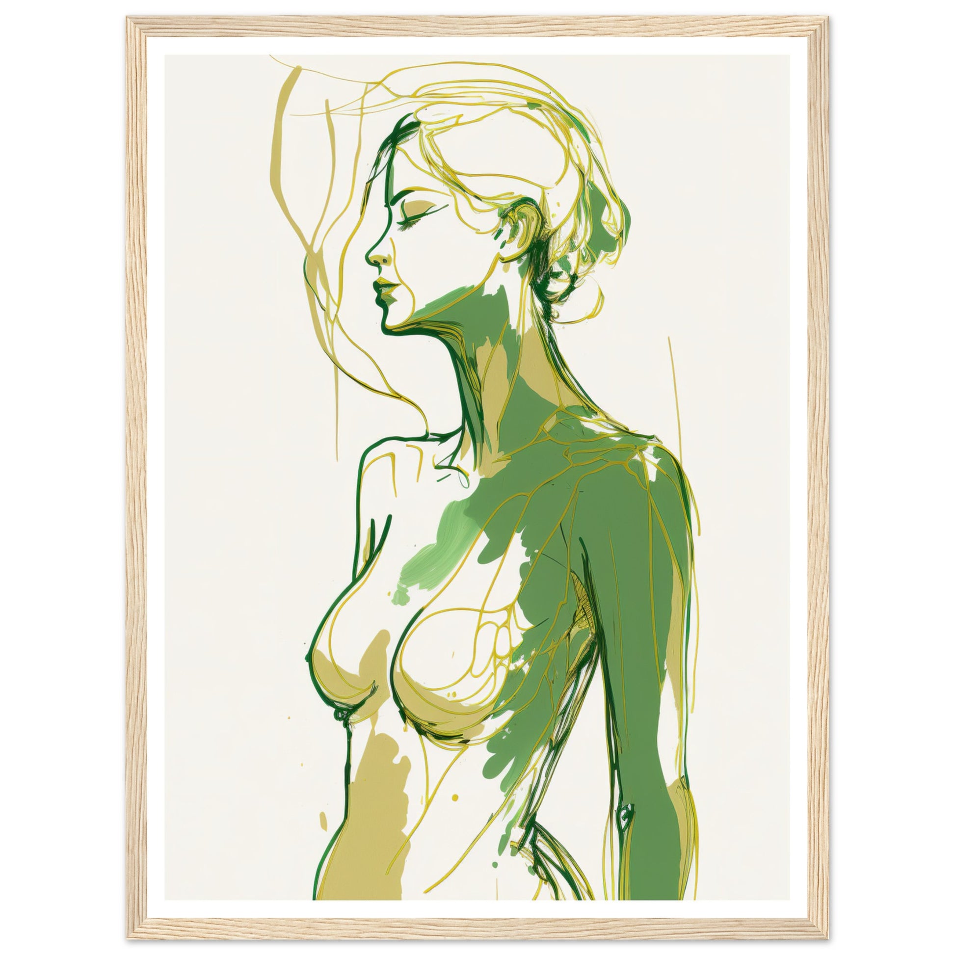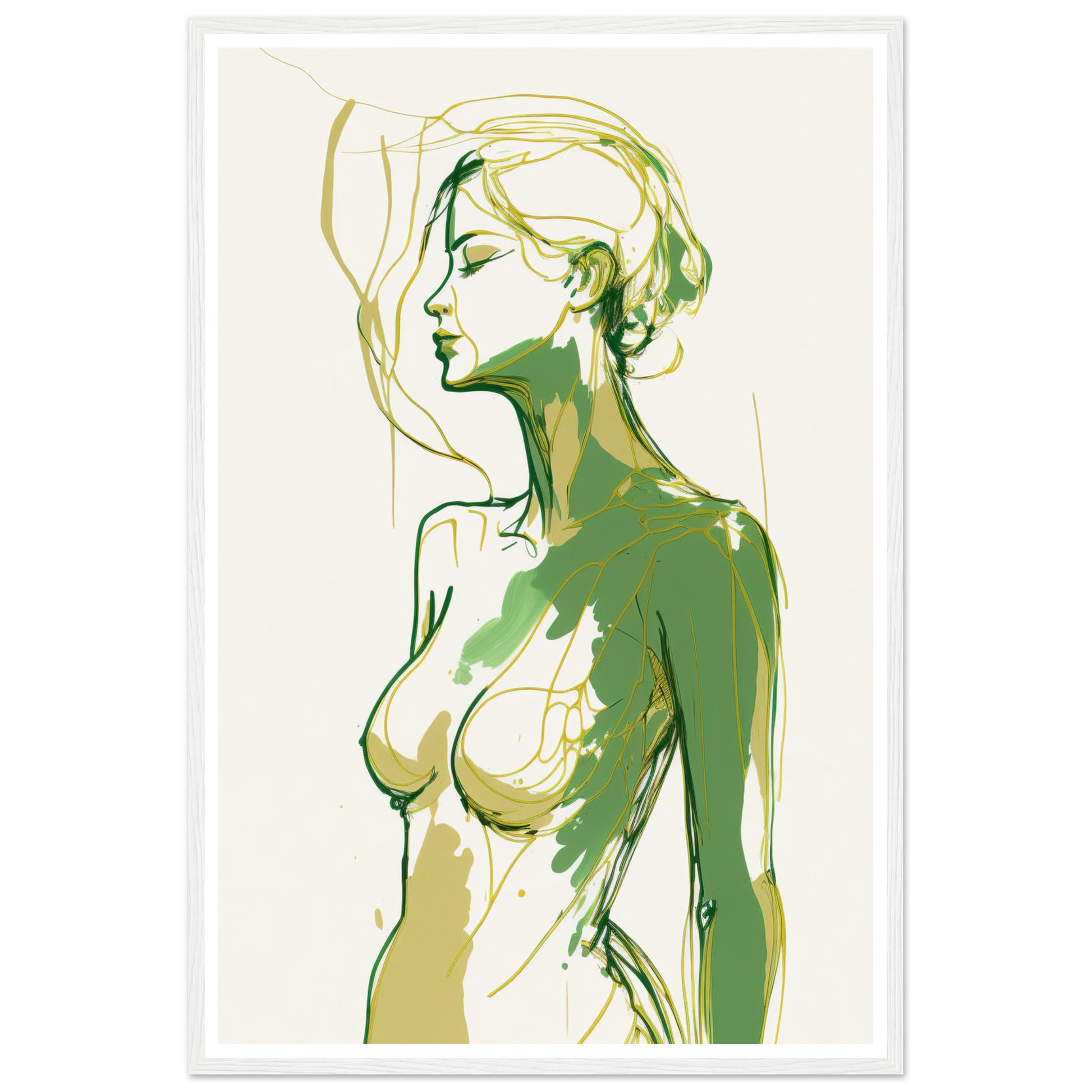 The simplicity of the artwork allows the viewer to focus on the form and the interplay of green and gold tones. Against a plain background, the woman's presence becomes even more pronounced, inviting contemplation and fascination.