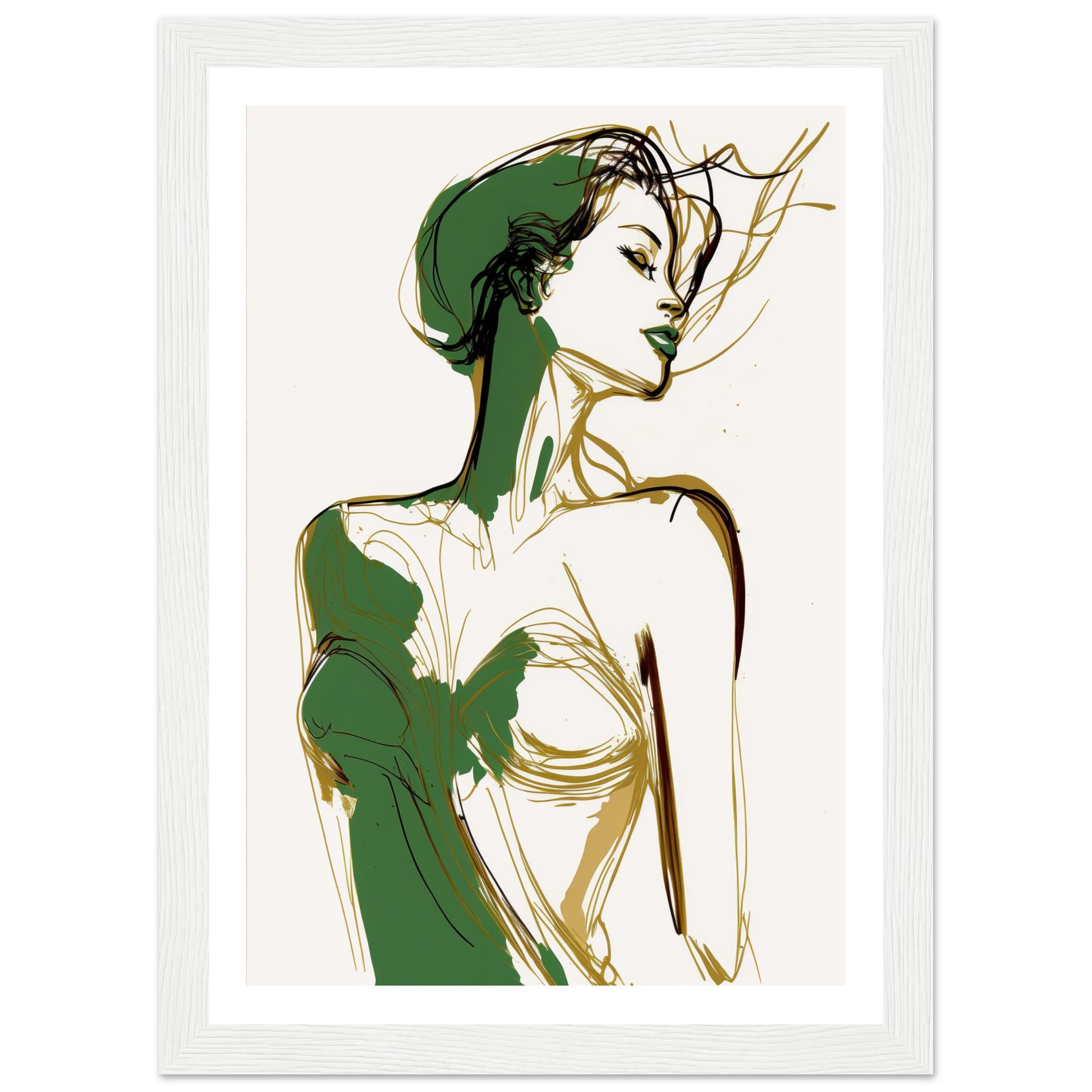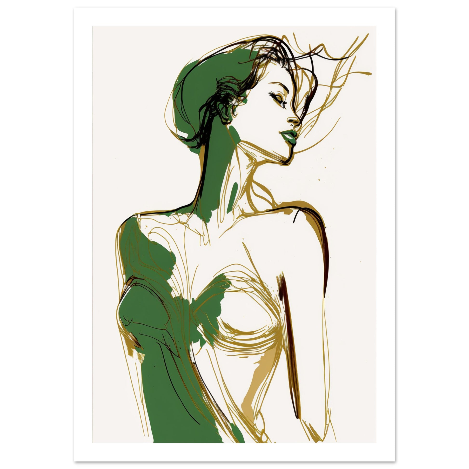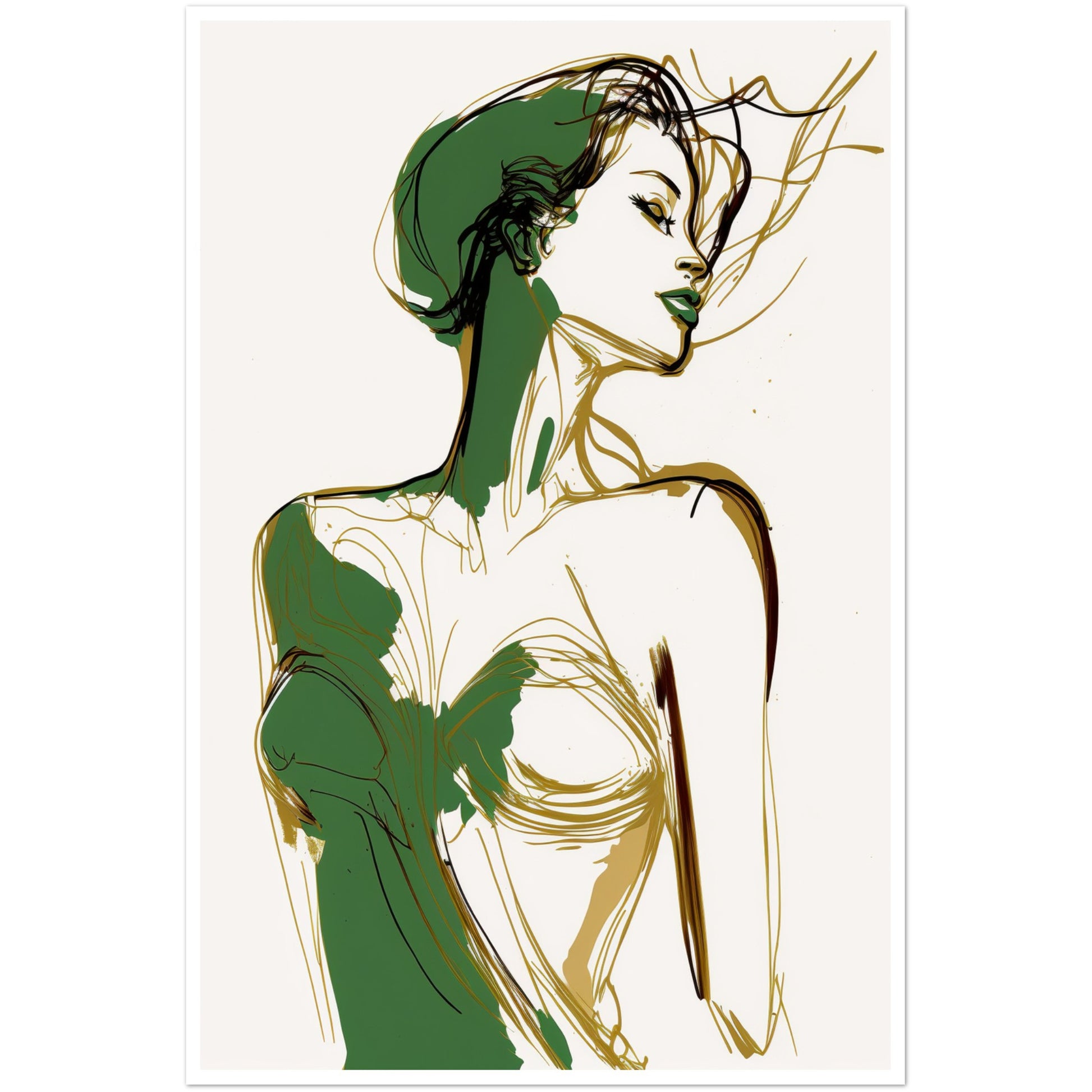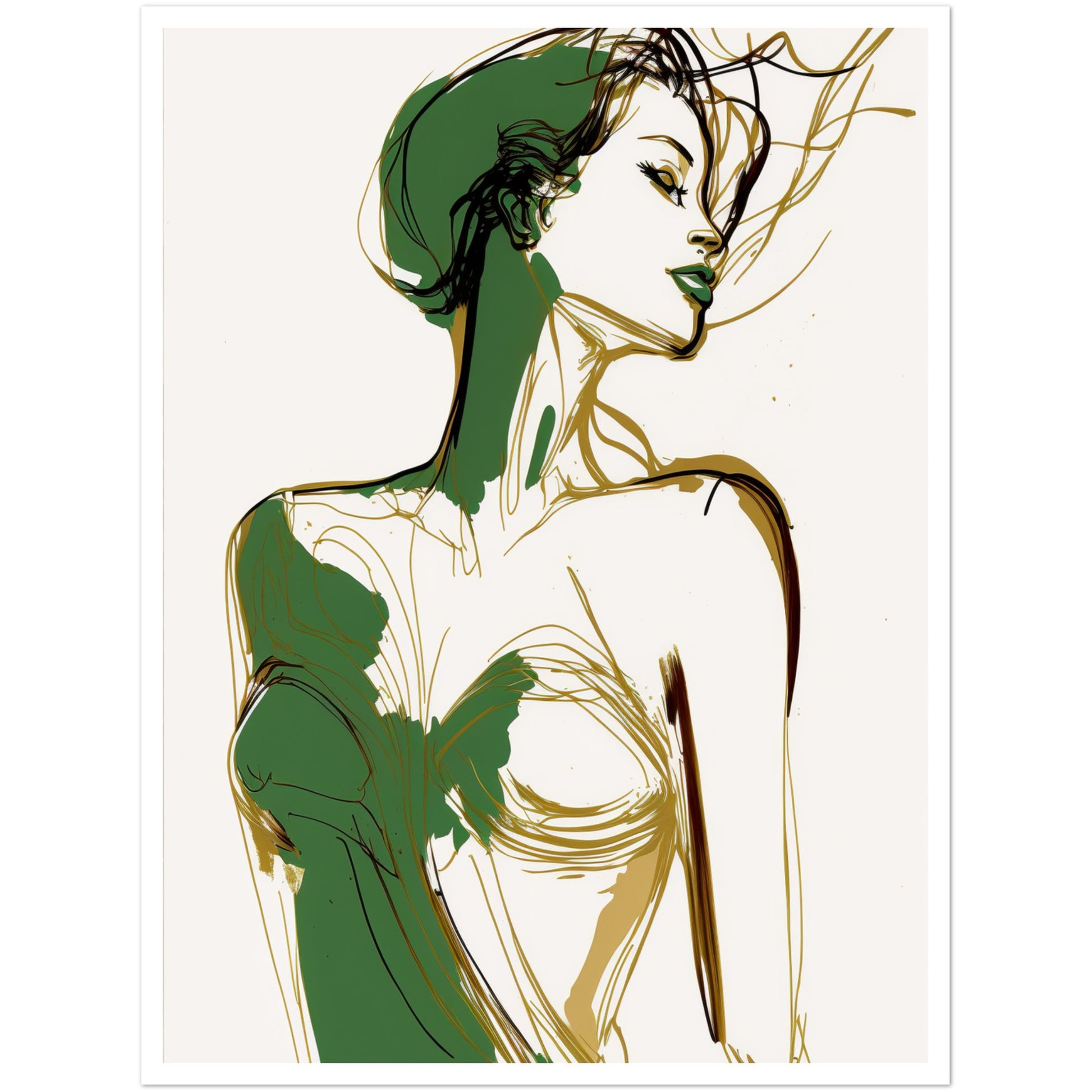 A striking illustration that exudes elegance and sensuality. This simple yet impactful artwork features a woman in an elegant body pose, showcasing the beauty of her sensuous form. The use of green and gold hues adds a touch of richness and sophistication to the piece, while the plain background keeps the focus on the subject.