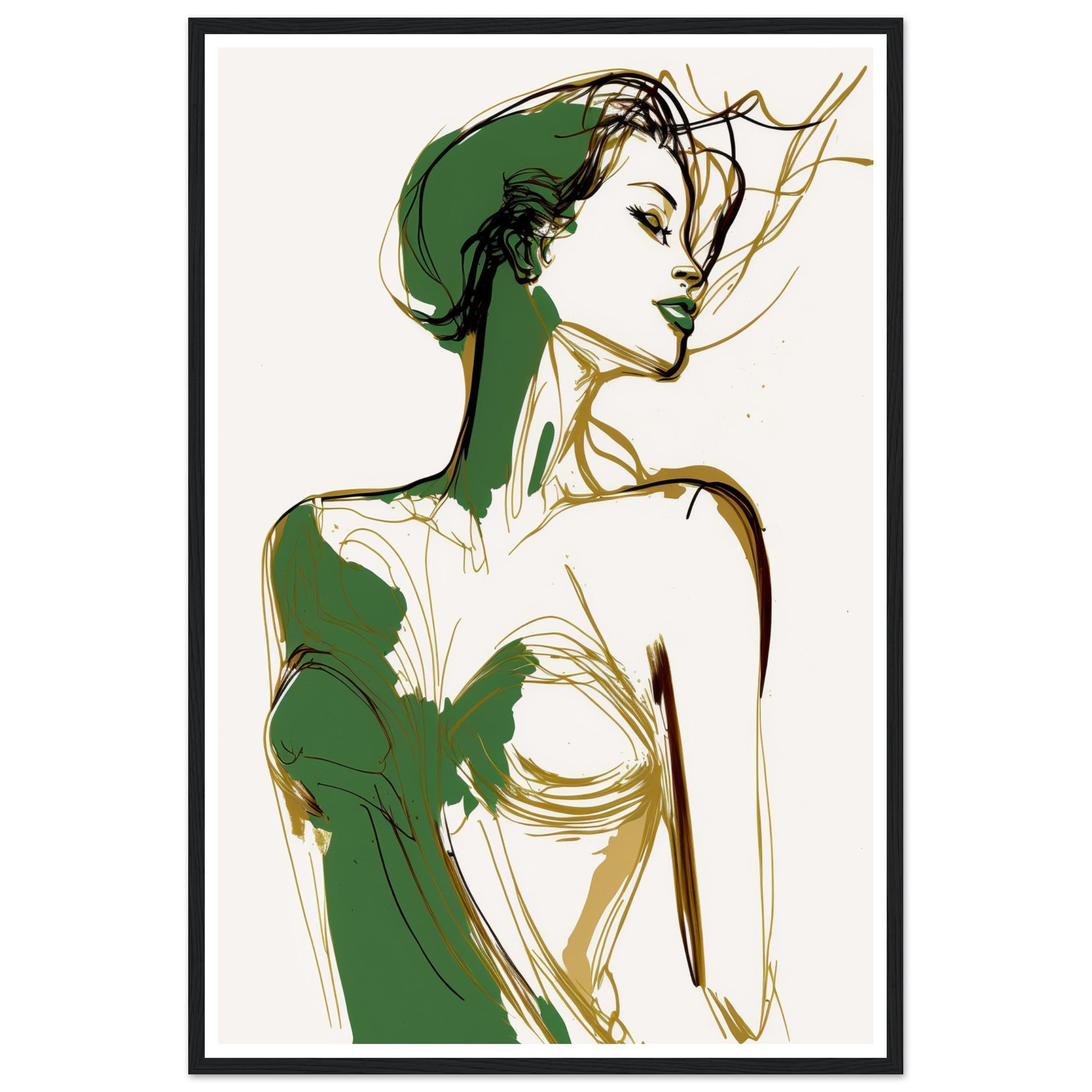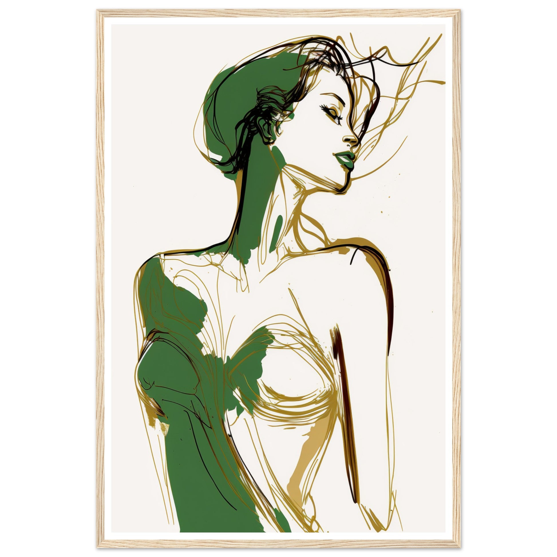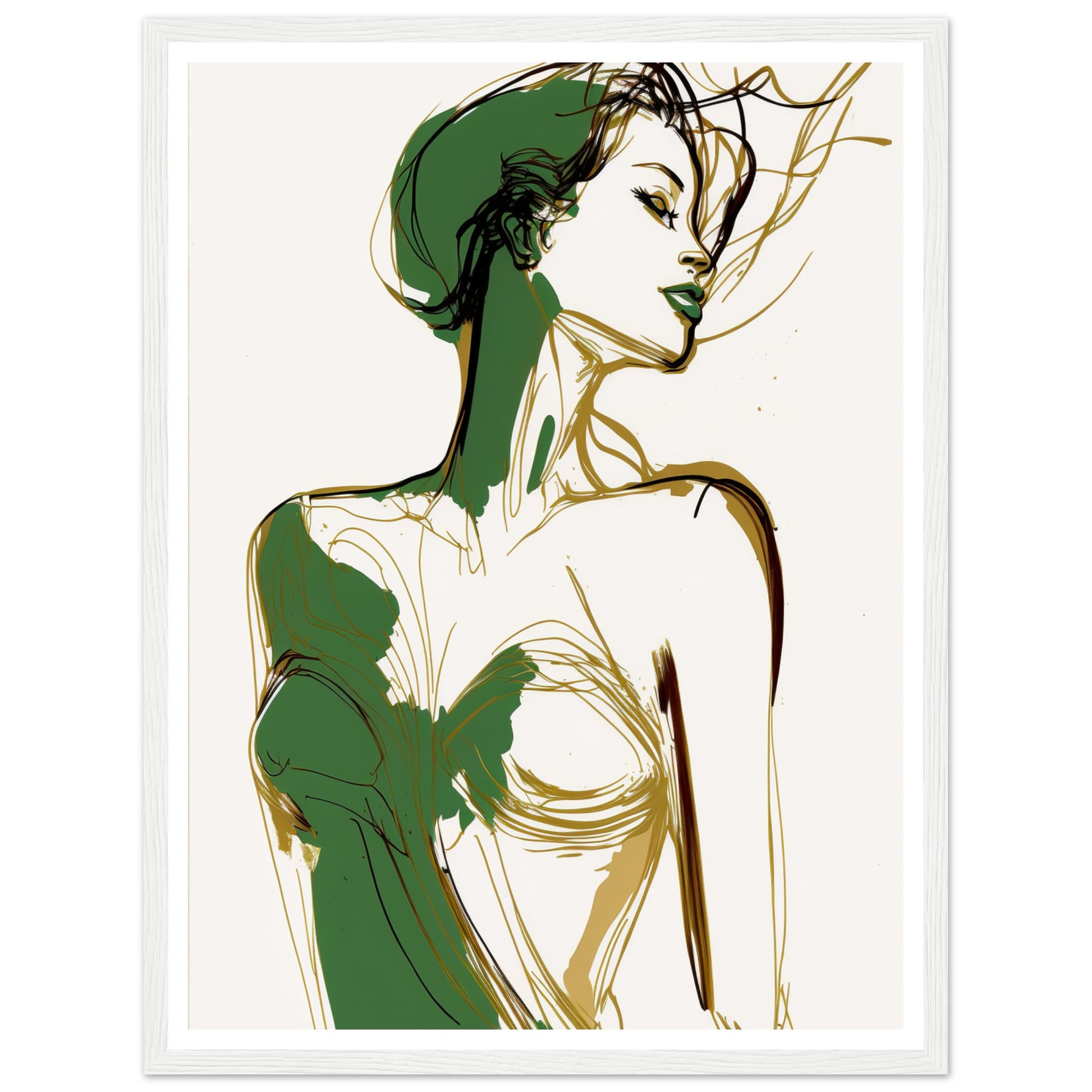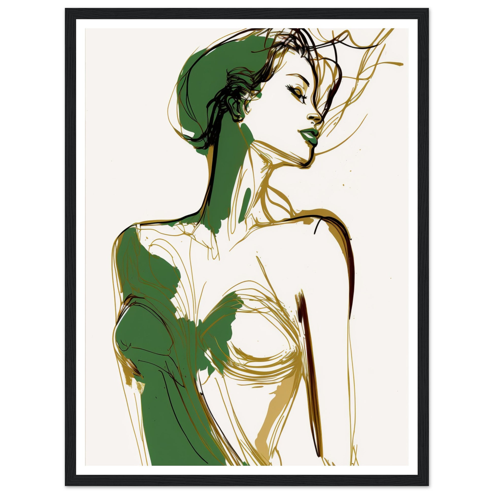 A striking illustration that exudes elegance and sensuality. This simple yet impactful artwork features a woman in an elegant body pose, showcasing the beauty of her sensuous form. The use of green and gold hues adds a touch of richness and sophistication to the piece, while the plain background keeps the focus on the subject.