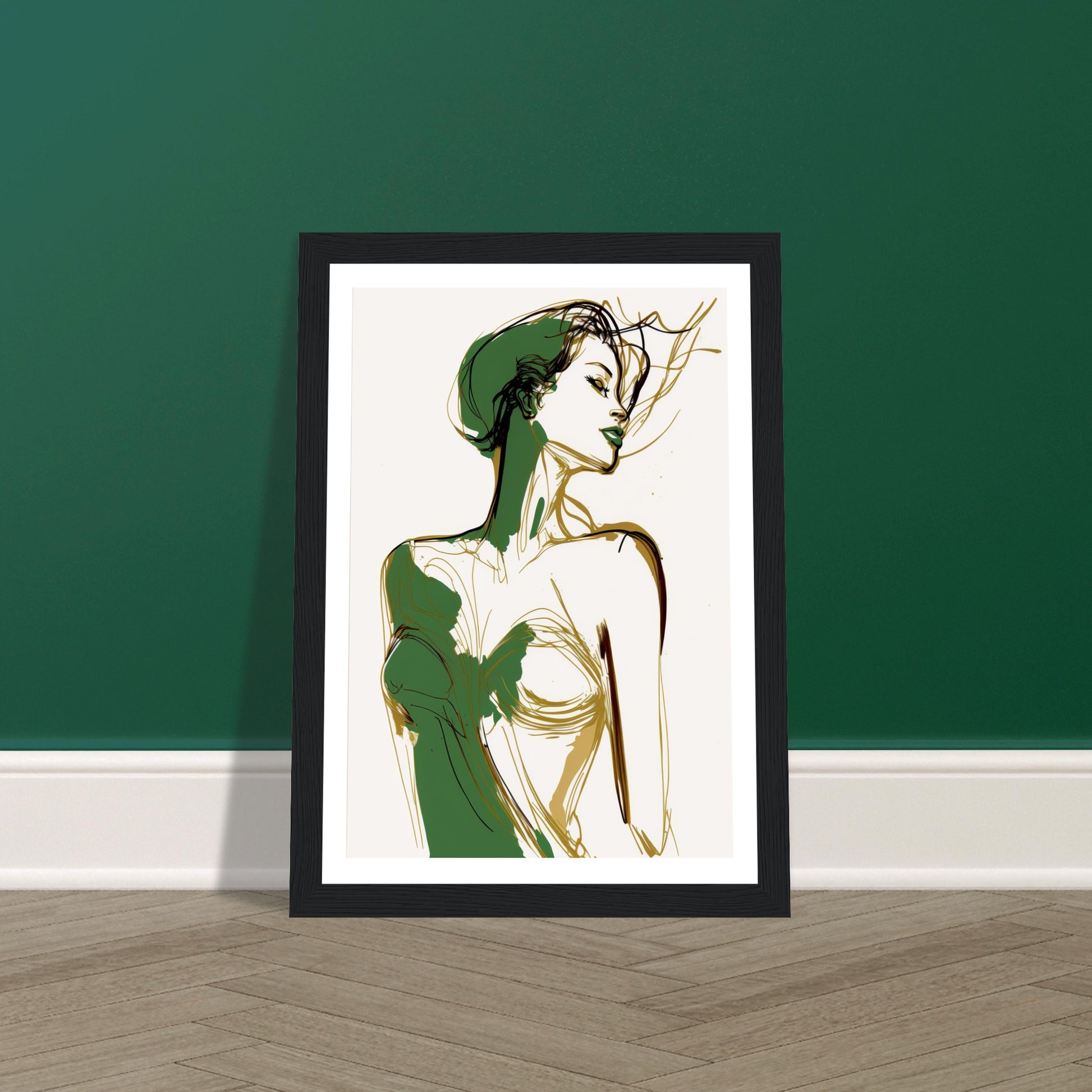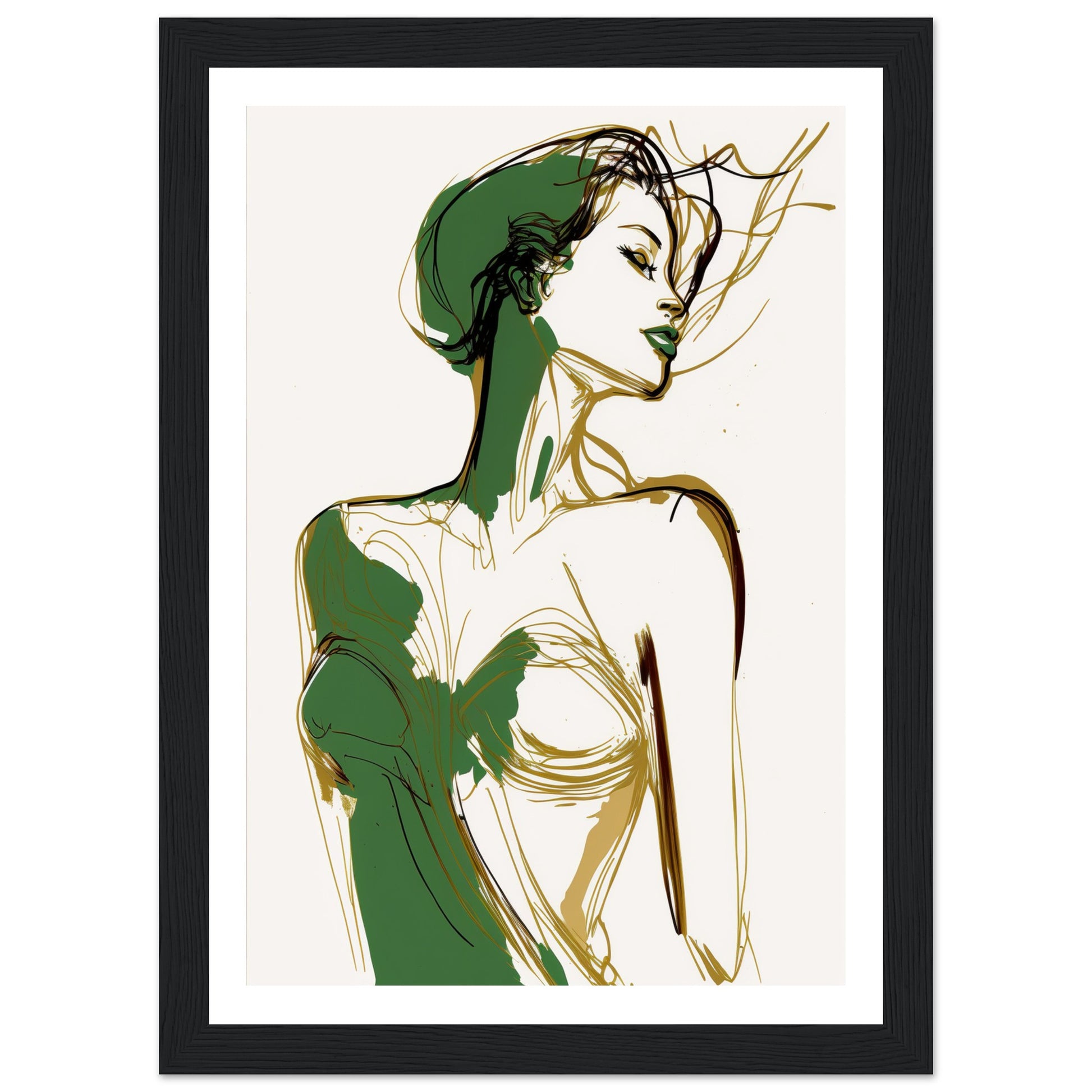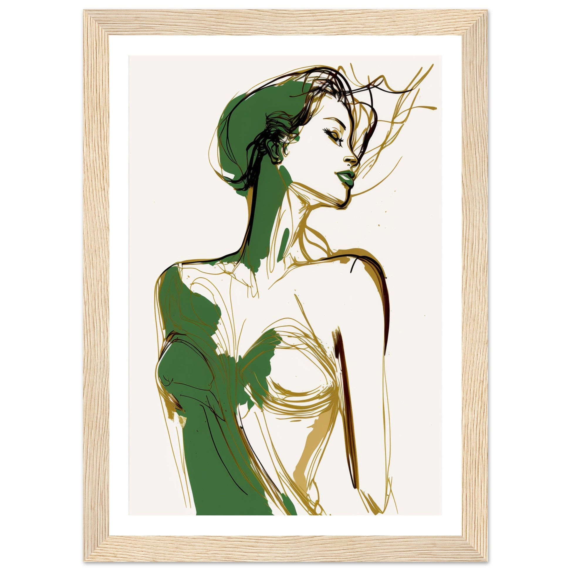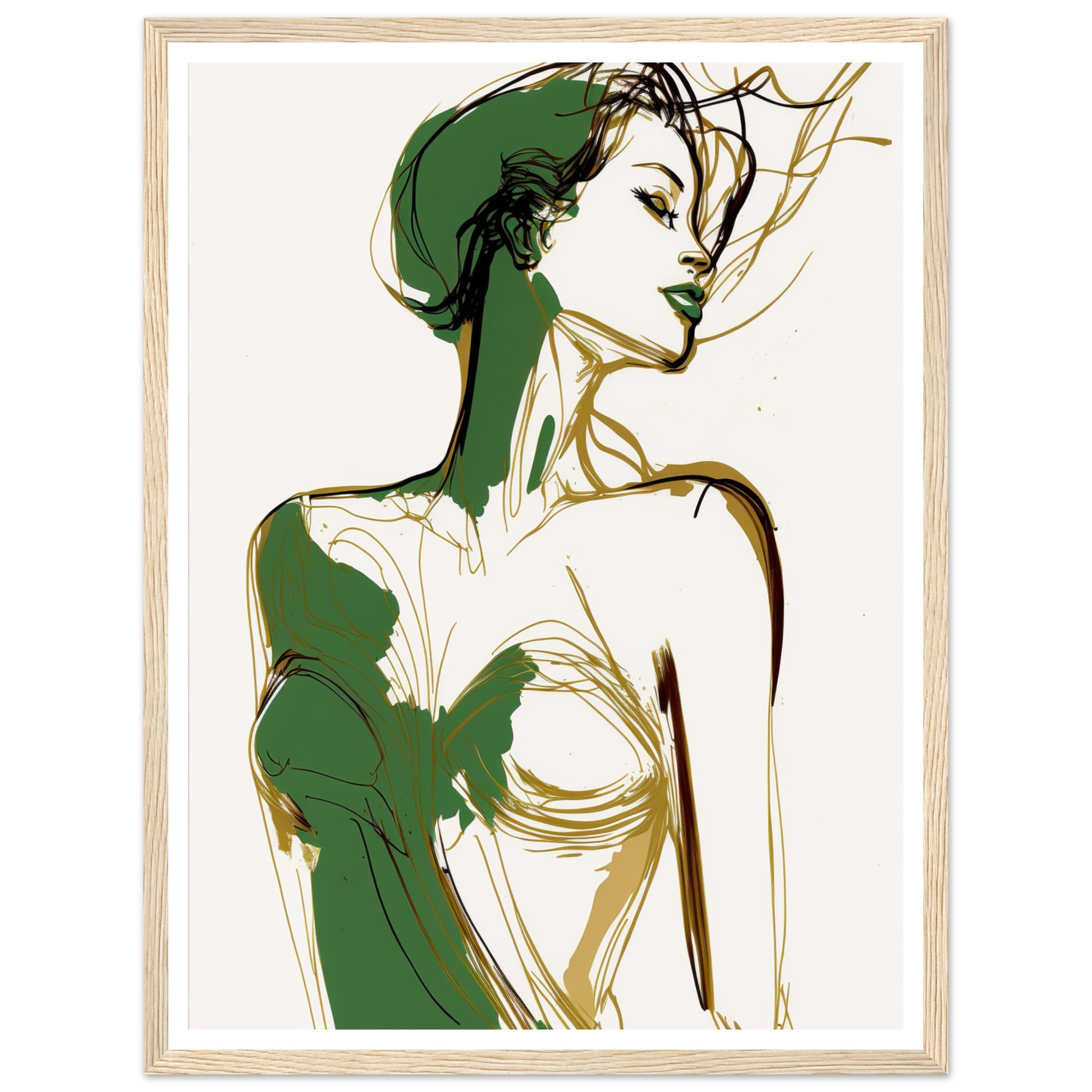 A striking illustration that exudes elegance and sensuality. This simple yet impactful artwork features a woman in an elegant body pose, showcasing the beauty of her sensuous form. The use of green and gold hues adds a touch of richness and sophistication to the piece, while the plain background keeps the focus on the subject.