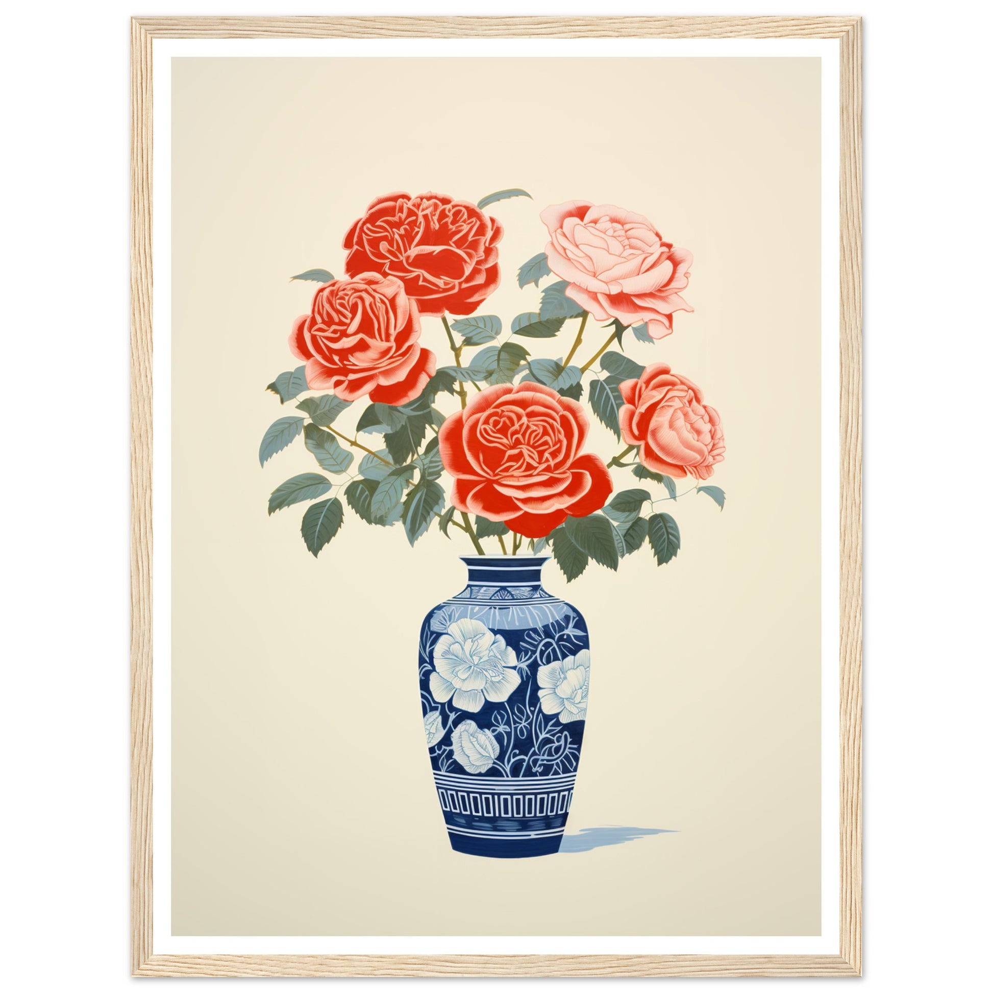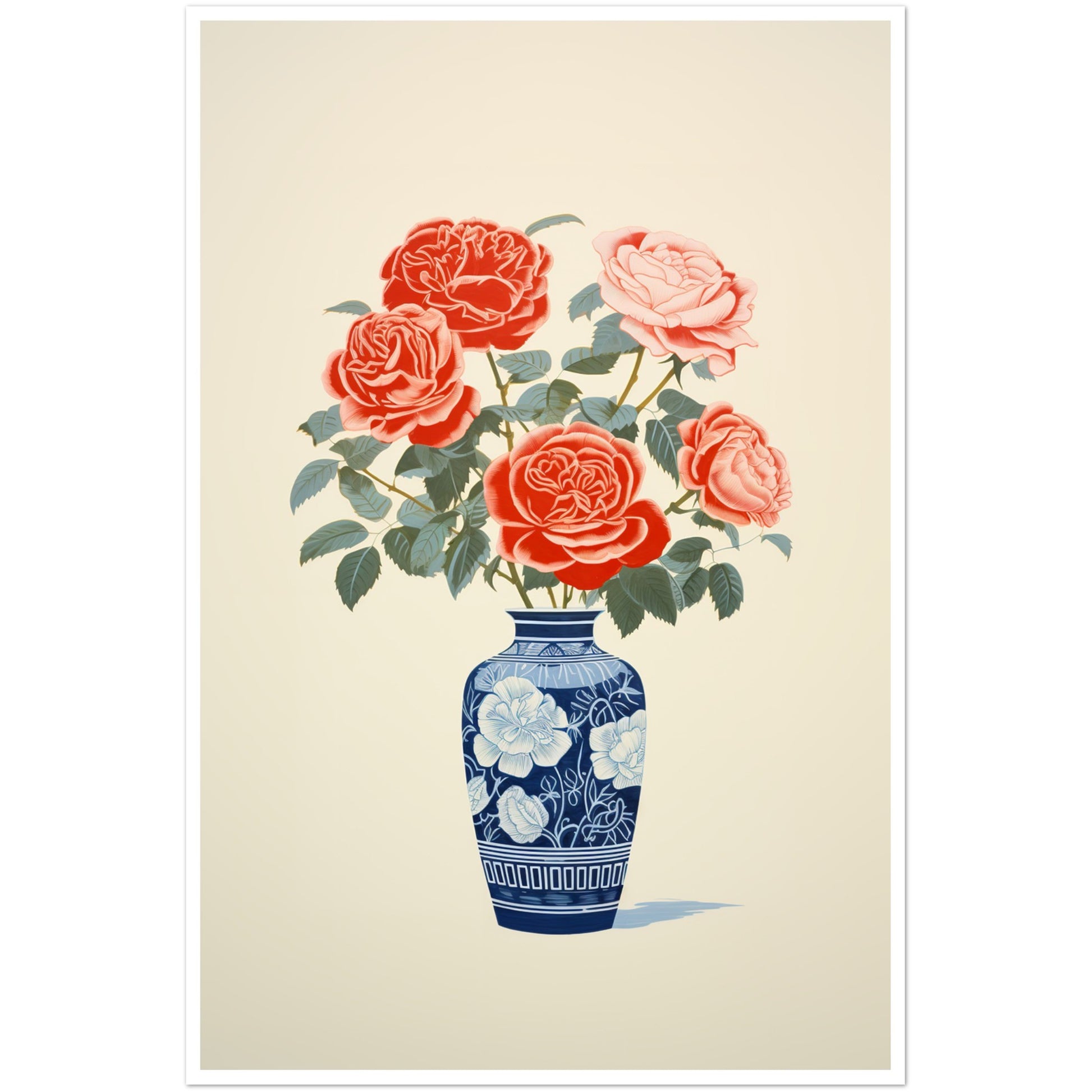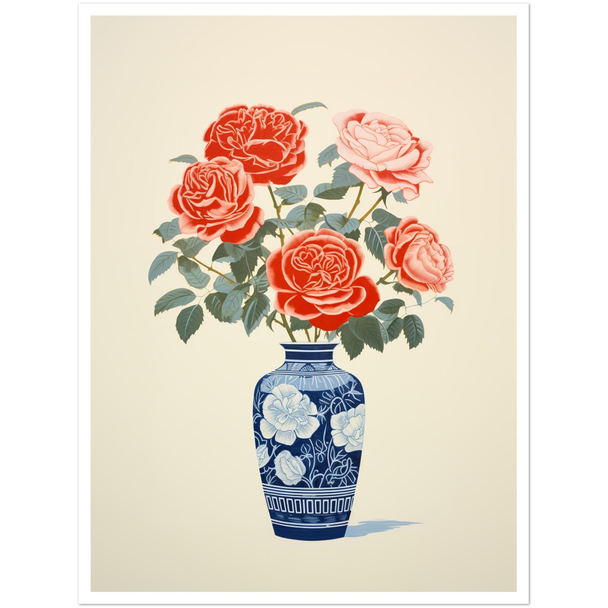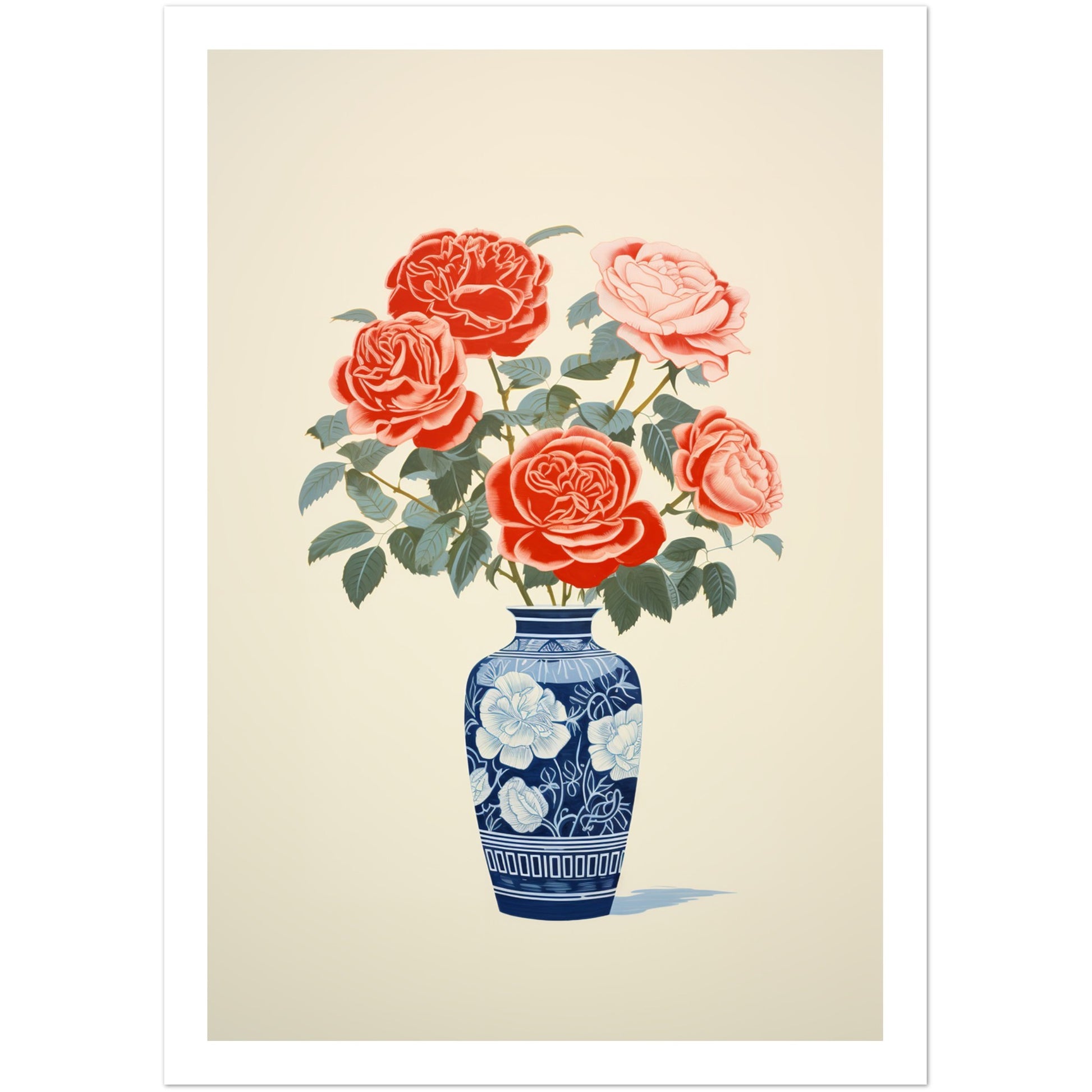 Embrace the elegance of simplicity with our "Woodblock Style Roses in Blue Vase" art print. This exquisite art work captures the beauty of roses arranged in a blue vase, in the style of woodblock printing, using a palette of beige, green, blue and red.