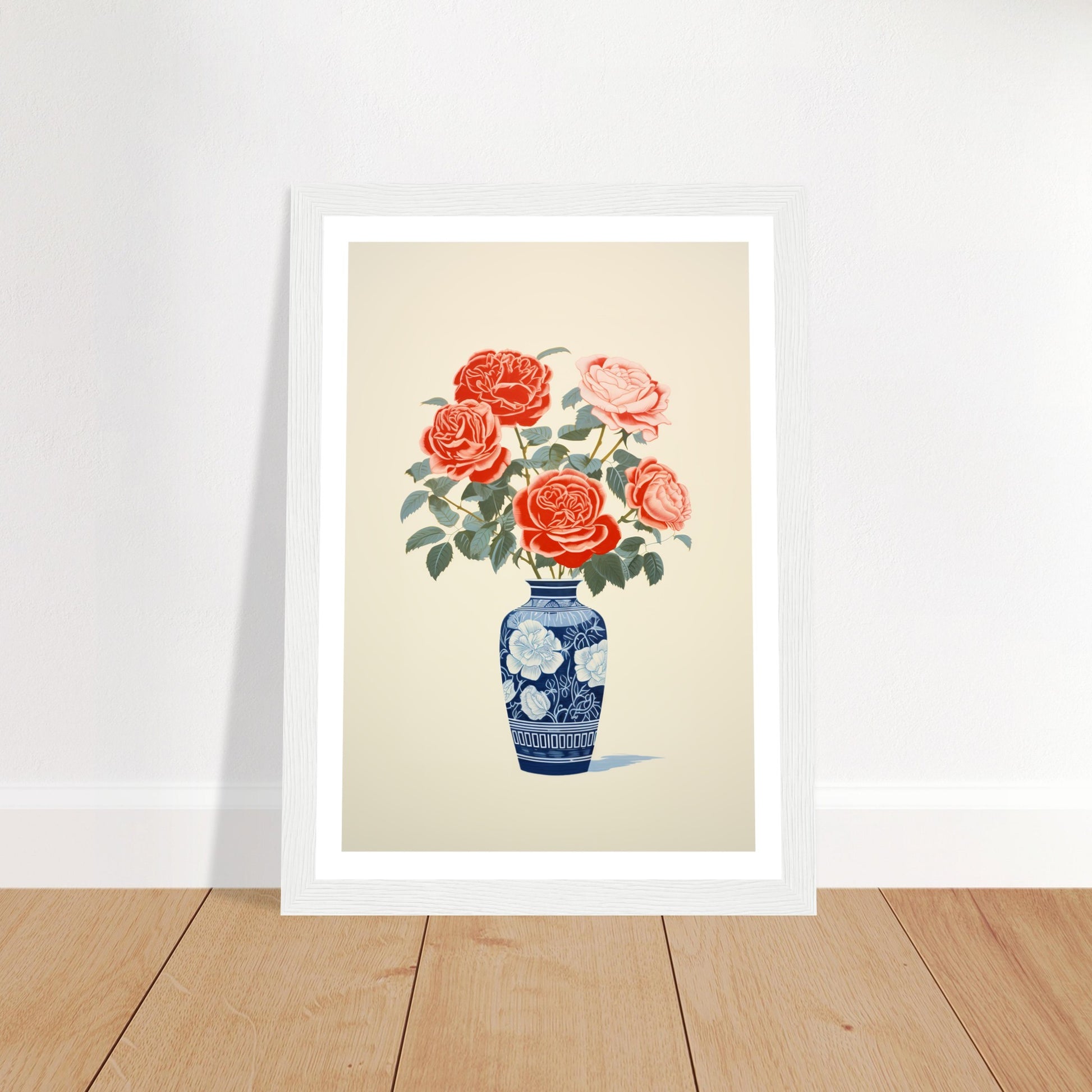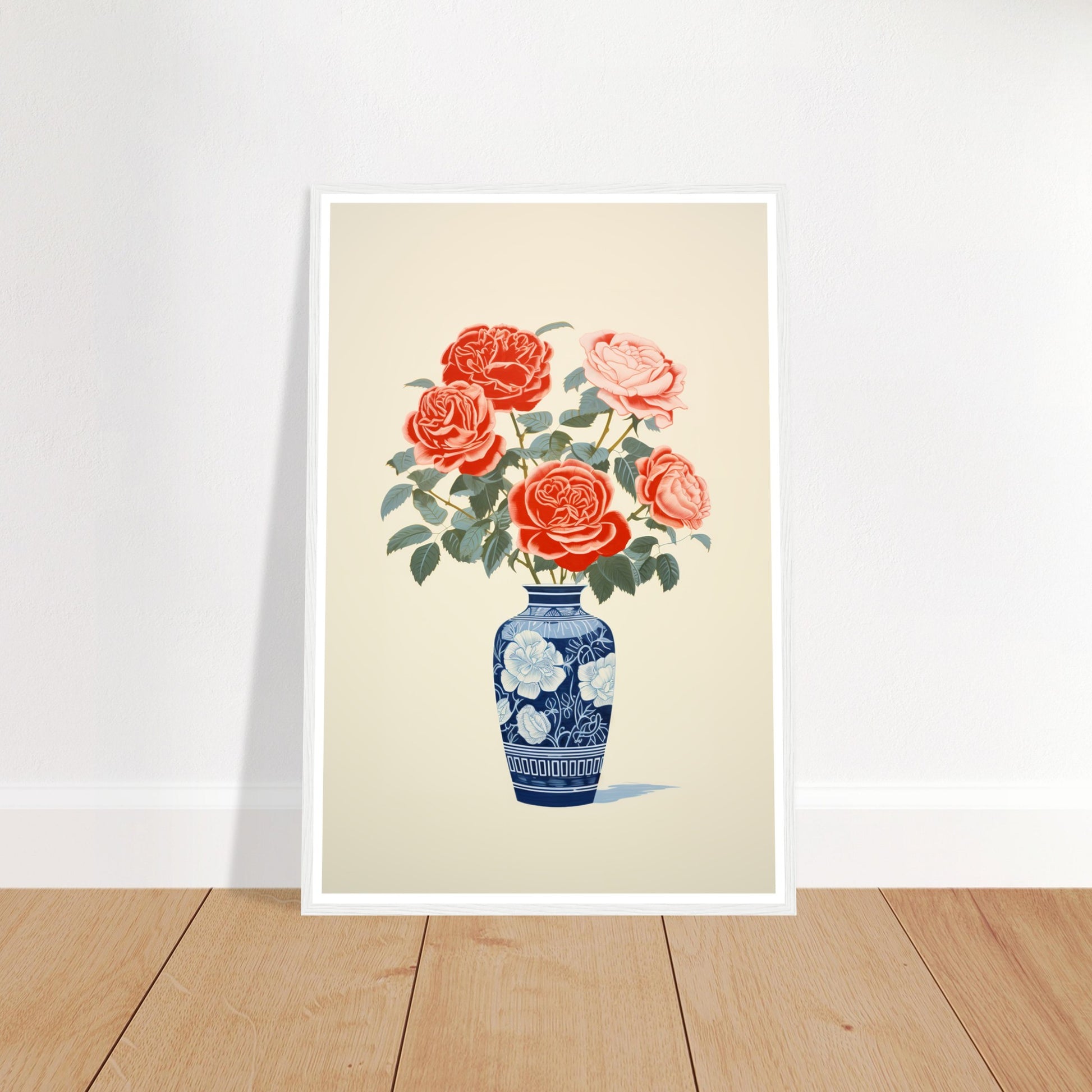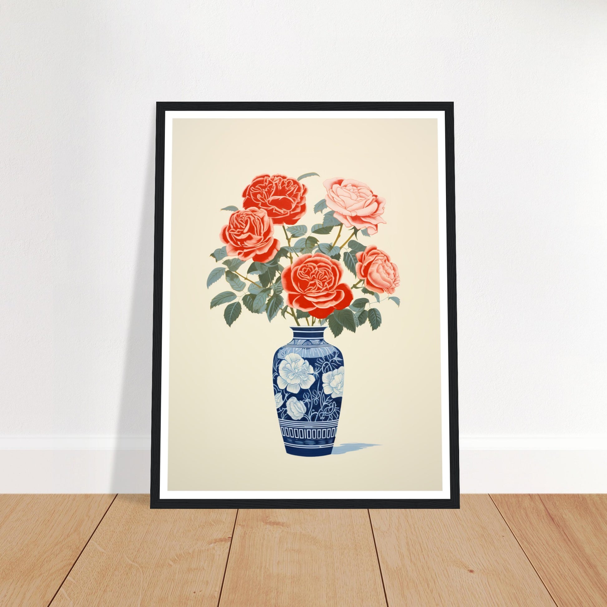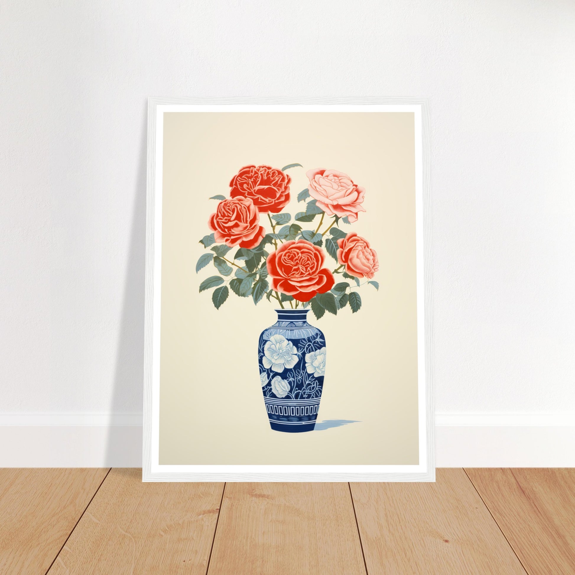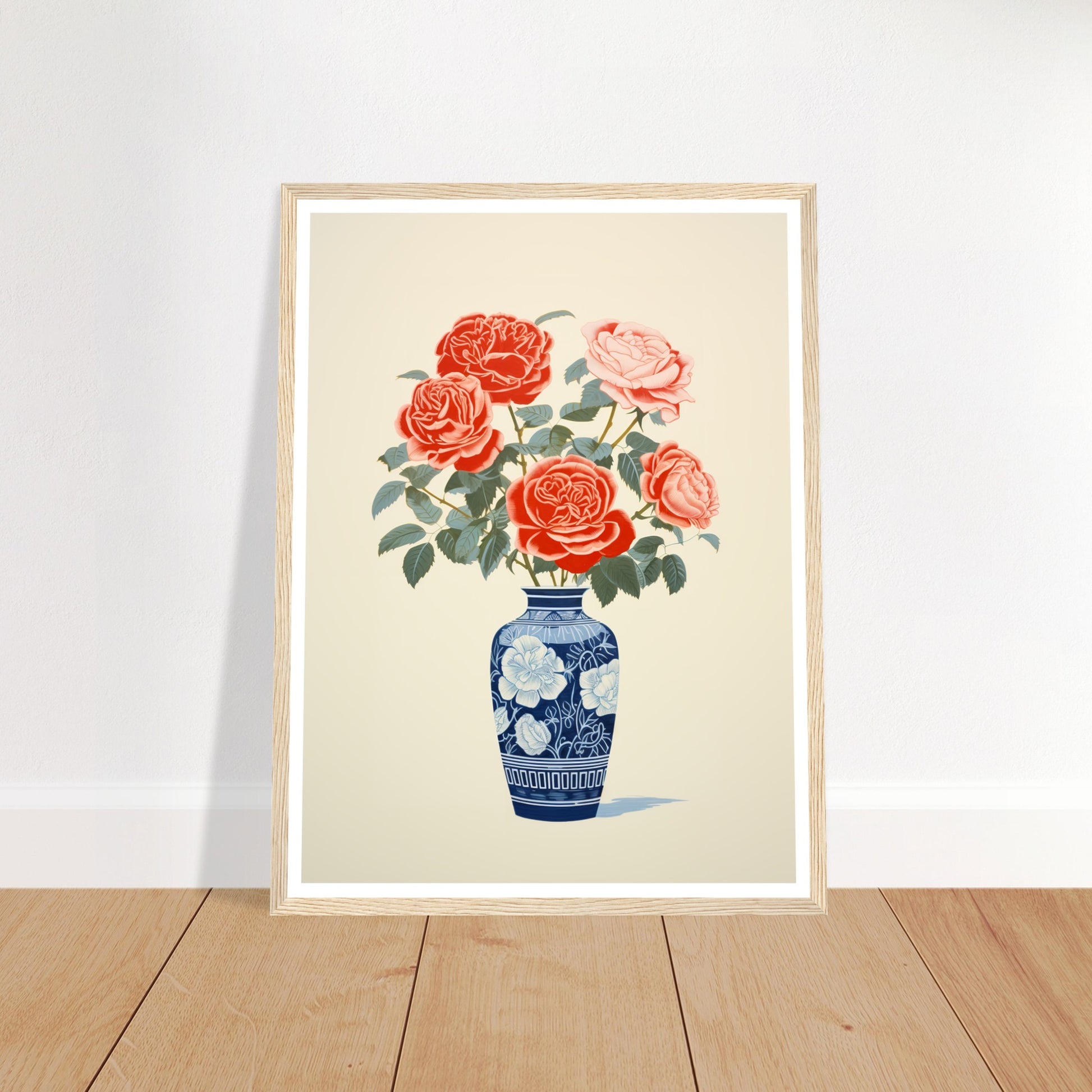 Embrace the elegance of simplicity with our "Woodblock Style Roses in Blue Vase" art print. This exquisite art work captures the beauty of roses arranged in a blue vase, in the style of woodblock printing, using a palette of beige, green, blue and red.