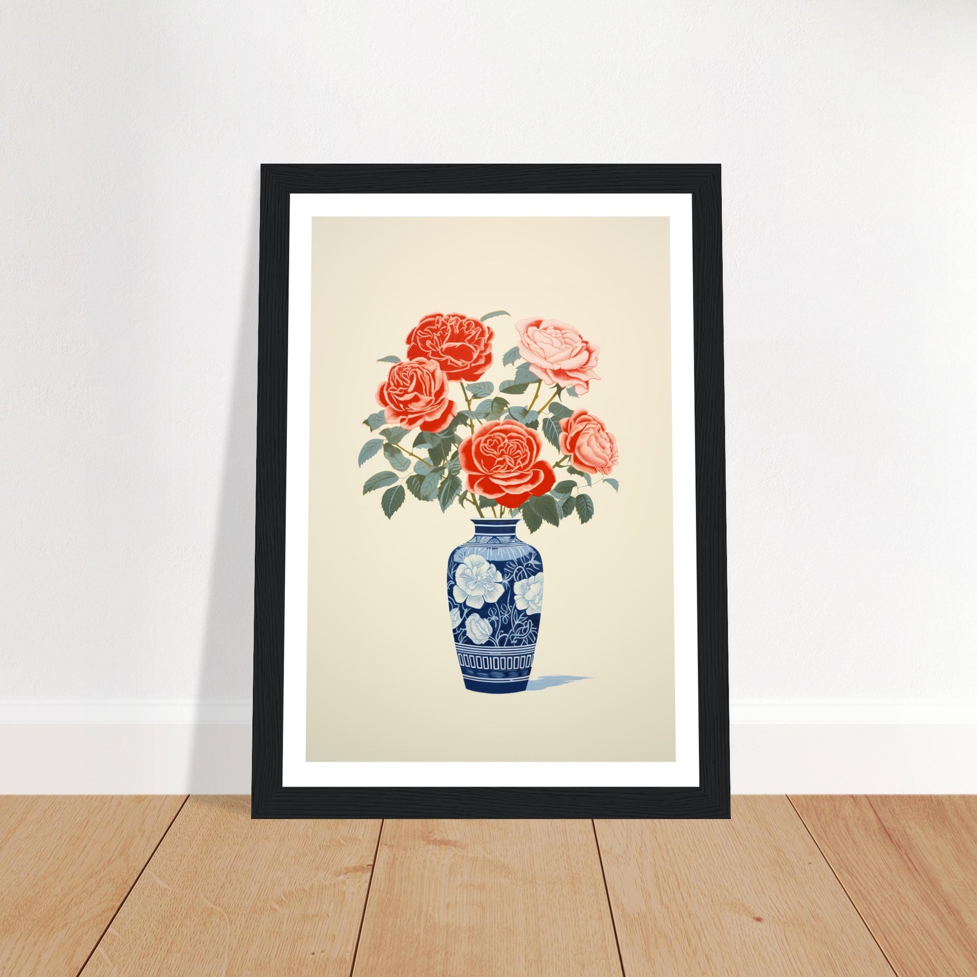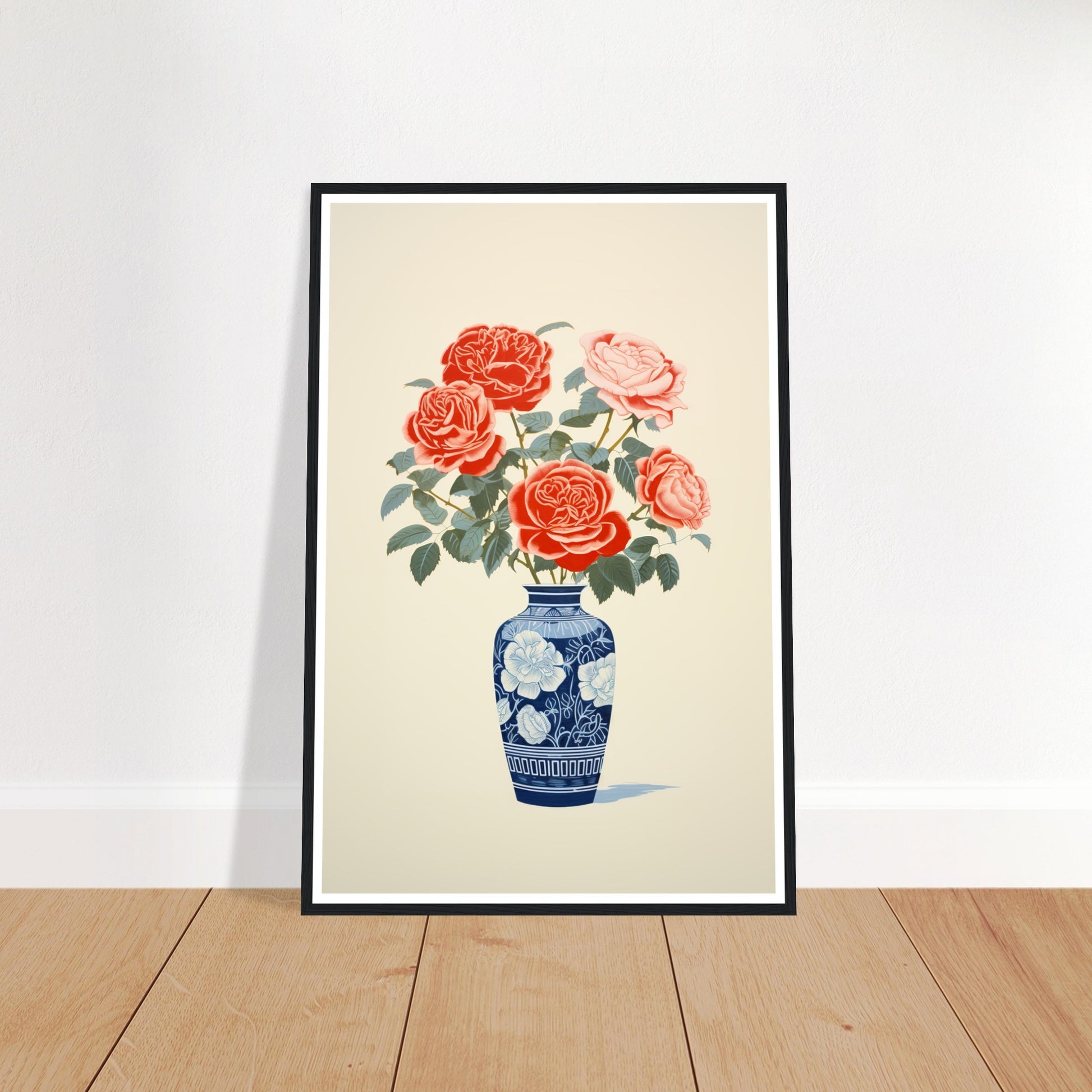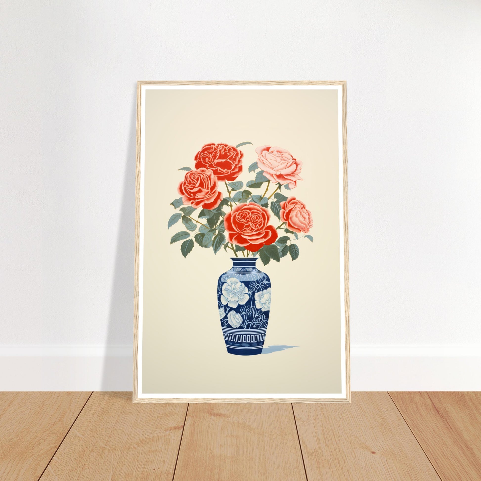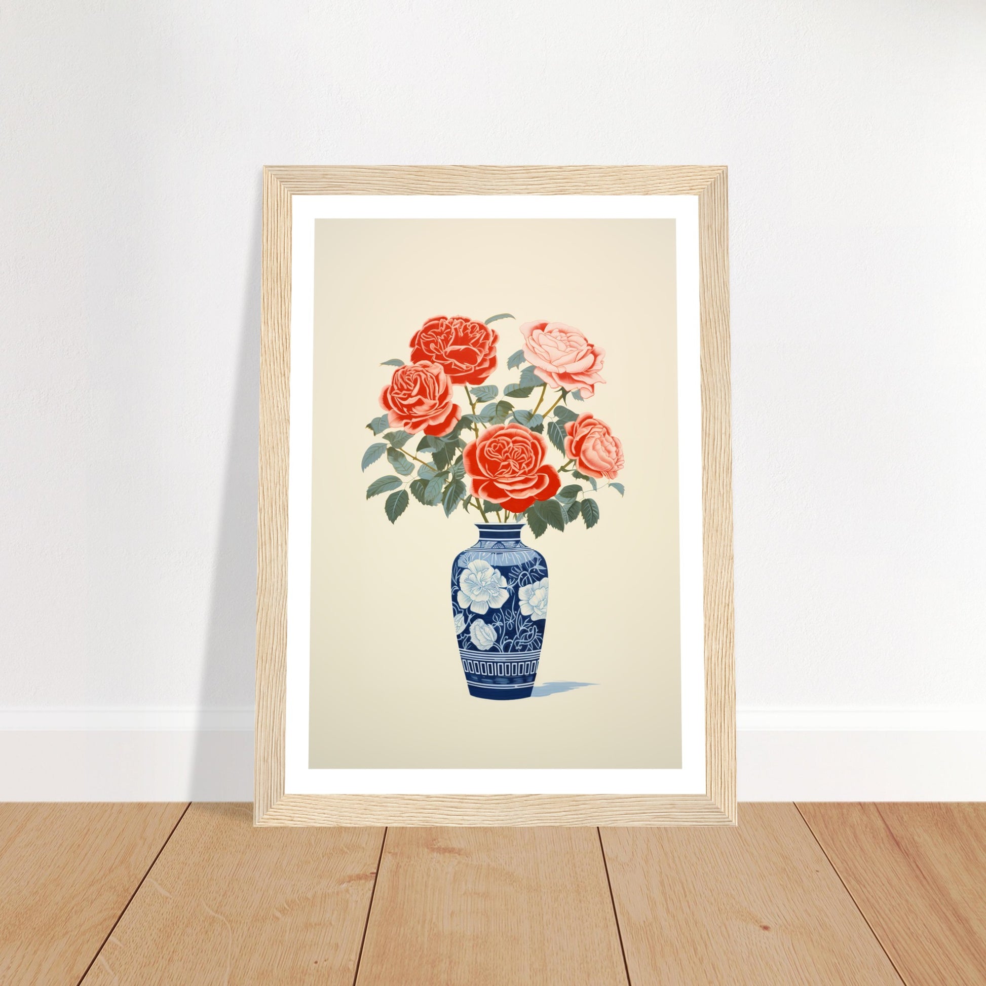 Embrace the elegance of simplicity with our "Woodblock Style Roses in Blue Vase" art print. This exquisite art work captures the beauty of roses arranged in a blue vase, in the style of woodblock printing, using a palette of beige, green, blue and red.