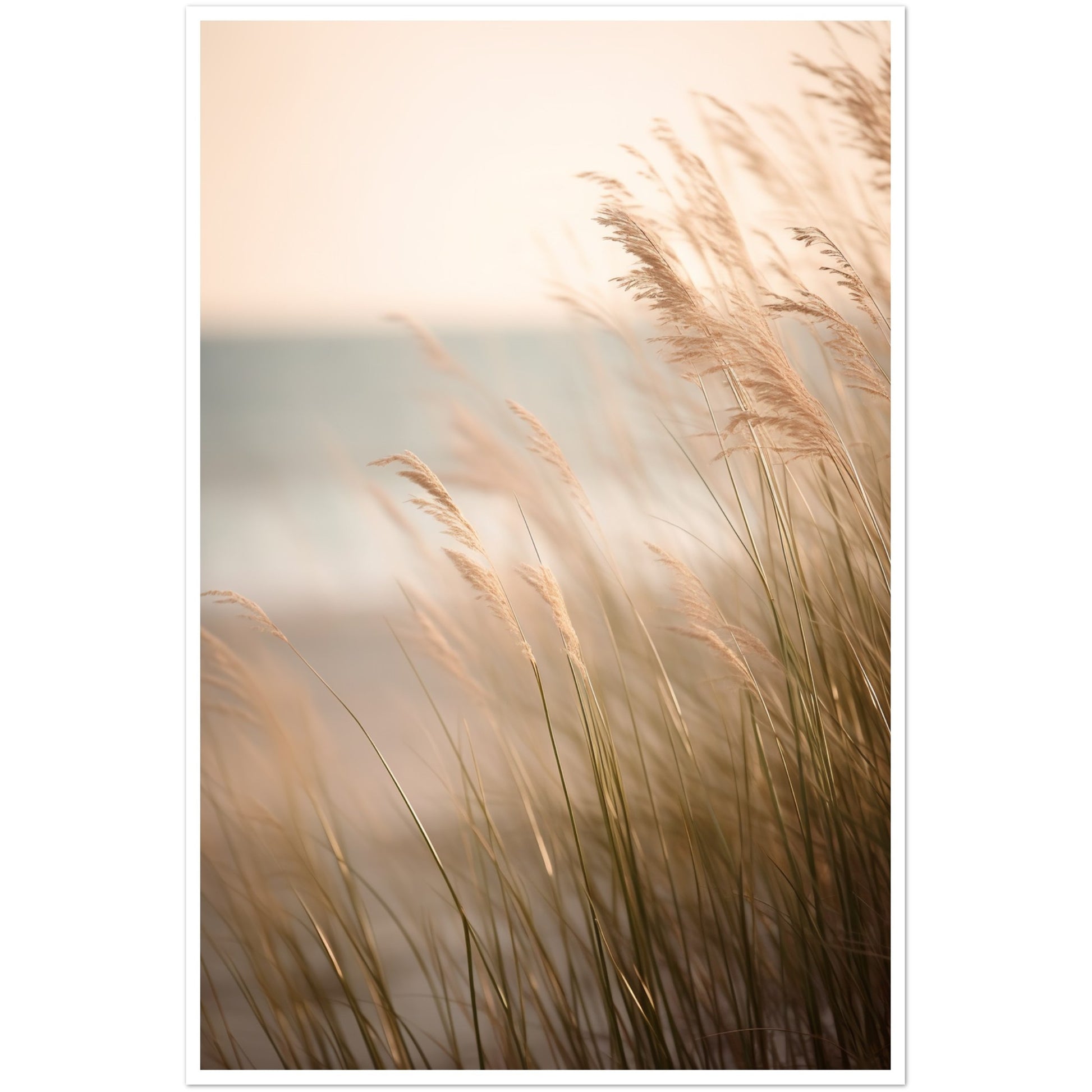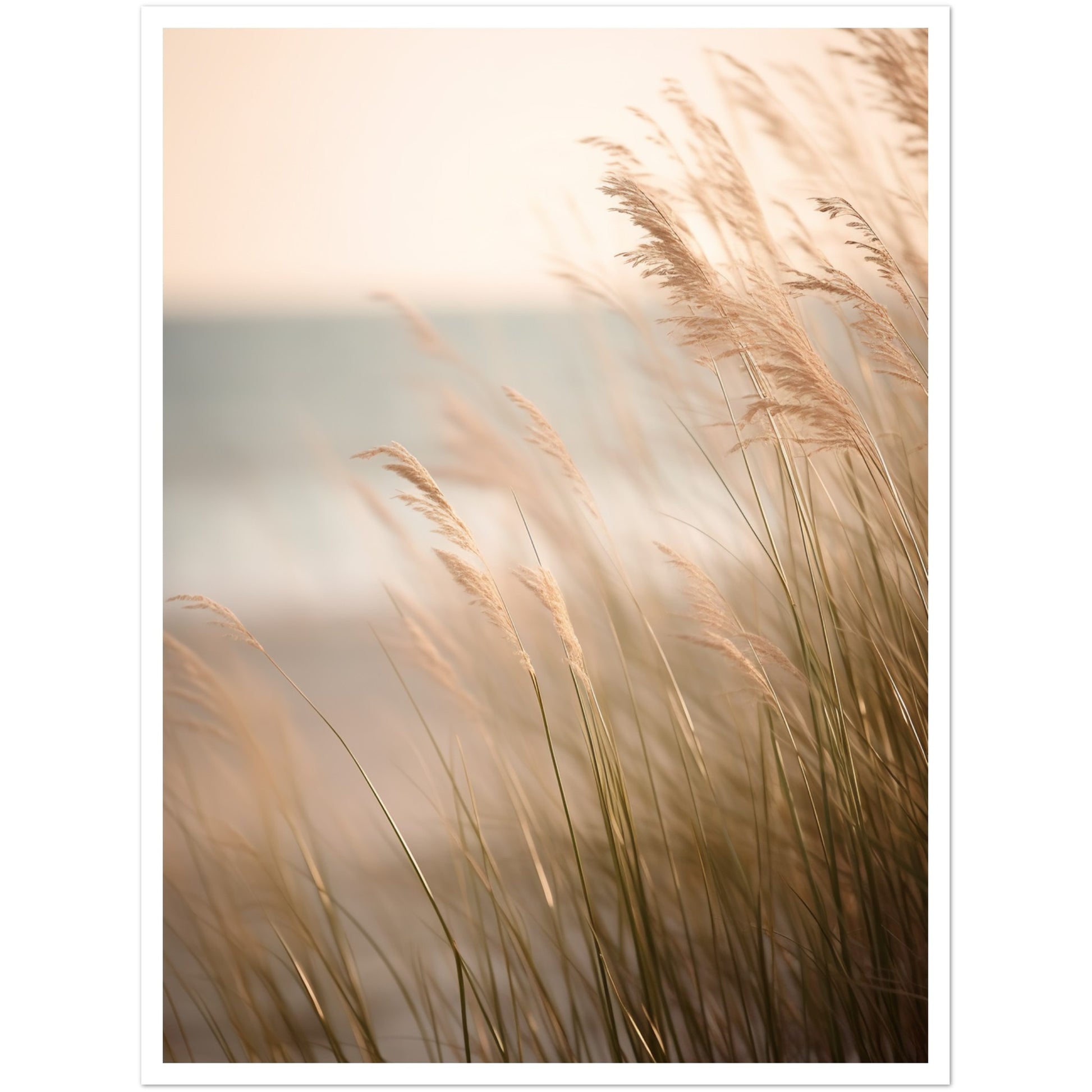The close-up view of natural beach grasses, combined with the hazy feel, creates a serene and ethereal ambiance. The beige color scheme and soft natural colors add a touch of warmth and natural beauty. This artwork invites you to immerse yourself in the peacefulness of coastal landscapes, capturing the whispering essence of misty shores.