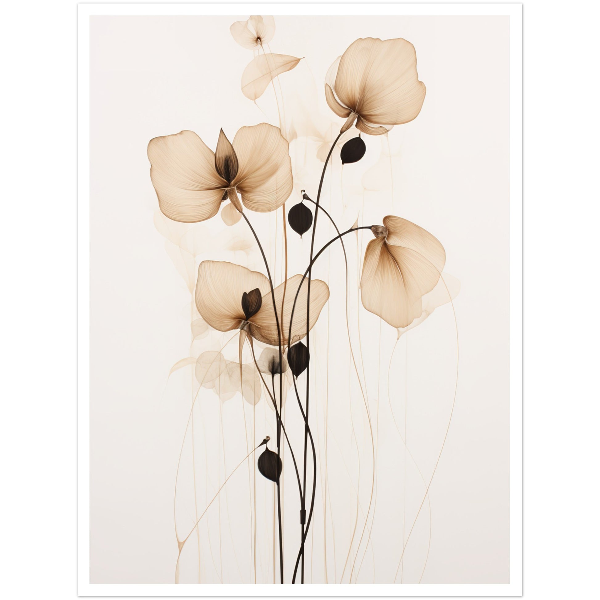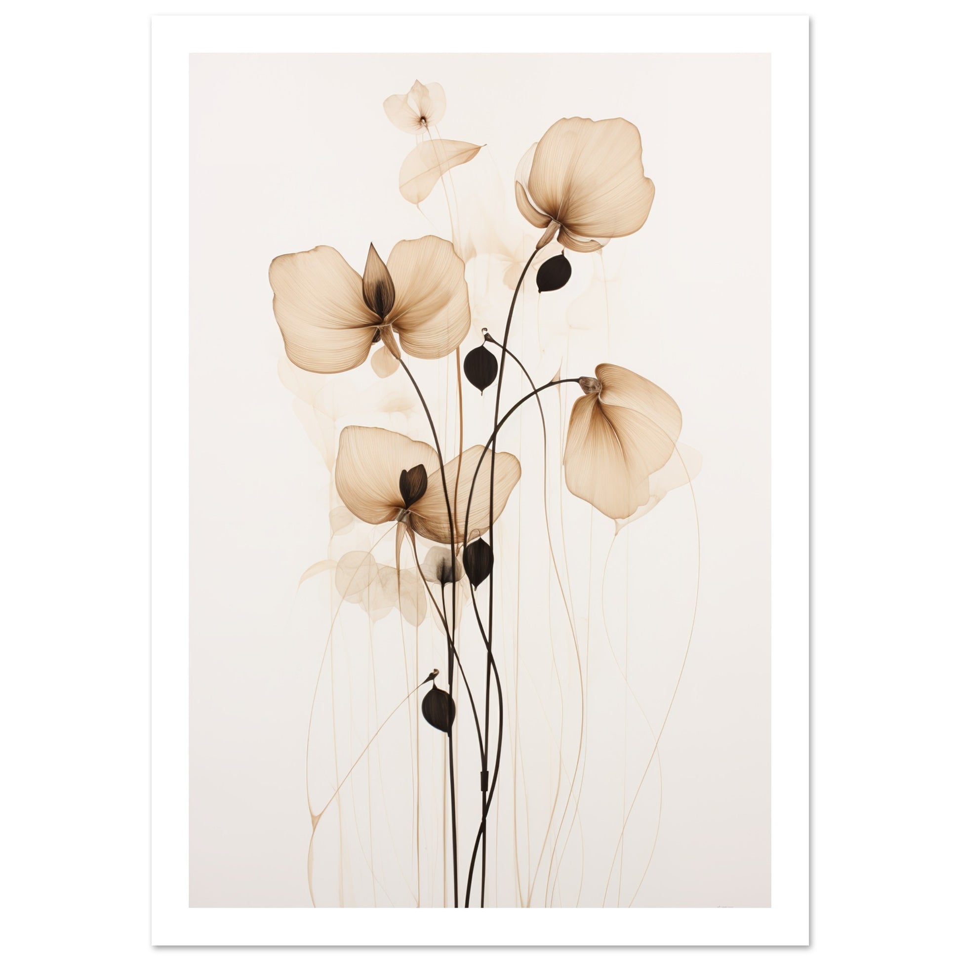 An abstract artwork that gracefully captures the essence of a flower in muted brown and beige tones. This whimsical minimalist piece features a delicate, wire-like flower with watercolour petals, offering a subtle and artistic portrayal of nature's beauty.