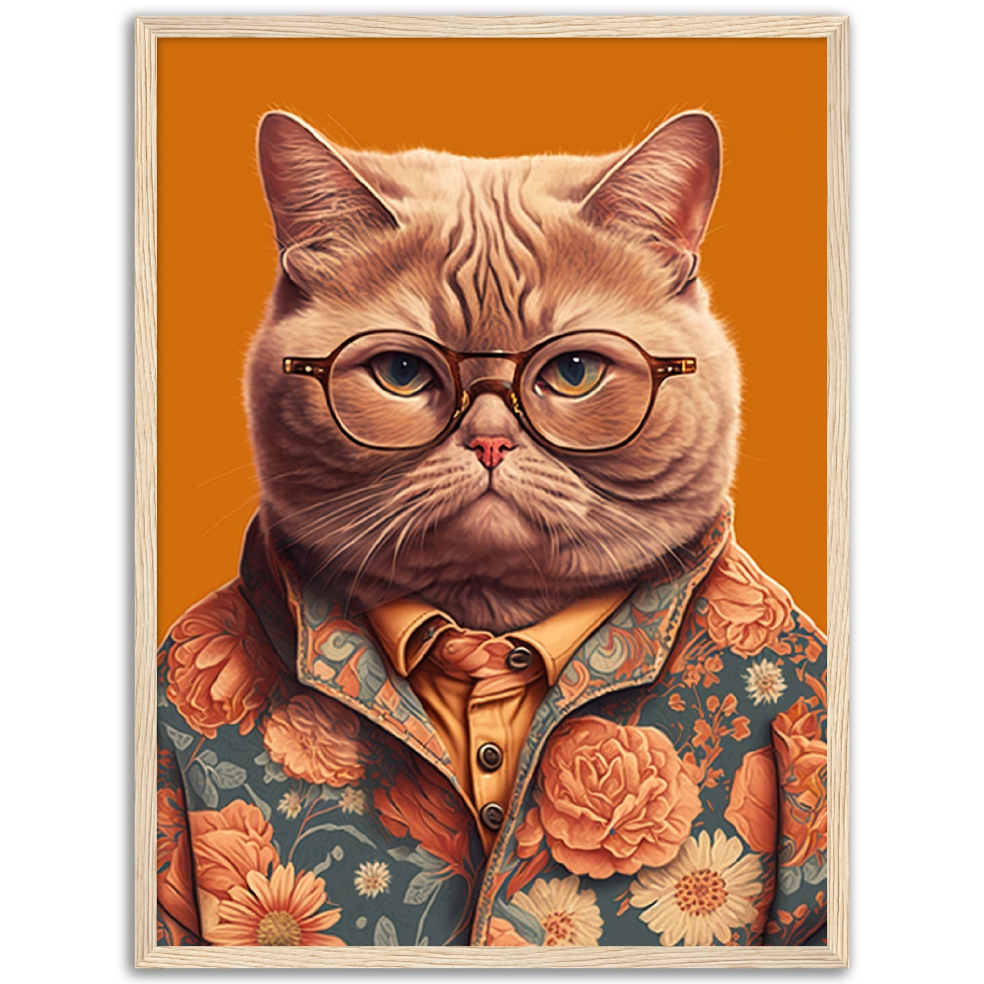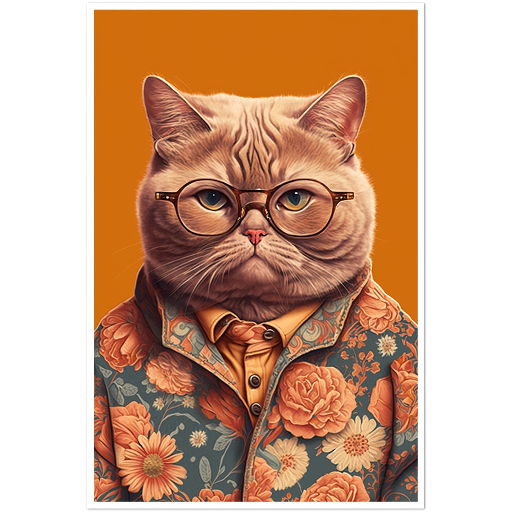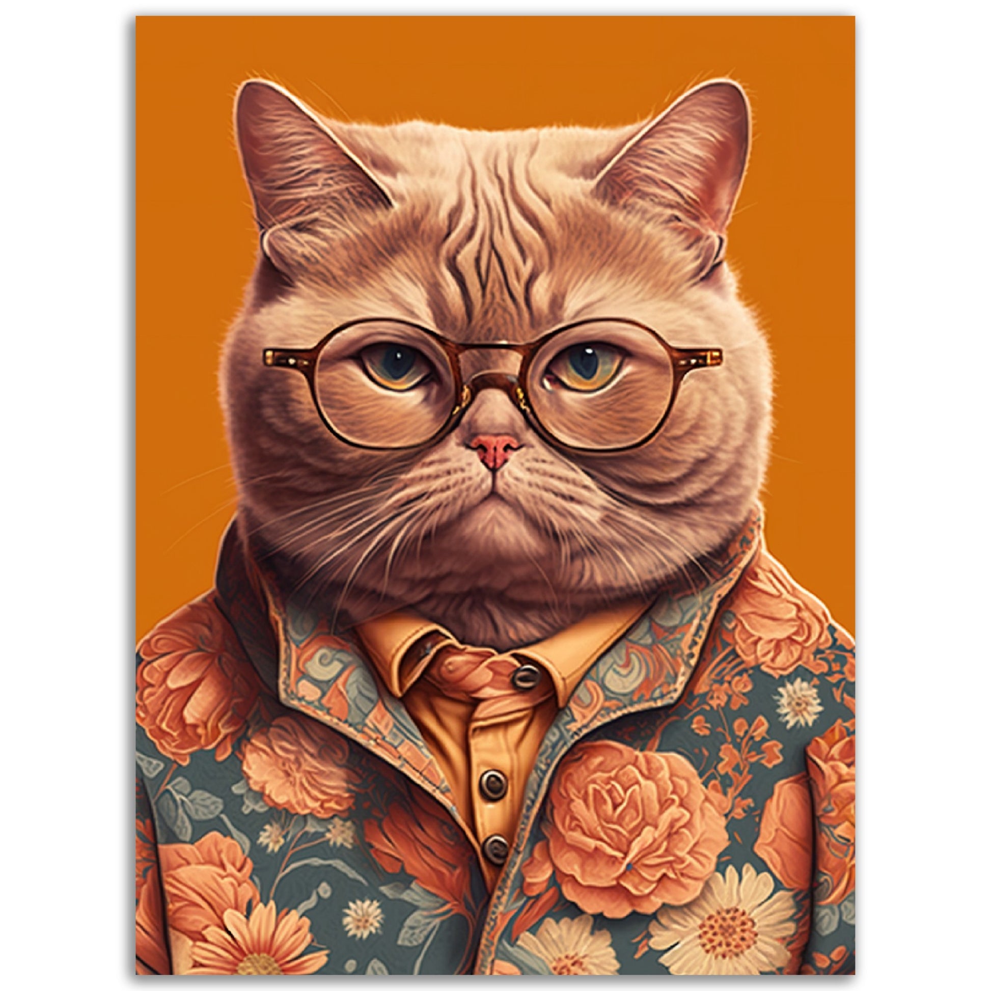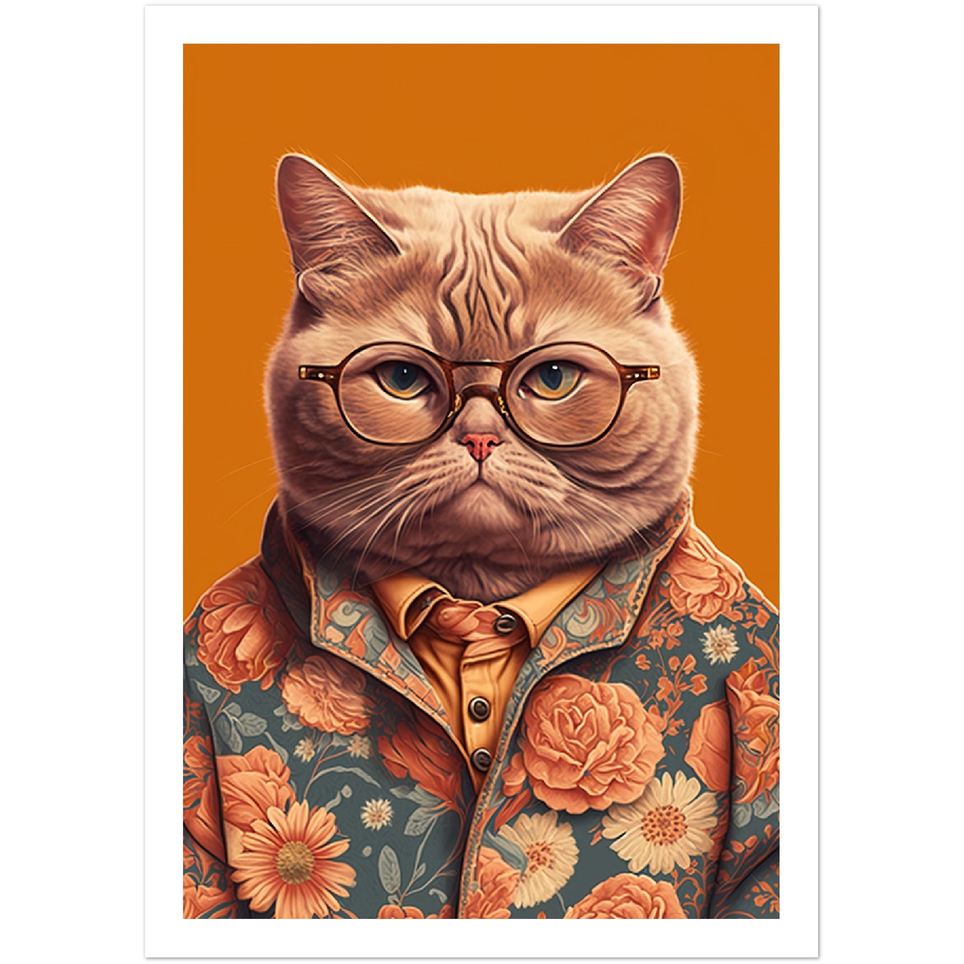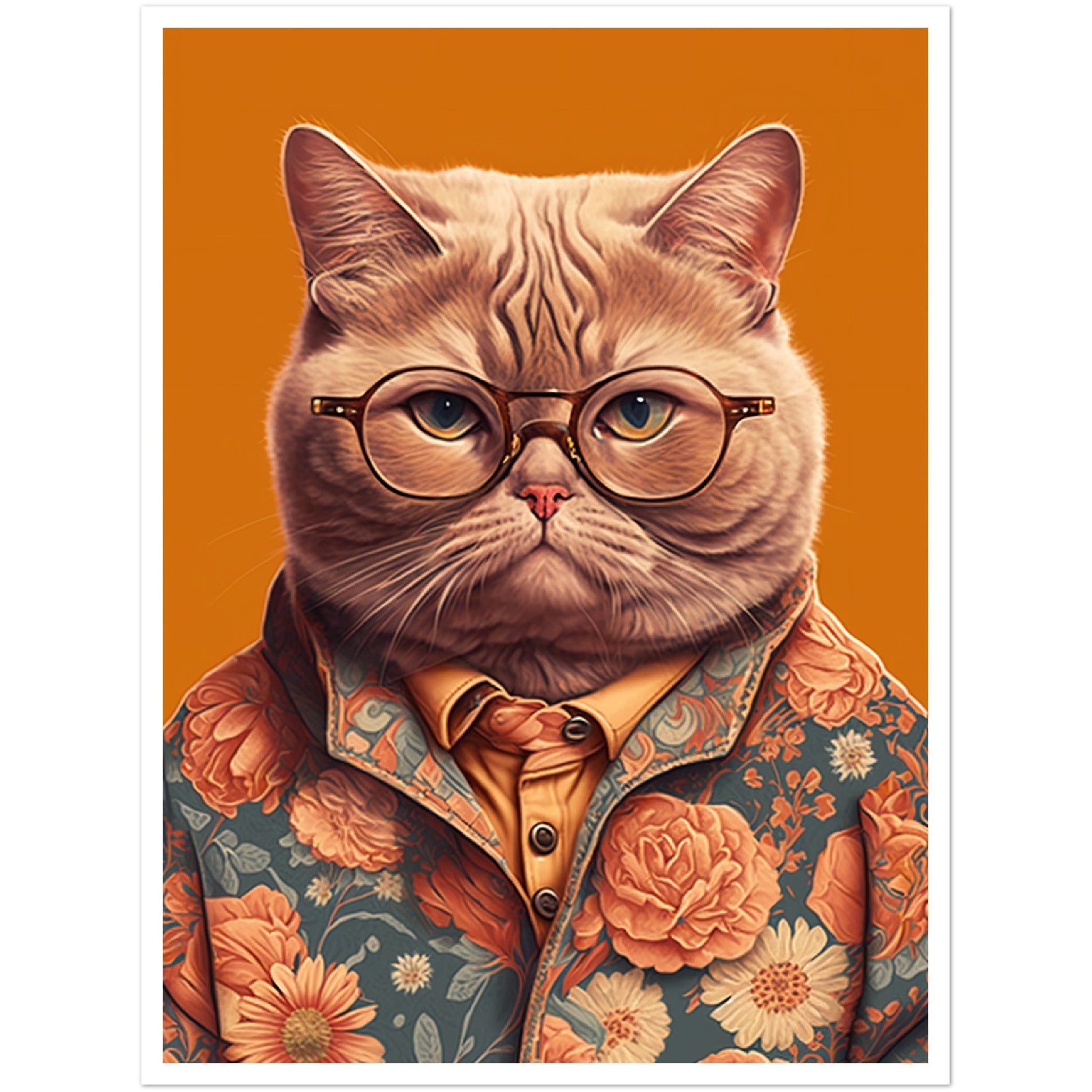 This illustration features a charming British Shorthair Cat wearing a stylish jacket adorned with a floral pattern. Set against a plain orange background, this artwork is sure to brighten up any space with its playful and unique design.