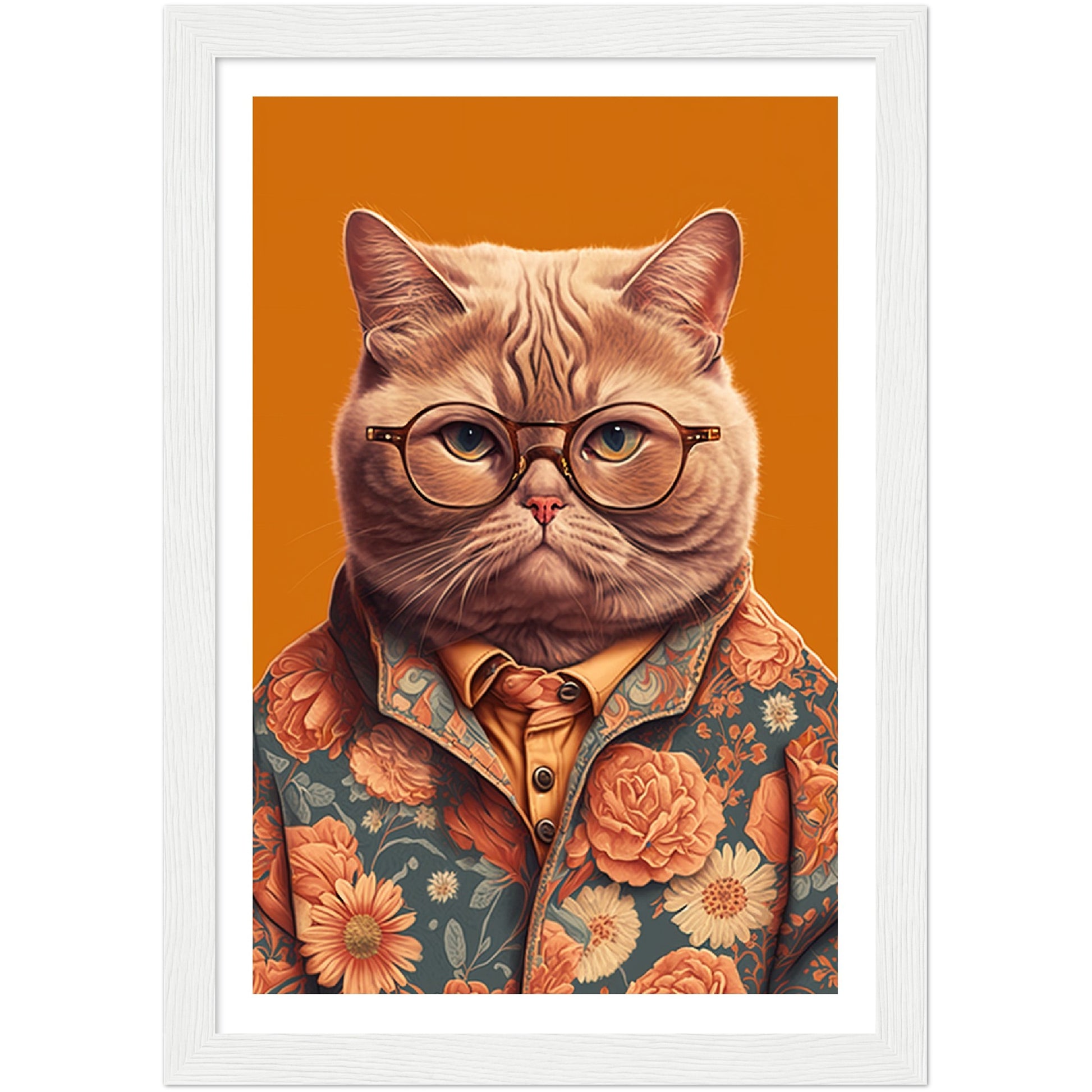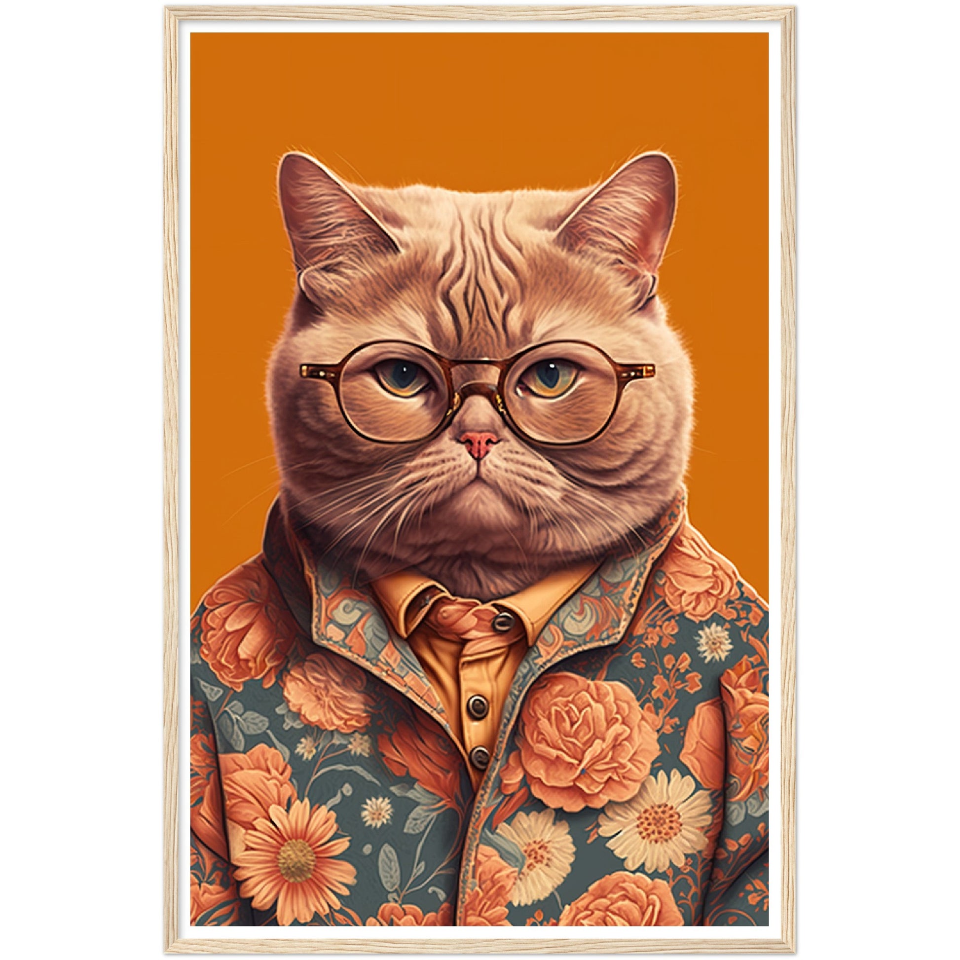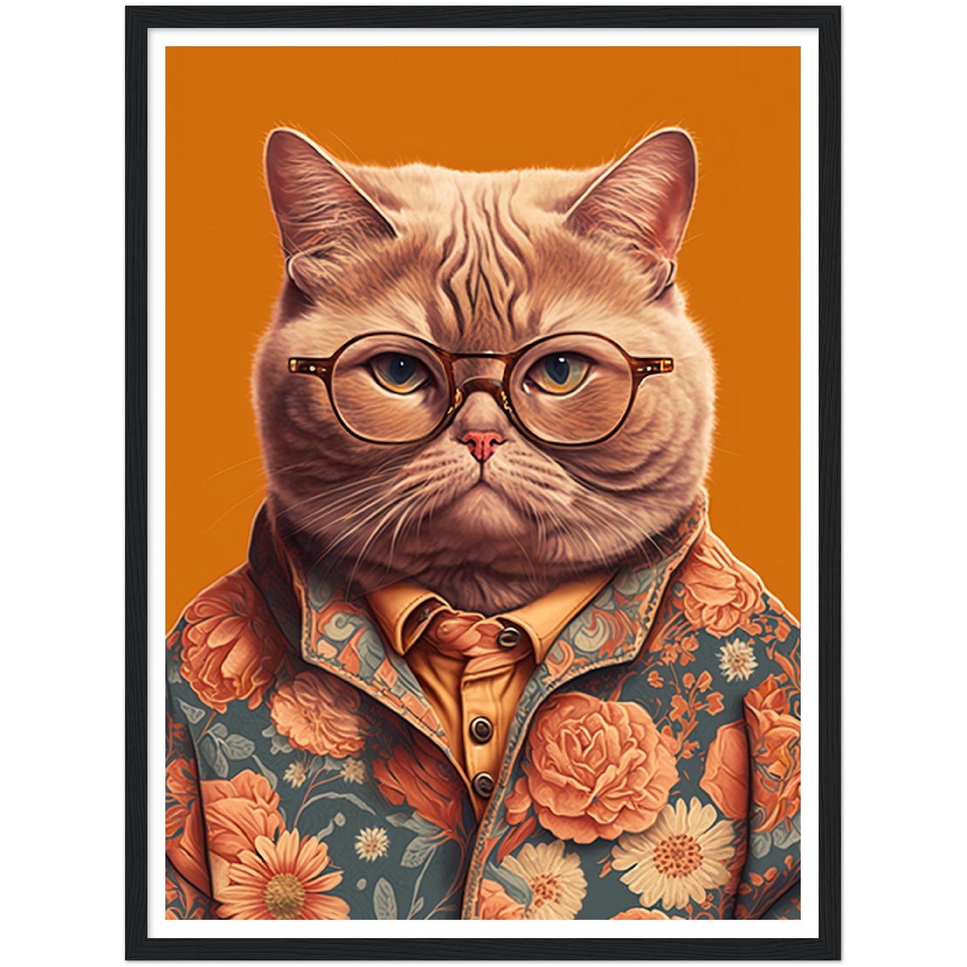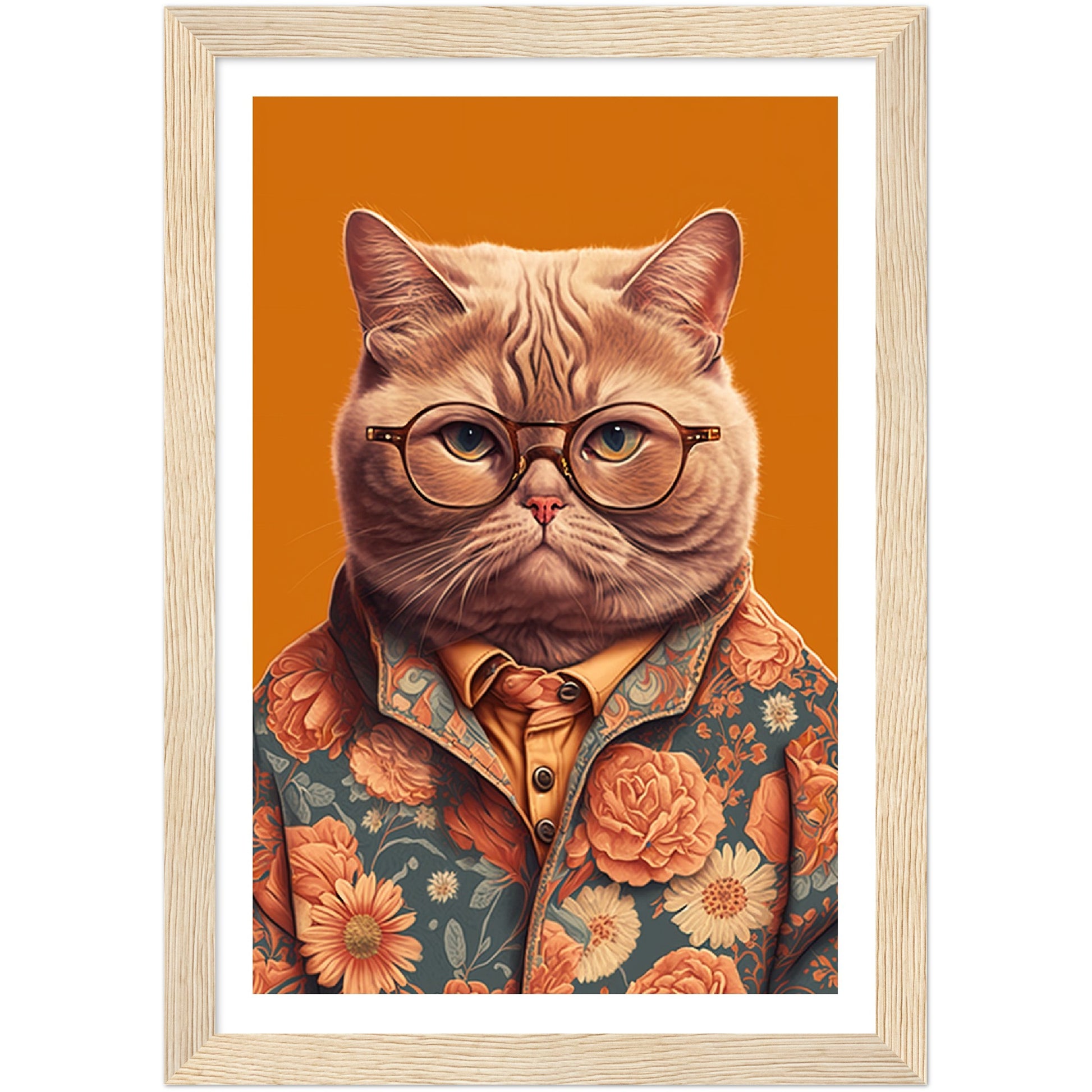 This illustration features a charming British Shorthair Cat wearing a stylish jacket adorned with a floral pattern. Set against a plain orange background, this artwork is sure to brighten up any space with its playful and unique design.