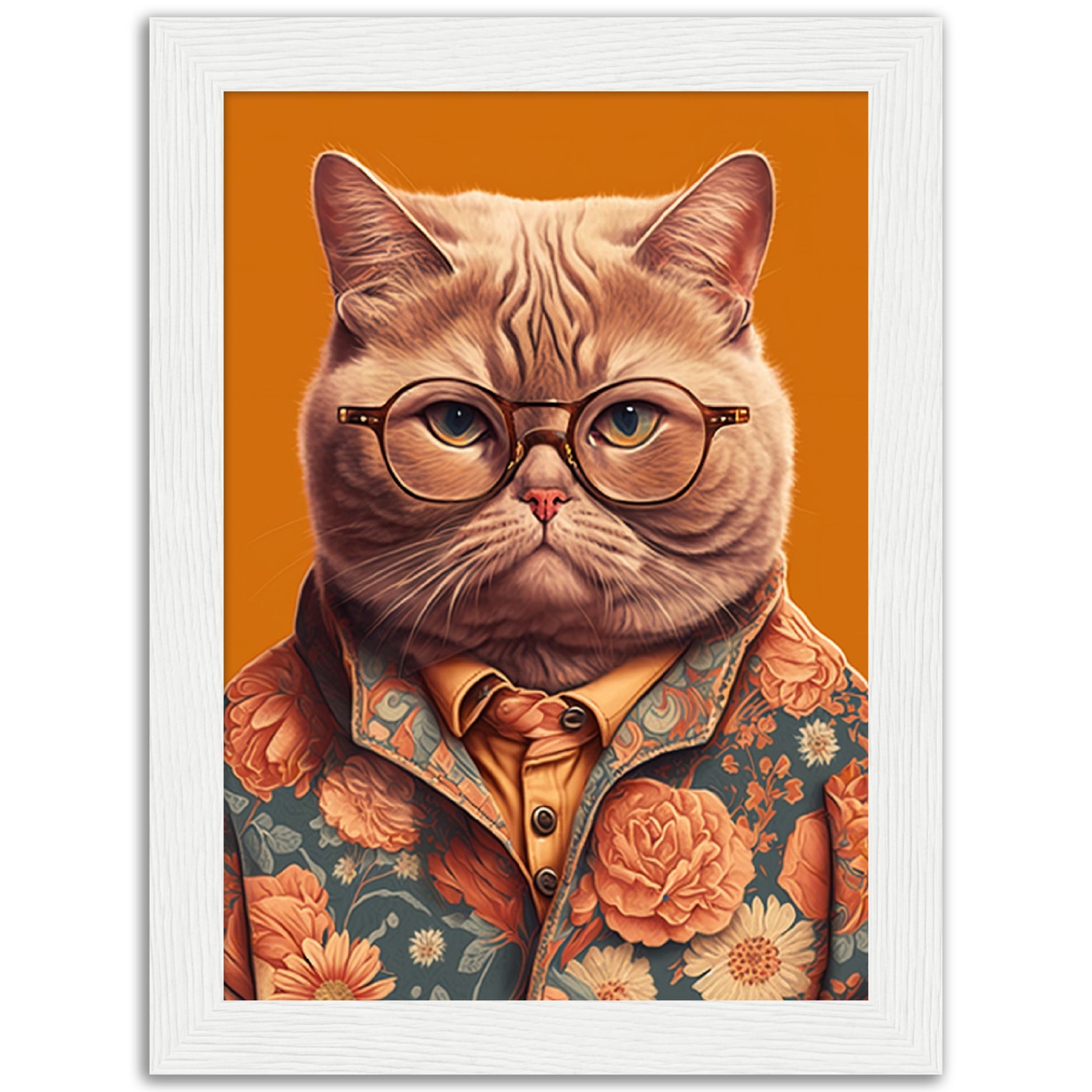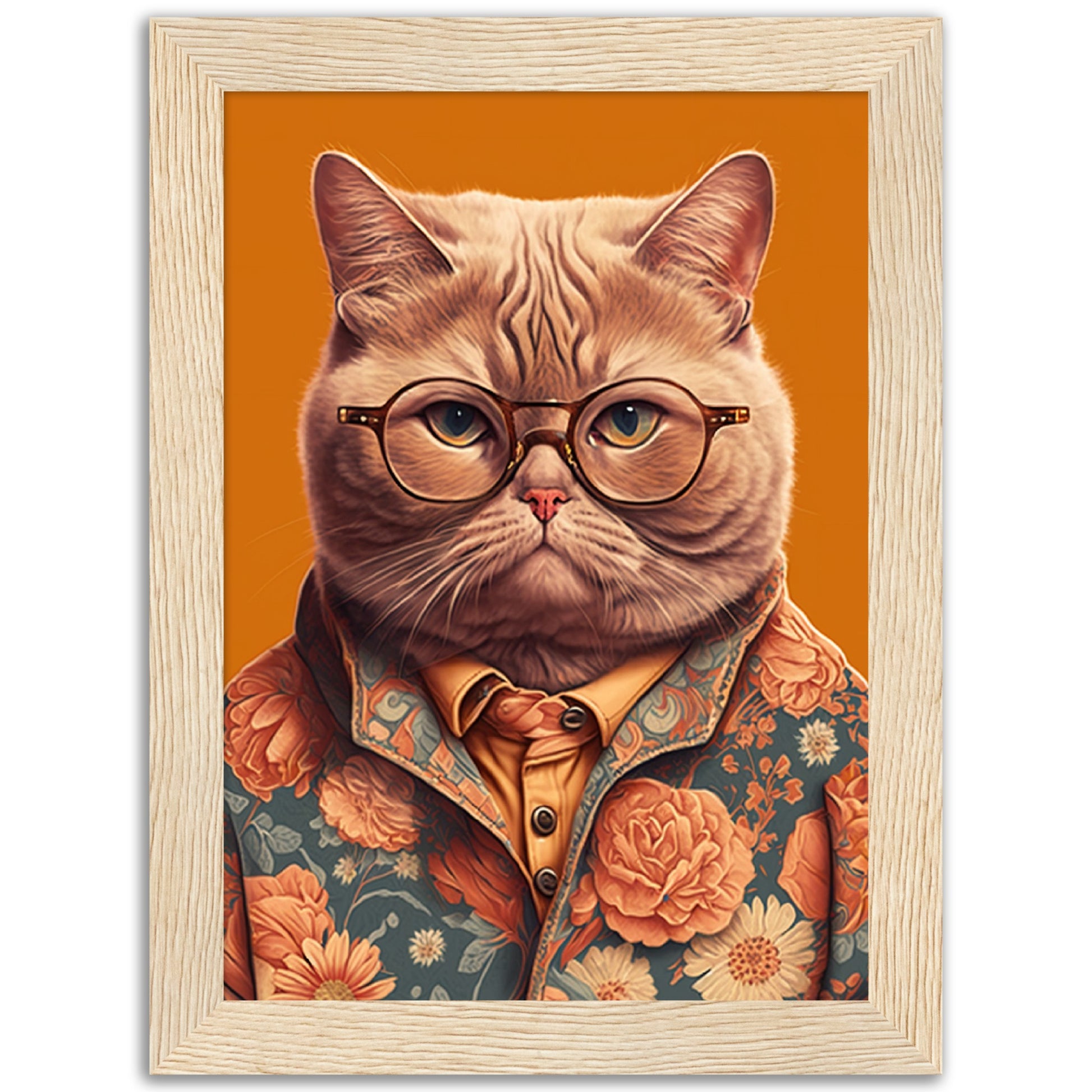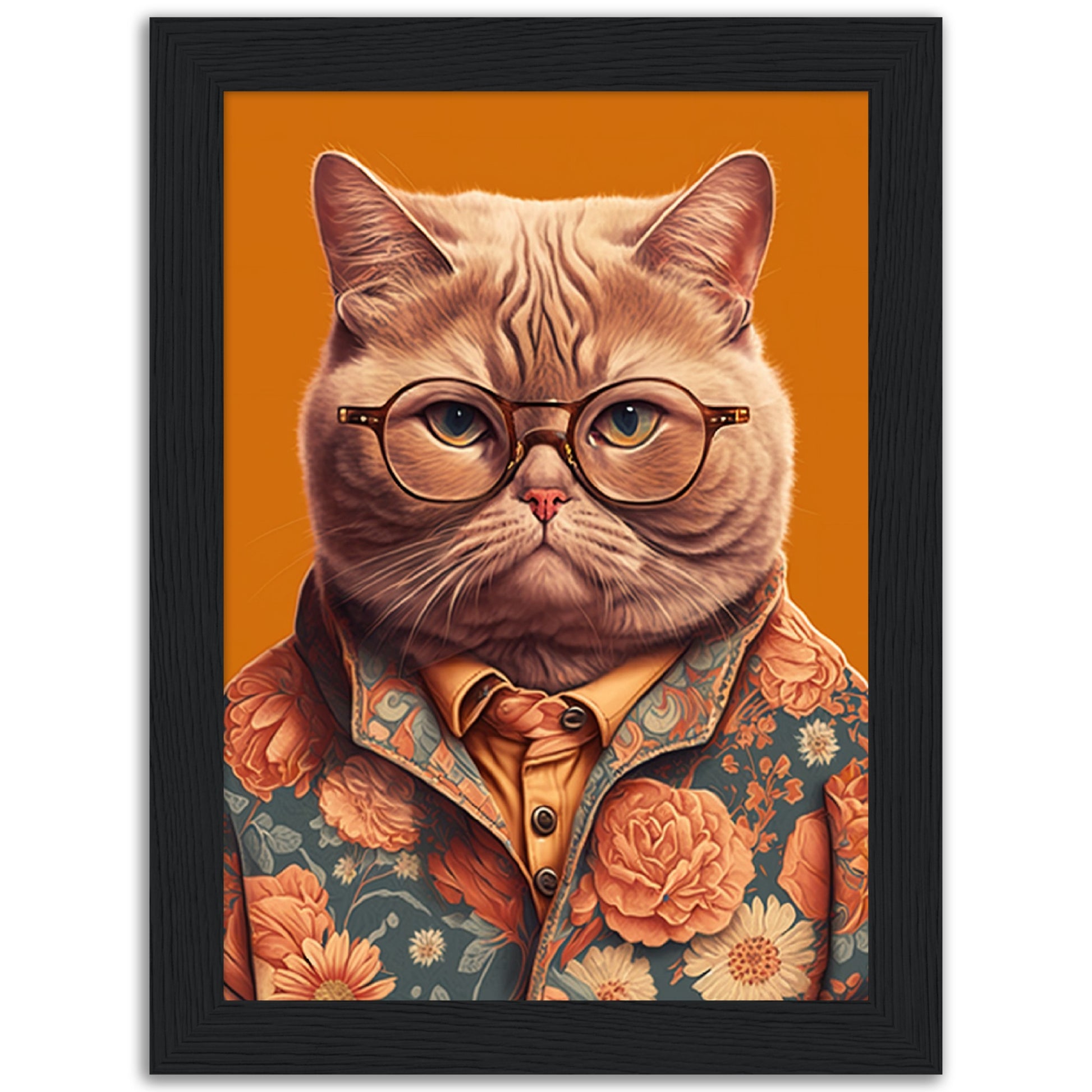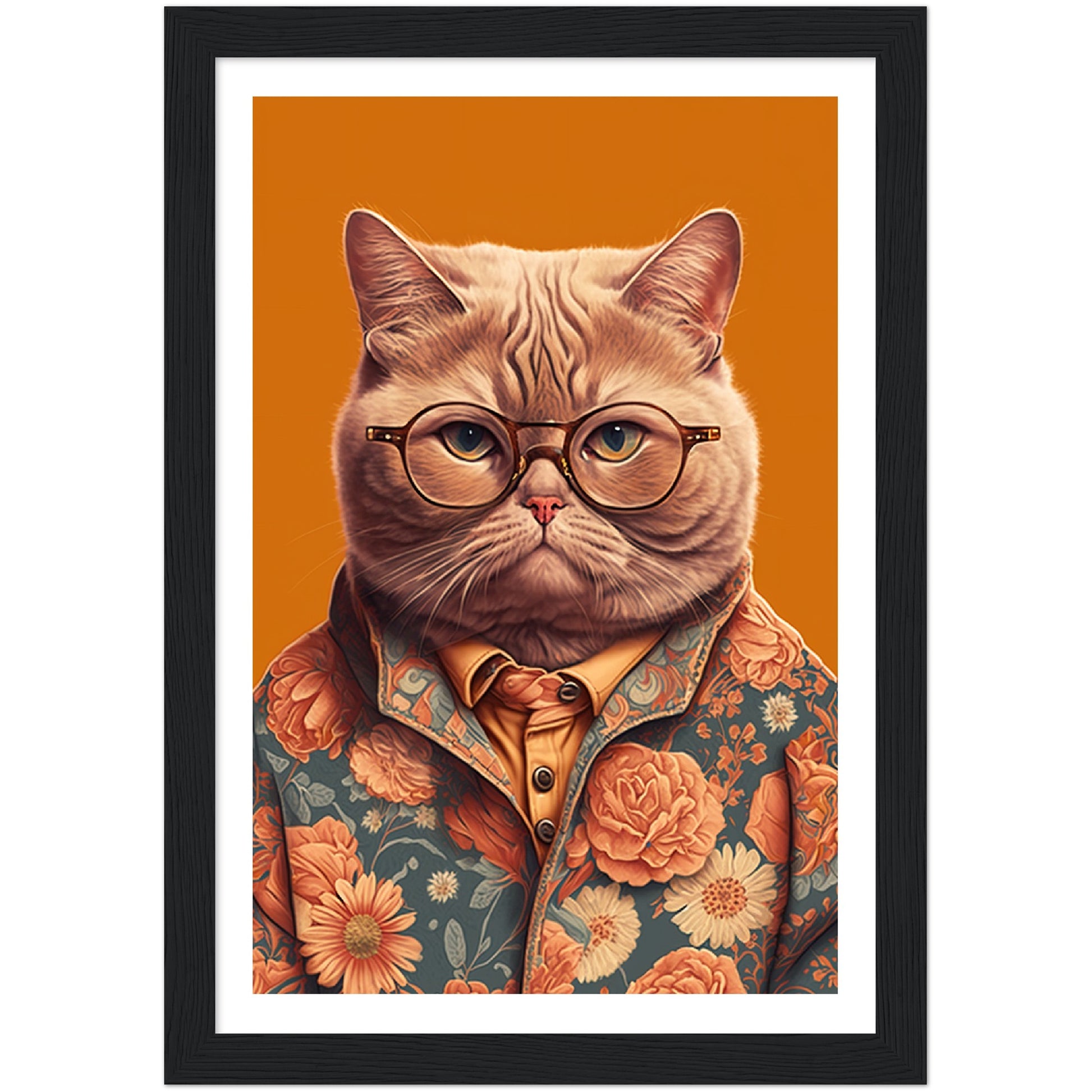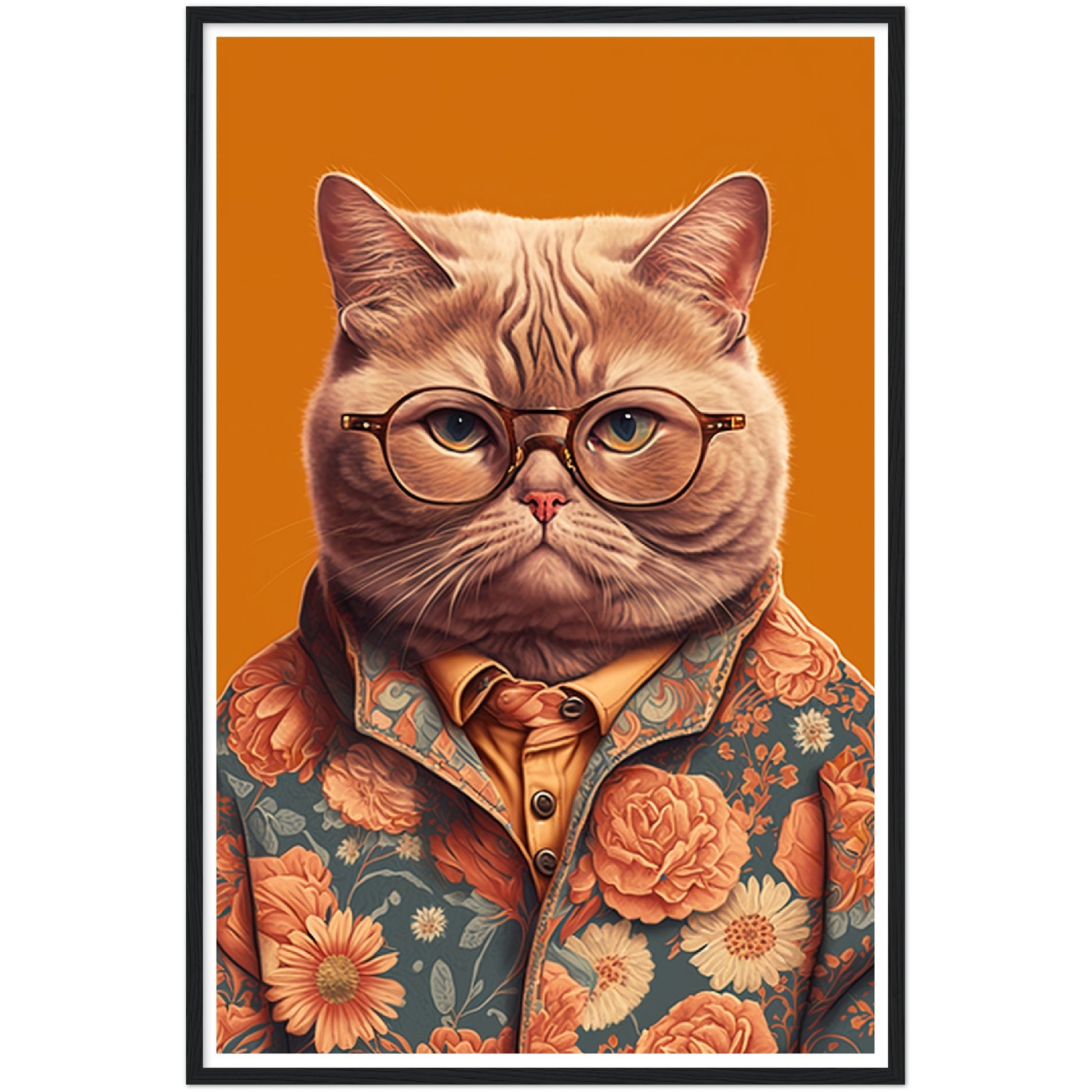This illustration features a charming British Shorthair Cat wearing a stylish jacket adorned with a floral pattern. Set against a plain orange background, this artwork is sure to brighten up any space with its playful and unique design.