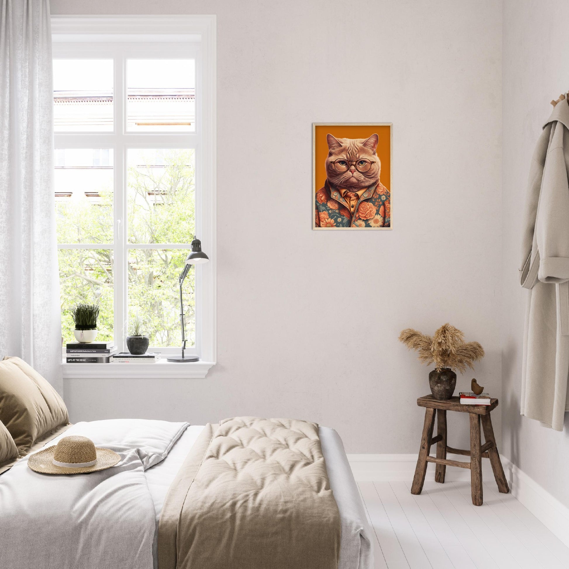 The best place to hang this art would be in a living room, bedroom, or home office. It would also look great in a cat-themed room or a space with a bright and playful decor. The orange background adds a pop of color and can complement other warm tones in the room. The artwork's whimsical design and charming cat subject make it a great conversation starter and a fun addition to any space.