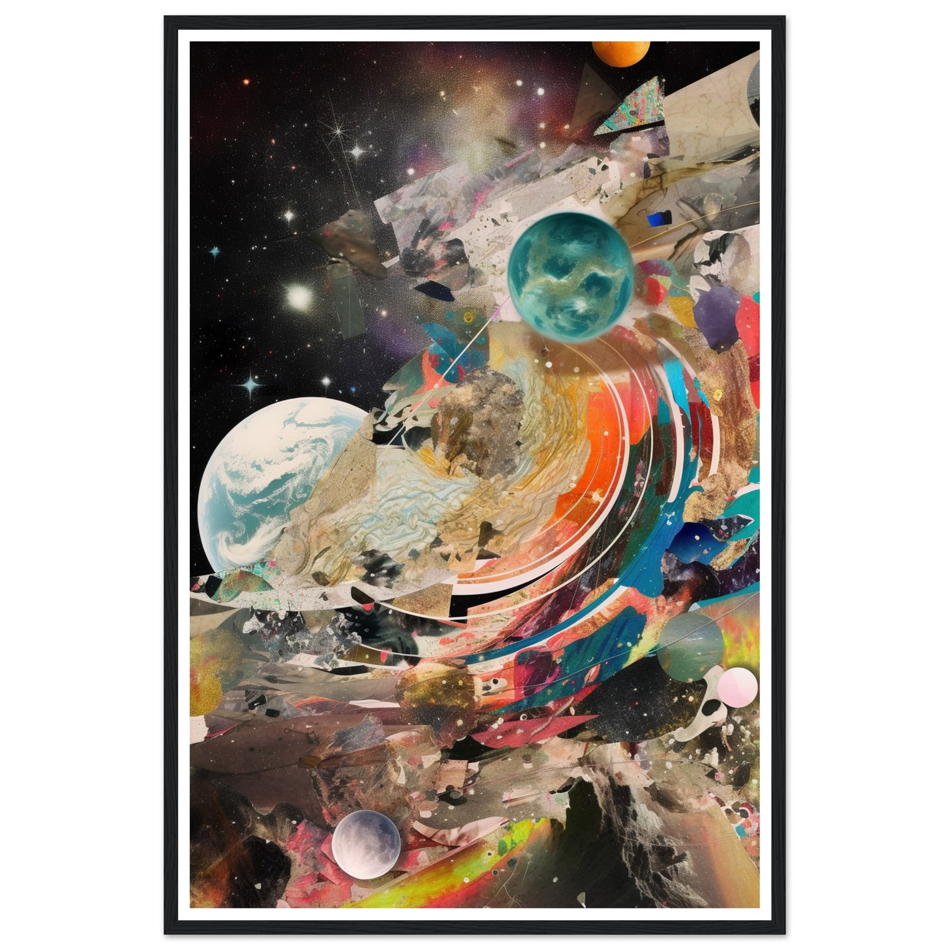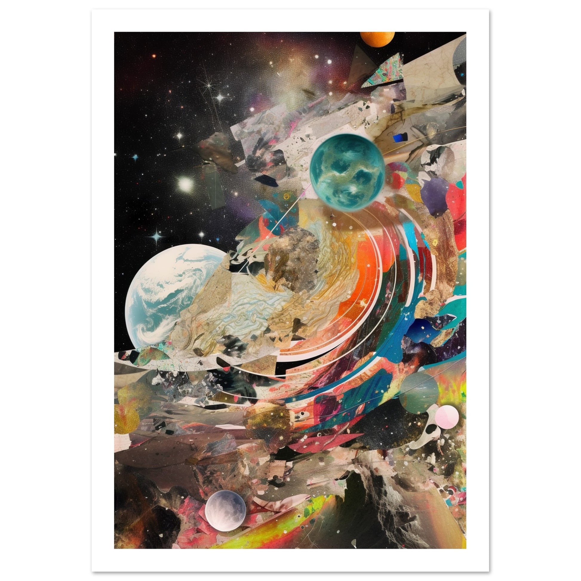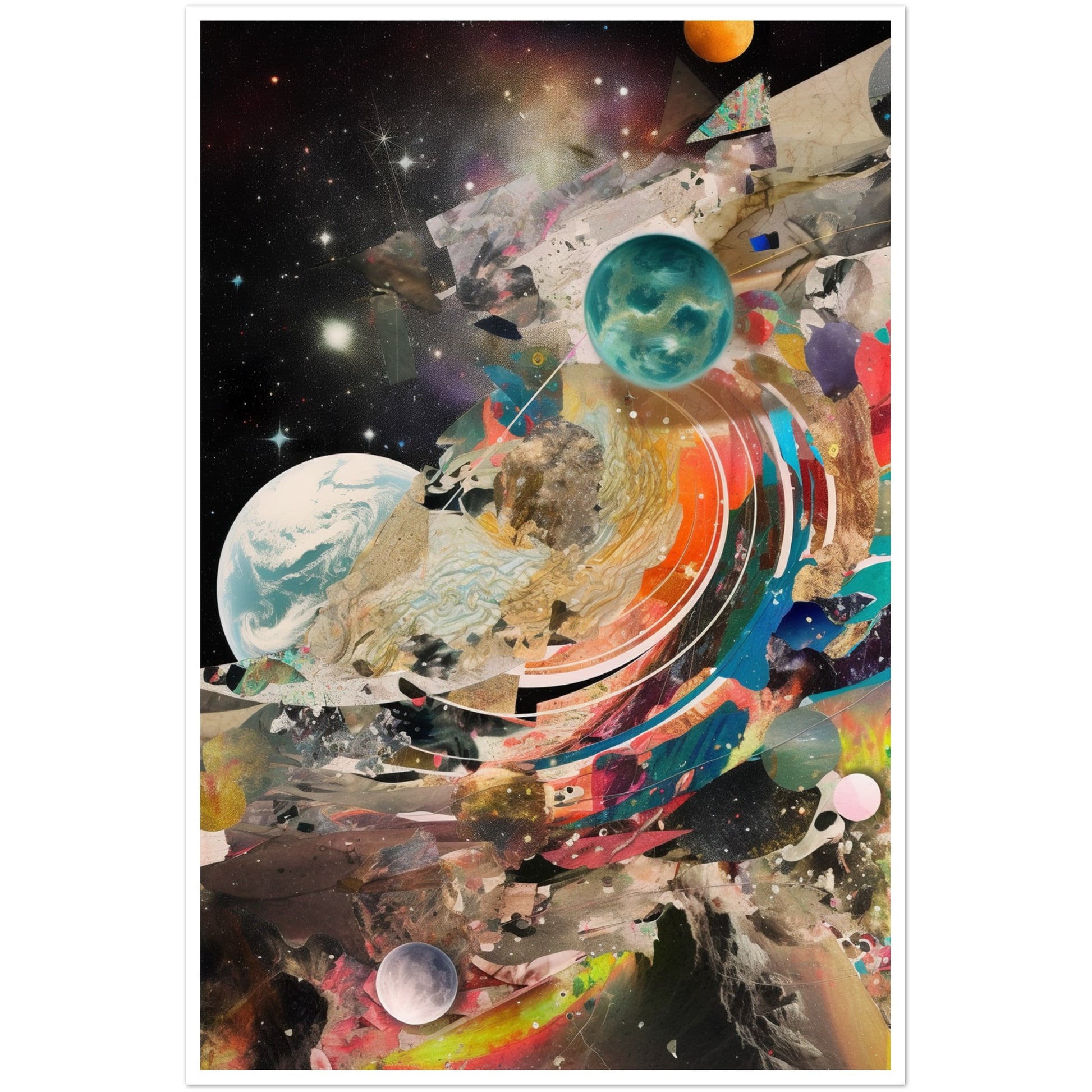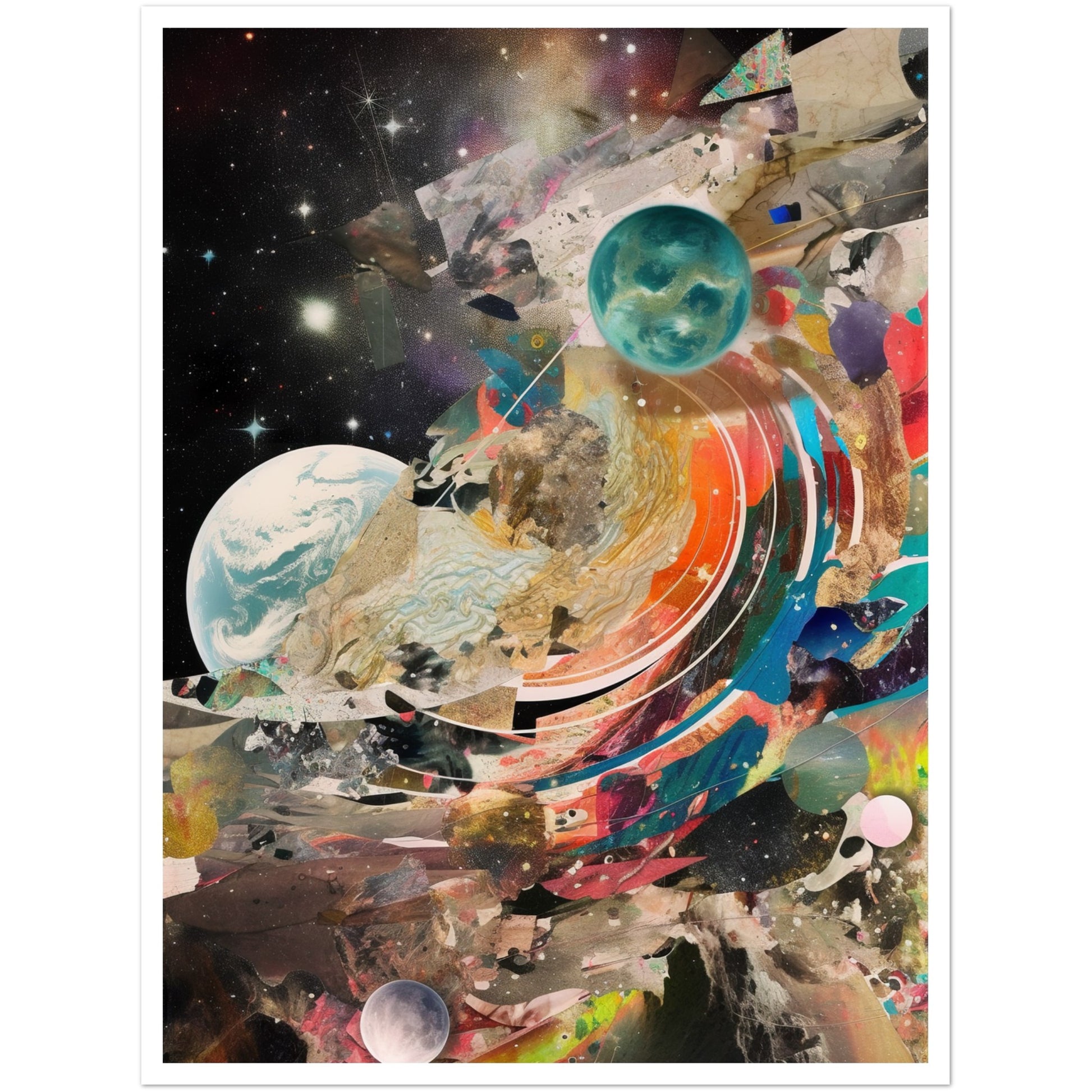 A captivating abstract analogue collage art piece that transports viewers into the depths of a mesmerizing Milky Way galaxy. The artwork showcases a vibrant cosmic tapestry of swirling colors, stars, and planets, set against a backdrop of profound darkness.