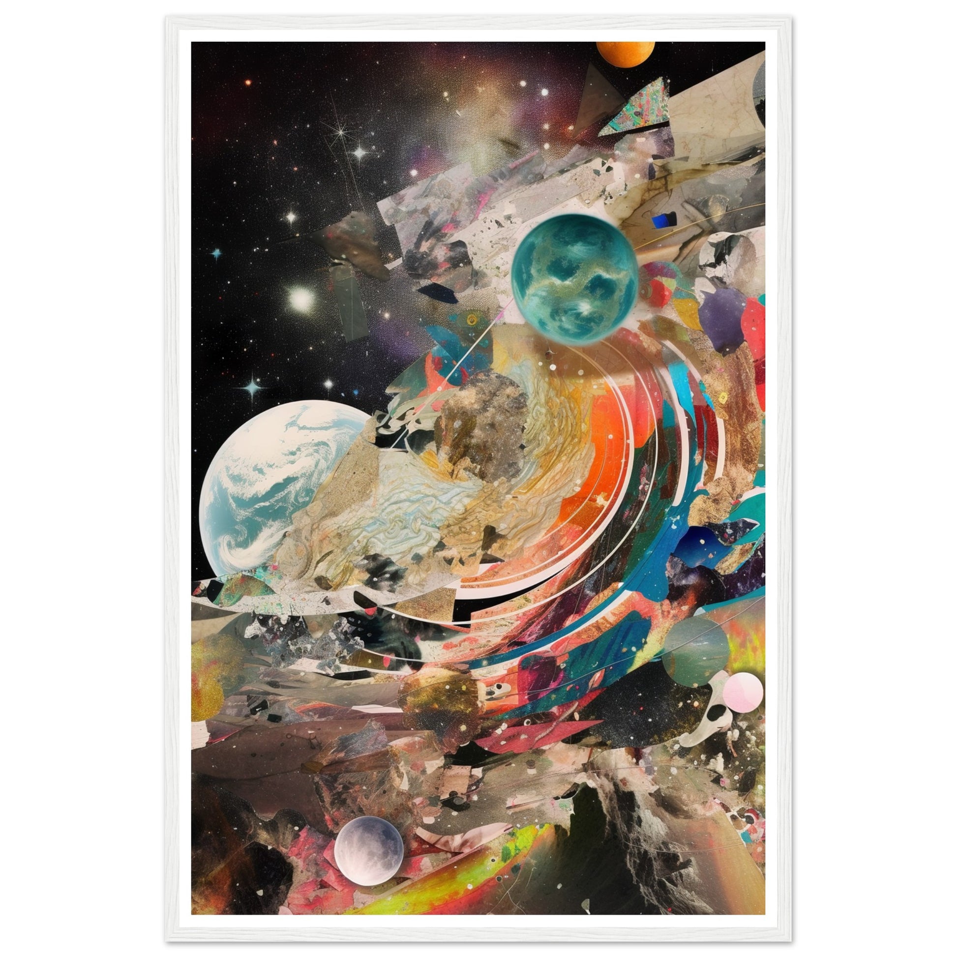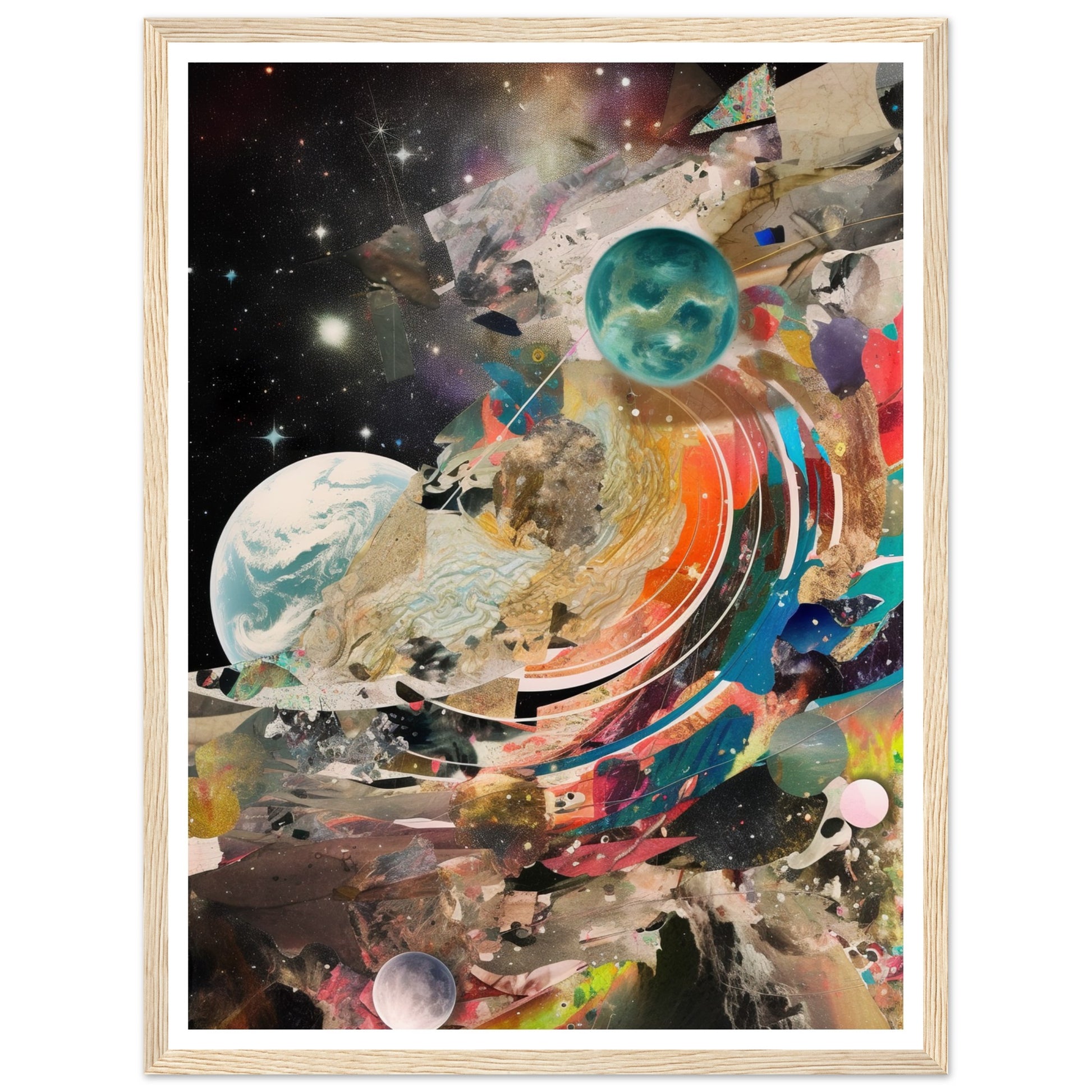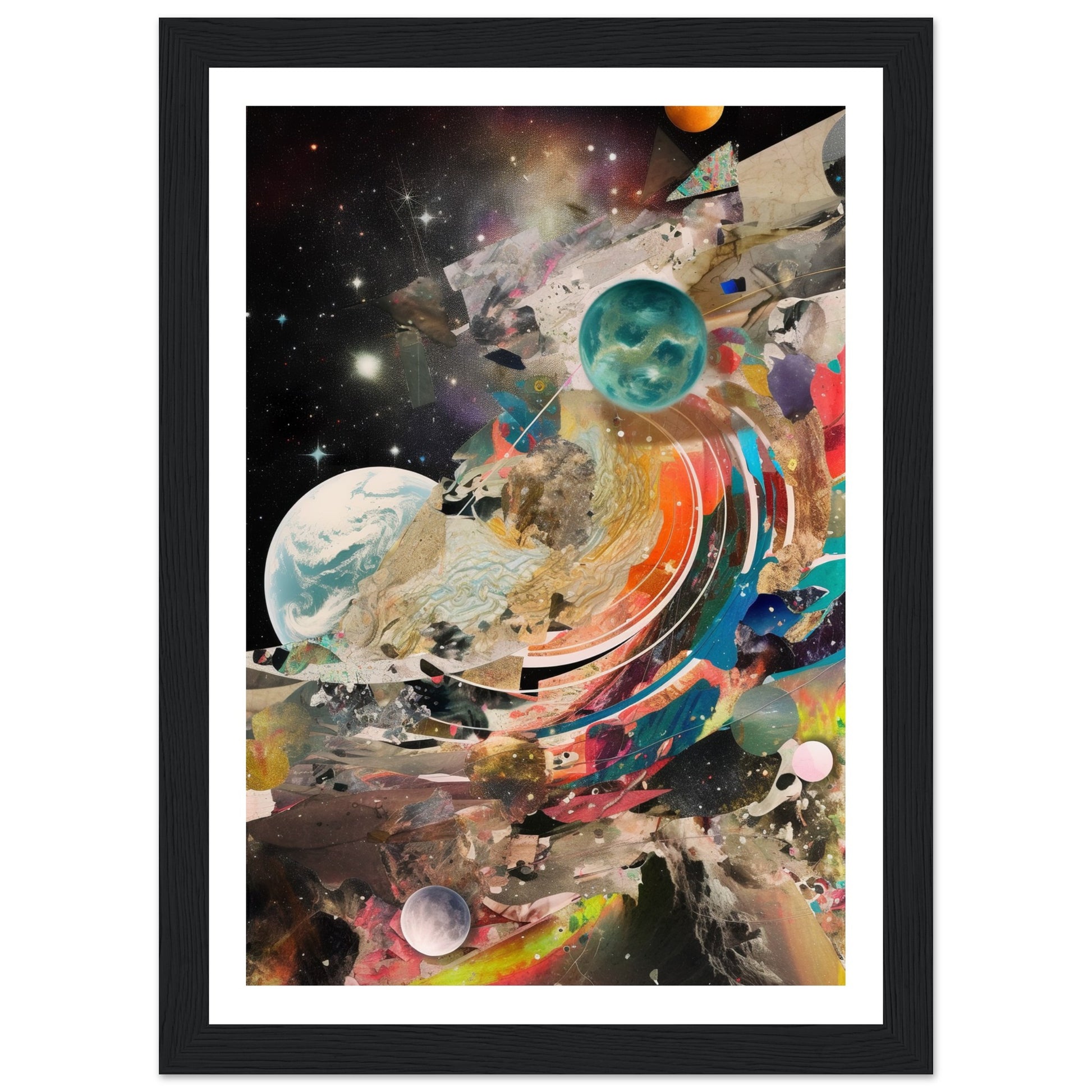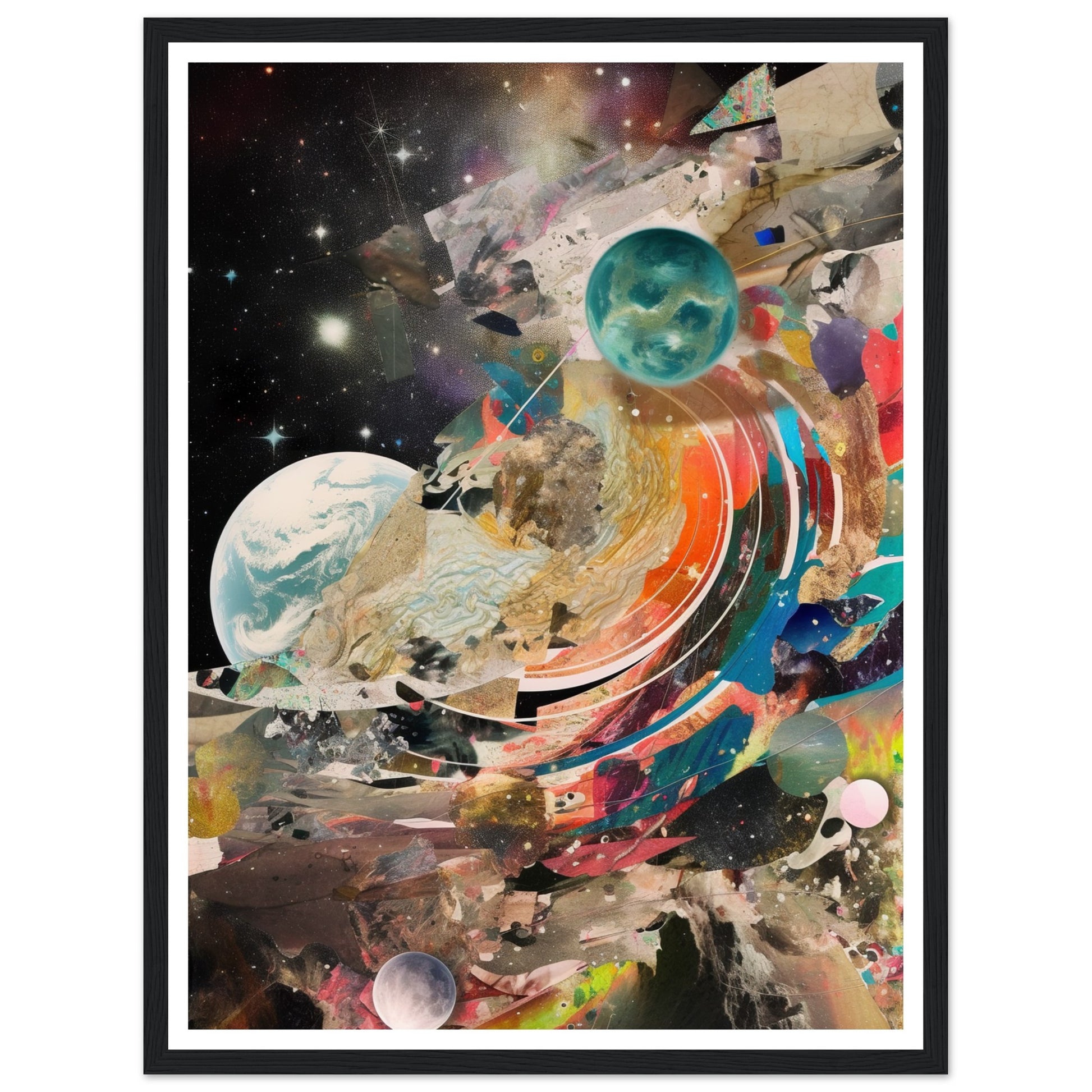 A captivating abstract analogue collage art piece that transports viewers into the depths of a mesmerizing Milky Way galaxy. The artwork showcases a vibrant cosmic tapestry of swirling colors, stars, and planets, set against a backdrop of profound darkness.