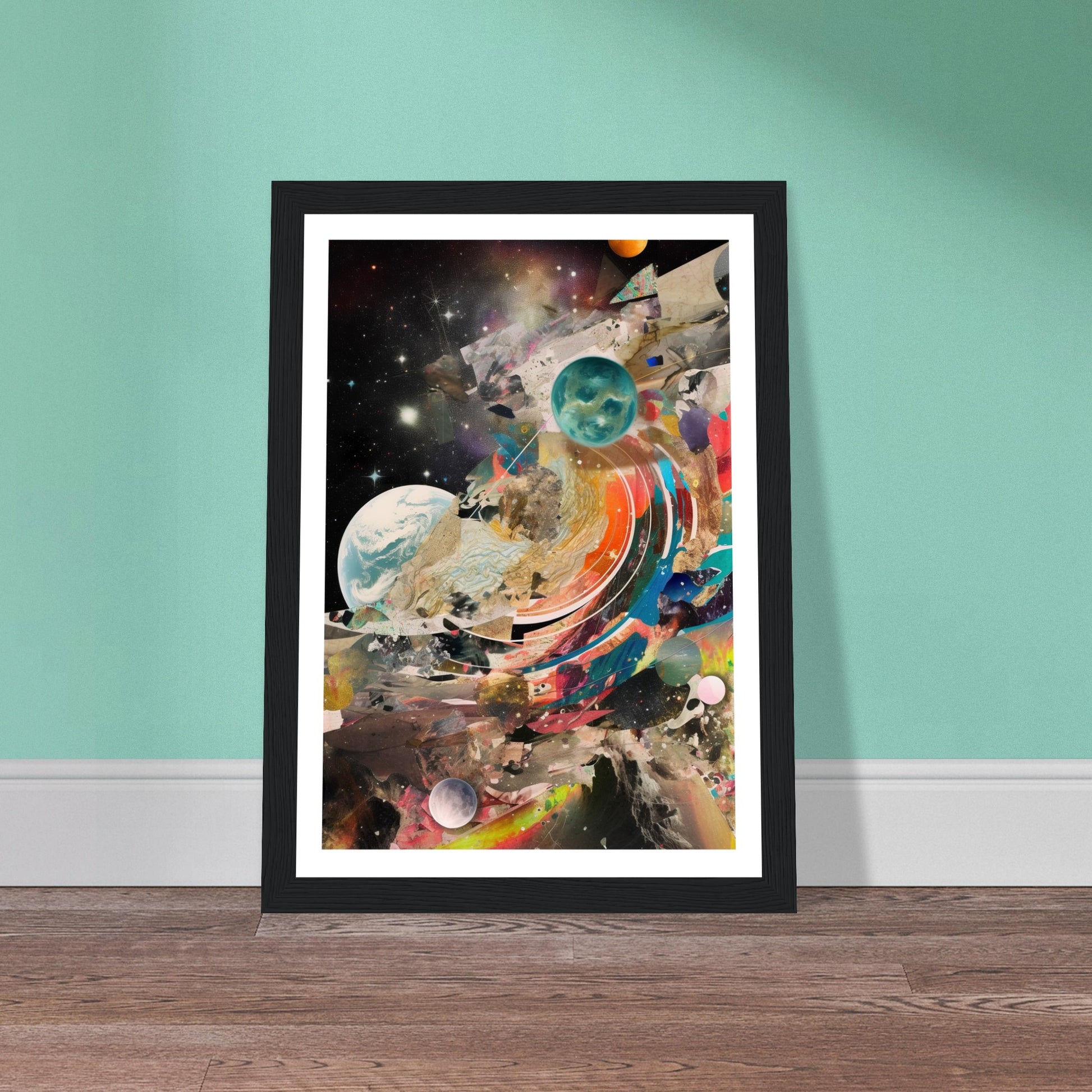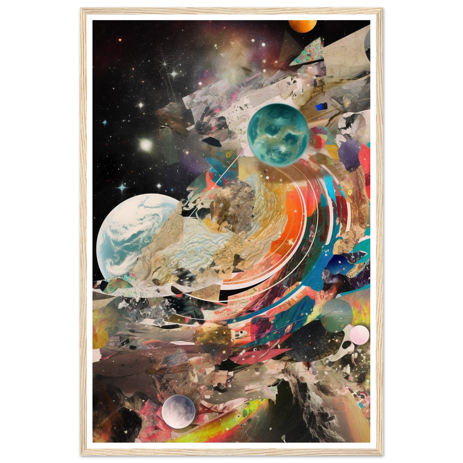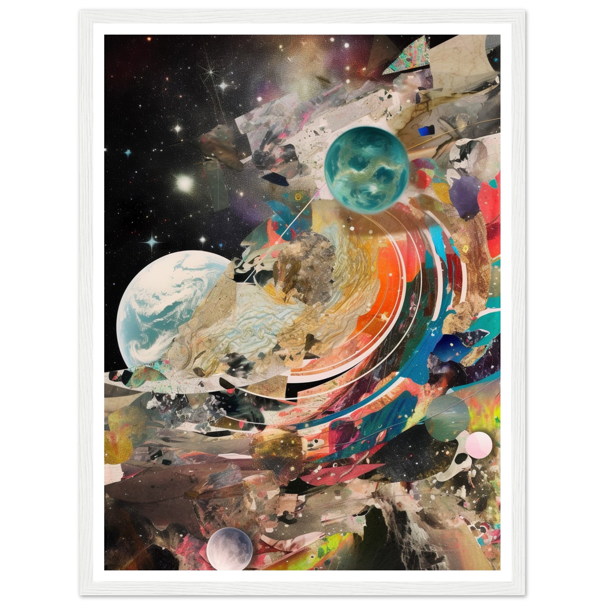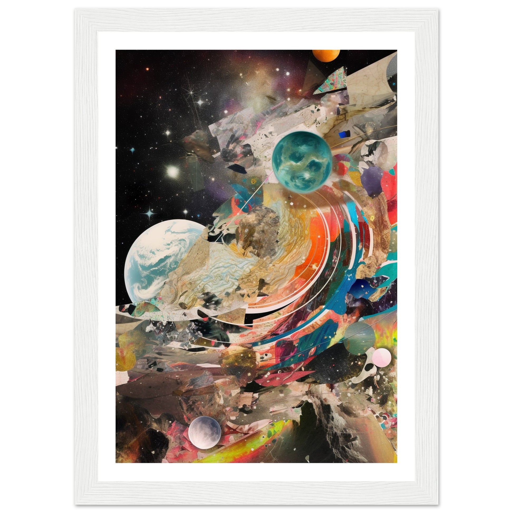 A captivating abstract analogue collage art piece that transports viewers into the depths of a mesmerizing Milky Way galaxy. The artwork showcases a vibrant cosmic tapestry of swirling colors, stars, and planets, set against a backdrop of profound darkness.