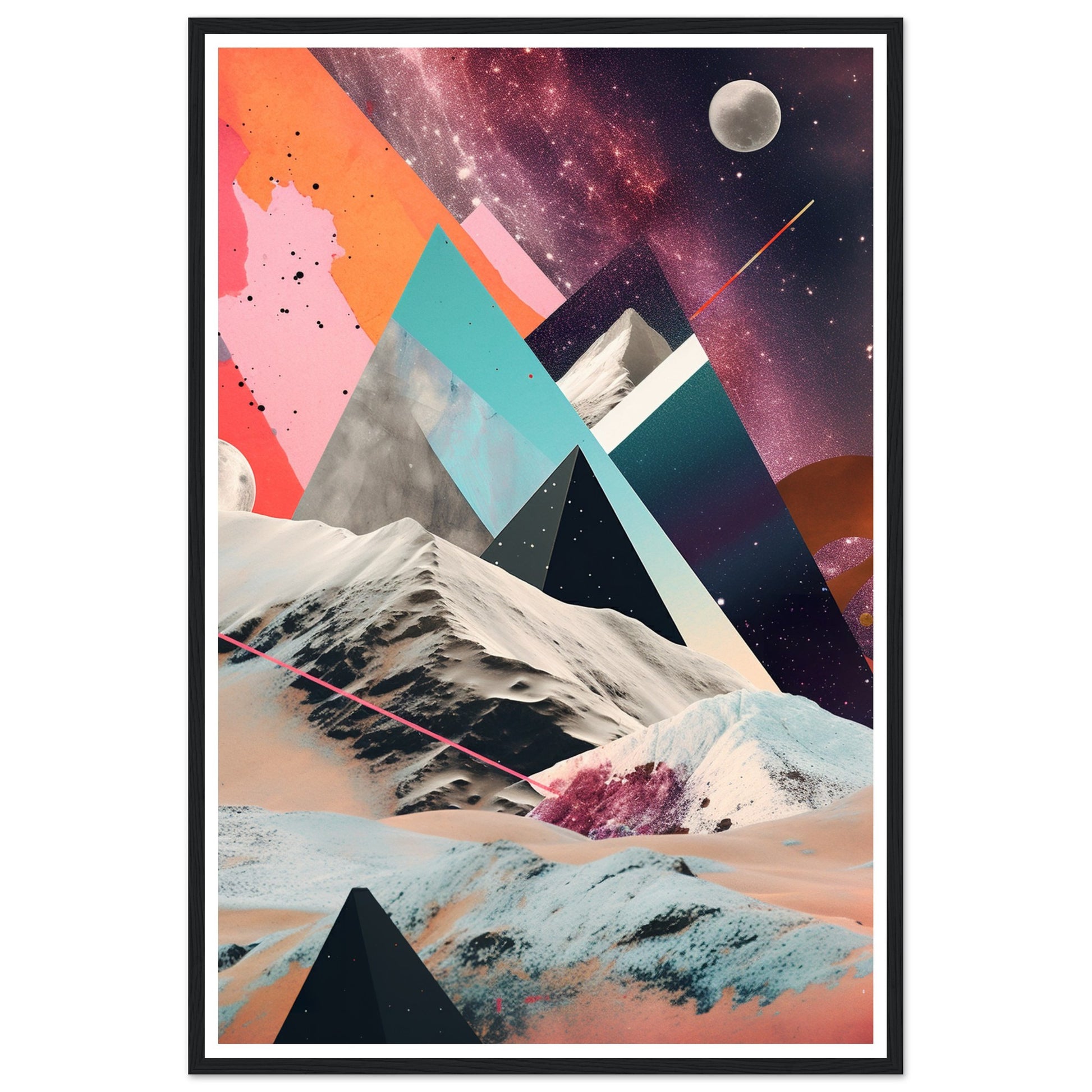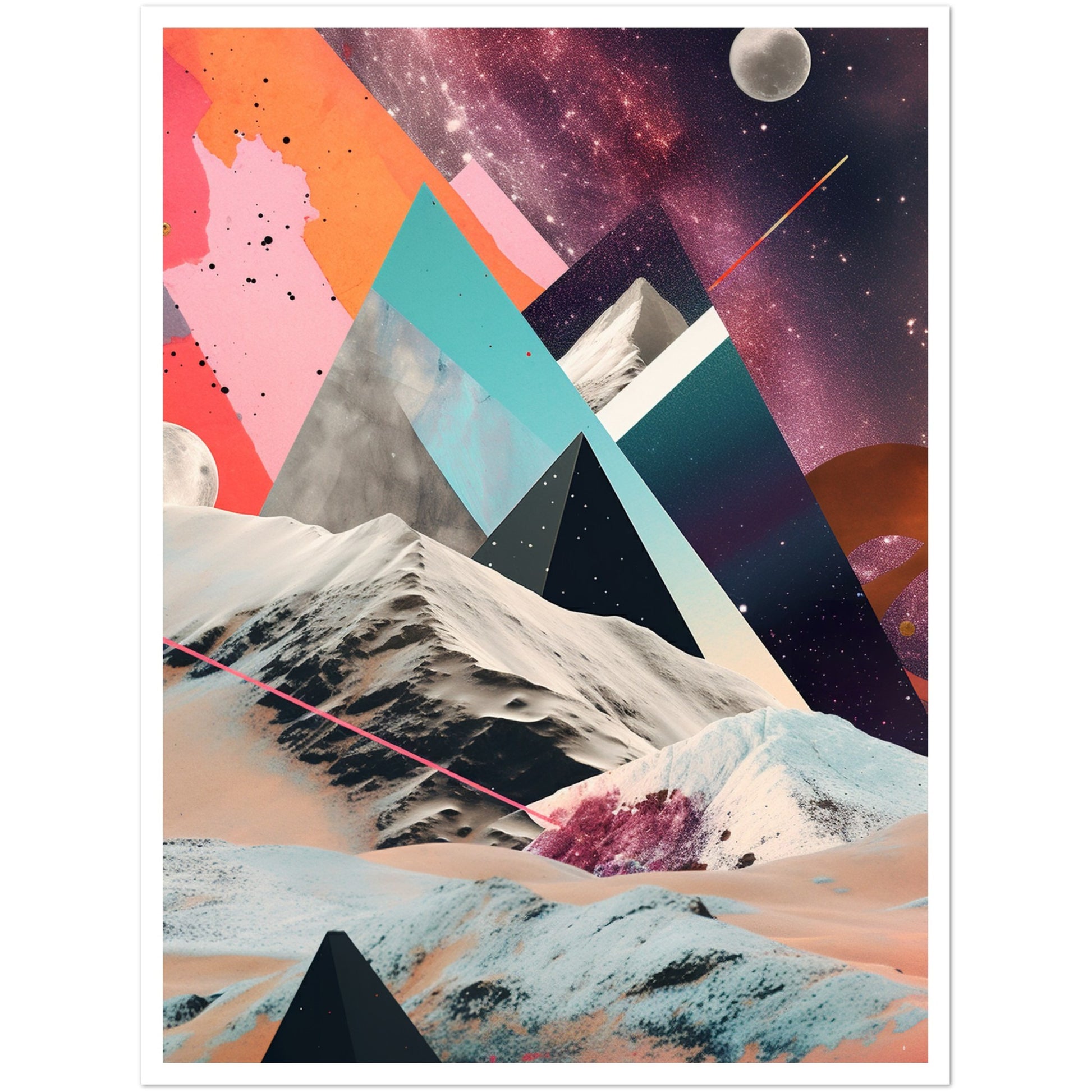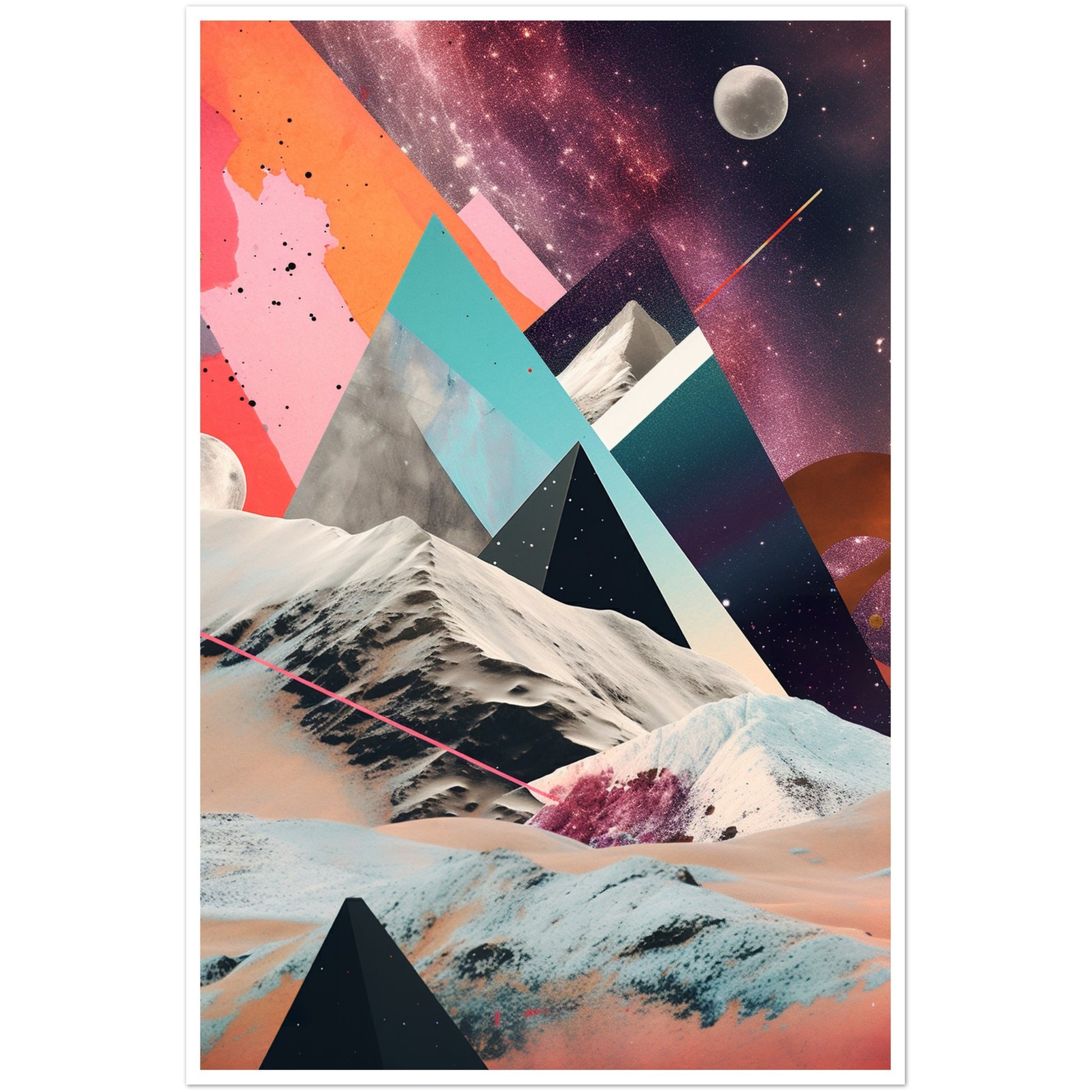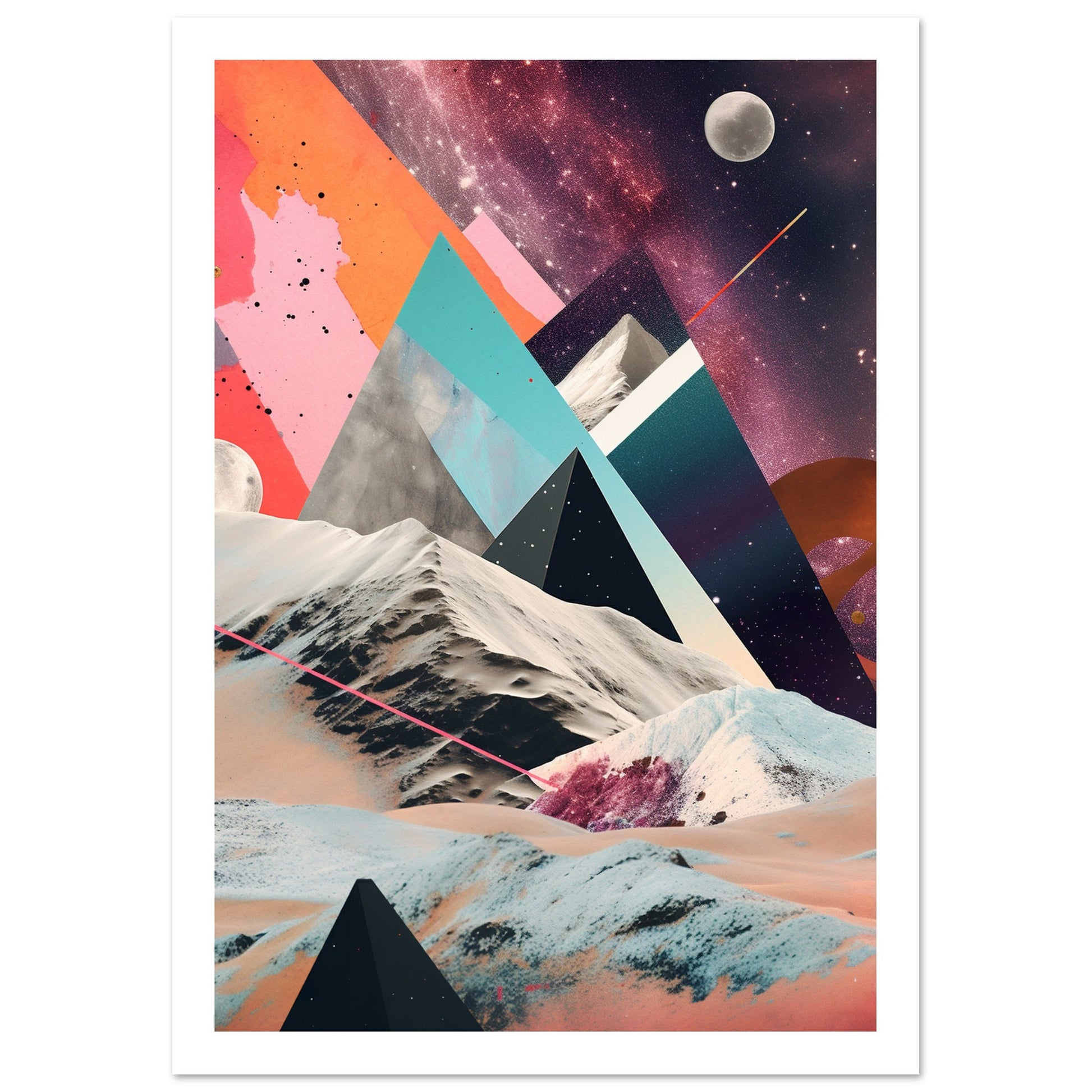 A captivating abstract analogue collage art piece that unveils a captivating rocky moonscape against the backdrop of a purple-hued Milky Way galaxy. Through the intricate layering and arrangement of various materials and elements, the artwork creates a visually mesmerizing composition. The collage captures the rugged beauty of the moonscape, with its rocky formations and lunar terrain, while the ethereal purple hues of the Milky Way galaxy add a sense of otherworldly enchantment.