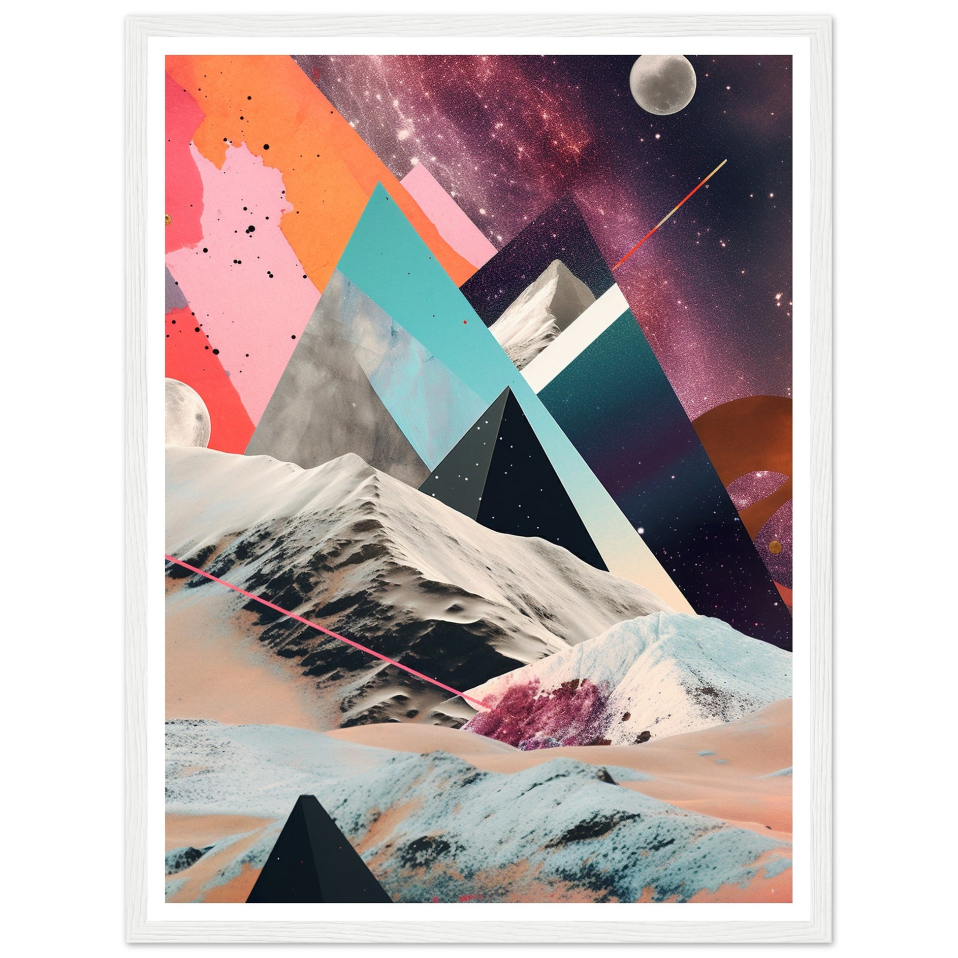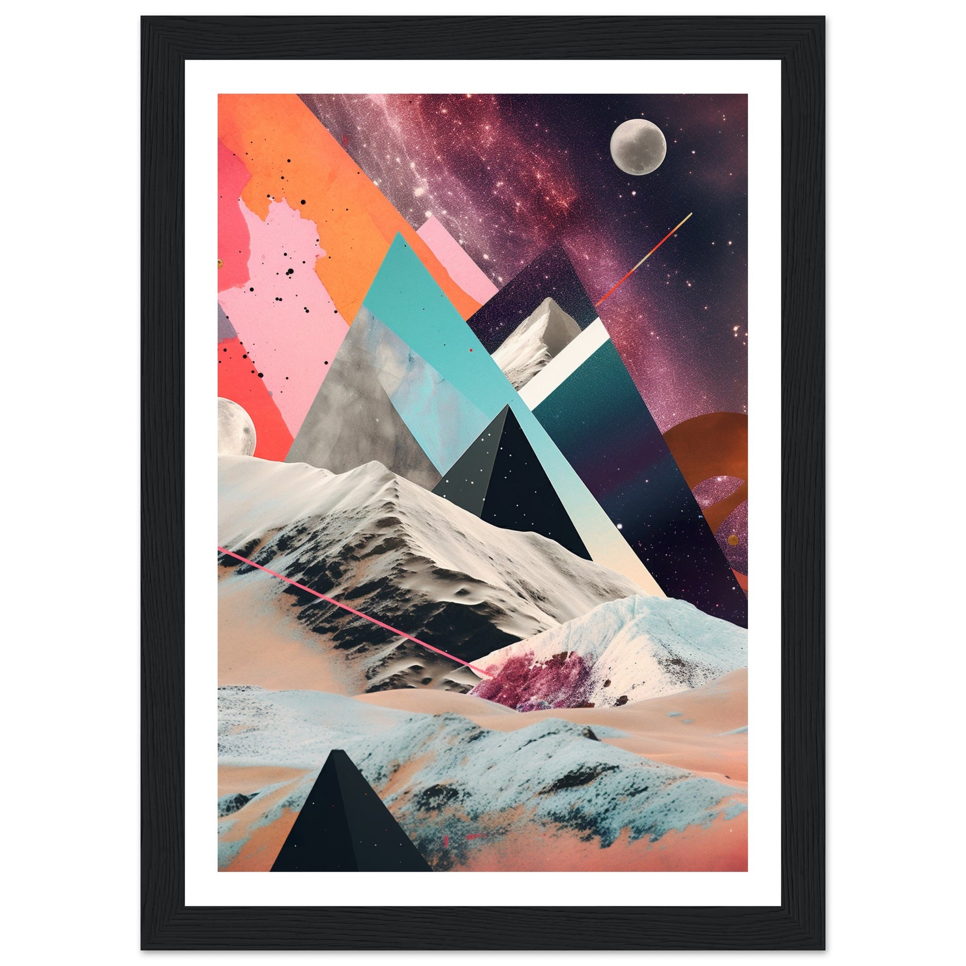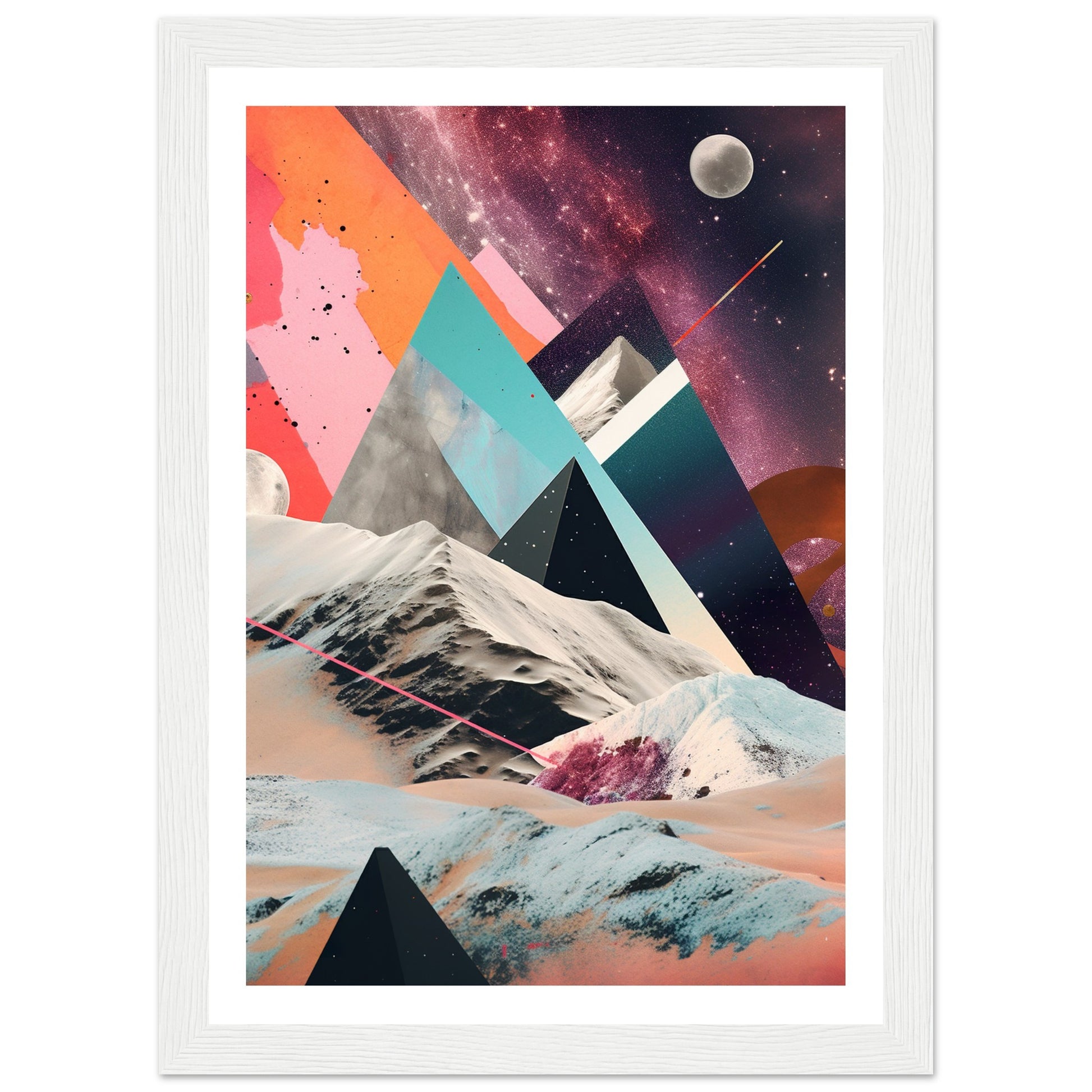 A captivating abstract analogue collage art piece that unveils a captivating rocky moonscape against the backdrop of a purple-hued Milky Way galaxy. Through the intricate layering and arrangement of various materials and elements, the artwork creates a visually mesmerizing composition. The collage captures the rugged beauty of the moonscape, with its rocky formations and lunar terrain, while the ethereal purple hues of the Milky Way galaxy add a sense of otherworldly enchantment.