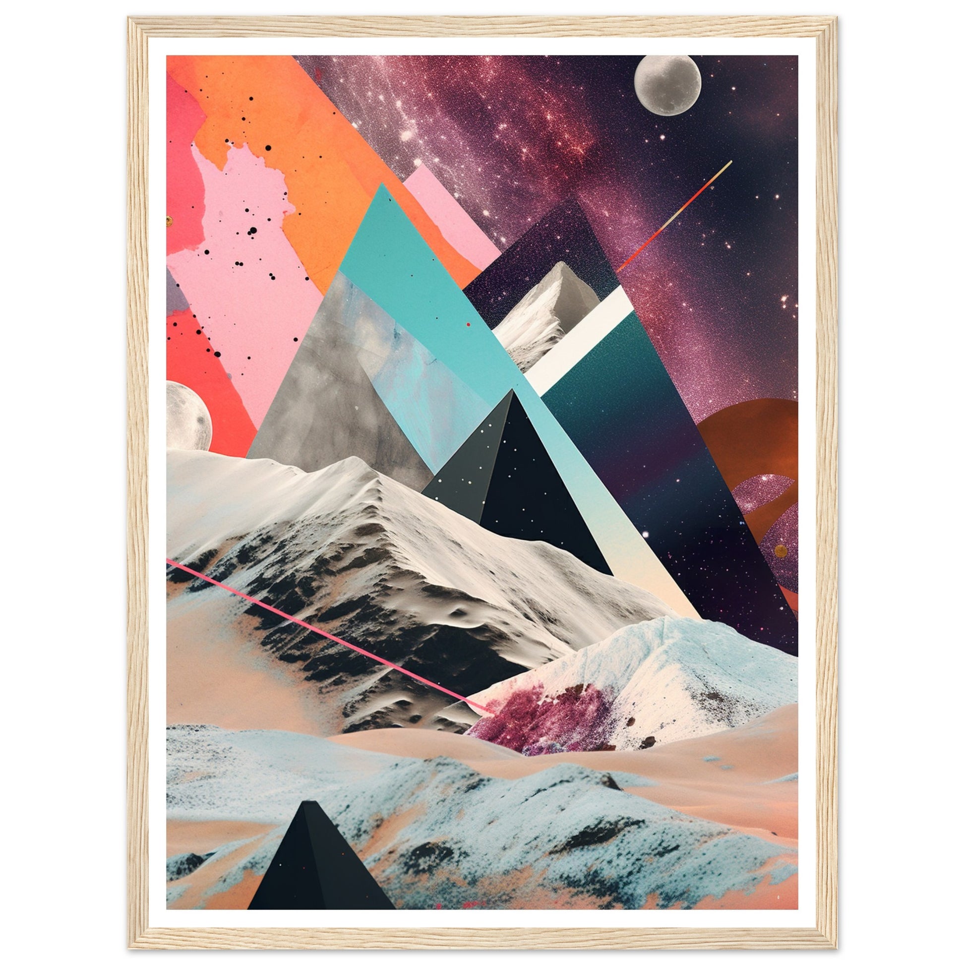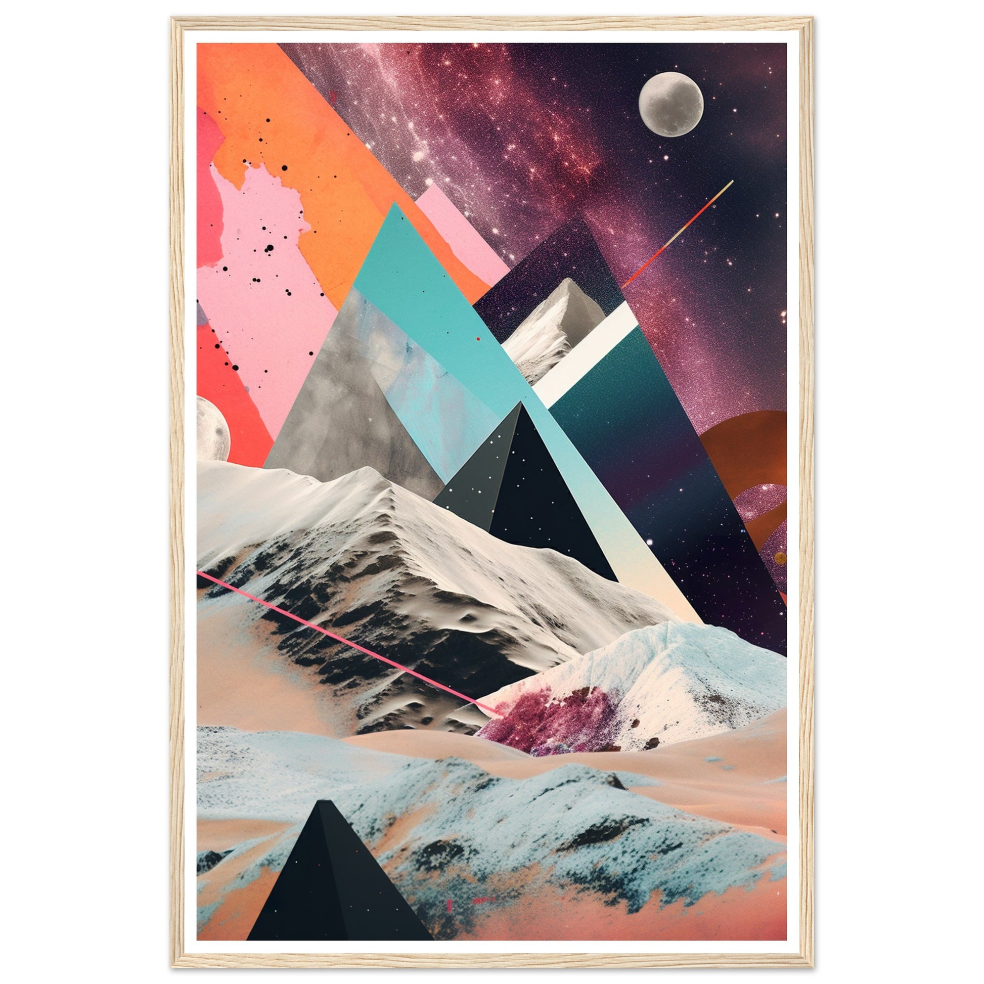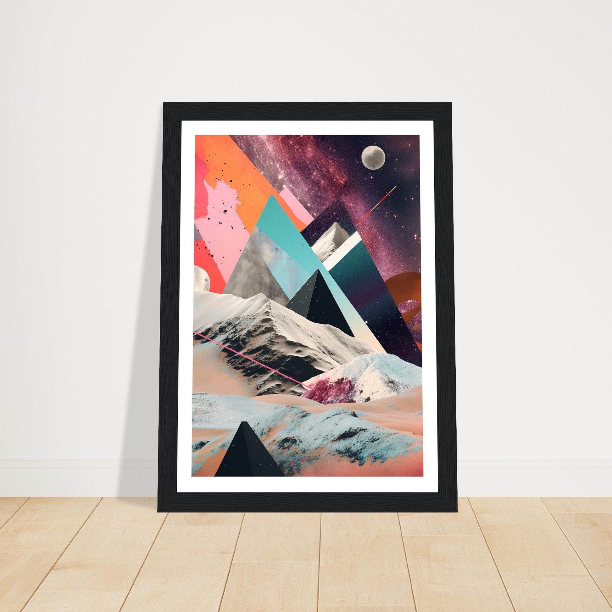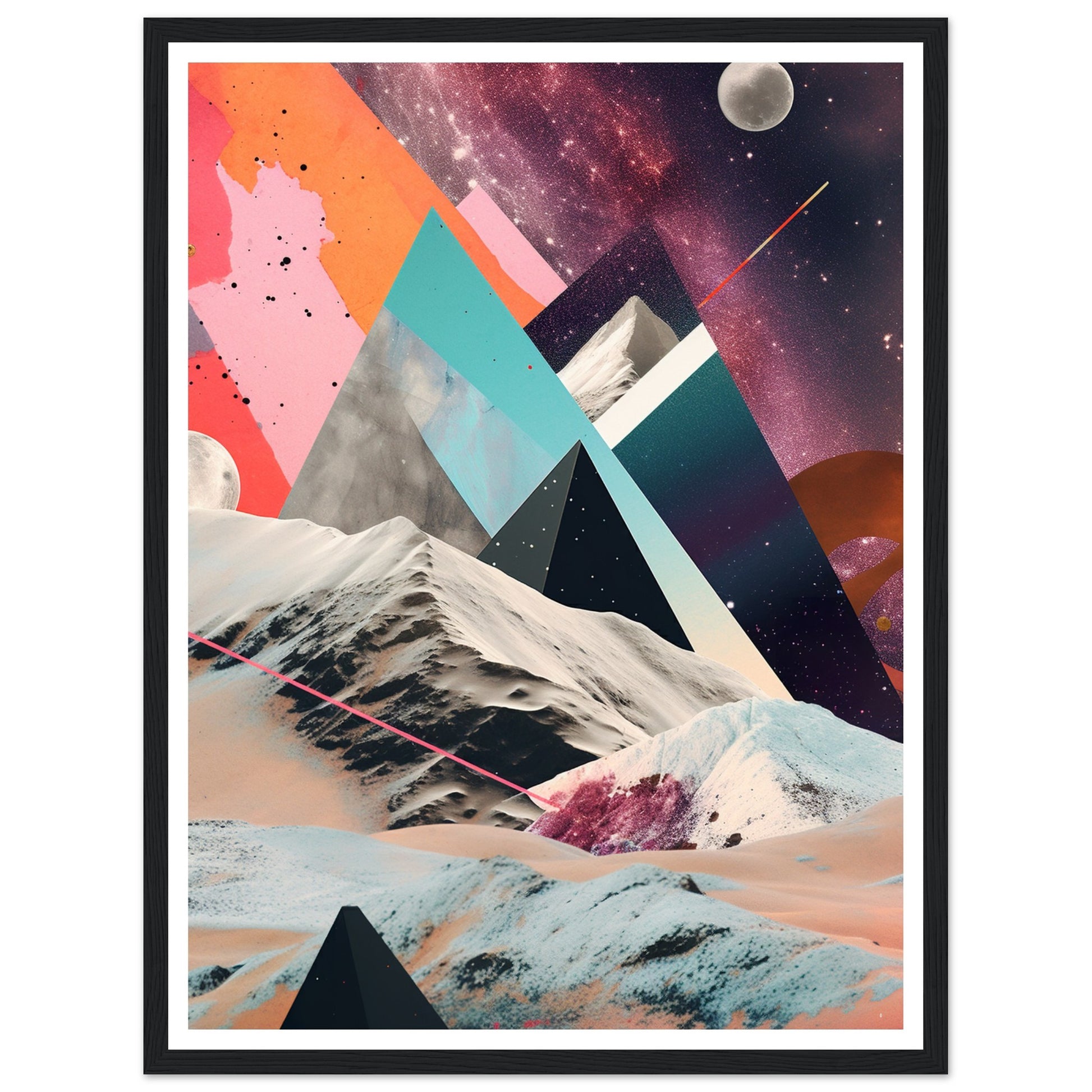 A captivating abstract analogue collage art piece that unveils a captivating rocky moonscape against the backdrop of a purple-hued Milky Way galaxy. Through the intricate layering and arrangement of various materials and elements, the artwork creates a visually mesmerizing composition. The collage captures the rugged beauty of the moonscape, with its rocky formations and lunar terrain, while the ethereal purple hues of the Milky Way galaxy add a sense of otherworldly enchantment.