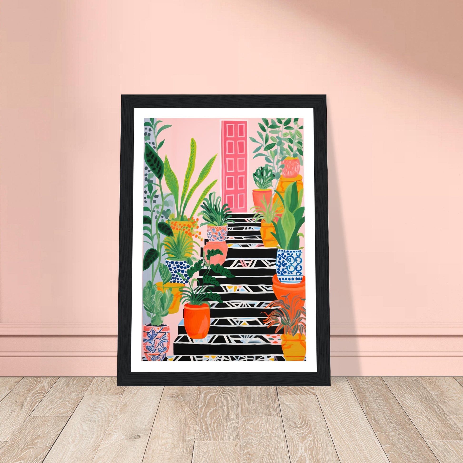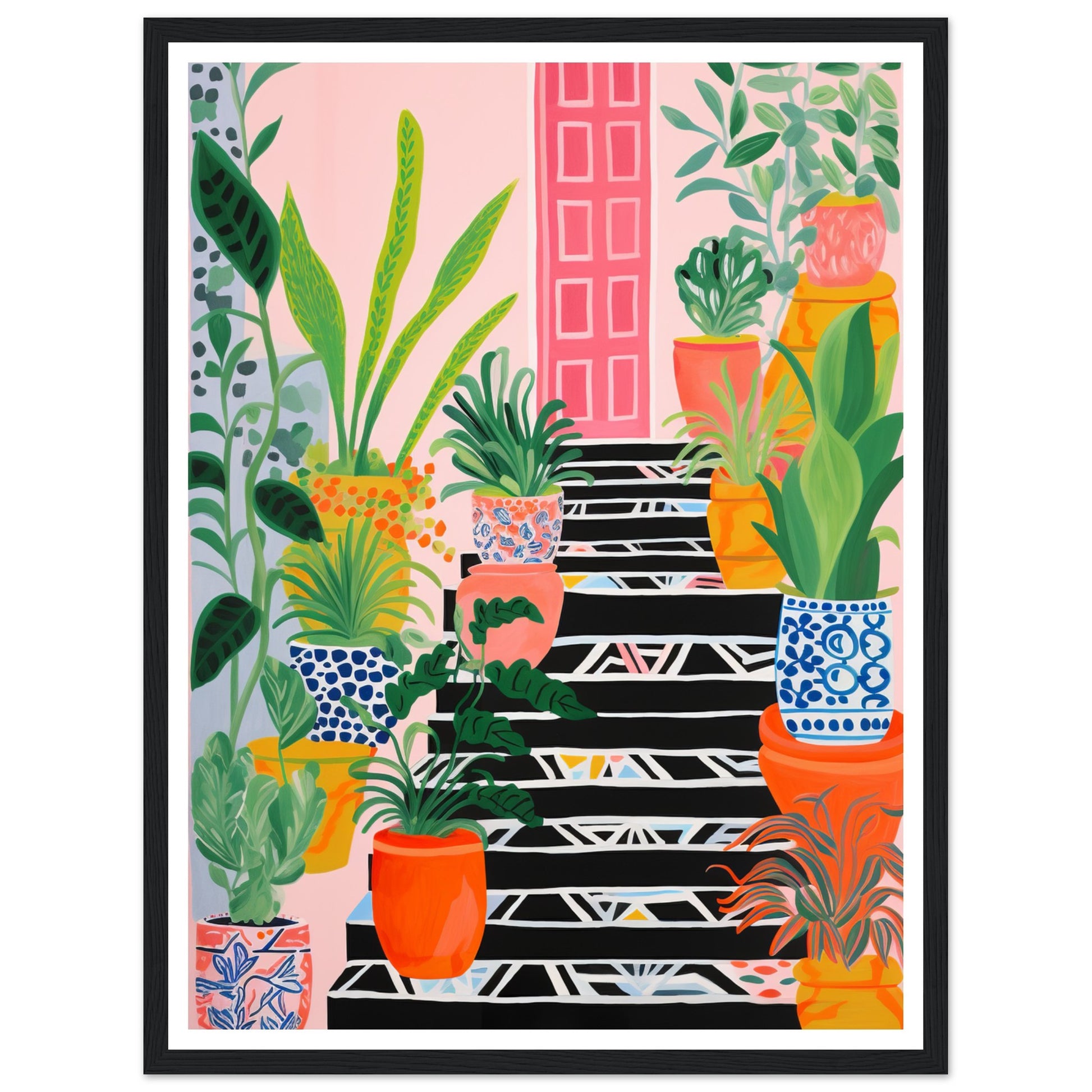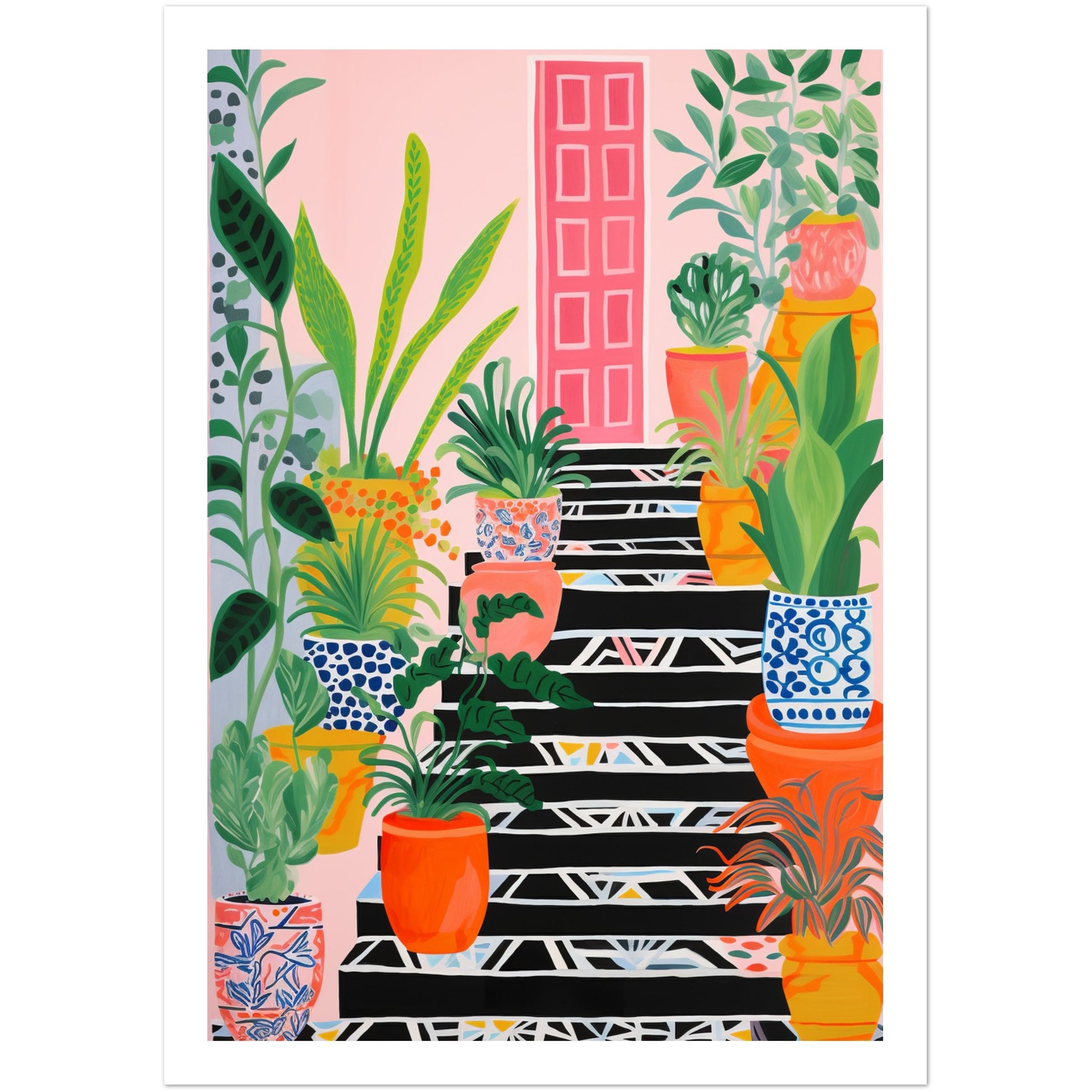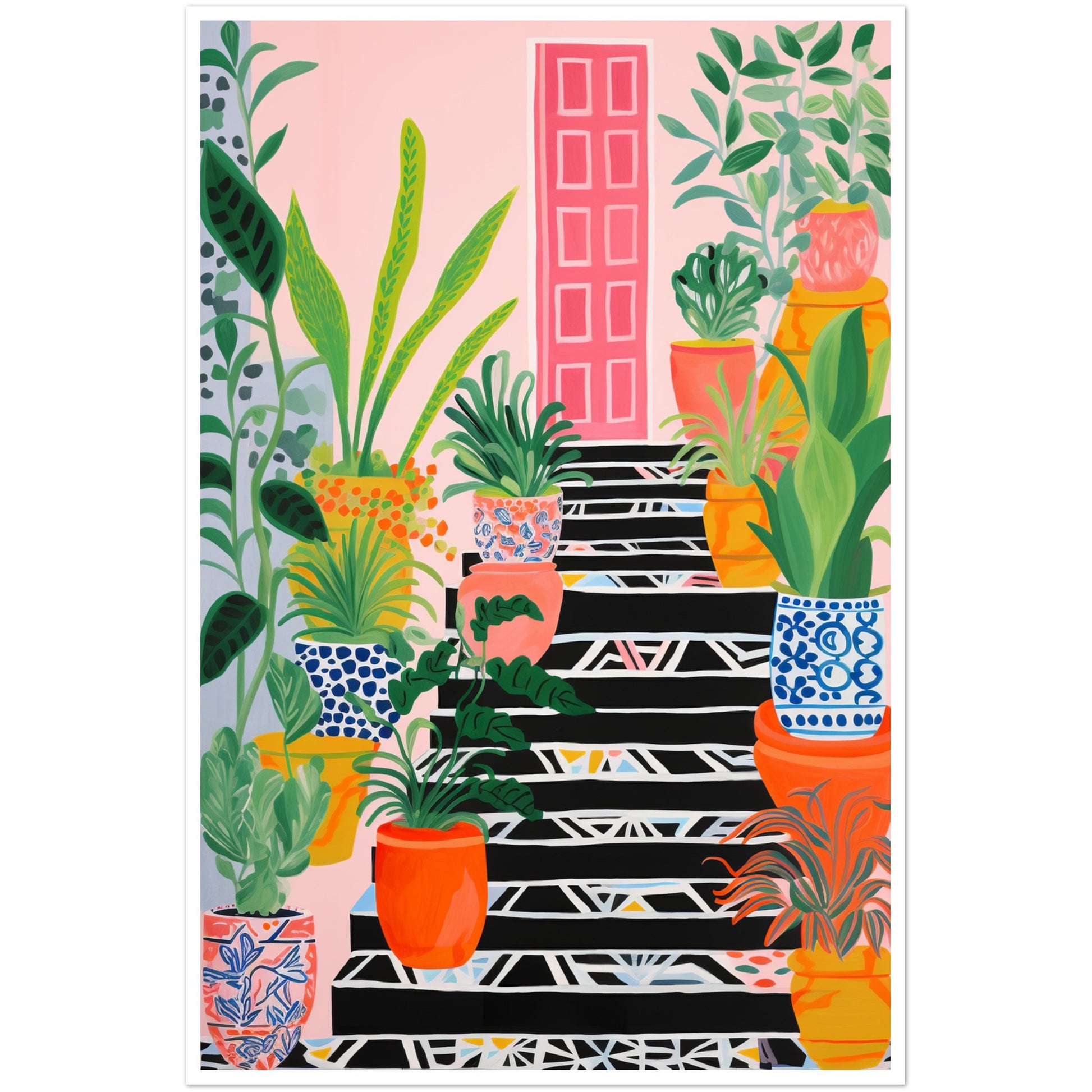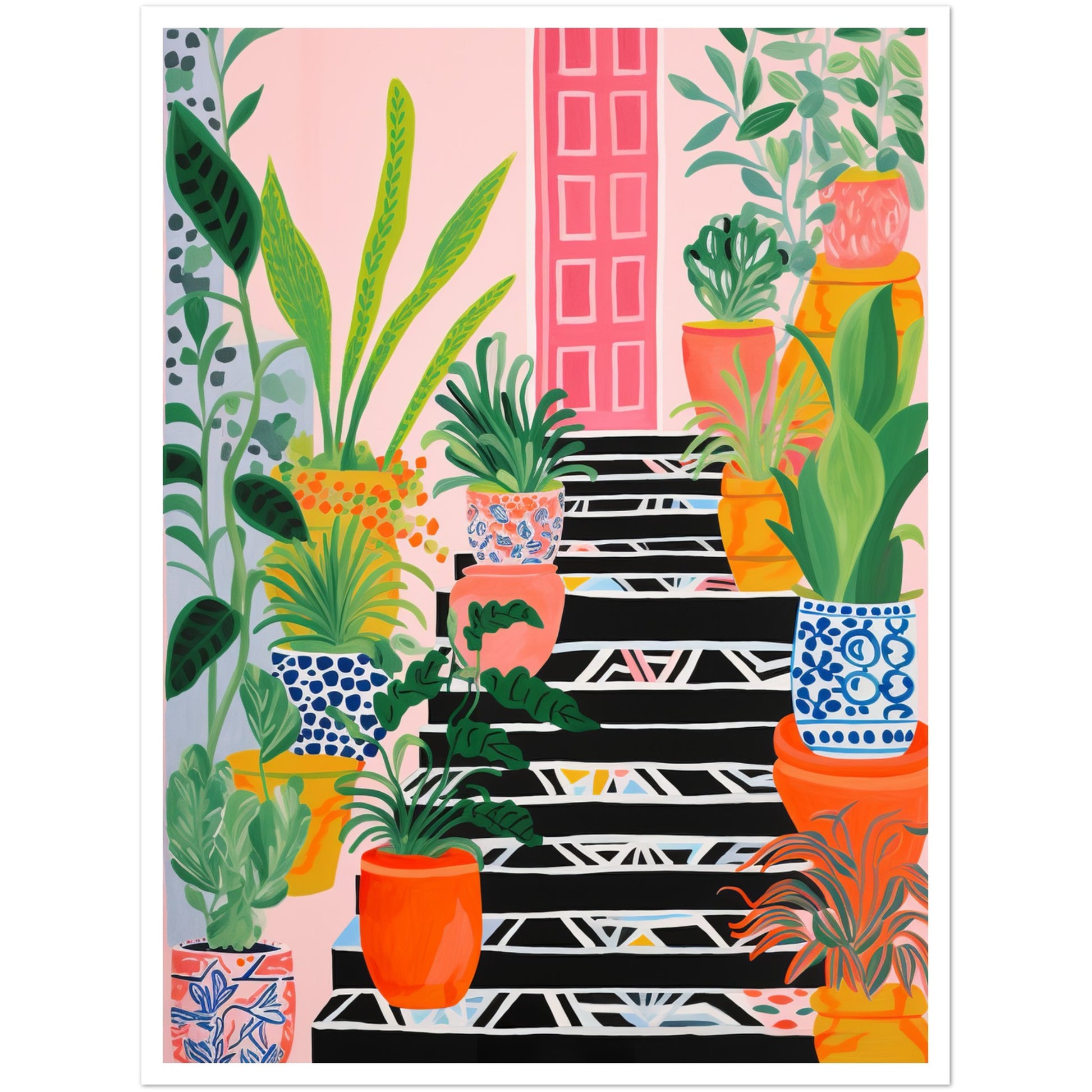 Elevate your space with our "Quirky Potted Plants on Black and White Stairs" art print, a captivating masterpiece that celebrates the fusion of monochrome elegance and whimsical charm. This delightful artwork features vibrant potted plants set against a backdrop of black and white stairs, adorned with simple, colorful, and quirky watercolor-inspired illustrations in soft pastel tones.