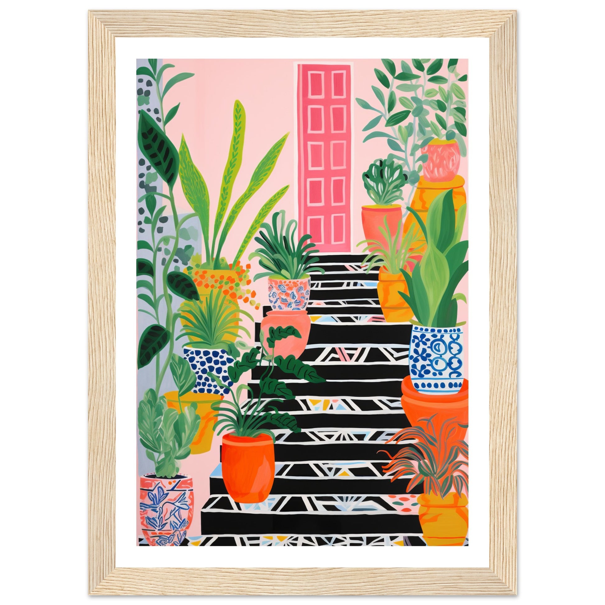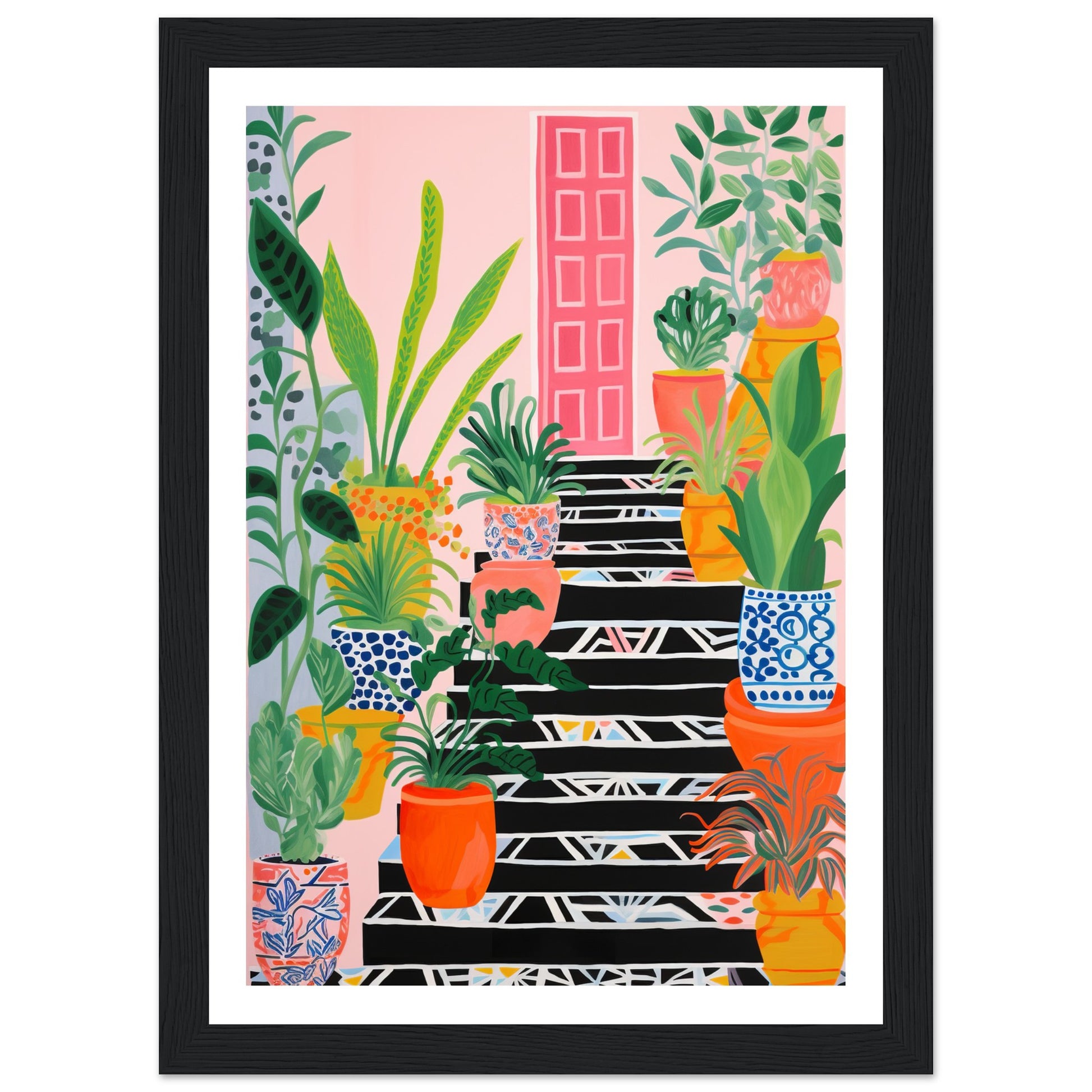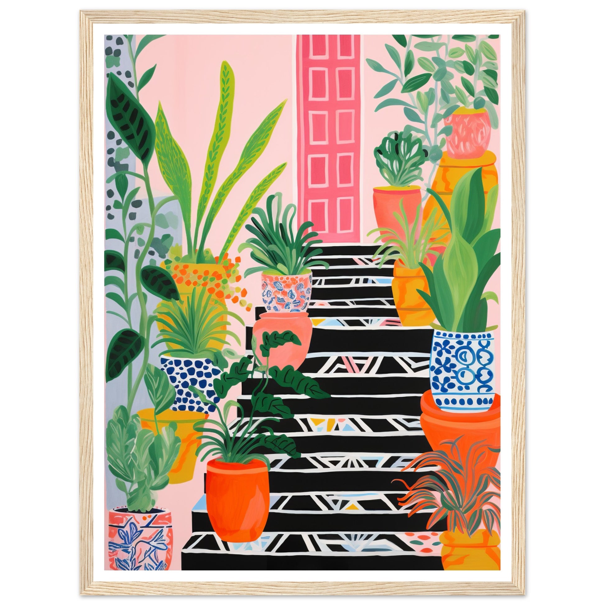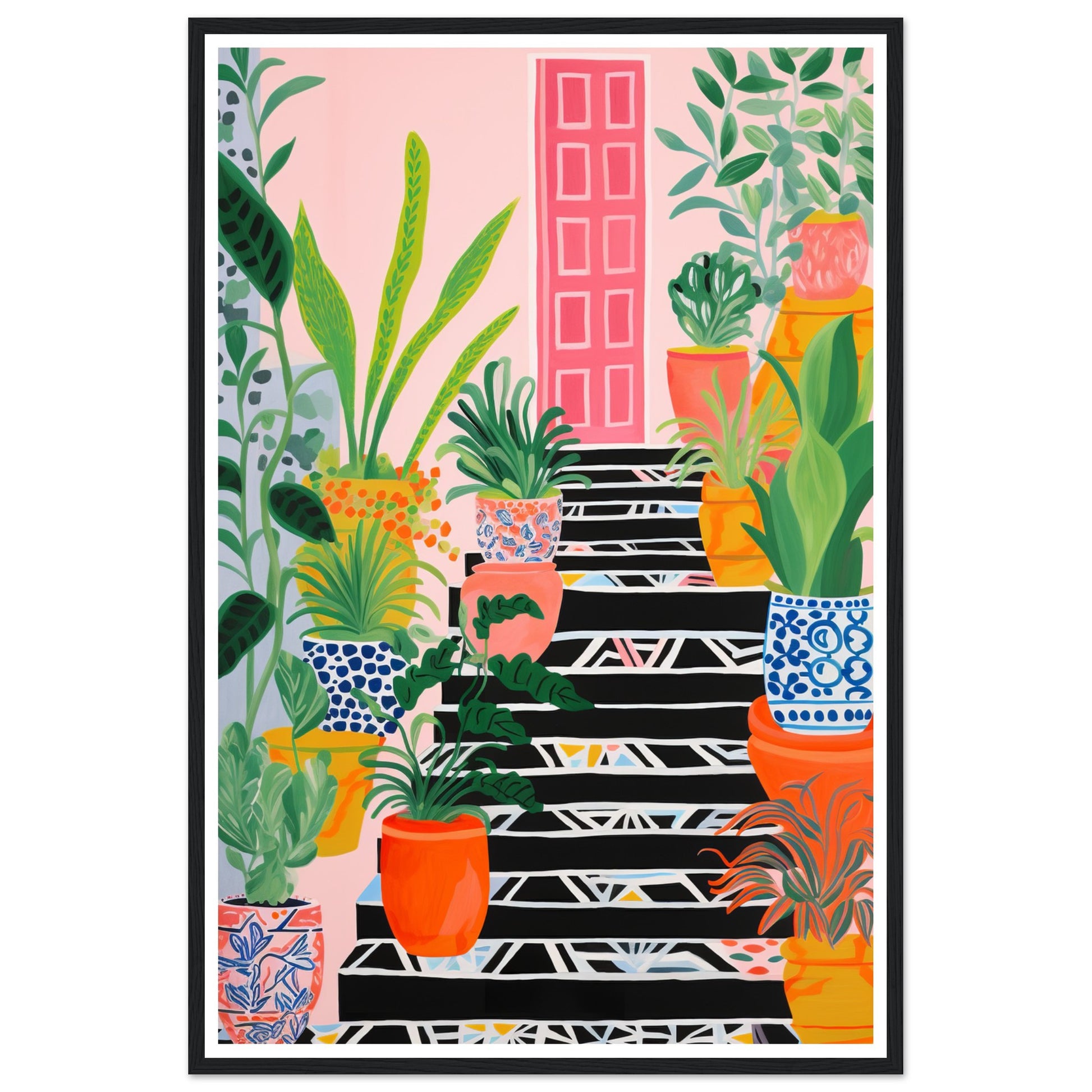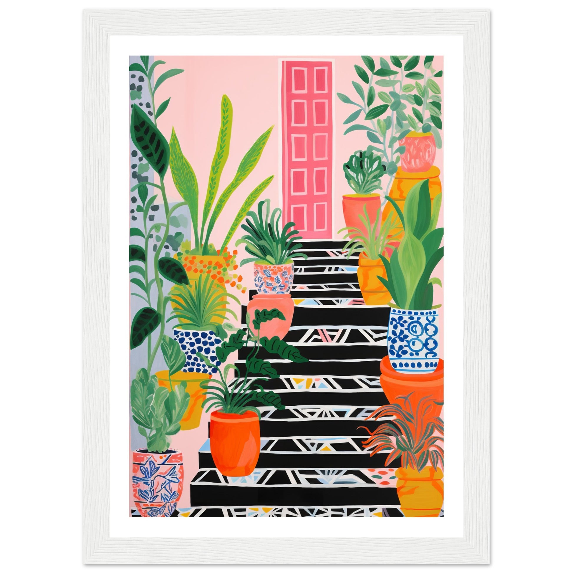 Elevate your space with our "Quirky Potted Plants on Black and White Stairs" art print, a captivating masterpiece that celebrates the fusion of monochrome elegance and whimsical charm. This delightful artwork features vibrant potted plants set against a backdrop of black and white stairs, adorned with simple, colorful, and quirky watercolor-inspired illustrations in soft pastel tones.