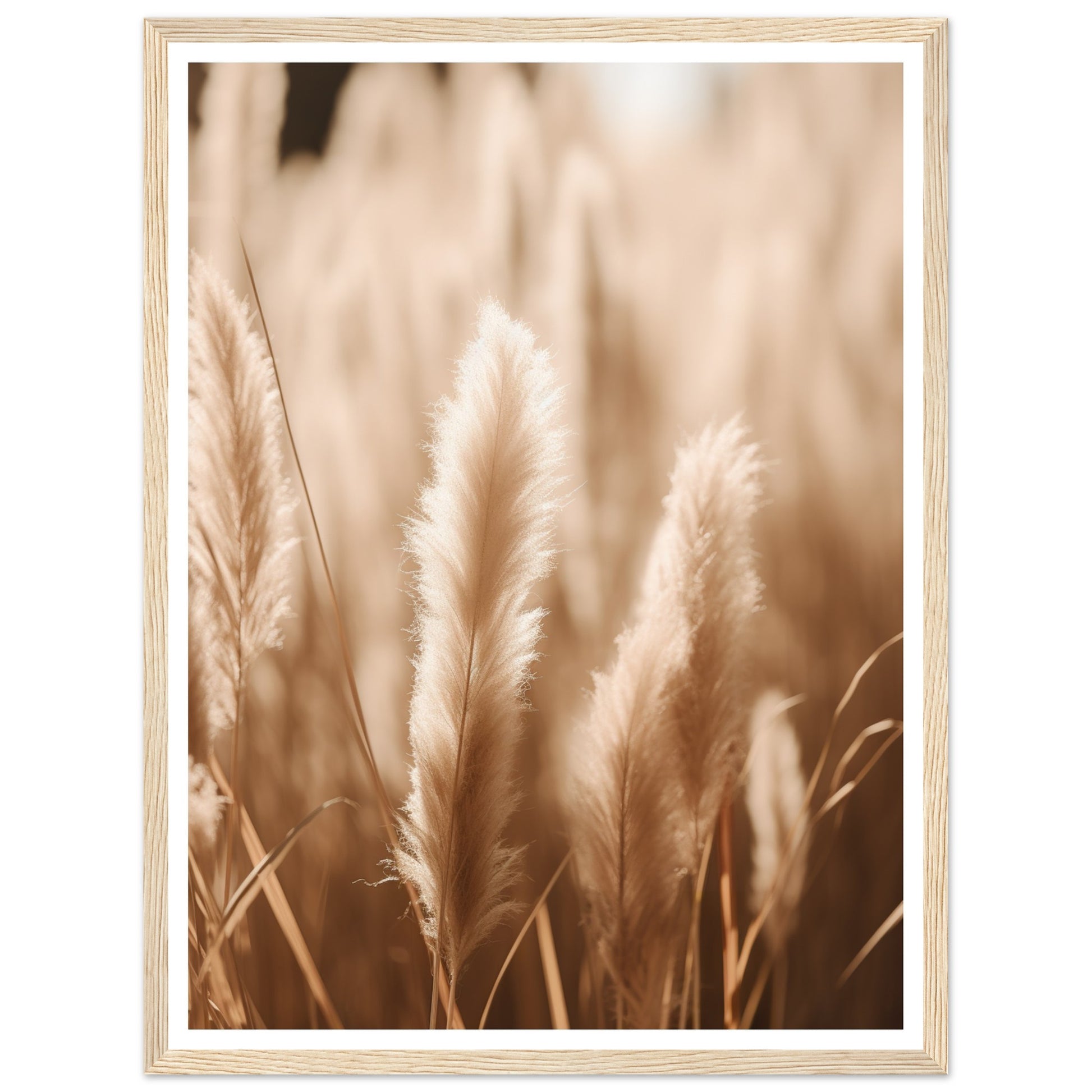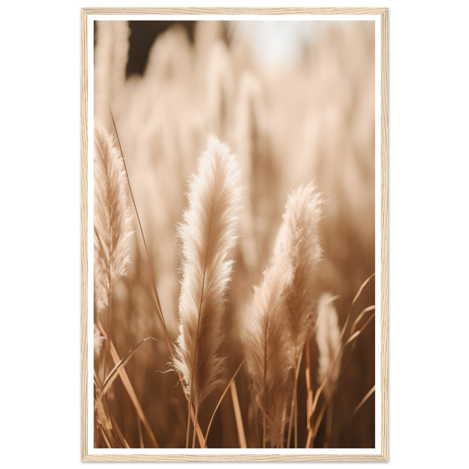 A calming photograph that invites you into a world of serene natural beauty. The close-up view of natural pampas grass, combined with the hazy feel, creates an ethereal atmosphere. The beige color scheme and soft natural colors add a touch of warmth and tranquility. This artwork captures the essence of nature's delicate whispers, allowing you to bring the serenity and softness of the natural world into your space.
