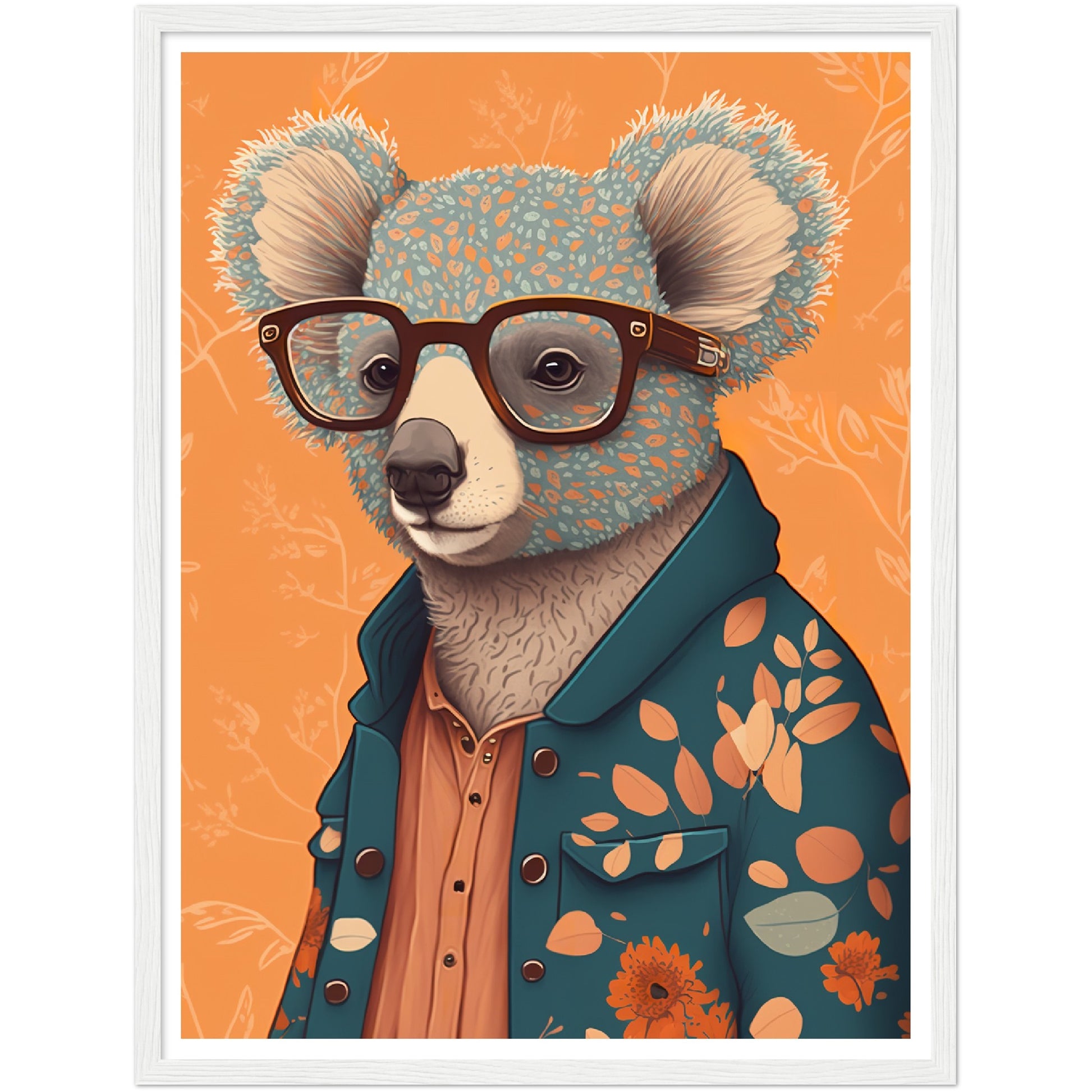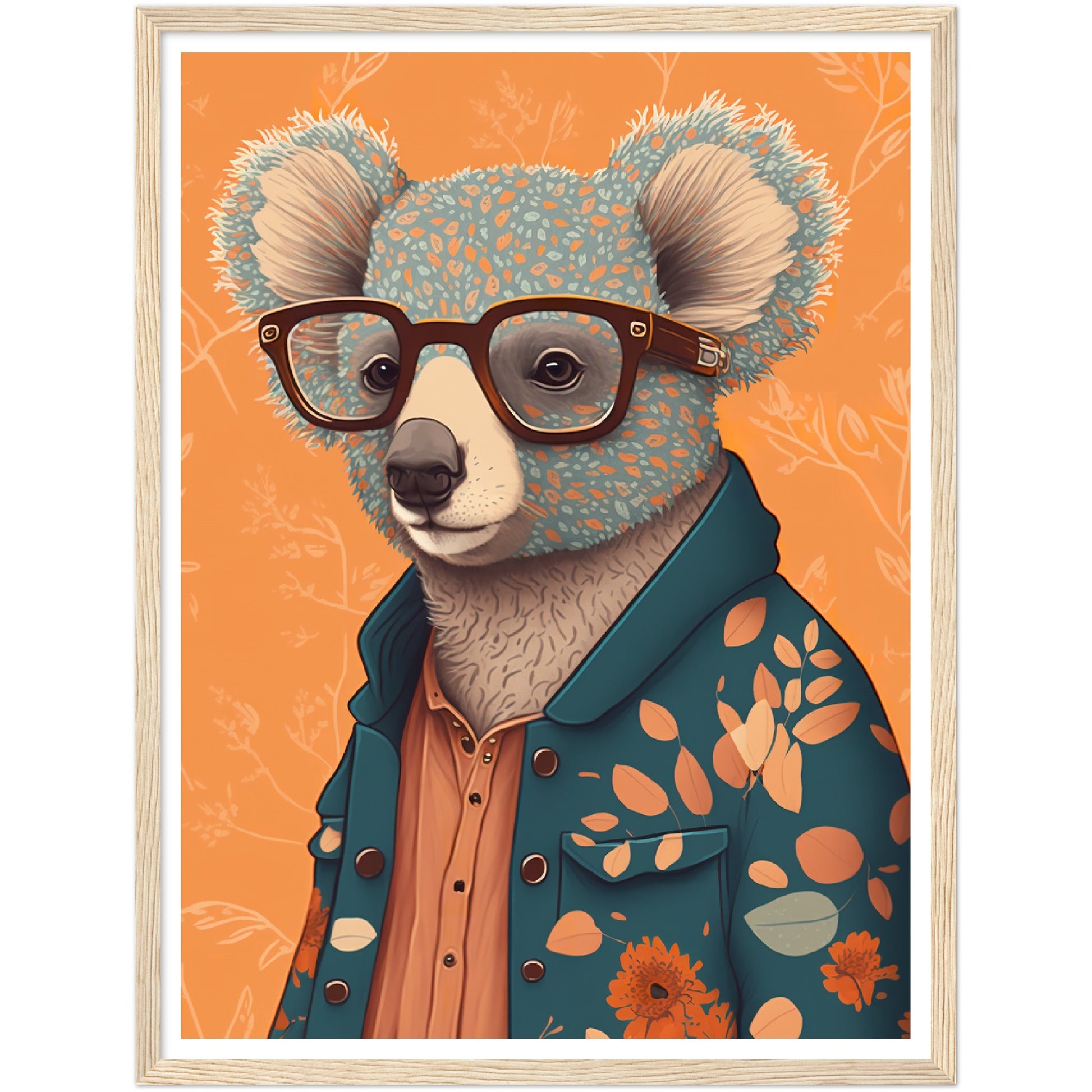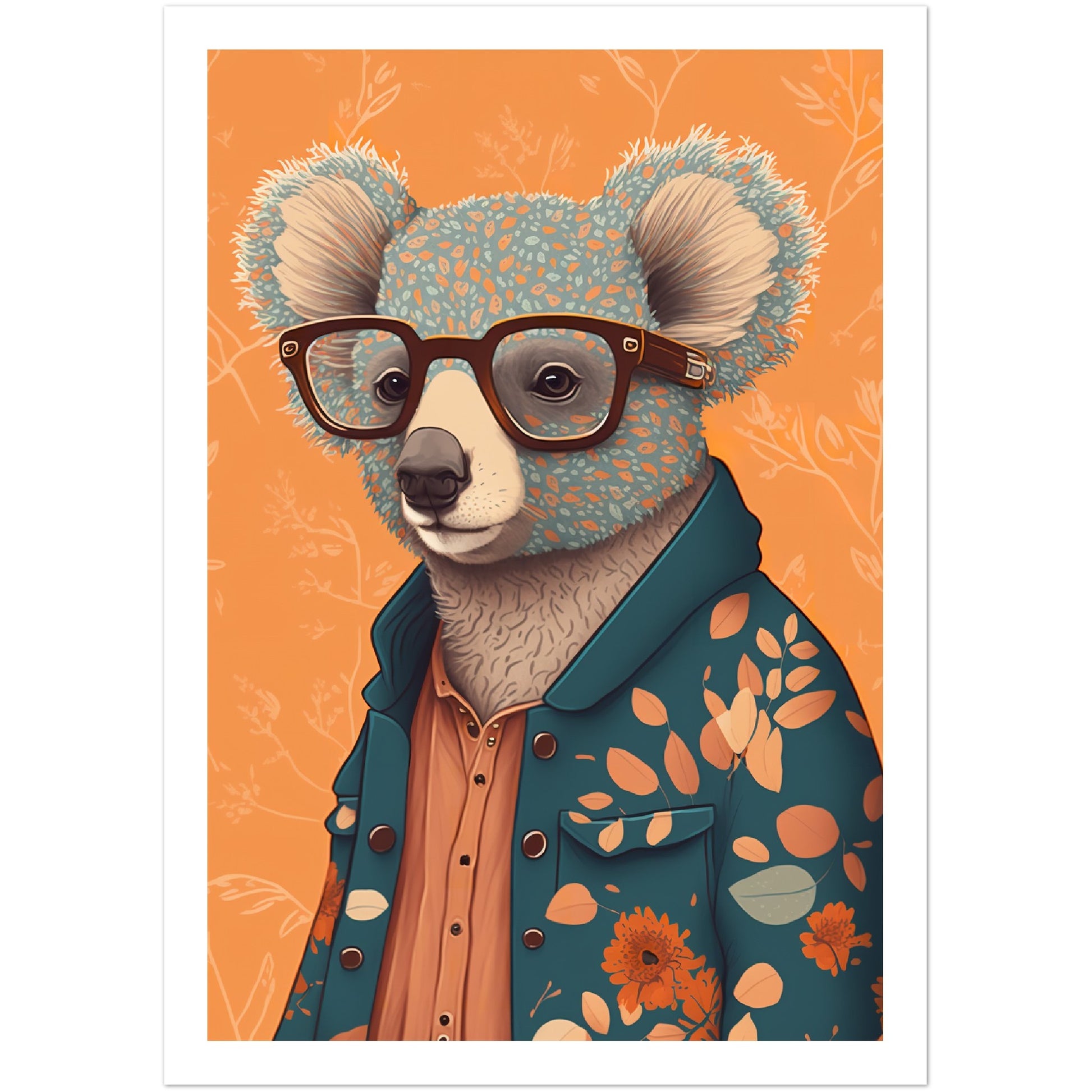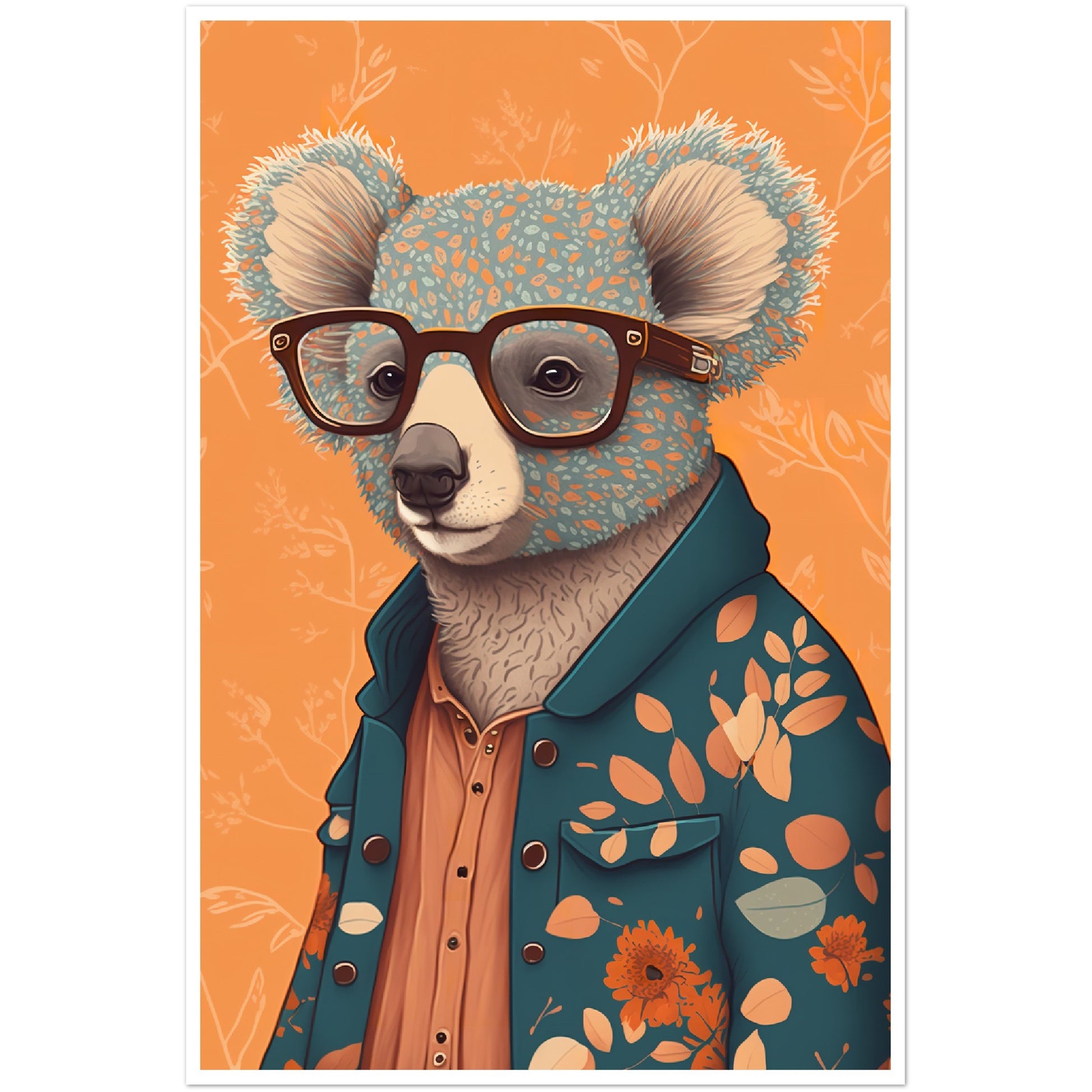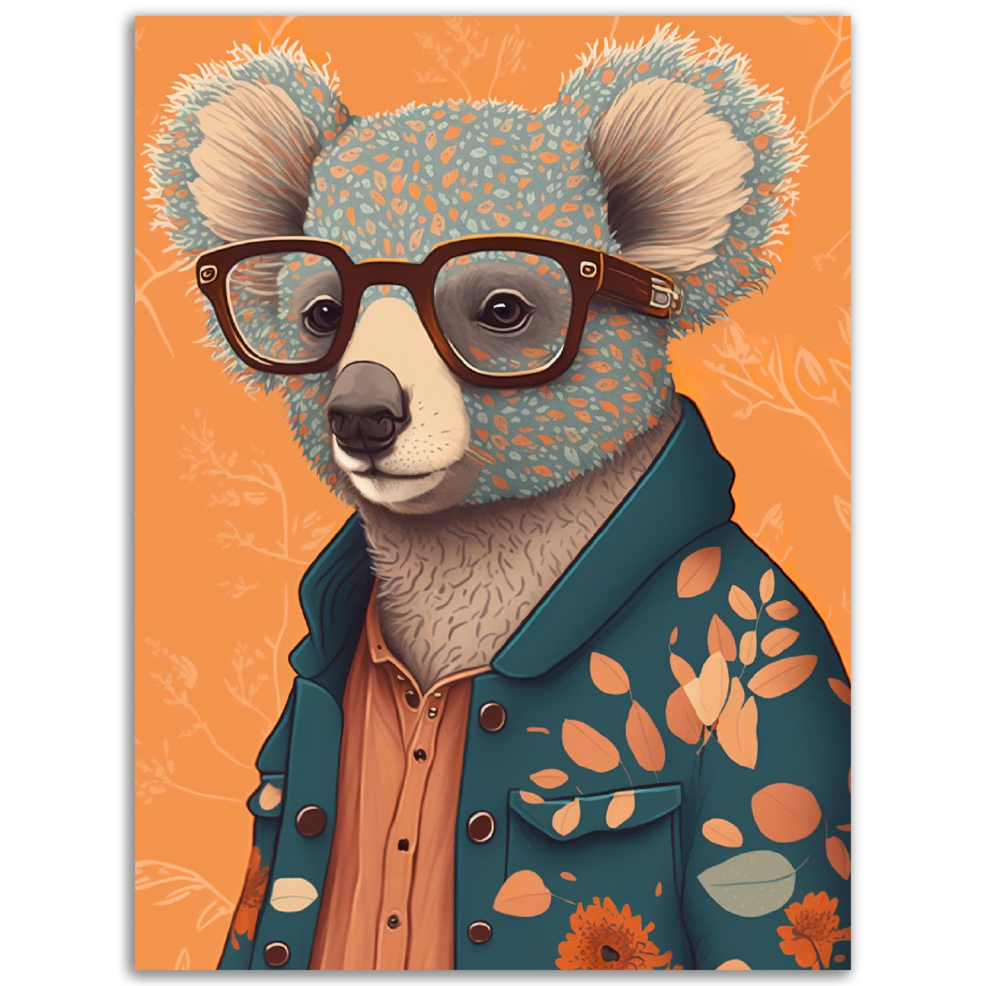 This art illustration features a charming koala donning a floral patterned jacket and quirky fashionable glasses. Against a vibrant orange background, the koala stands out as a unique and stylish character. The intricate details of the floral pattern and the koala's glasses add depth and interest to the piece. This artwork is perfect for anyone who loves animals, fashion, and whimsical design.