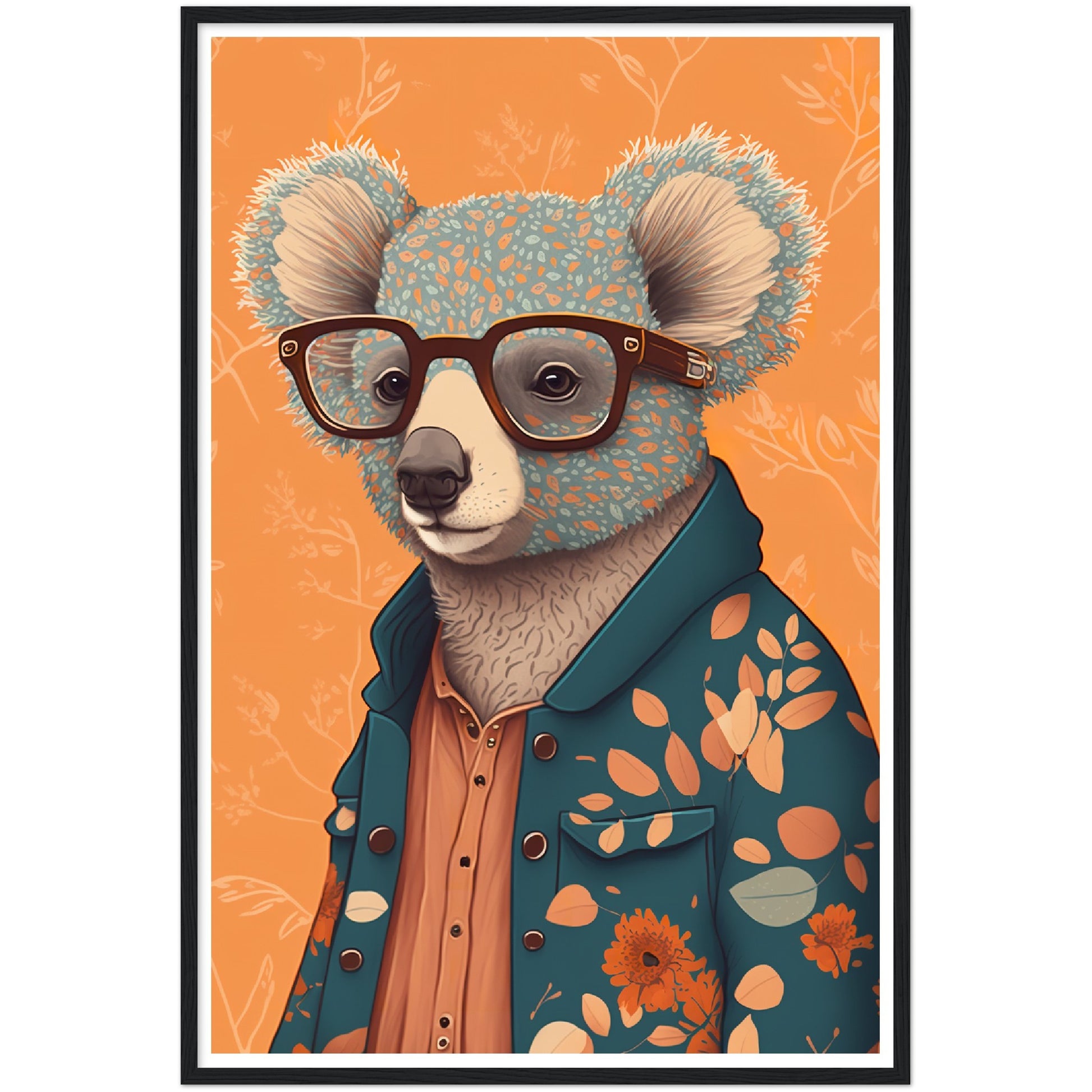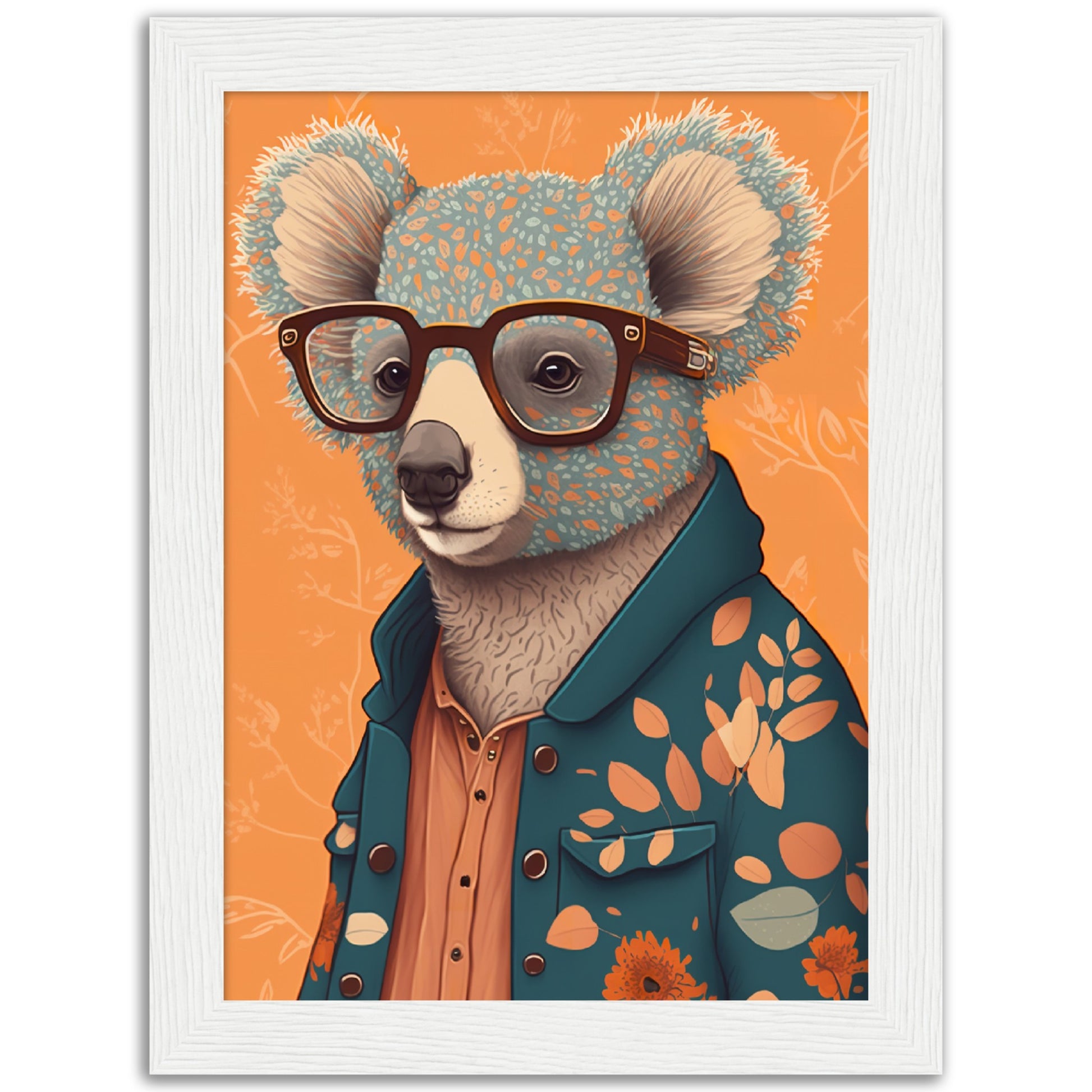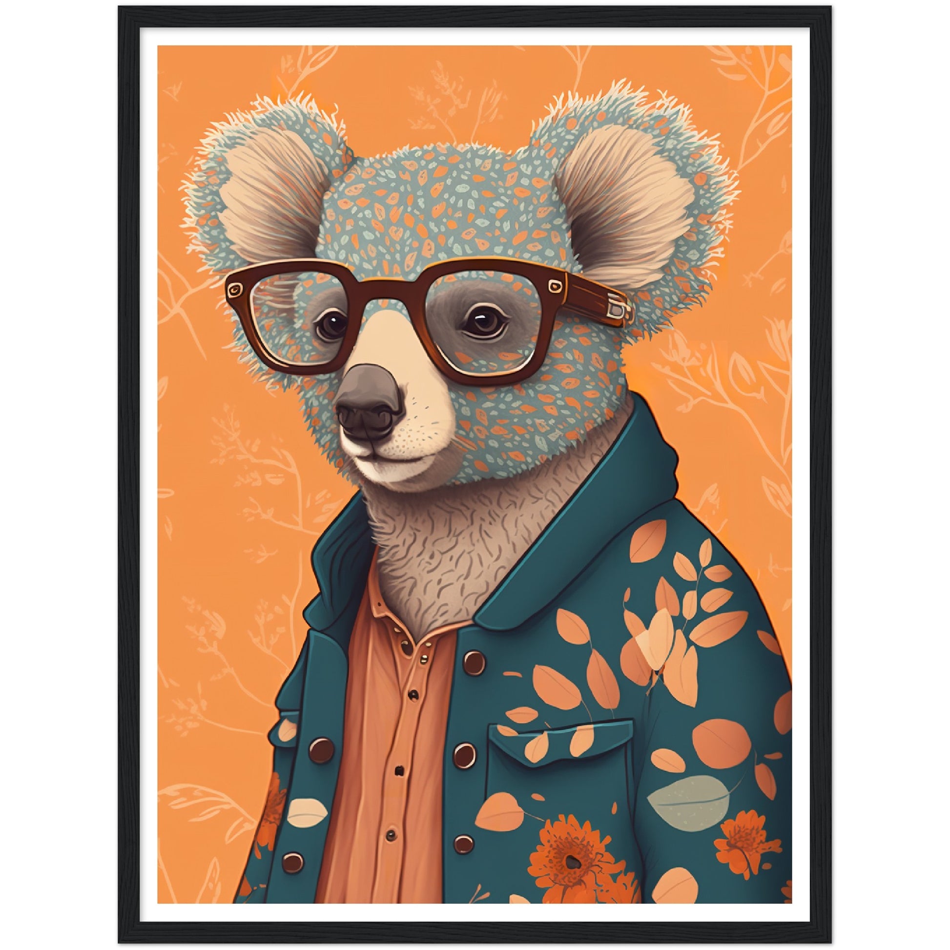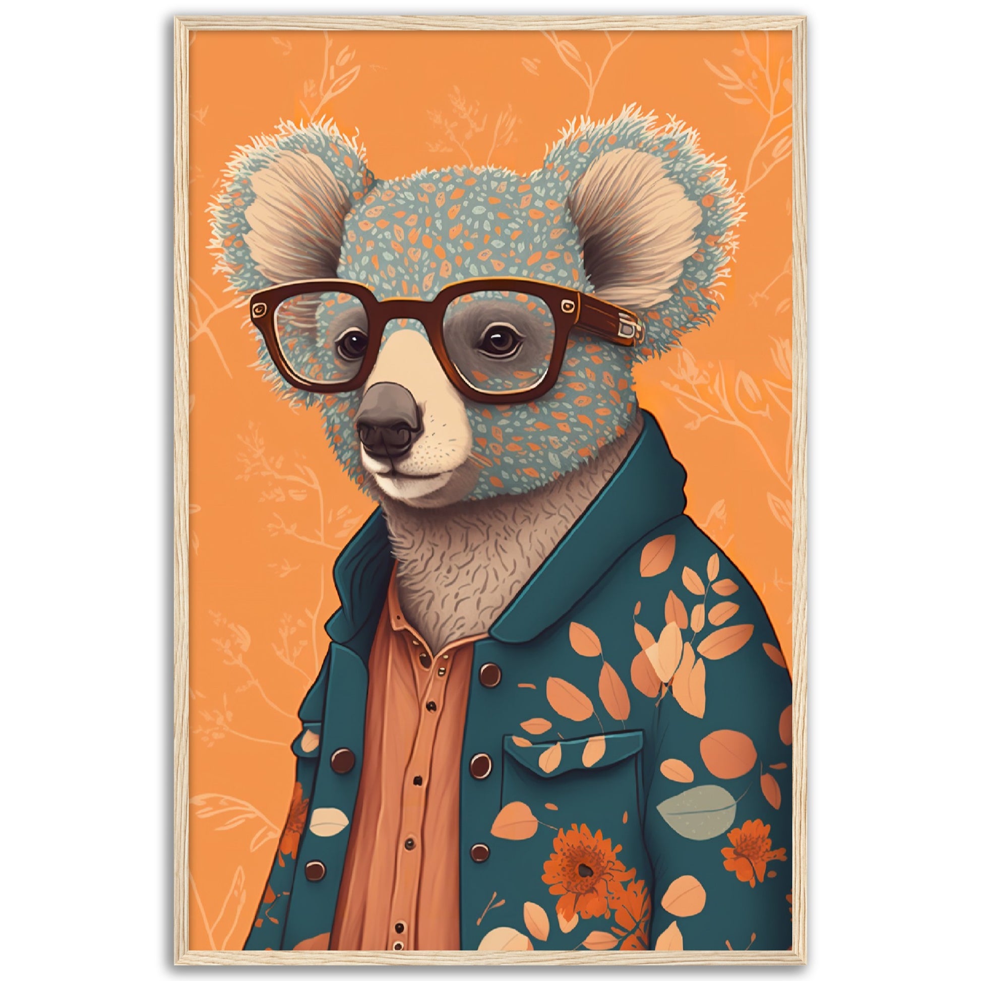 This art illustration features a charming koala donning a floral patterned jacket and quirky fashionable glasses. Against a vibrant orange background, the koala stands out as a unique and stylish character. The intricate details of the floral pattern and the koala's glasses add depth and interest to the piece. This artwork is perfect for anyone who loves animals, fashion, and whimsical design.