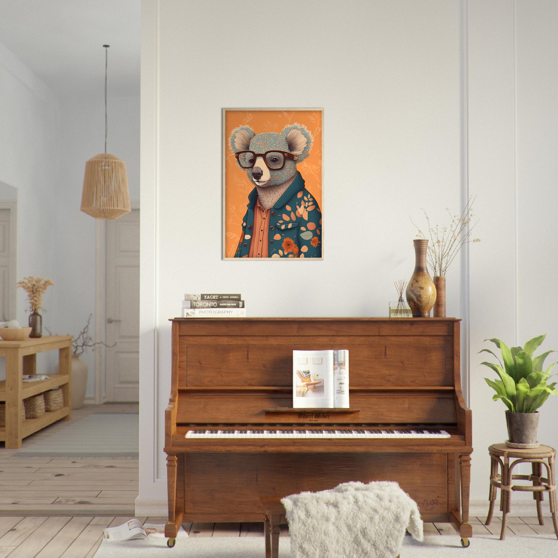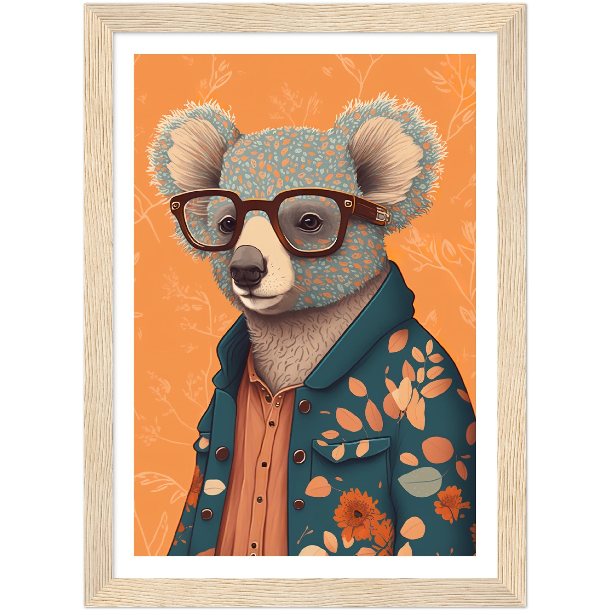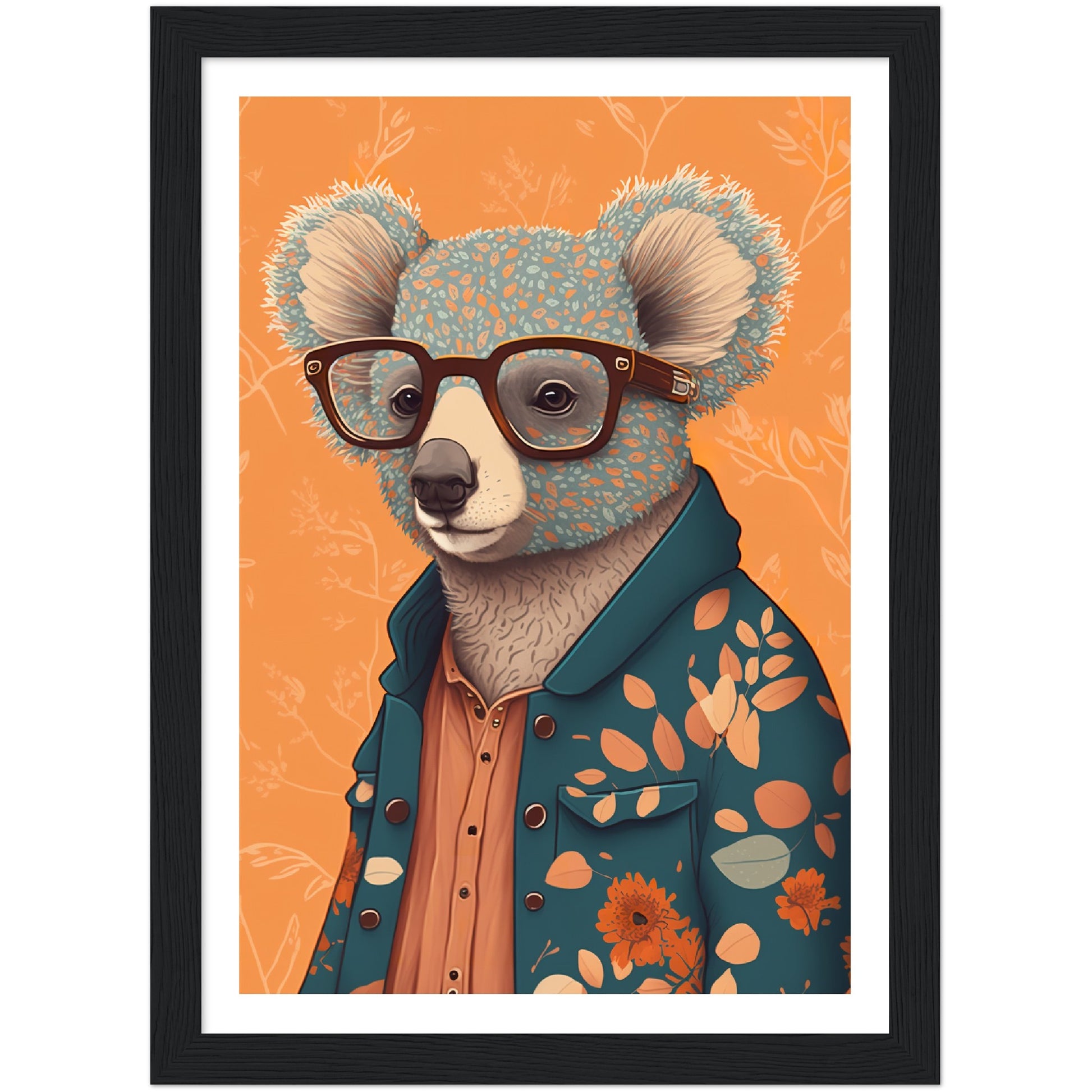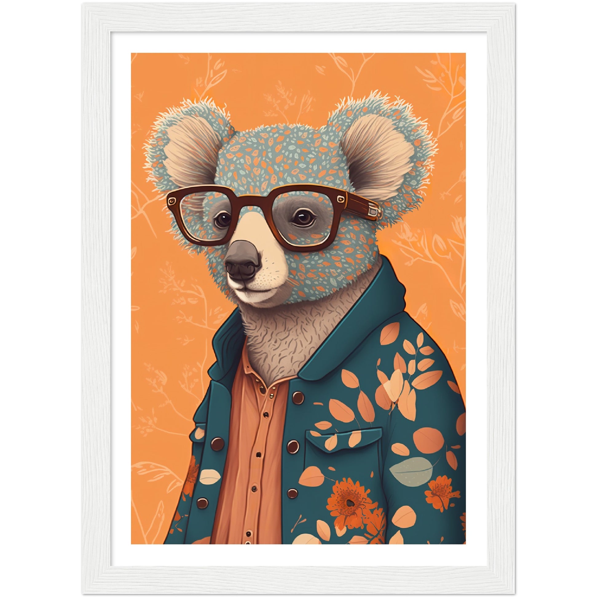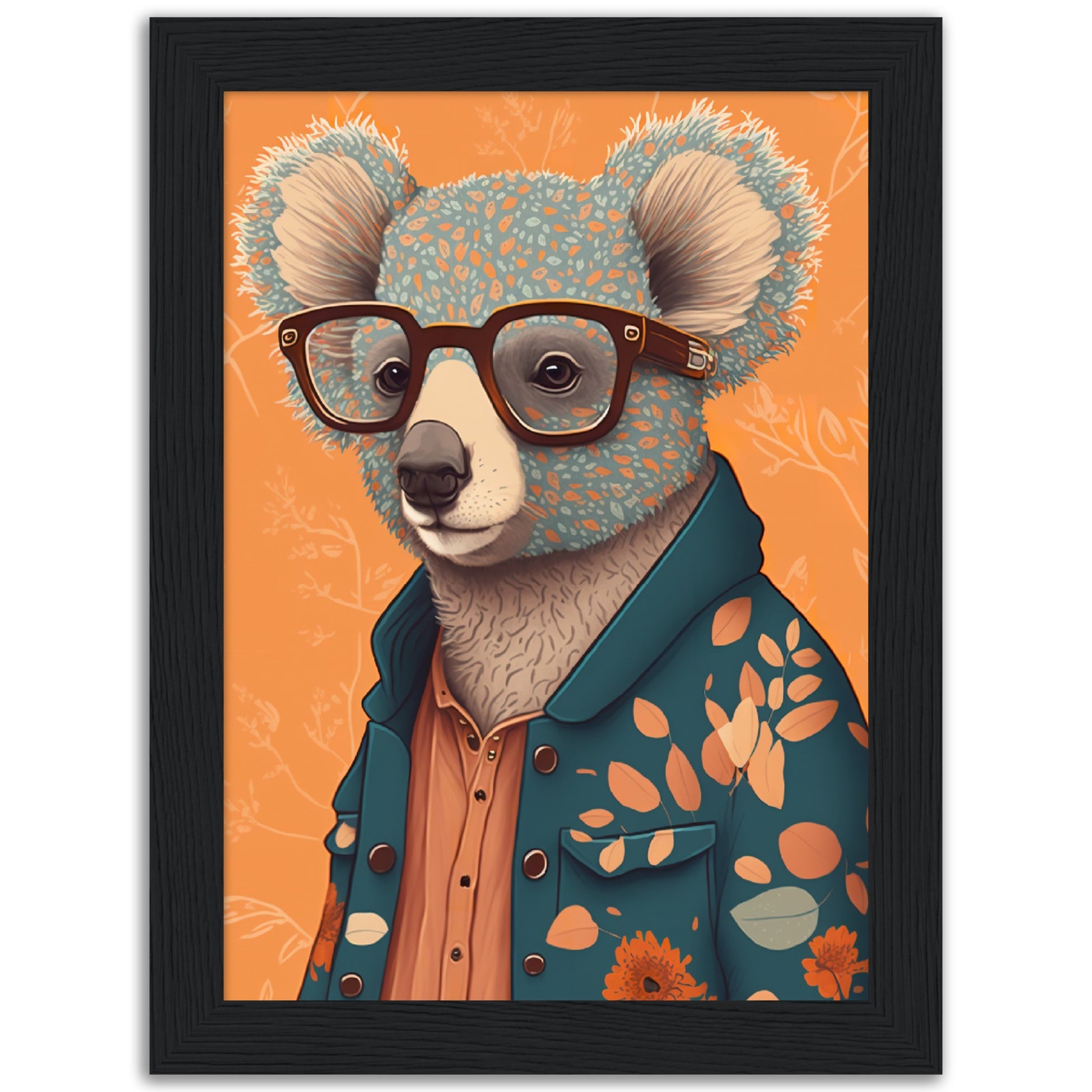 This art illustration features a charming koala donning a floral patterned jacket and quirky fashionable glasses. Against a vibrant orange background, the koala stands out as a unique and stylish character. The intricate details of the floral pattern and the koala's glasses add depth and interest to the piece. This artwork is perfect for anyone who loves animals, fashion, and whimsical design.