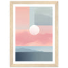 This stunning artwork features a square composition with abstract blocks of pastel tones, creating a mesmerizing depiction of a tranquil blue lagoon under a pink sunlit sky.