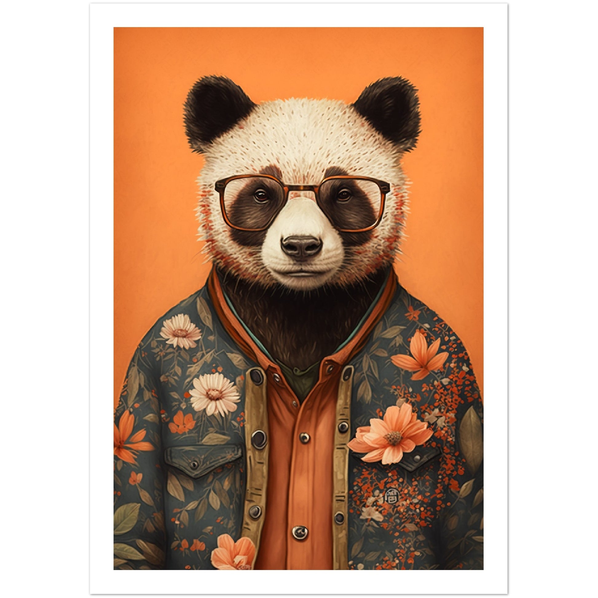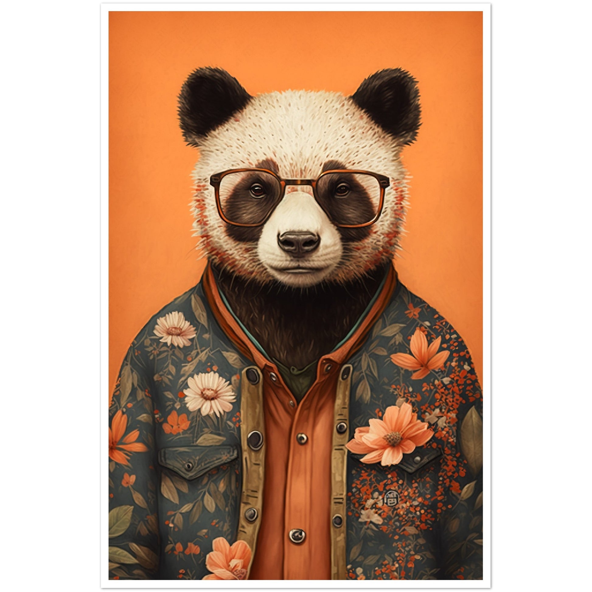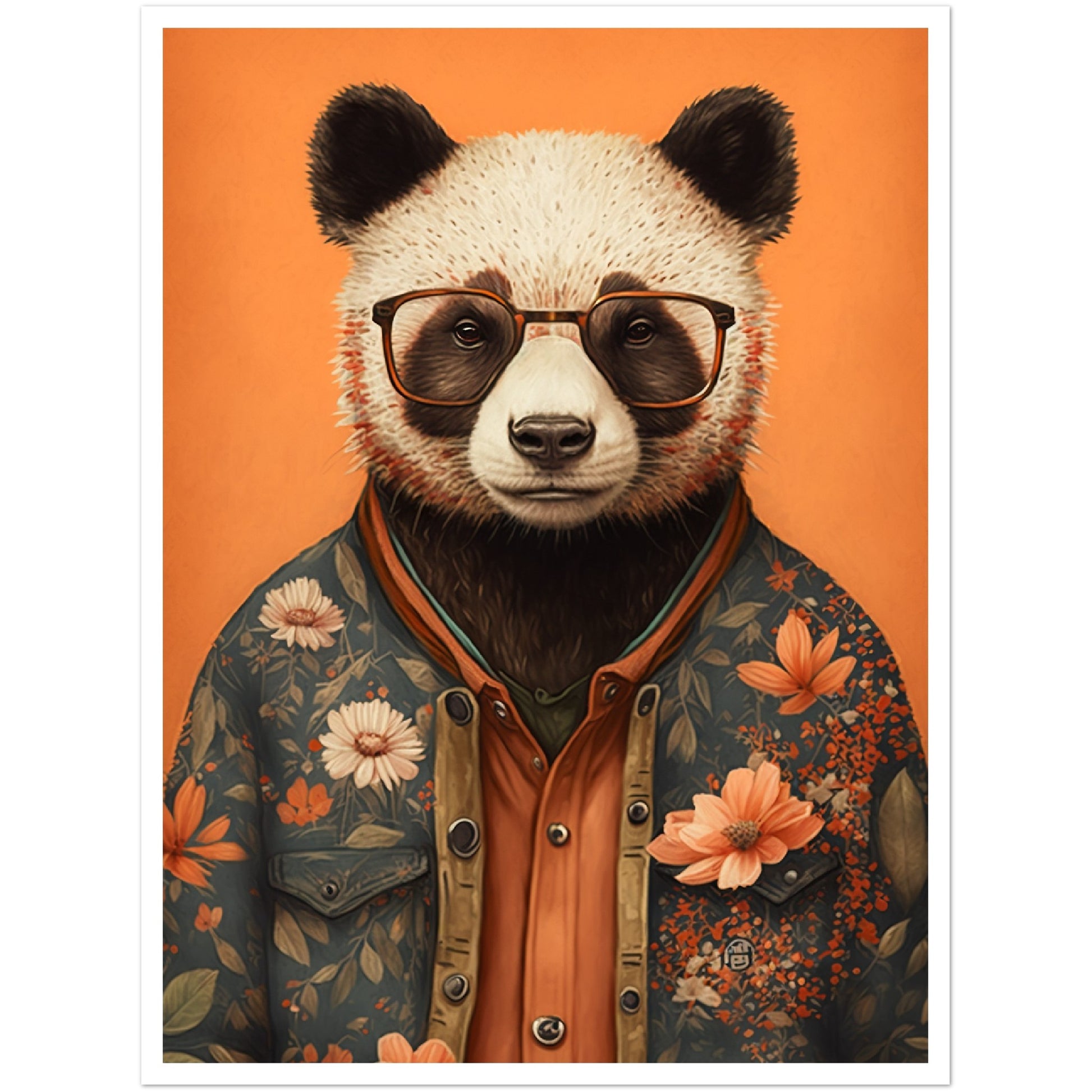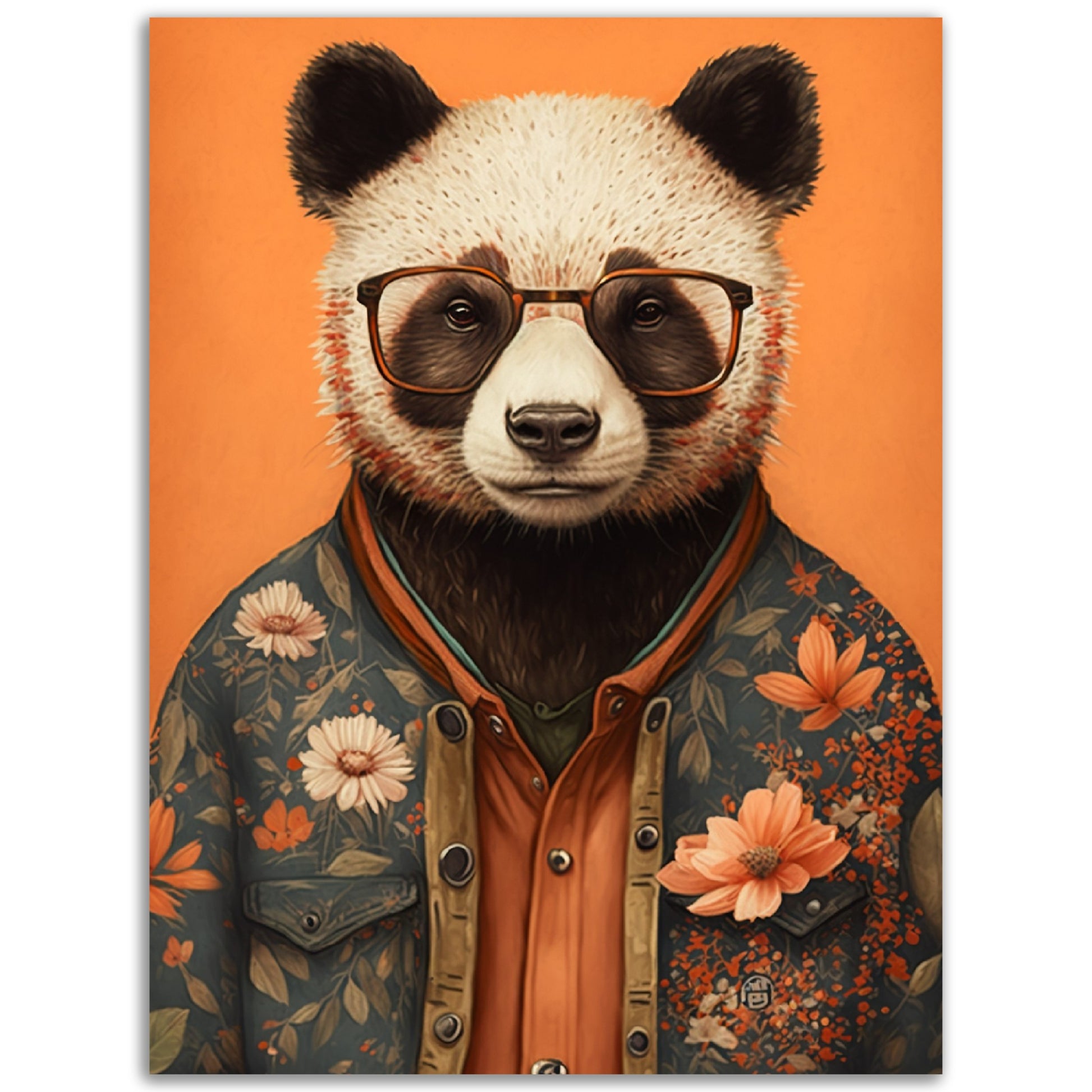 The illustration features a charming panda wearing a stylish floral patterned jacket and quirky fashionable glasses. The panda stands out against a plain orange background, adding a pop of color to any room. The intricate details of the jacket make this piece a unique and eye-catching addition to any home or office.