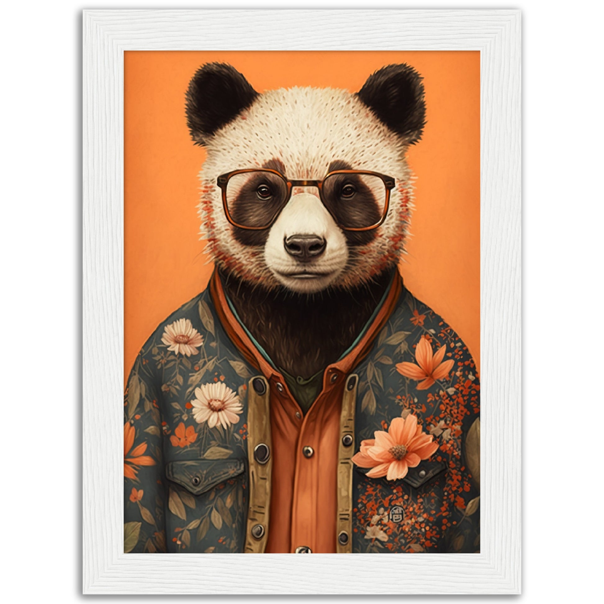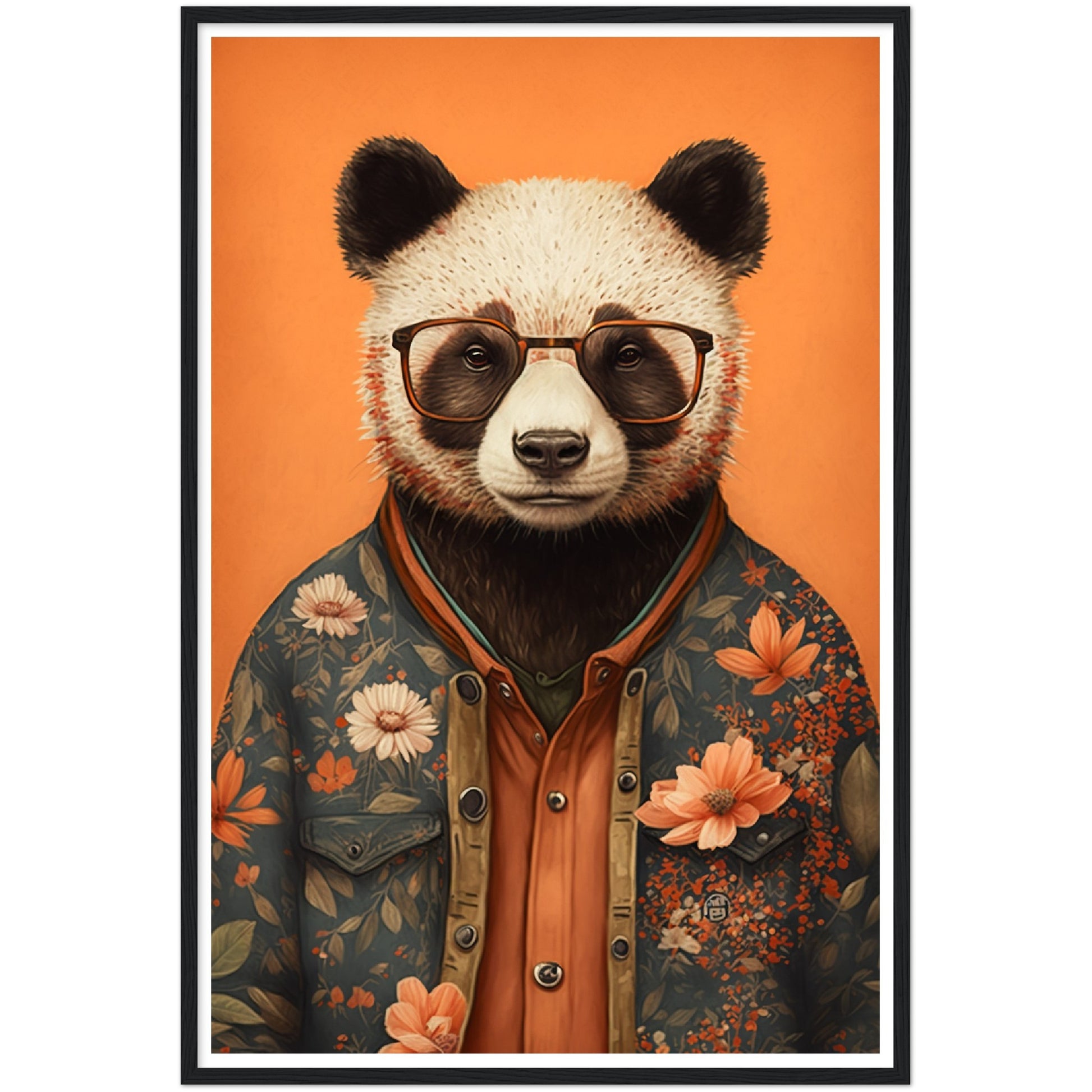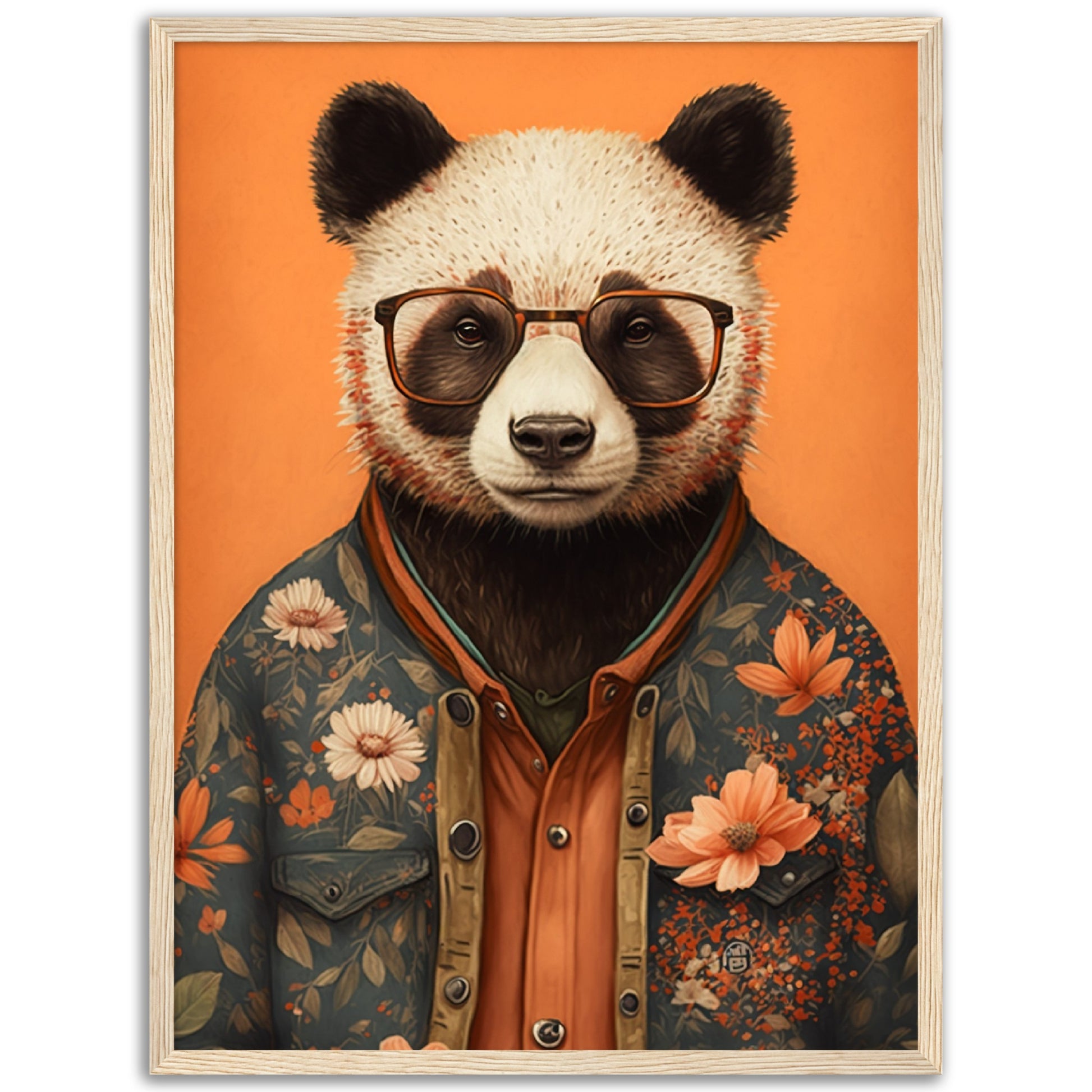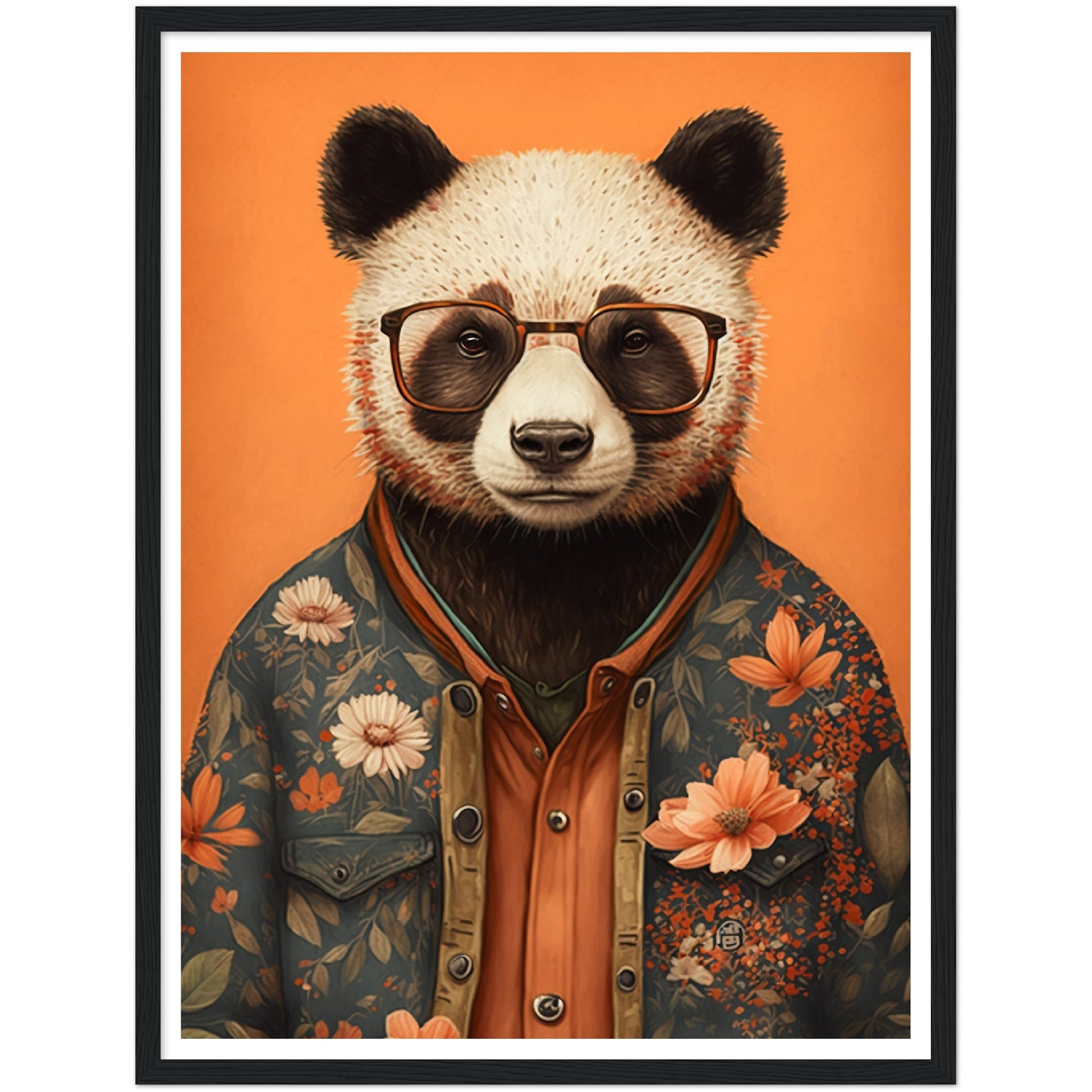 The illustration features a charming panda wearing a stylish floral patterned jacket and quirky fashionable glasses. The panda stands out against a plain orange background, adding a pop of color to any room. The intricate details of the jacket make this piece a unique and eye-catching addition to any home or office.