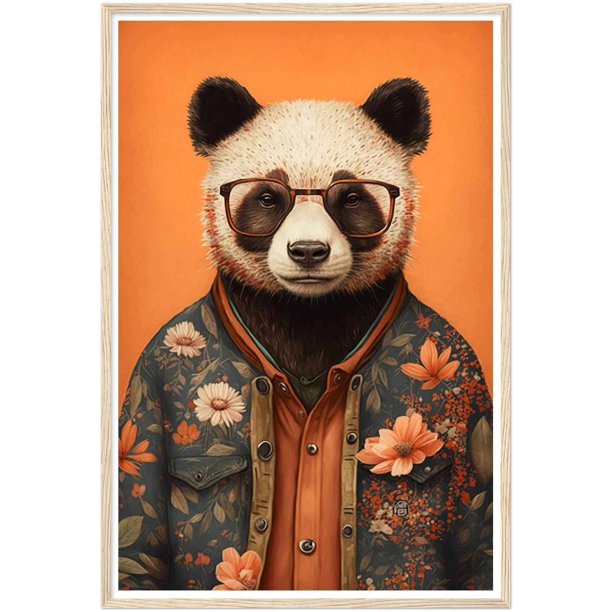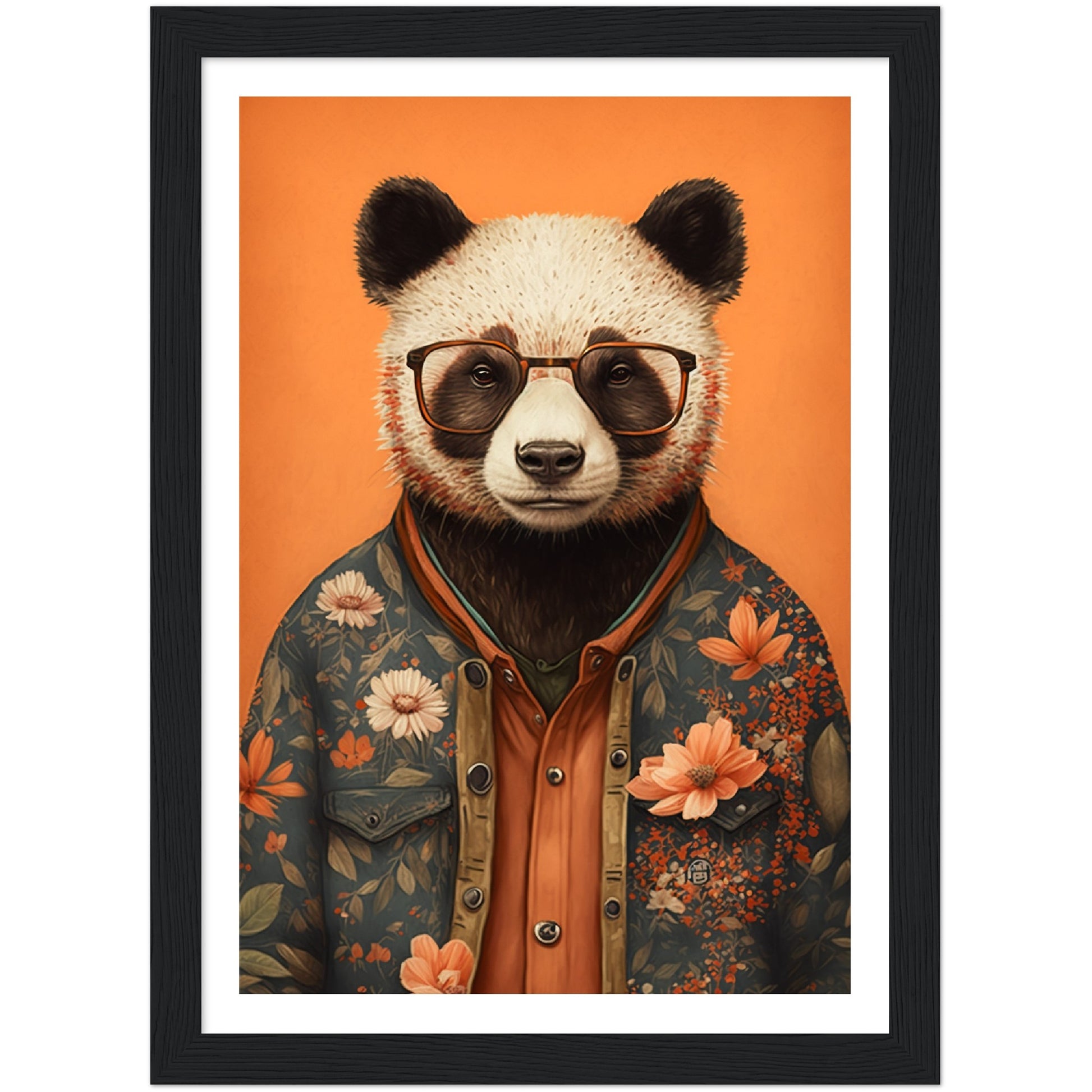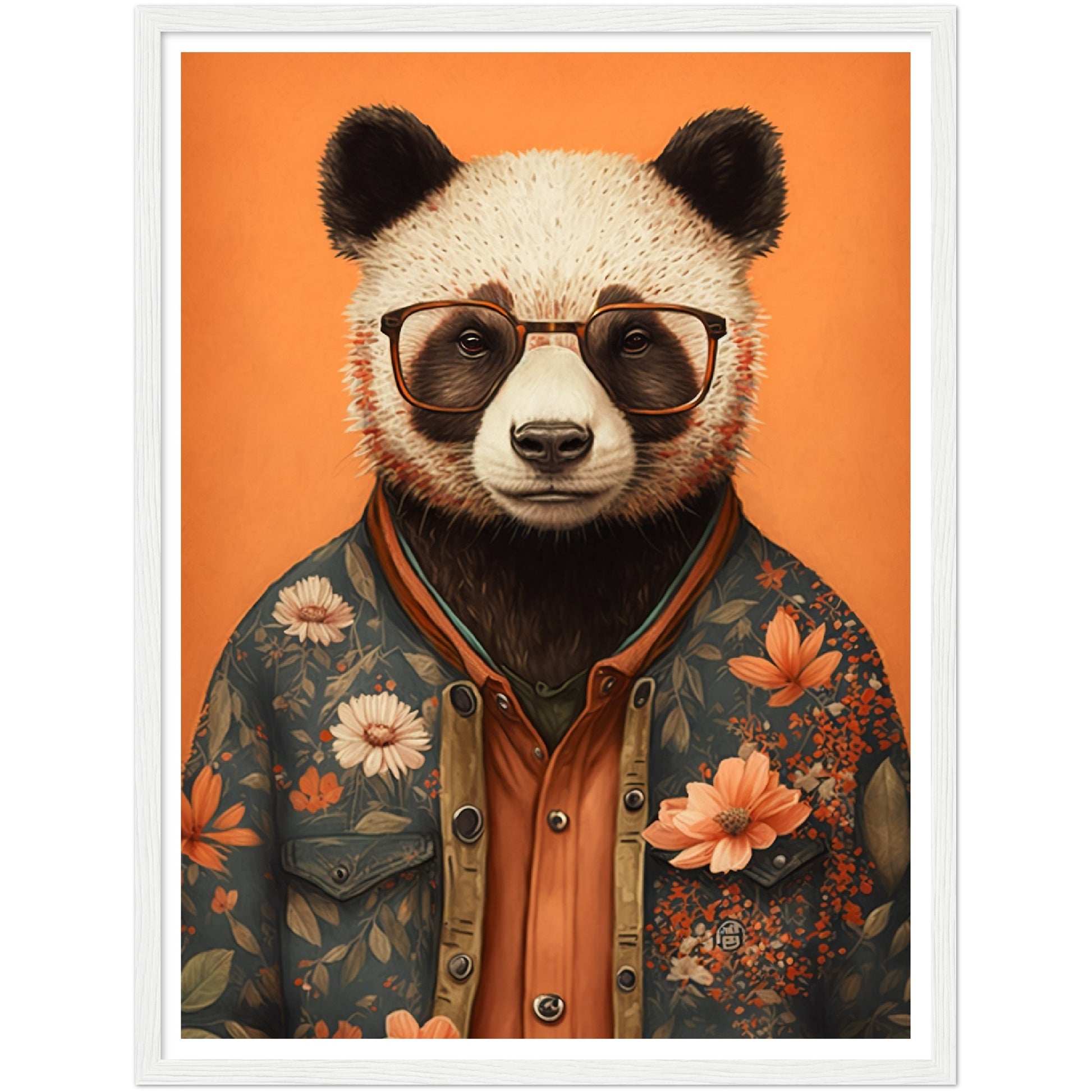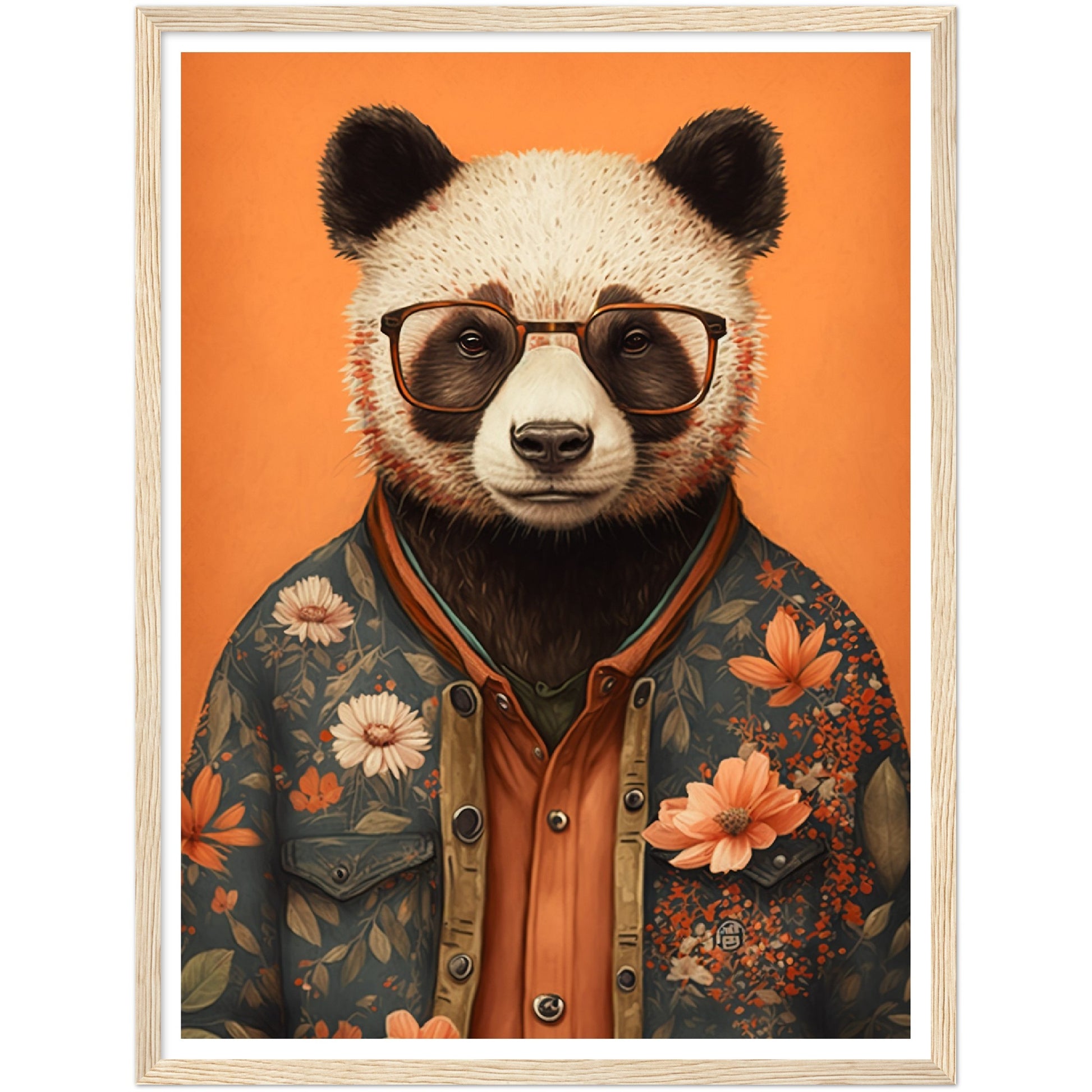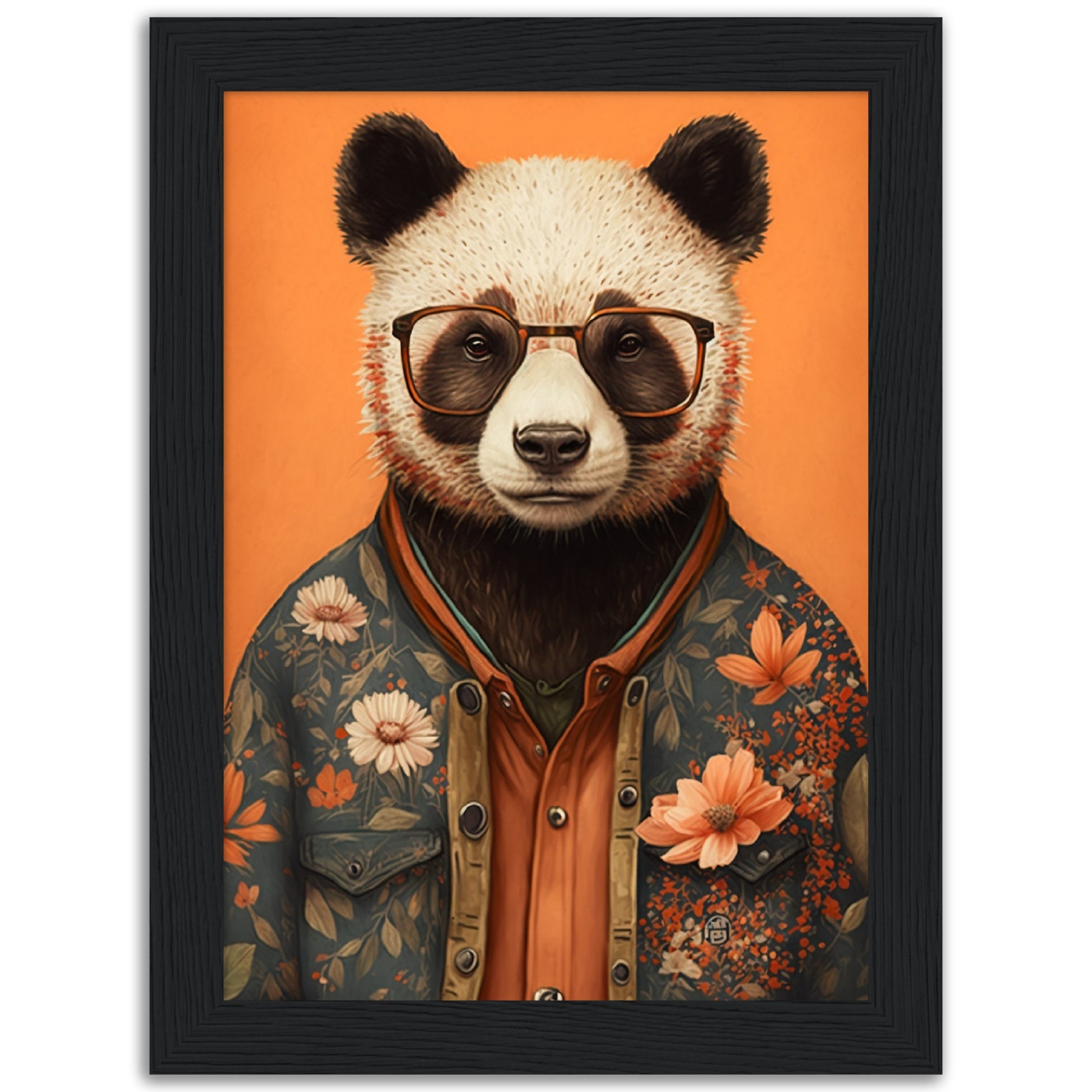 The illustration features a charming panda wearing a stylish floral patterned jacket and quirky fashionable glasses. The panda stands out against a plain orange background, adding a pop of color to any room. The intricate details of the jacket make this piece a unique and eye-catching addition to any home or office.