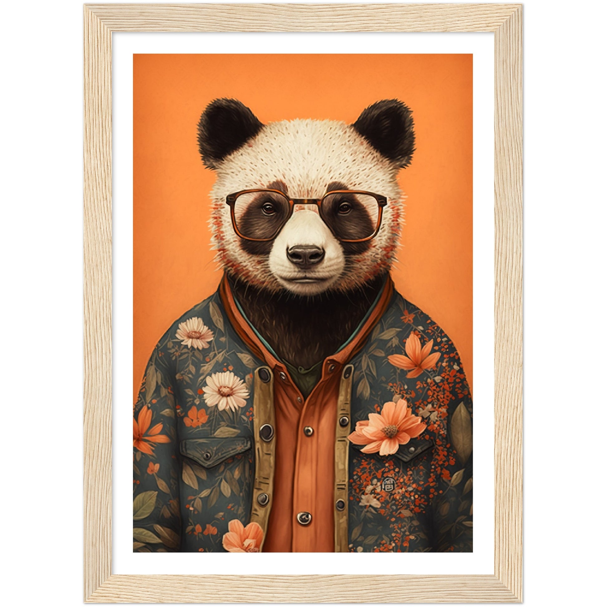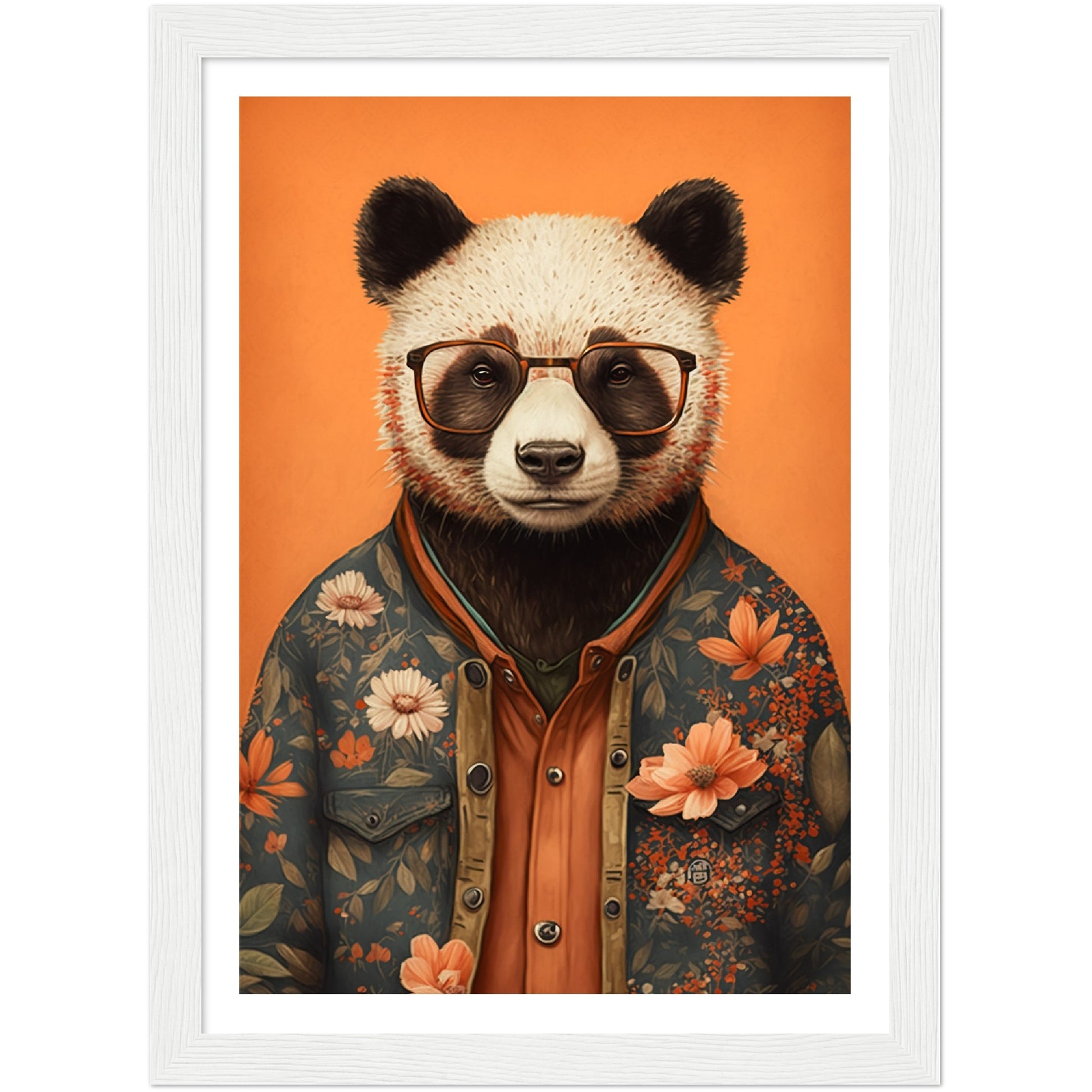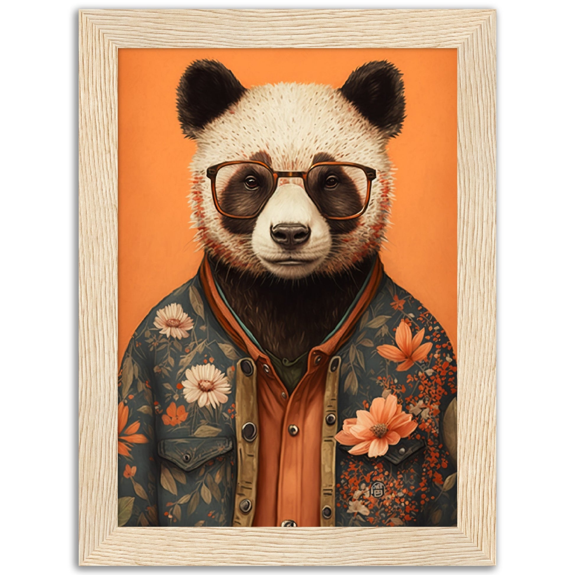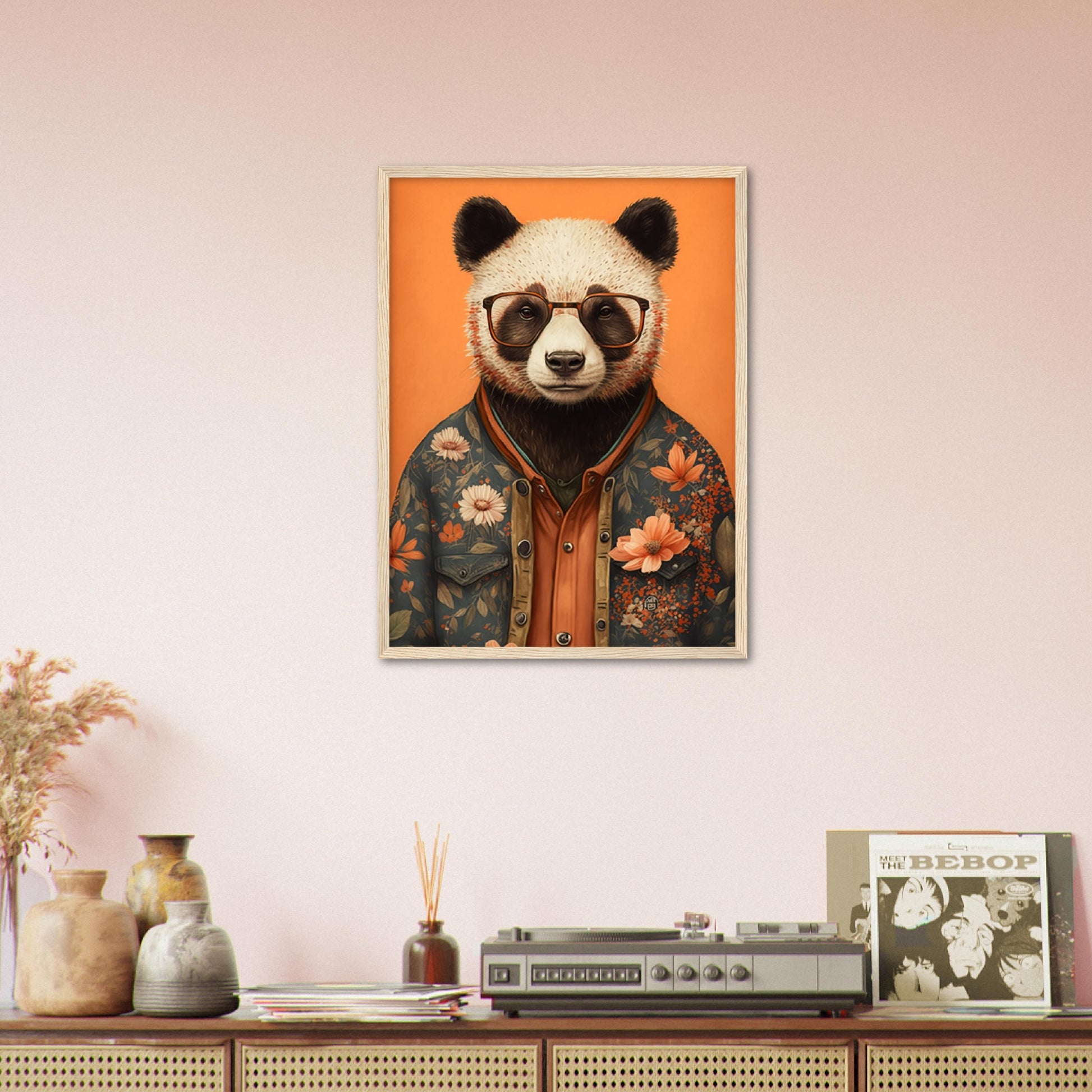 The illustration features a charming panda wearing a stylish floral patterned jacket and quirky fashionable glasses. The panda stands out against a plain orange background, adding a pop of color to any room. The intricate details of the jacket make this piece a unique and eye-catching addition to any home or office.