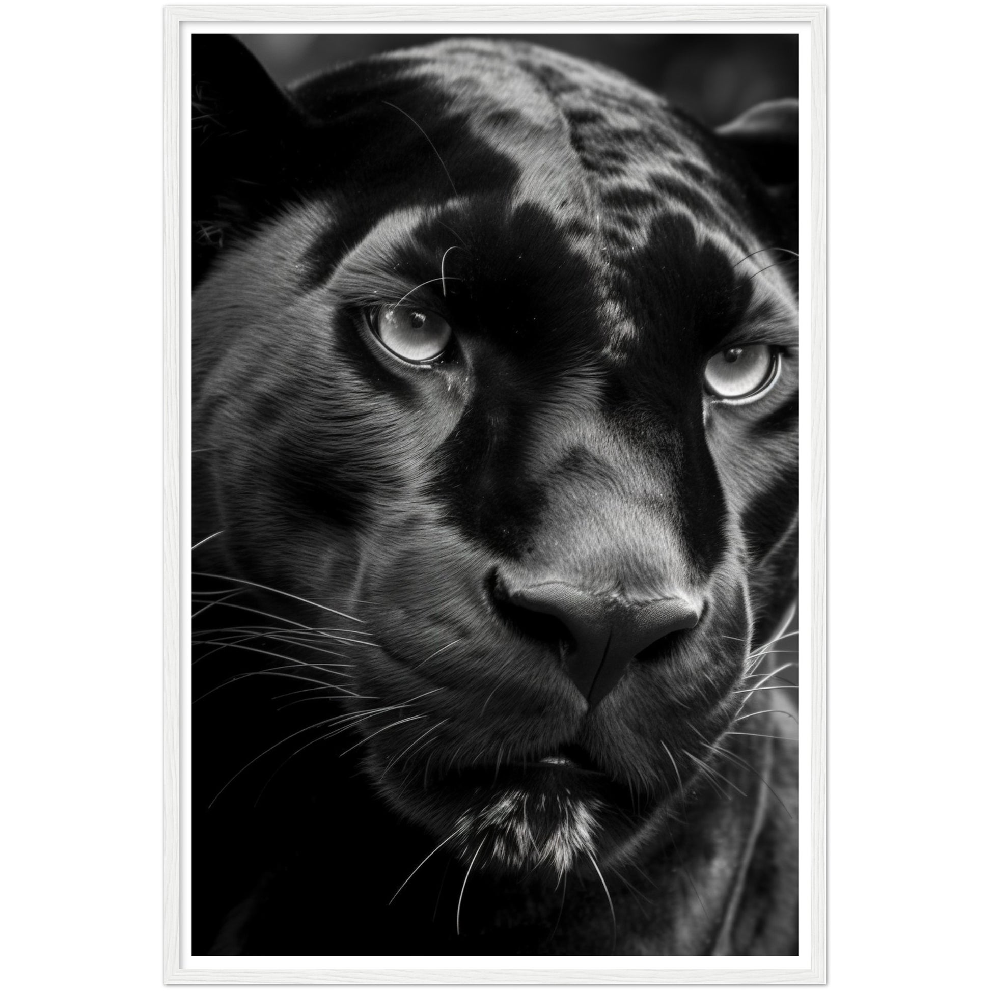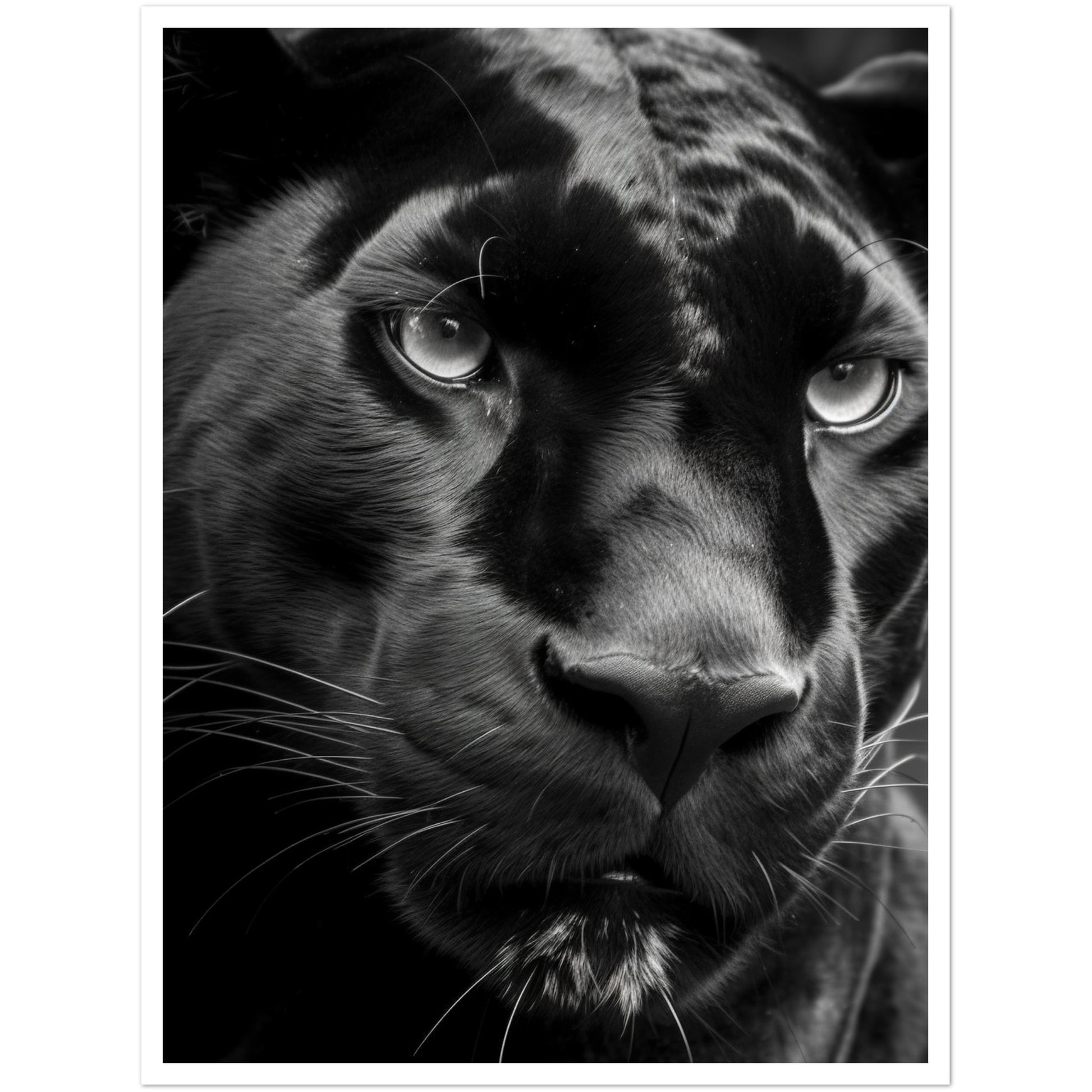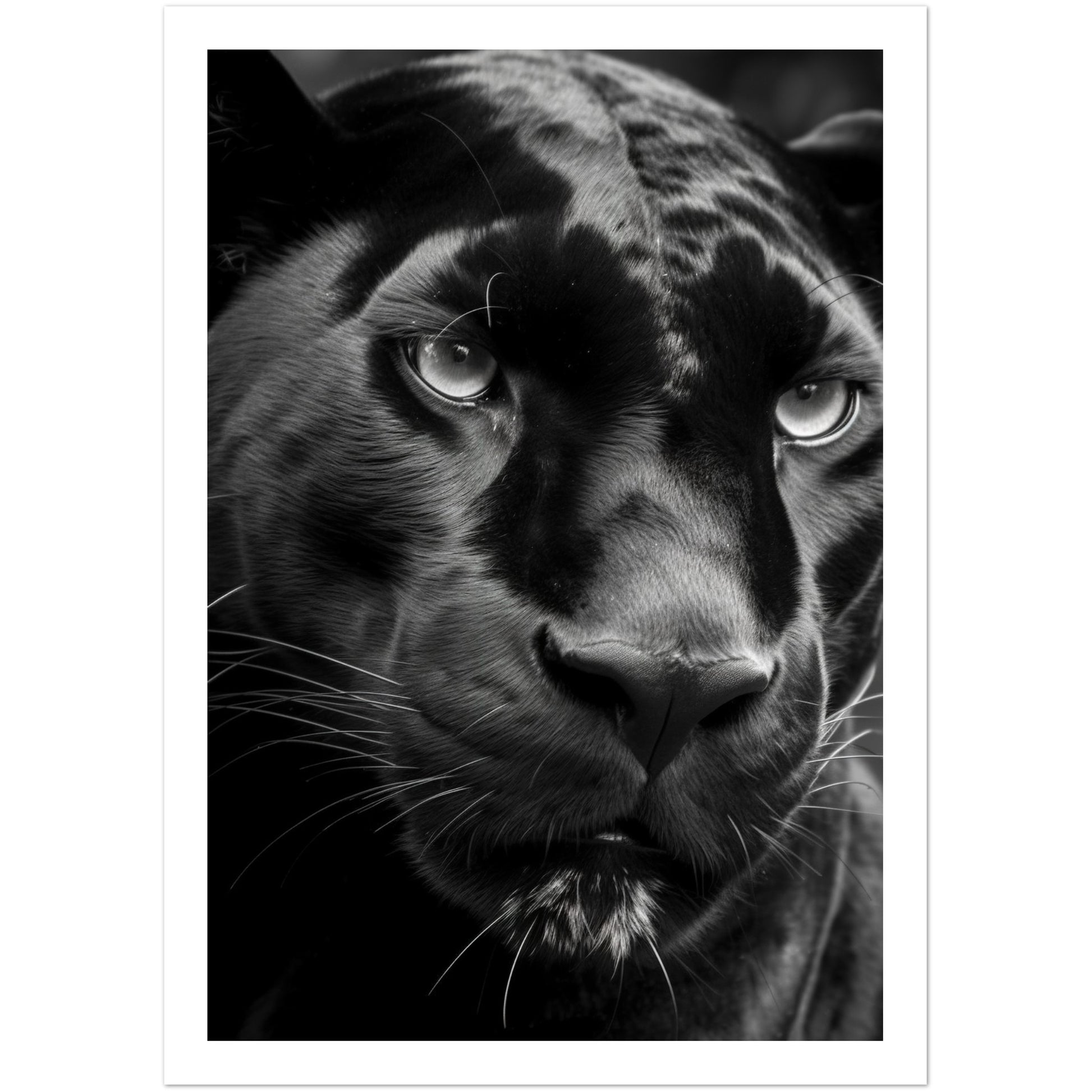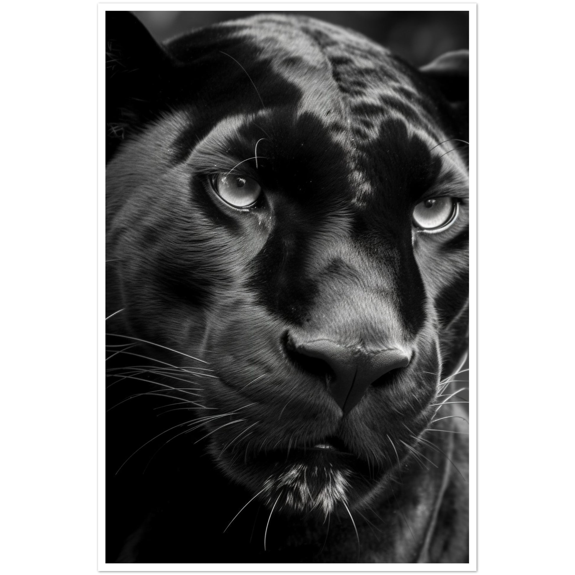 This stunning black and white photograph captures the intense gaze of a panther in a close-up, cropped composition. The intricate details of the panther's fur and piercing eyes are highlighted in this striking piece of art. The monochromatic color scheme adds a timeless and classic feel to the image, making it a perfect addition to any modern or traditional decor. This piece is perfect for animal lovers, nature enthusiasts, or anyone who appreciates the beauty and power of these majestic creatures. Hang it in your living room, bedroom, or office to add a touch of elegance and sophistication to your space.