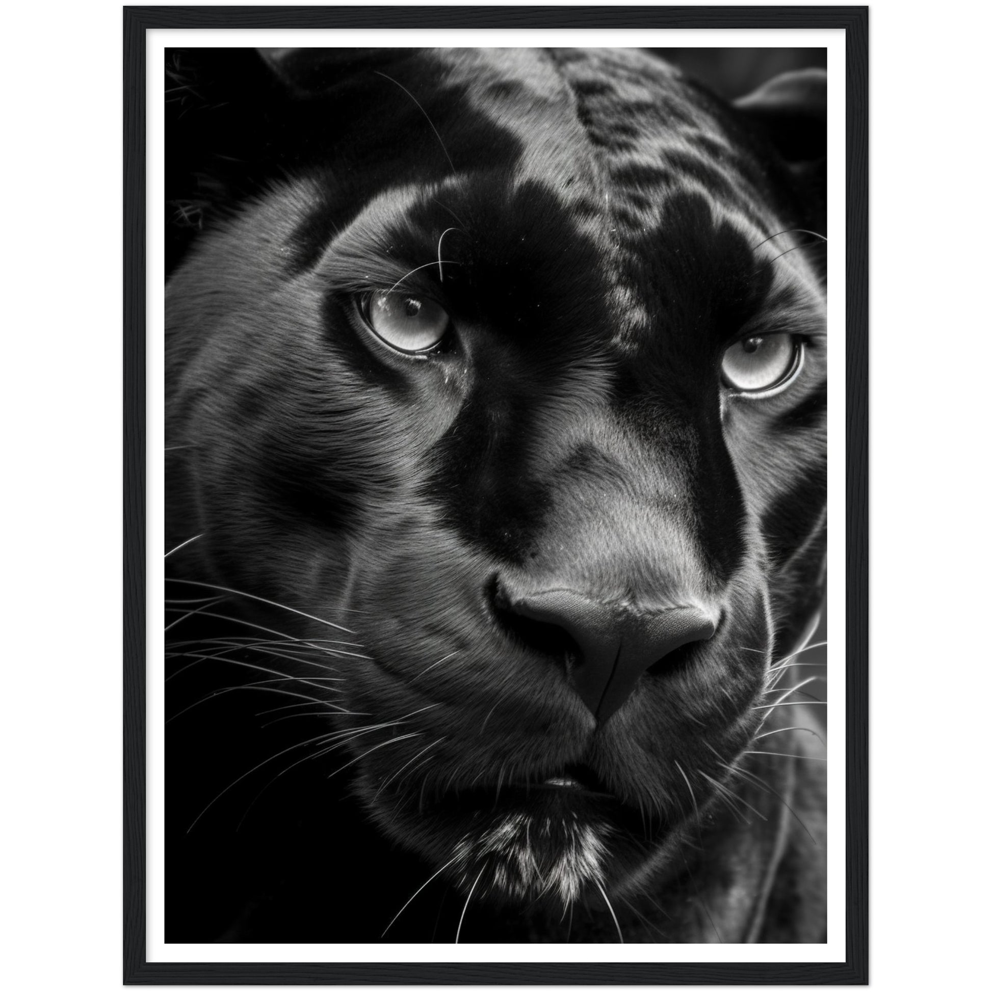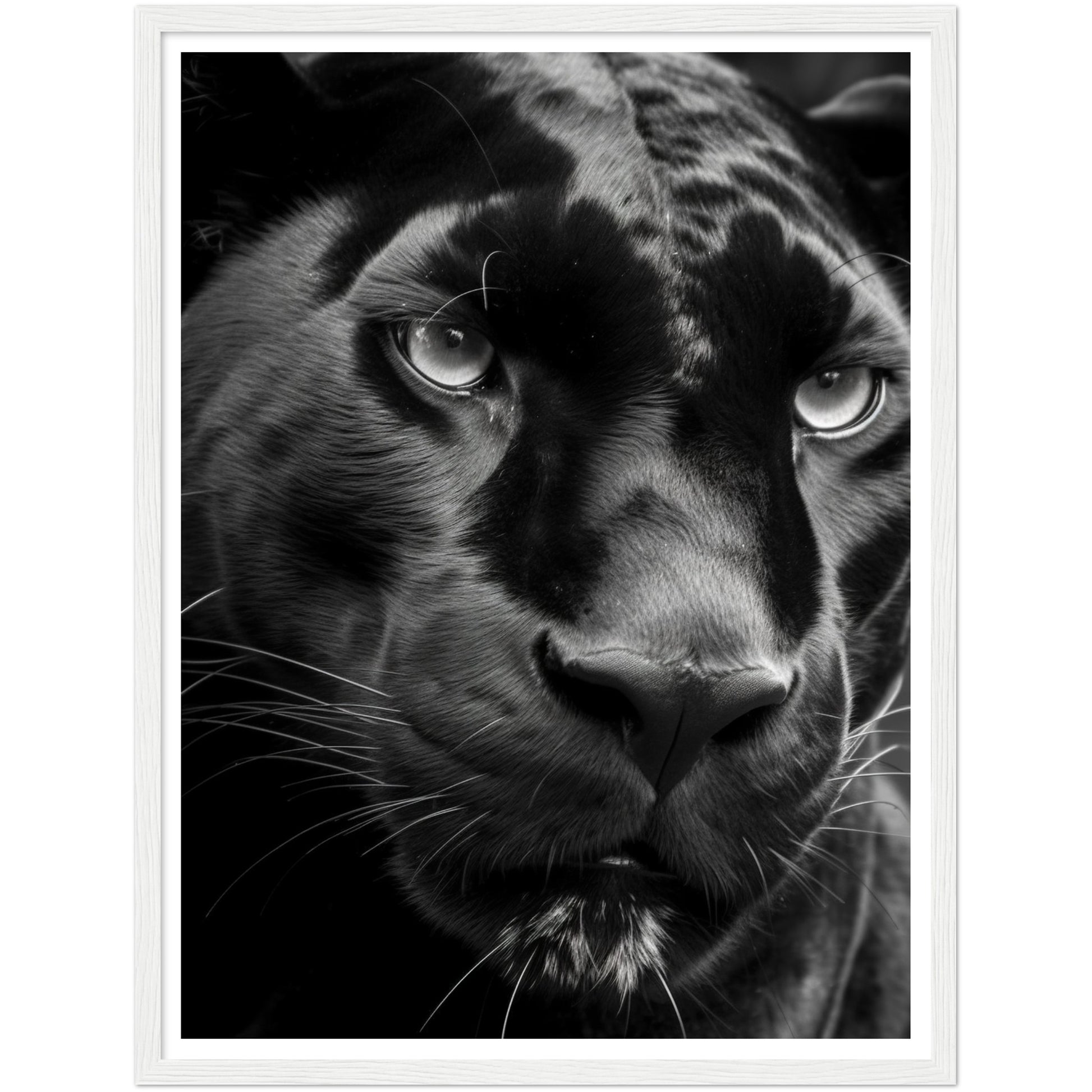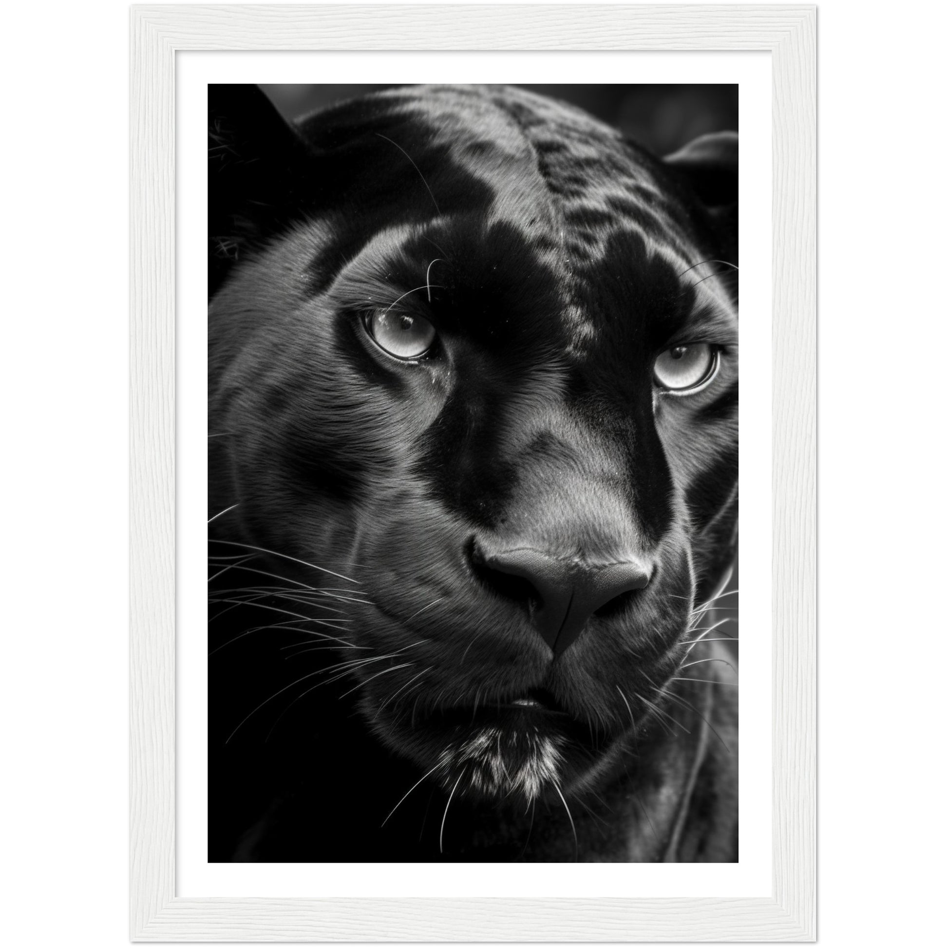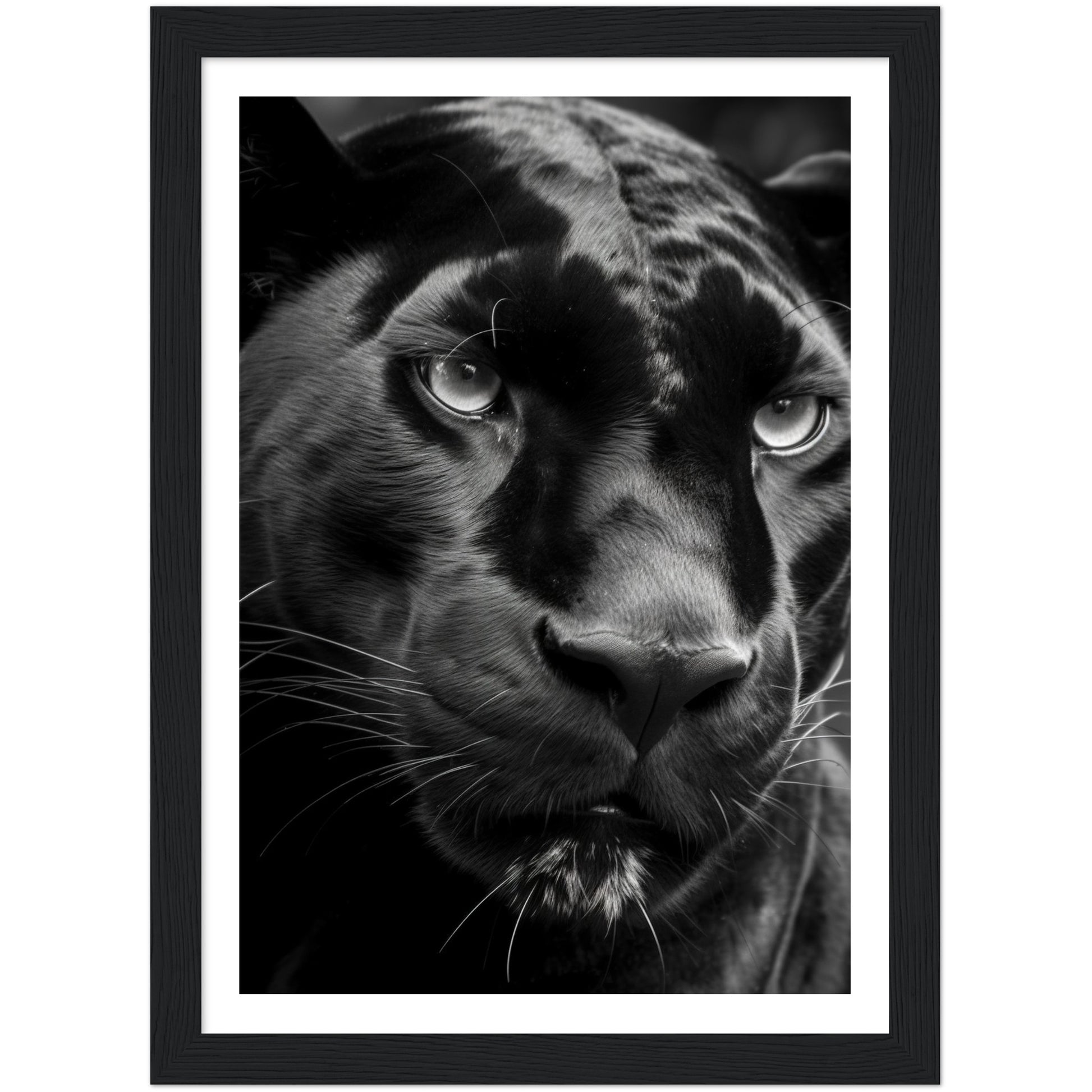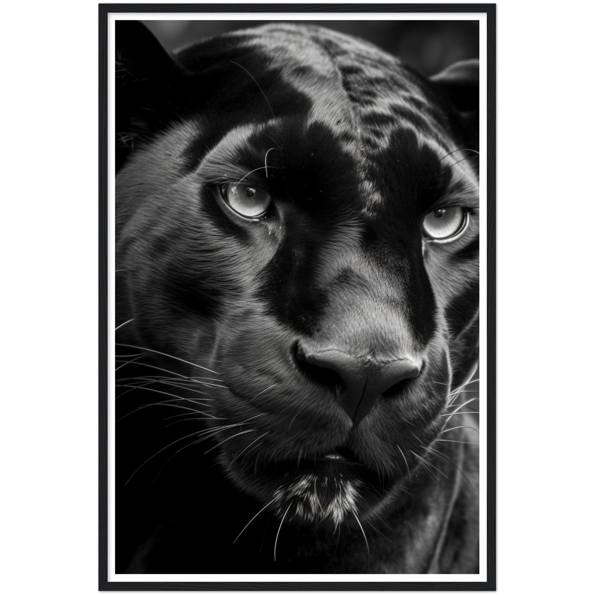 This stunning black and white photograph captures the intense gaze of a panther in a close-up, cropped composition. The intricate details of the panther's fur and piercing eyes are highlighted in this striking piece of art. The monochromatic color scheme adds a timeless and classic feel to the image, making it a perfect addition to any modern or traditional decor. This piece is perfect for animal lovers, nature enthusiasts, or anyone who appreciates the beauty and power of these majestic creatures. Hang it in your living room, bedroom, or office to add a touch of elegance and sophistication to your space.