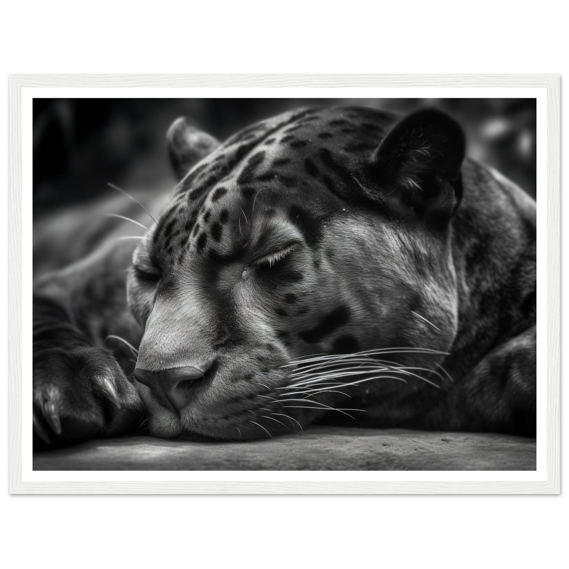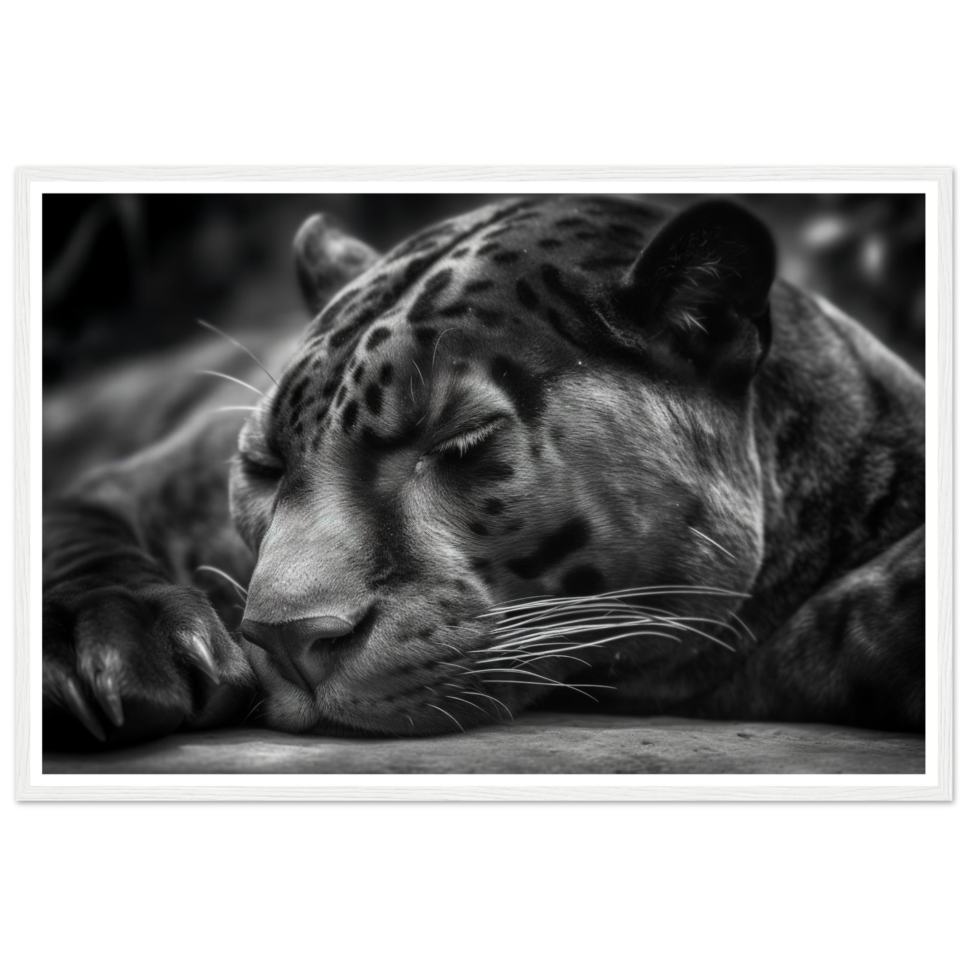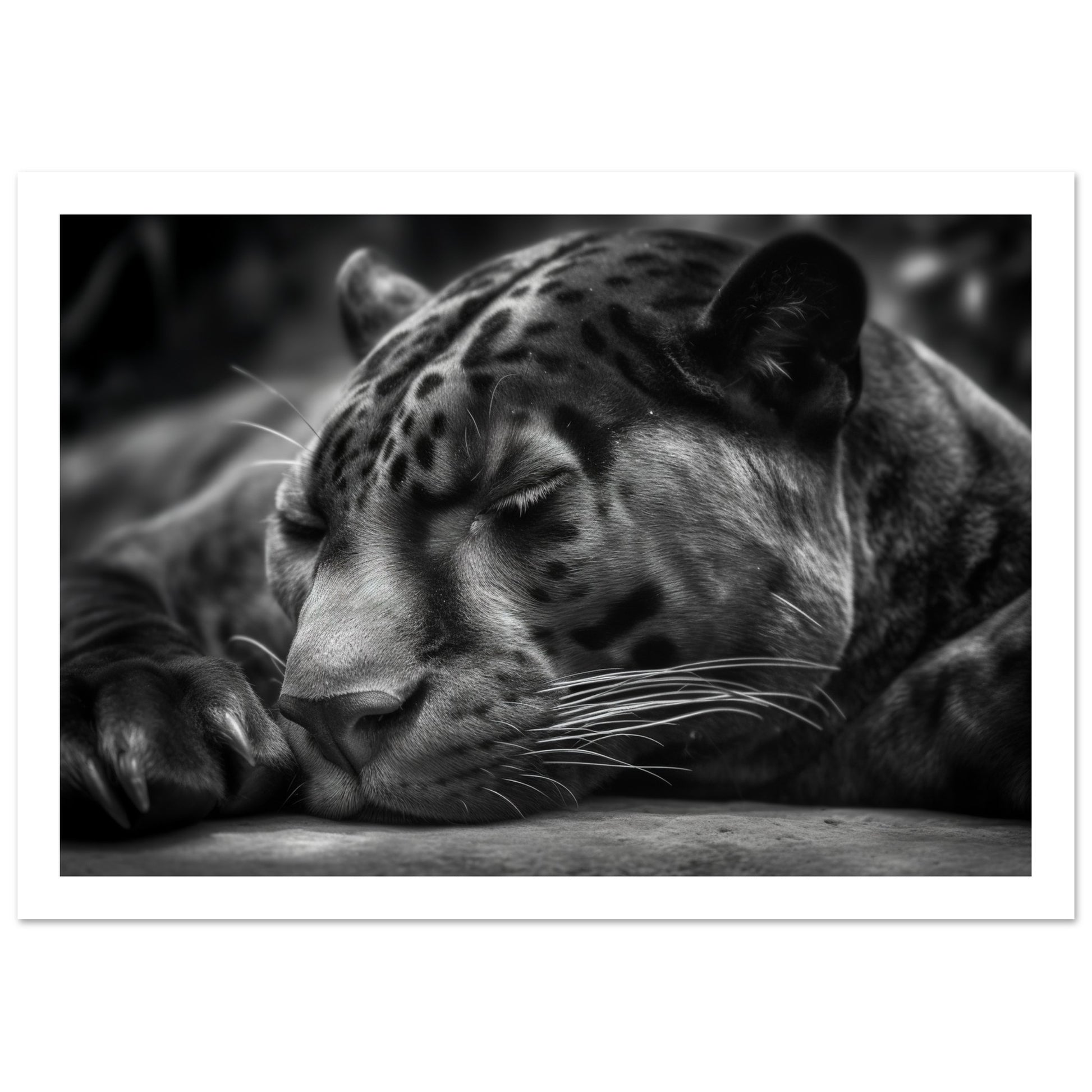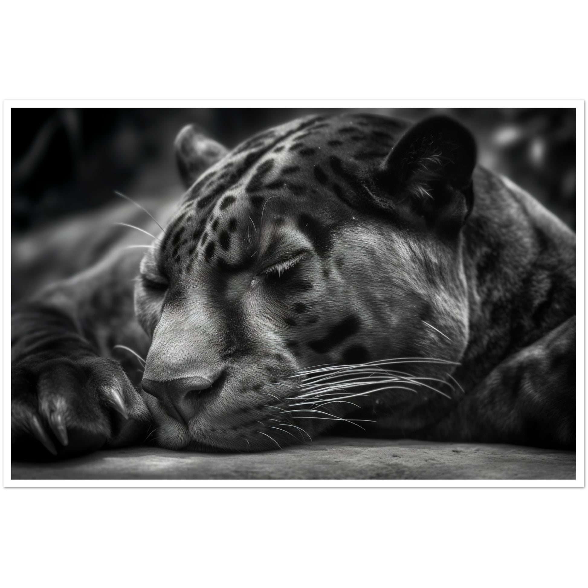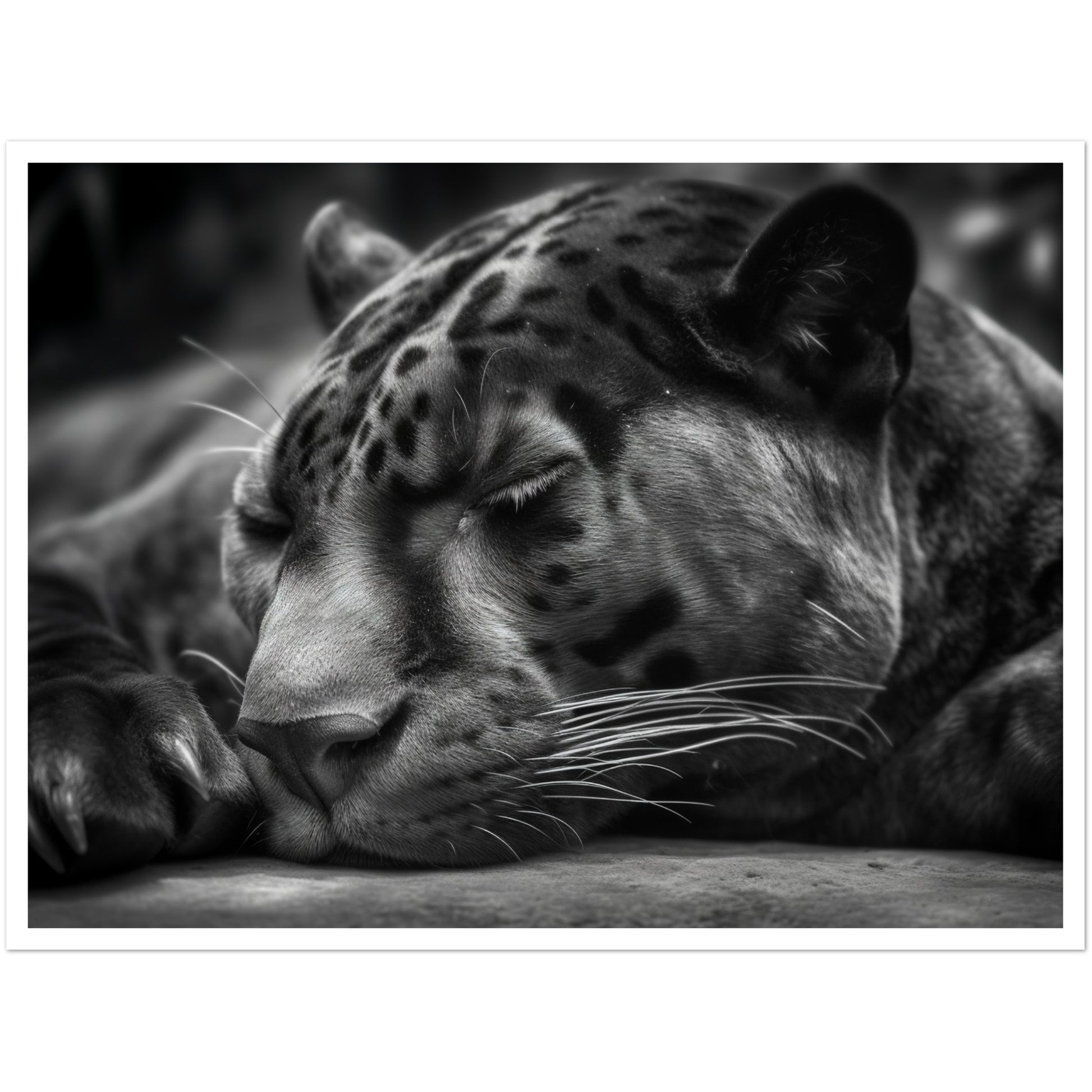This close-up allows you to witness the quietude and power of the panther's slumber. The monochrome presentation adds a timeless and captivating allure to the image, accentuating the panther's sleek form and intense presence.