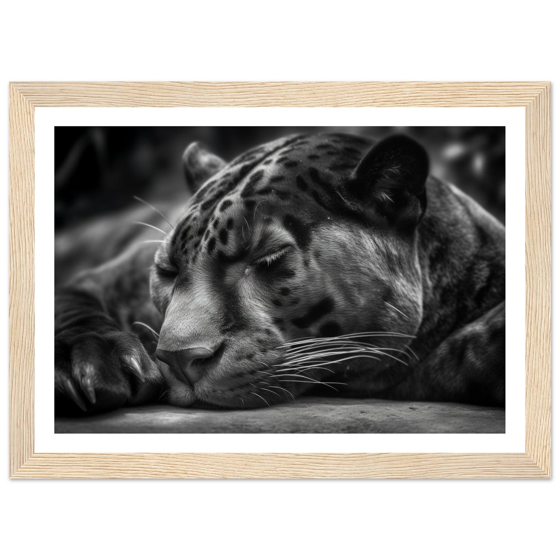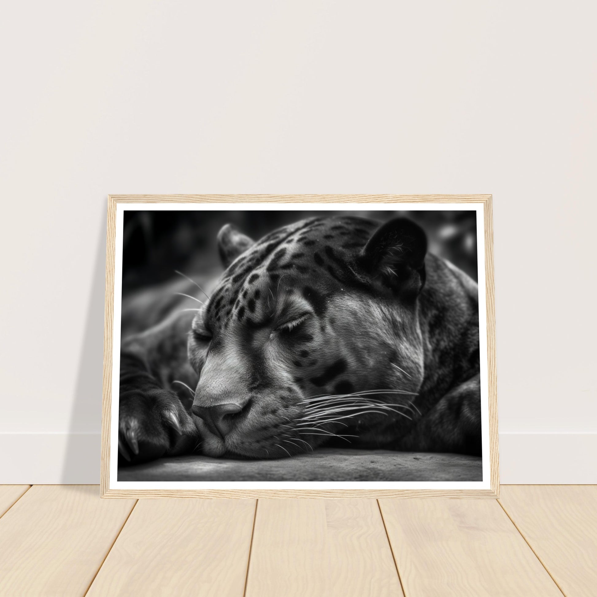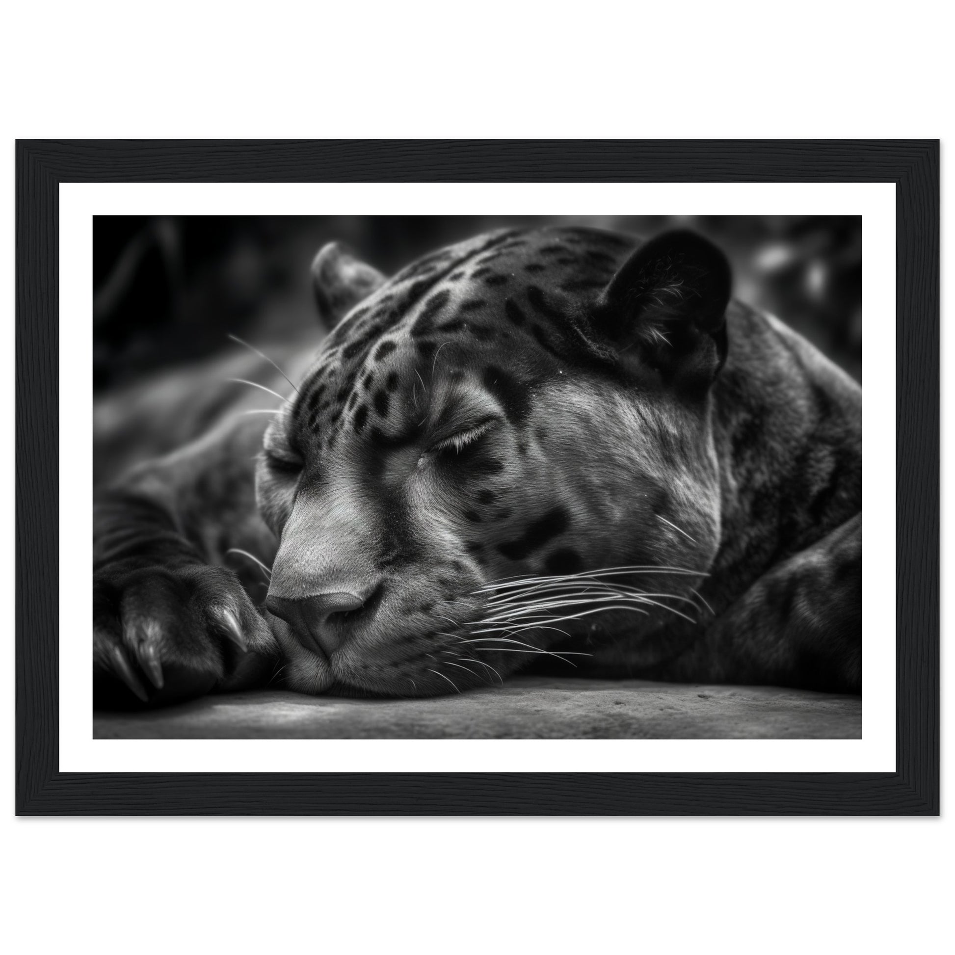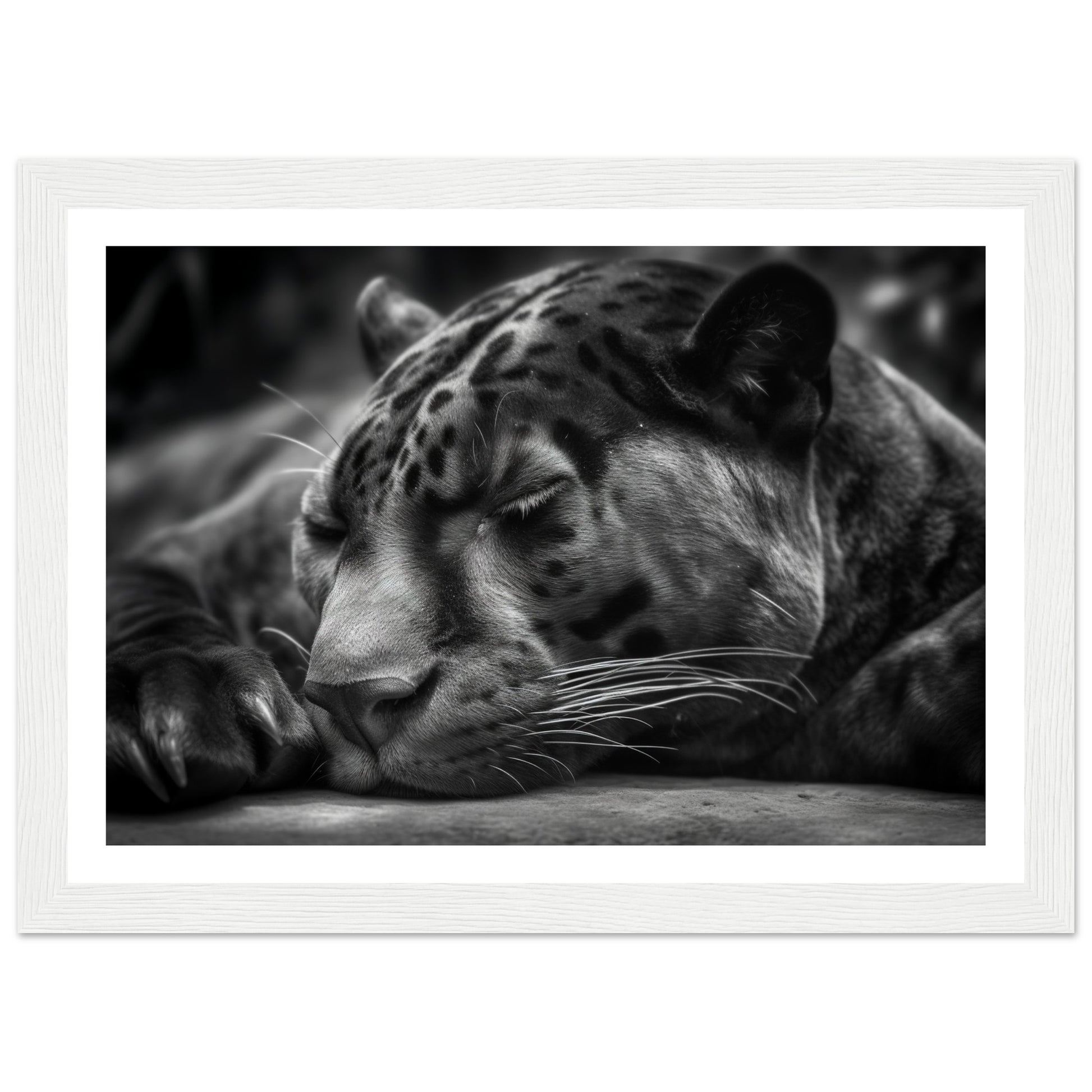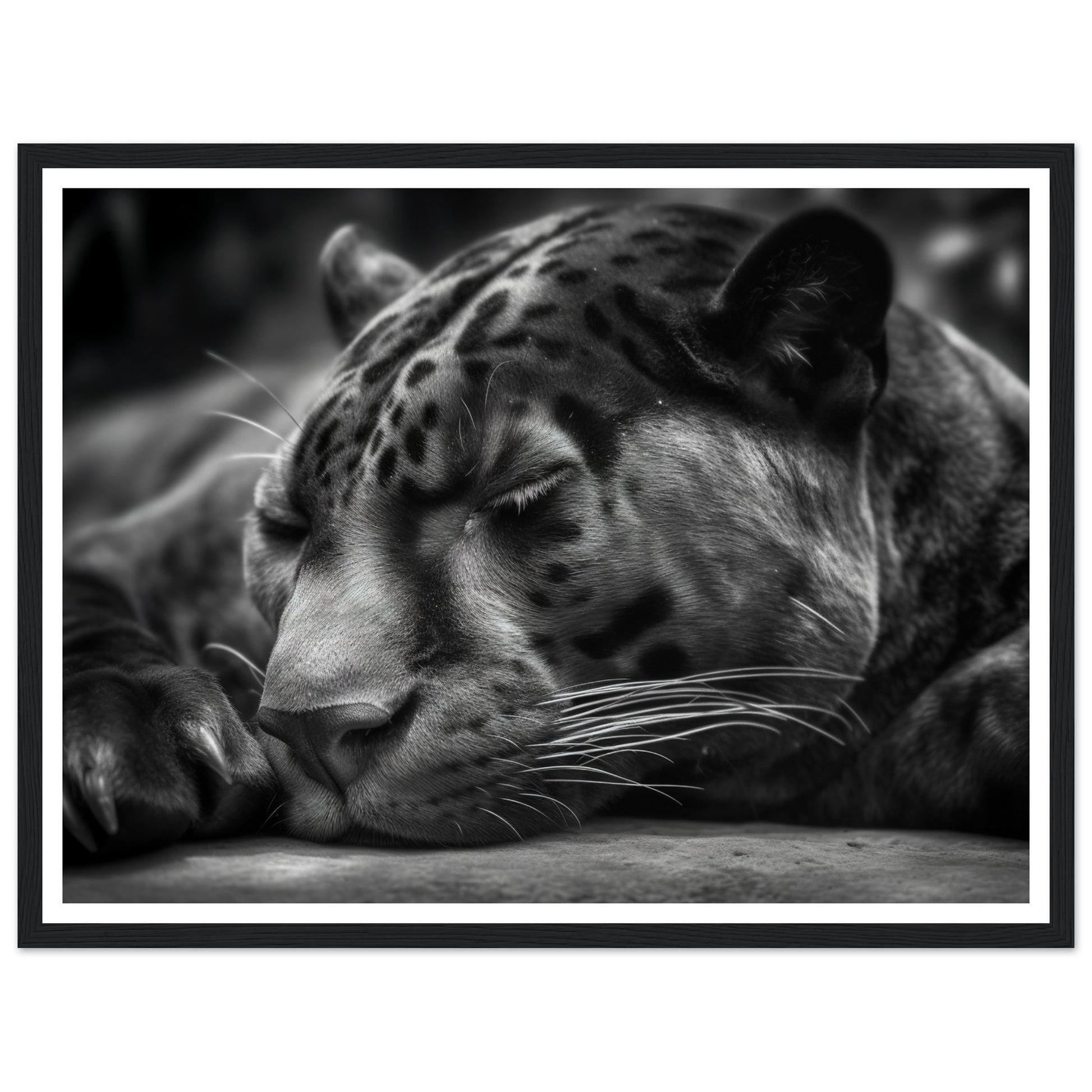This close-up allows you to witness the quietude and power of the panther's slumber. The monochrome presentation adds a timeless and captivating allure to the image, accentuating the panther's sleek form and intense presence.
