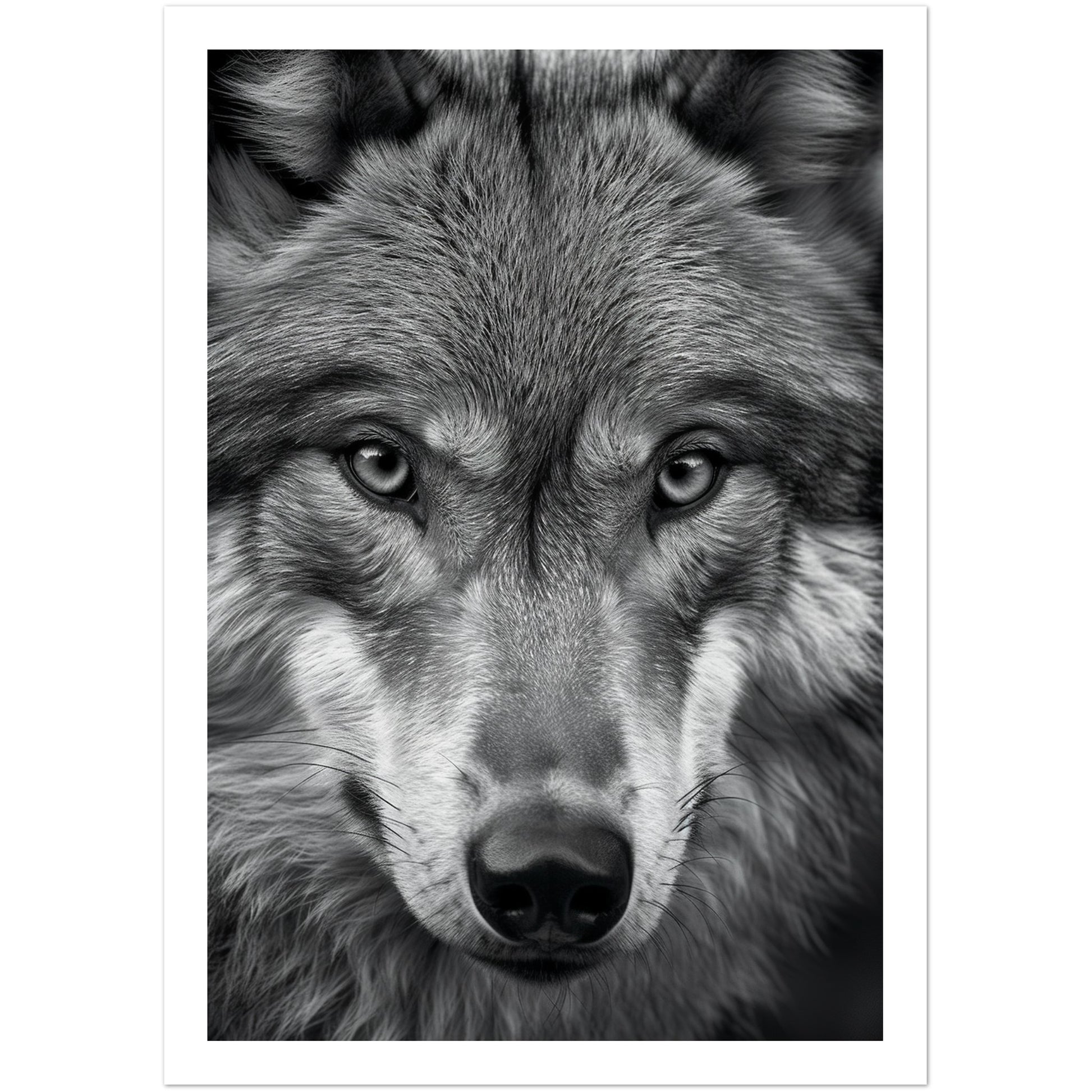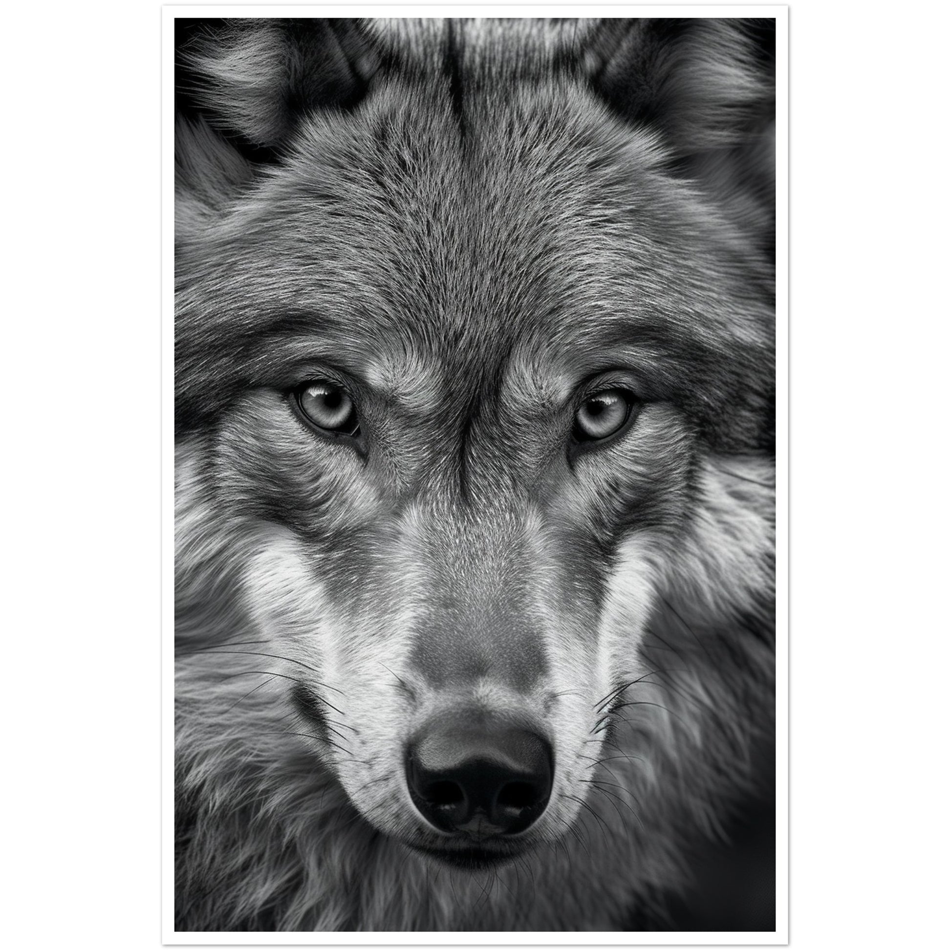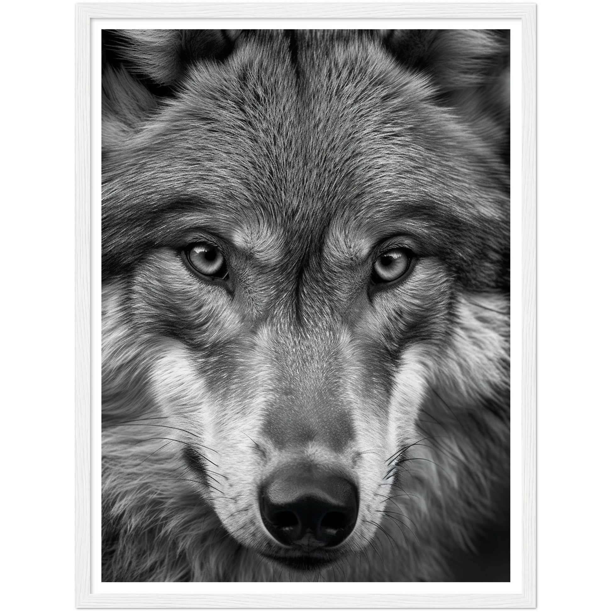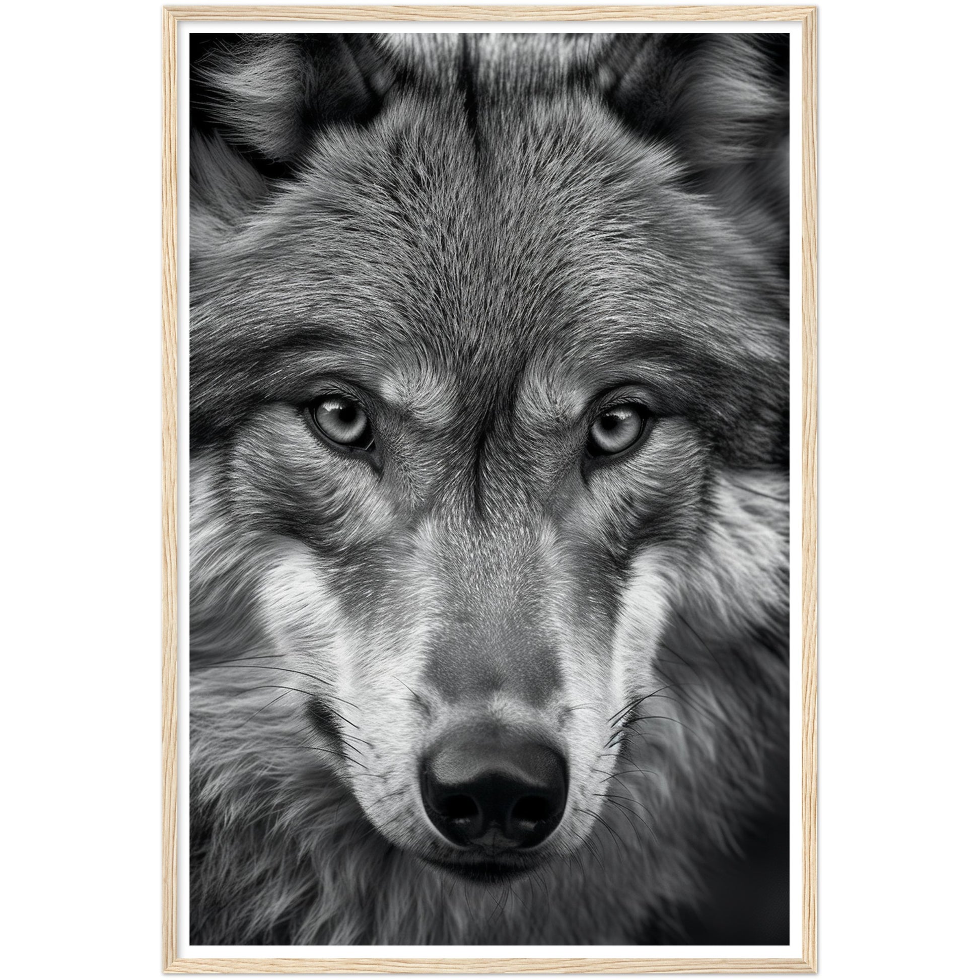 This stunning black and white photograph captures the intense gaze of a wolf in a close-up, cropped composition. The intricate details of the wolf's fur and piercing eyes are highlighted in this striking piece of art. The monochromatic color scheme adds a timeless and classic feel to the image, making it a perfect addition to any home or office decor. The high-quality print is produced on premium paper, ensuring that the image is sharp and vibrant. This piece is perfect for animal lovers, nature enthusiasts, or anyone who appreciates the beauty of wildlife. Hang it on your wall and let the wolf's fierce and majestic presence inspire you every day.