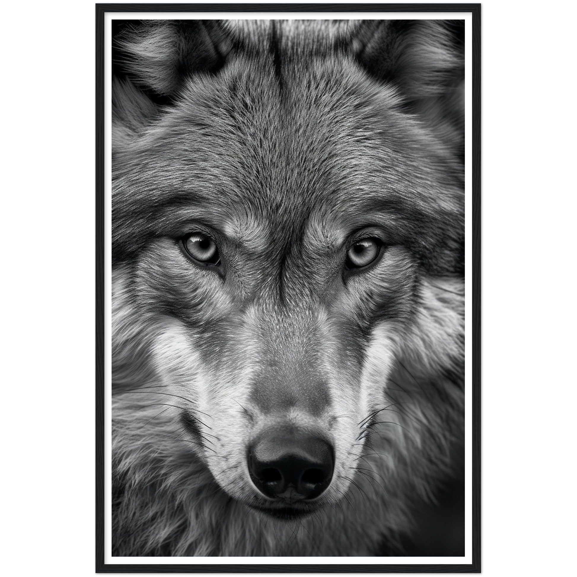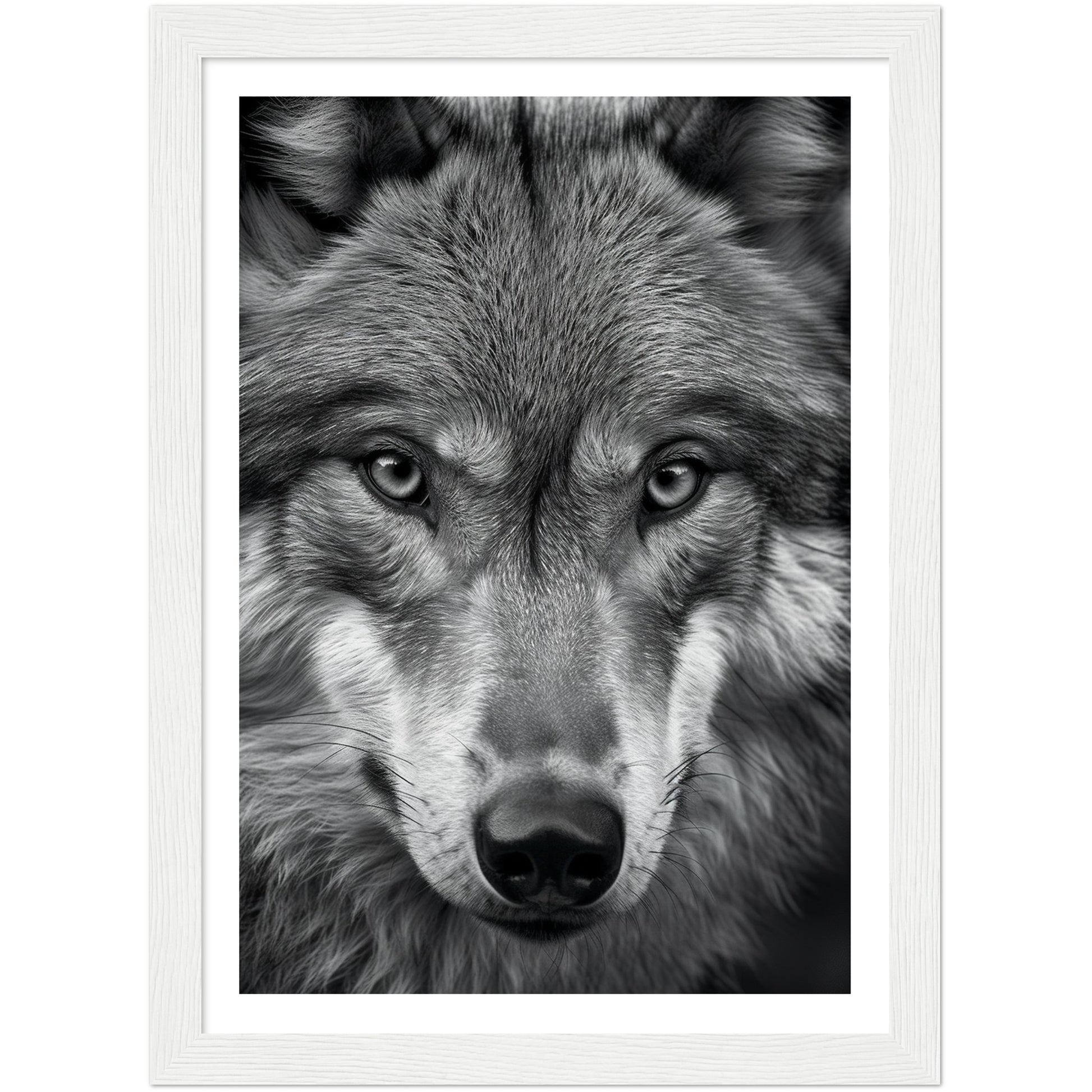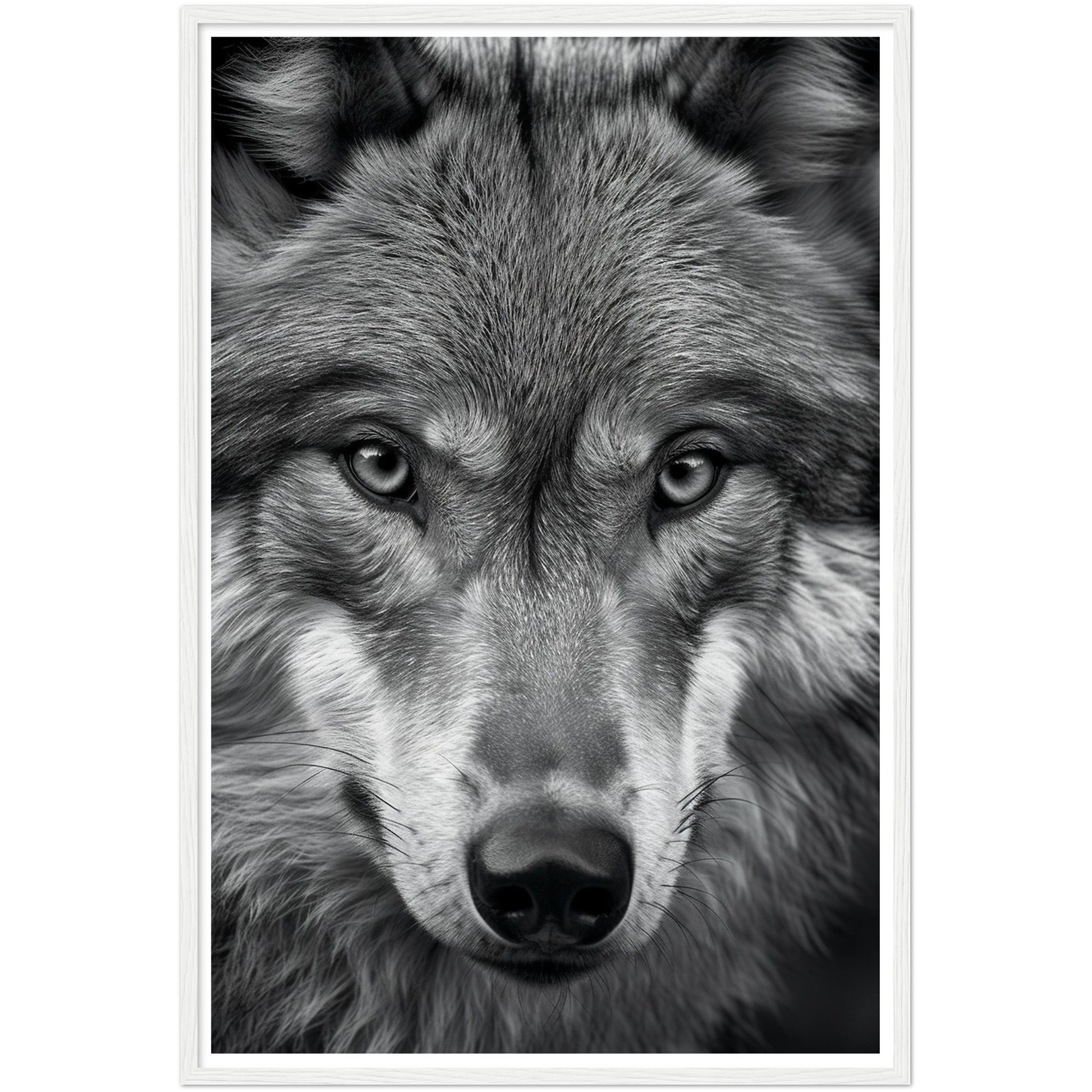 This stunning black and white photograph captures the intense gaze of a wolf in a close-up, cropped composition. The intricate details of the wolf's fur and piercing eyes are highlighted in this striking piece of art. The monochromatic color scheme adds a timeless and classic feel to the image, making it a perfect addition to any home or office decor. The high-quality print is produced on premium paper, ensuring that the image is sharp and vibrant. This piece is perfect for animal lovers, nature enthusiasts, or anyone who appreciates the beauty of wildlife. Hang it on your wall and let the wolf's fierce and majestic presence inspire you every day.